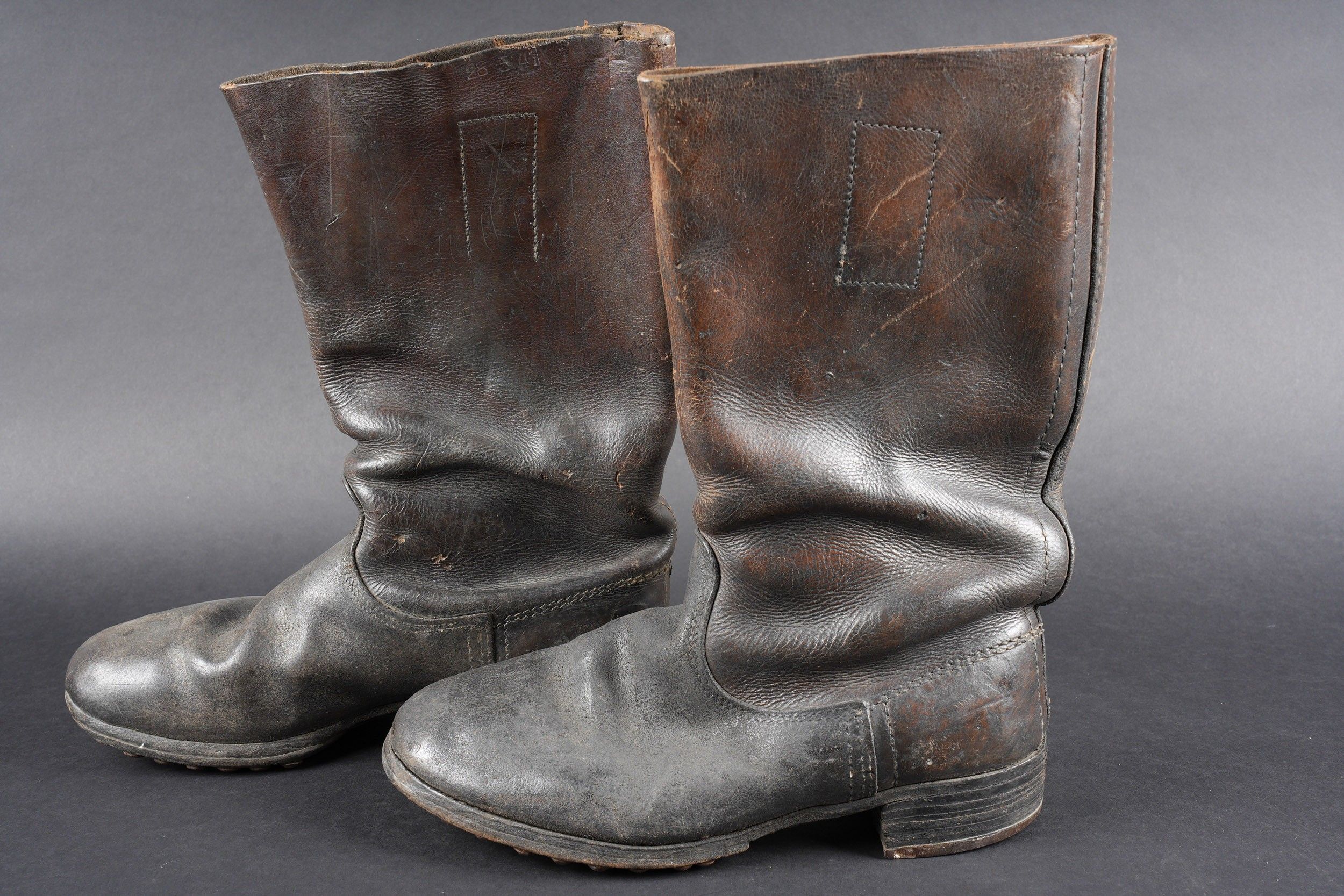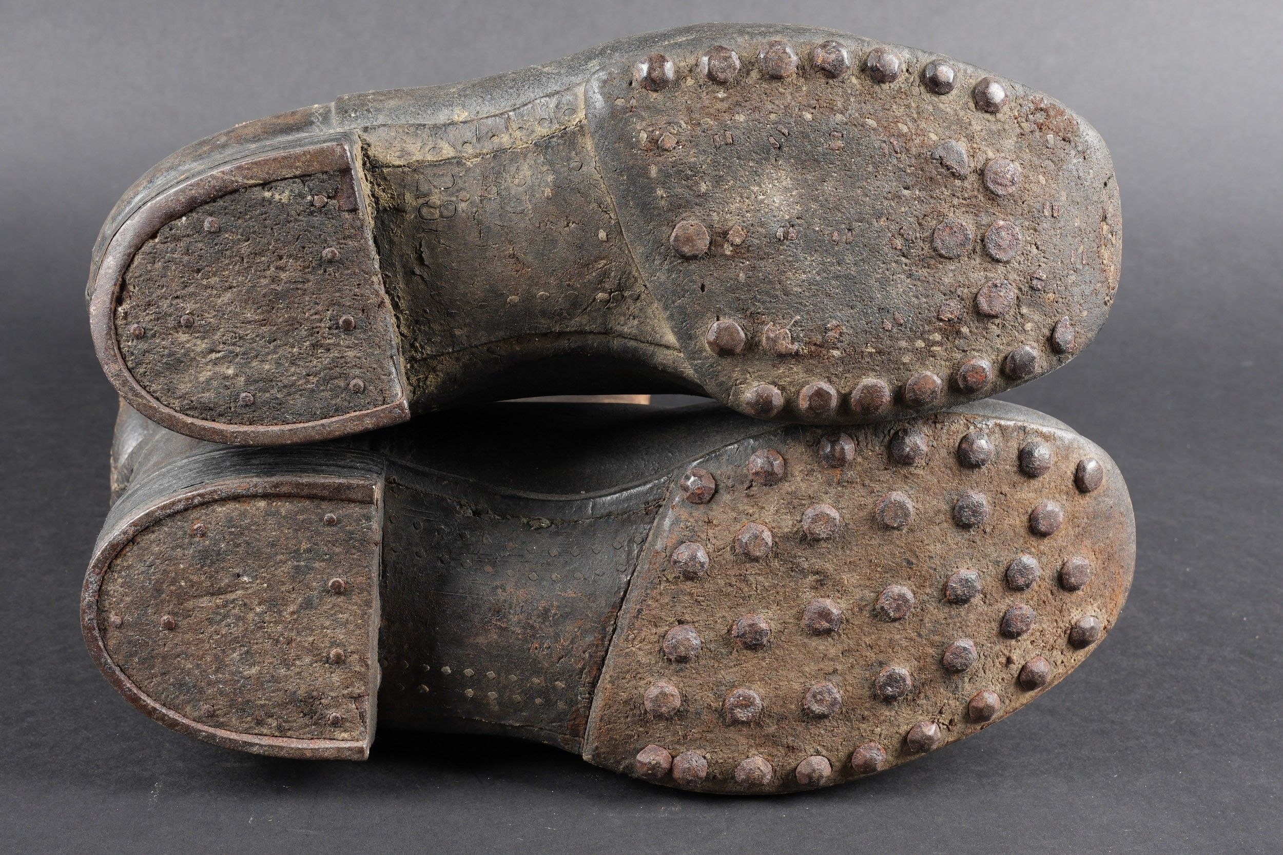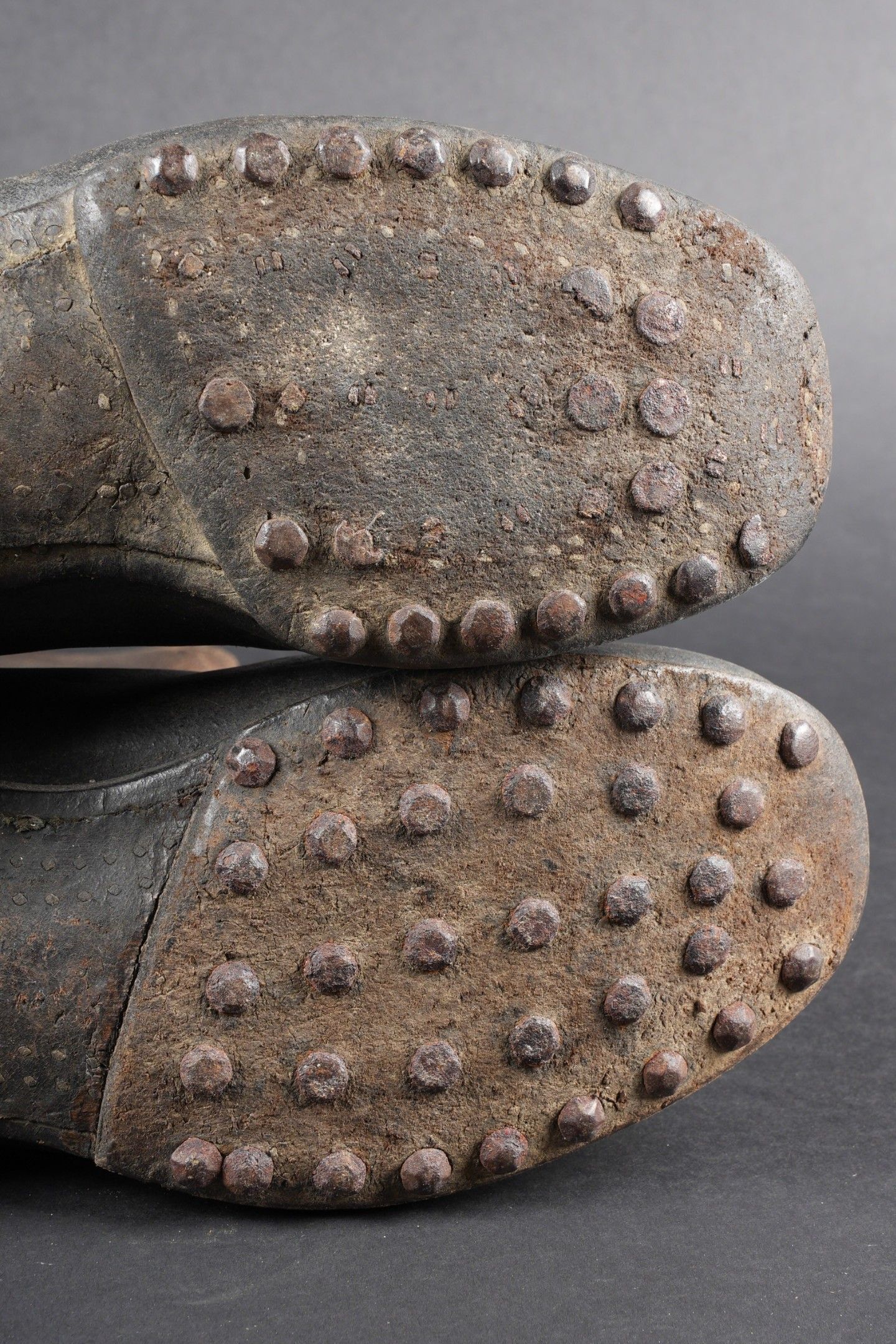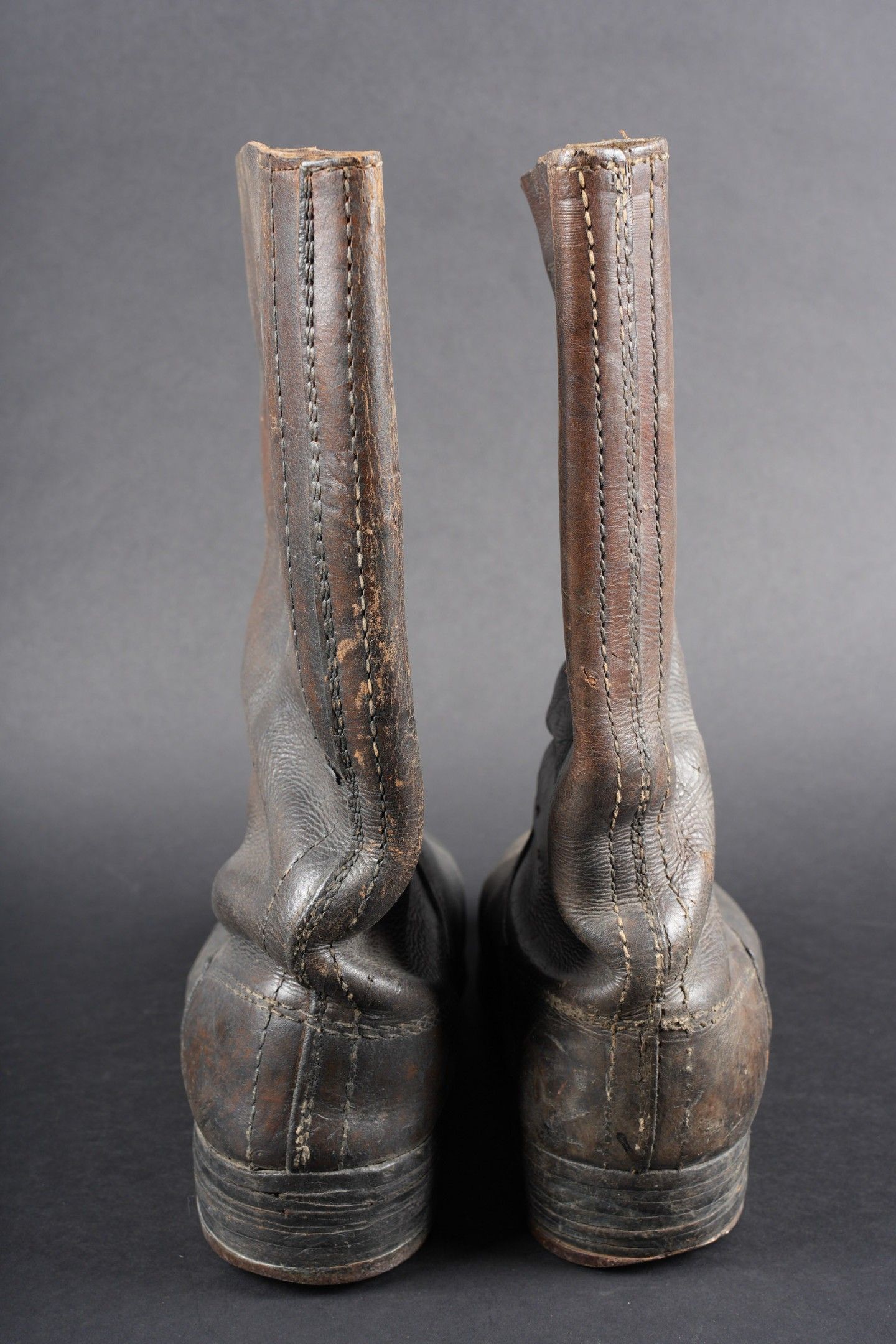 German boots. Short uppers. Dark brown leather. Pair not homogeneous. Markings on the side 28 5 41 1 and 29 4 18 42 3. Studded soles. Many studs missing. Shoe heels. Some wear and patina. Condition II+. German Boots. Short shaft model in dark brown leather, non-matching pair. Markings on the sides 28 5 41 1 and 29 4 18 42 3. Studded soles with several missing hobnails. Iron-shod heels. Displays typical wear and patina from service use. Condition II+.