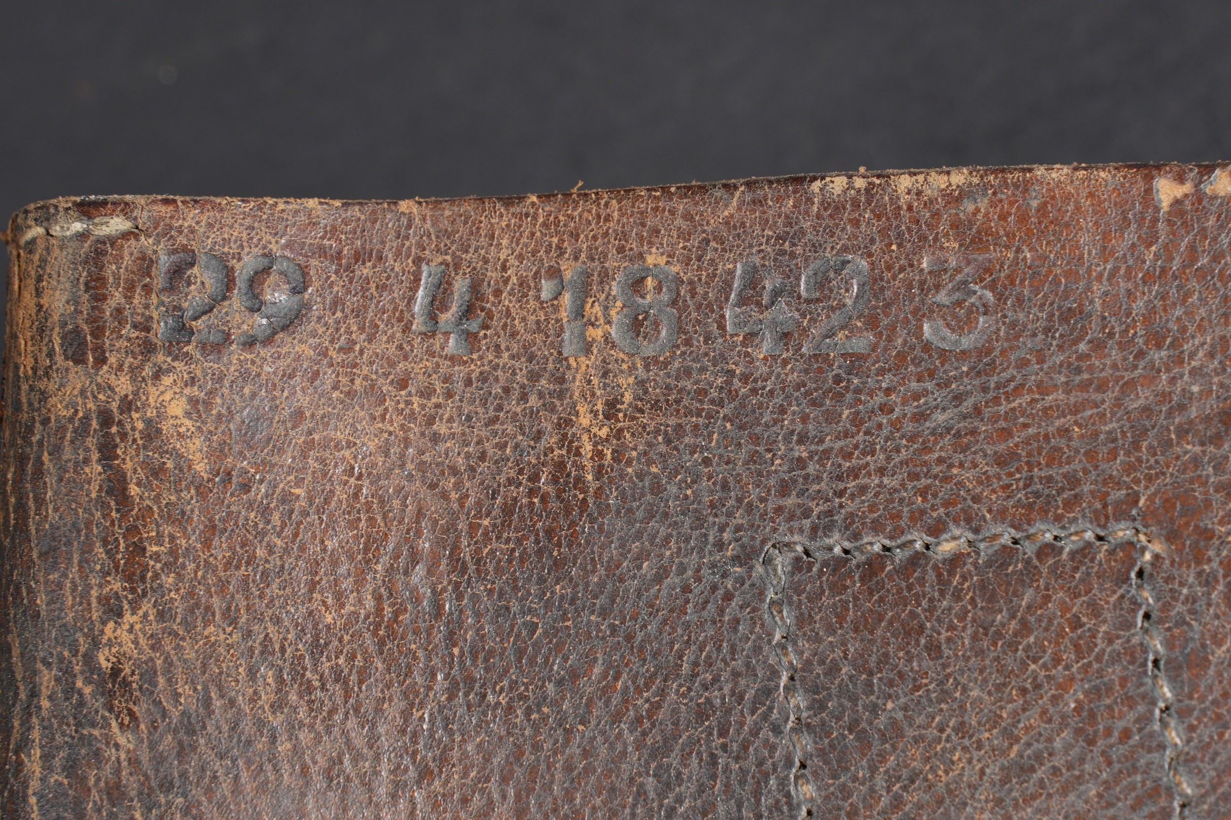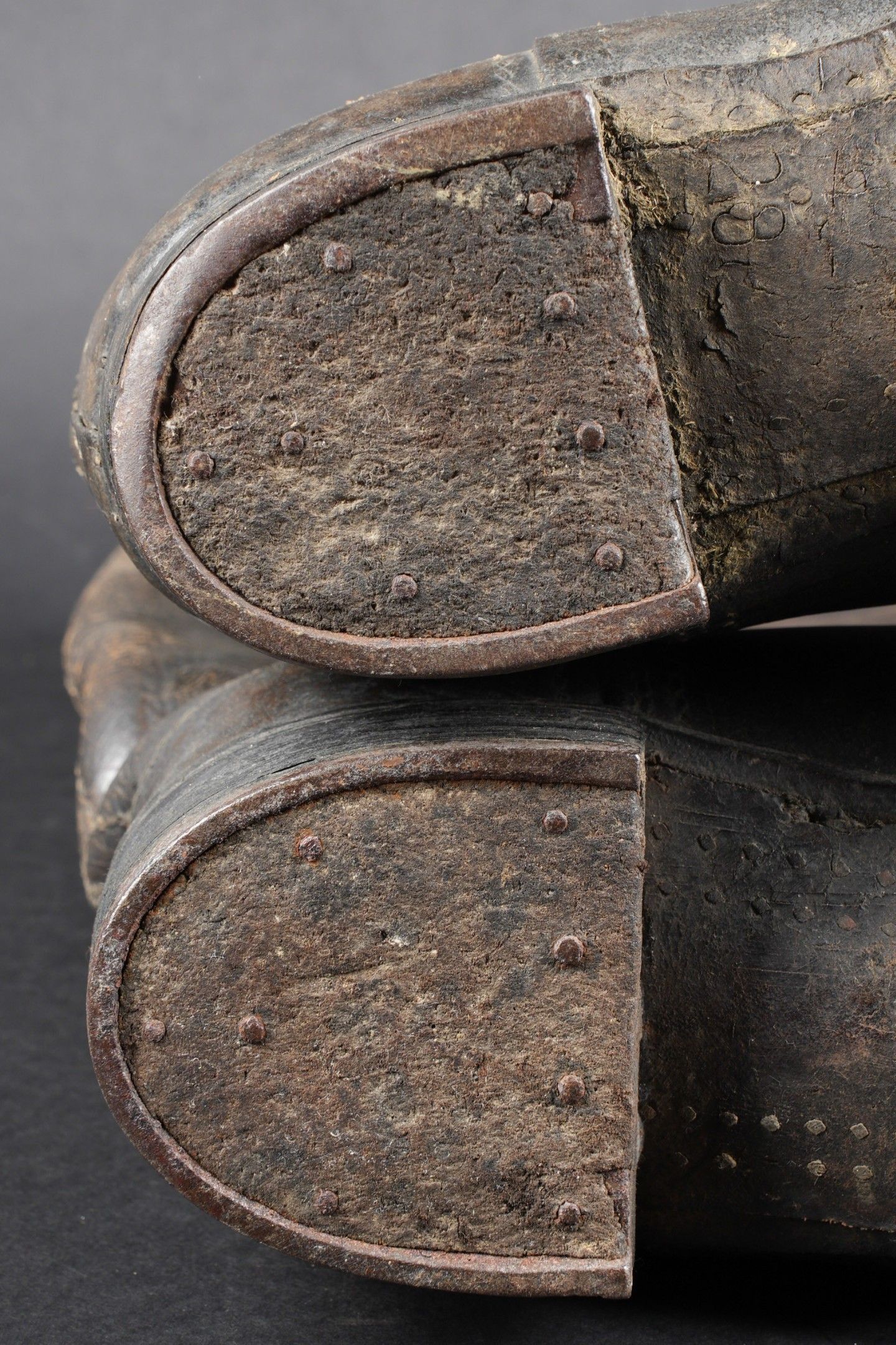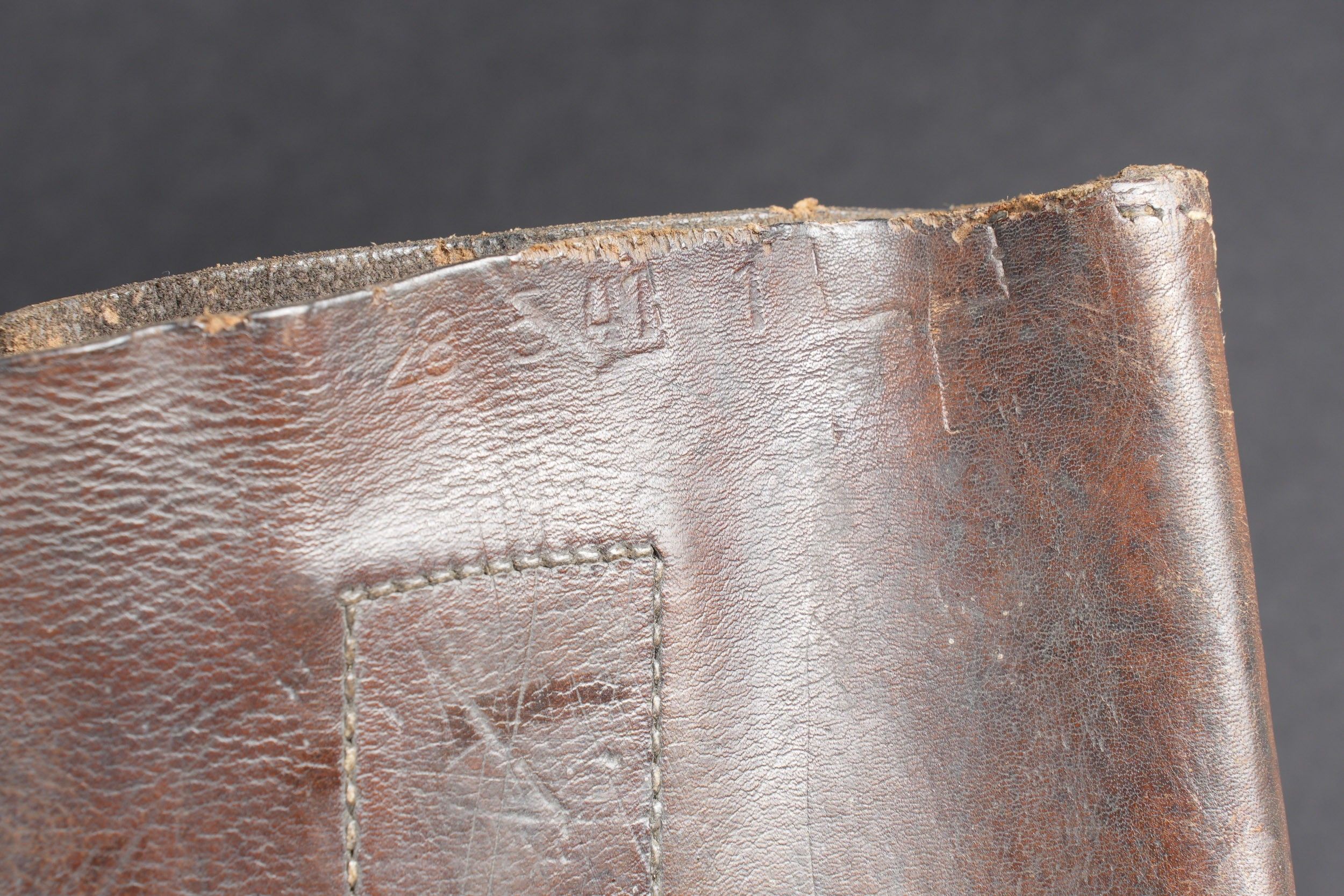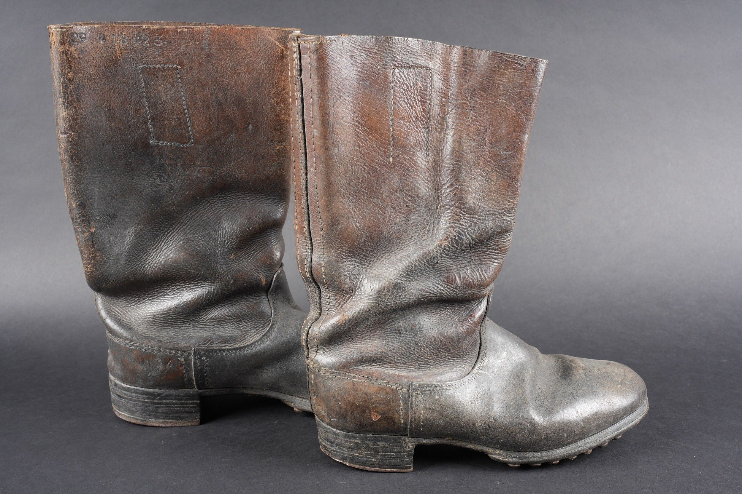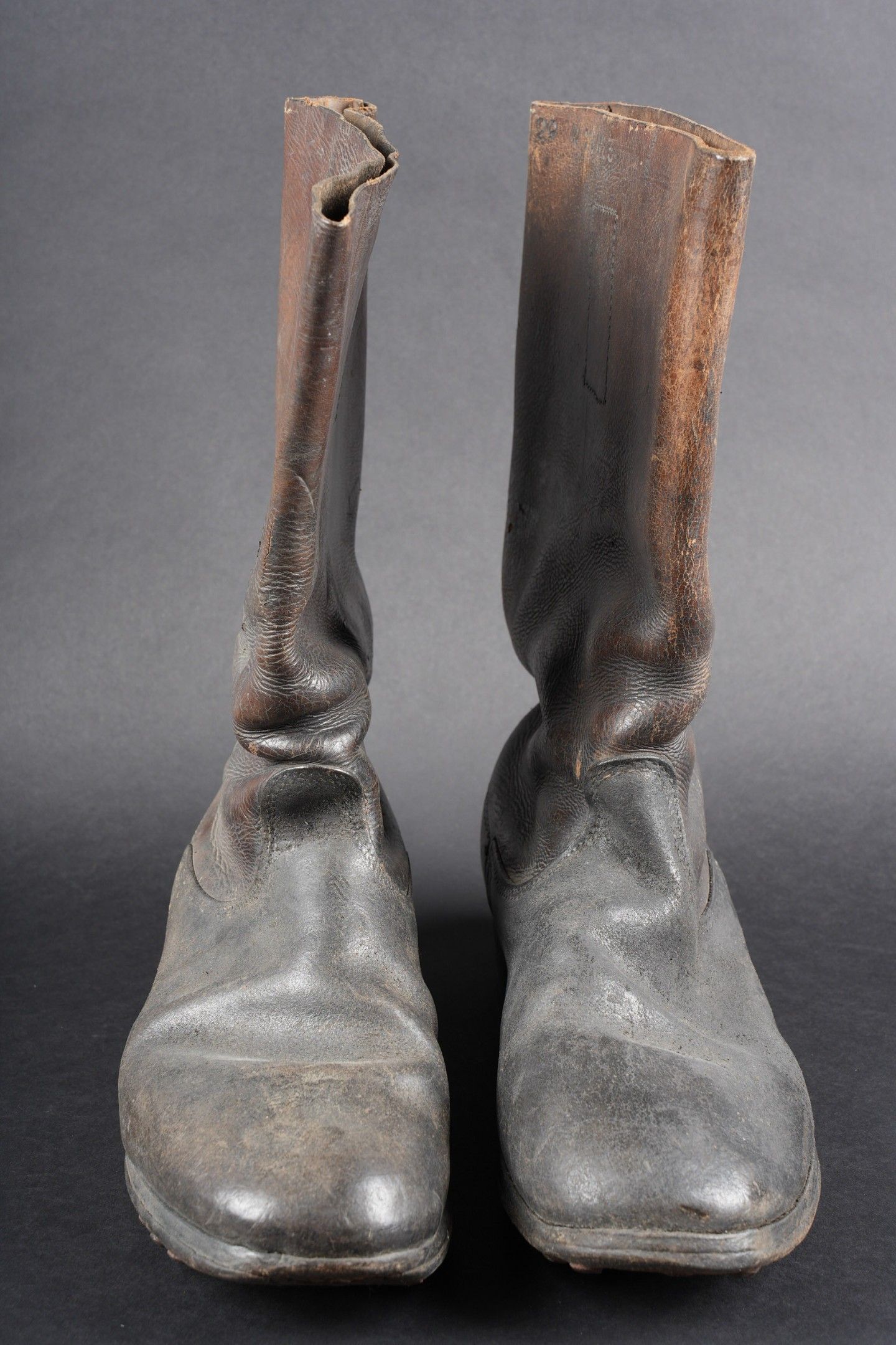 German boots. Short uppers. Dark brown leather. Pair not homogeneous. Markings on the side 28 5 41 1 and 29 4 18 42 3. Studded soles. Many studs missing. Shoe heels. Some wear and patina. Condition II+. German Boots. Short shaft model in dark brown leather, non-matching pair. Markings on the sides 28 5 41 1 and 29 4 18 42 3. Studded soles with several missing hobnails. Iron-shod heels. Displays typical wear and patina from service use. Condition II+.