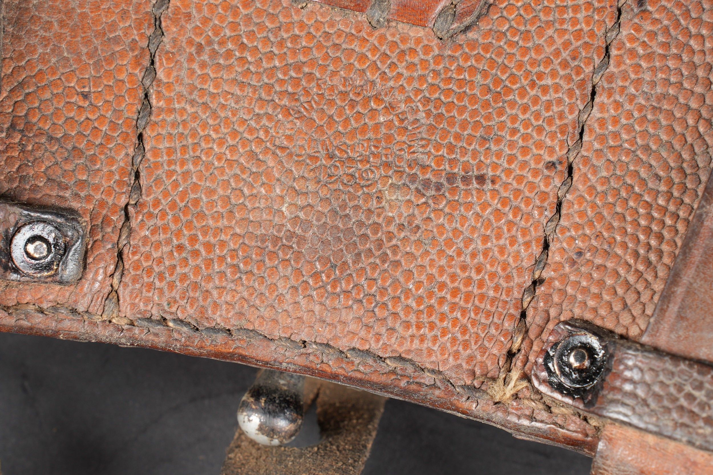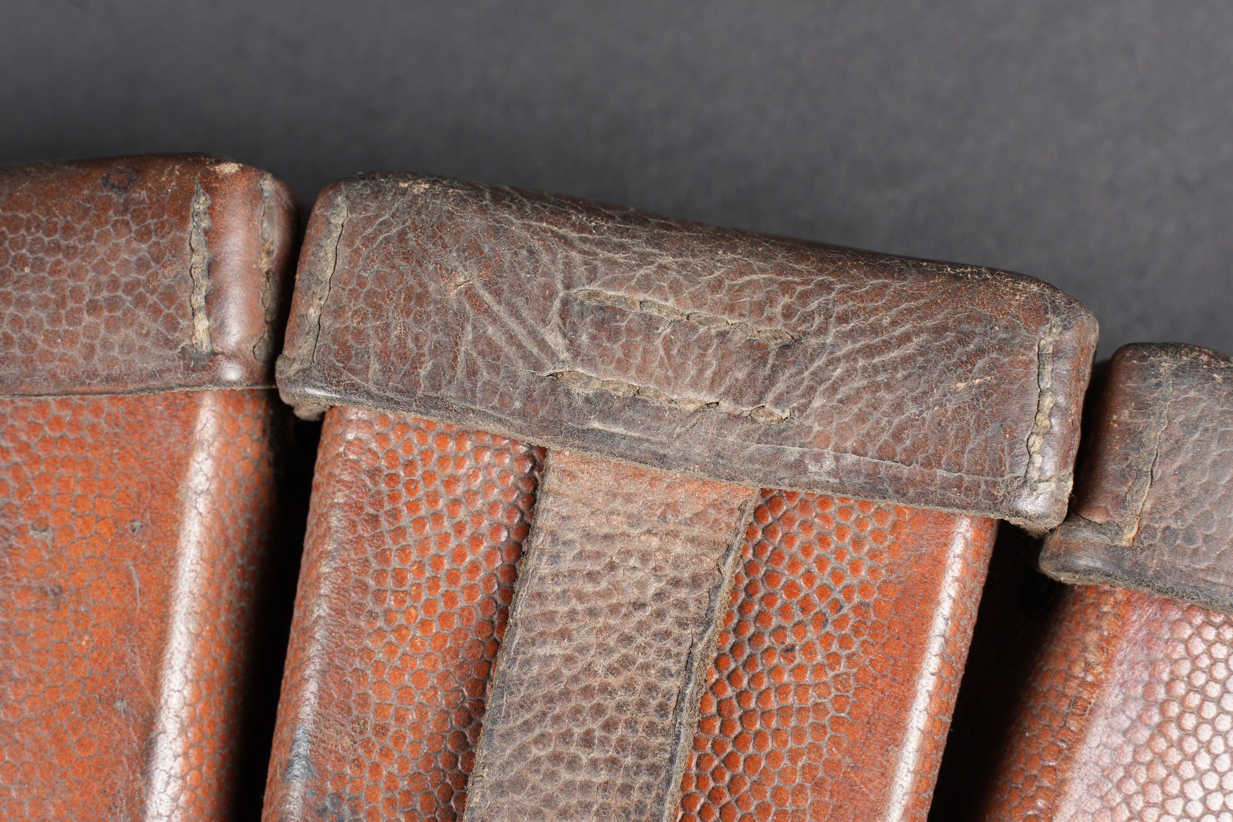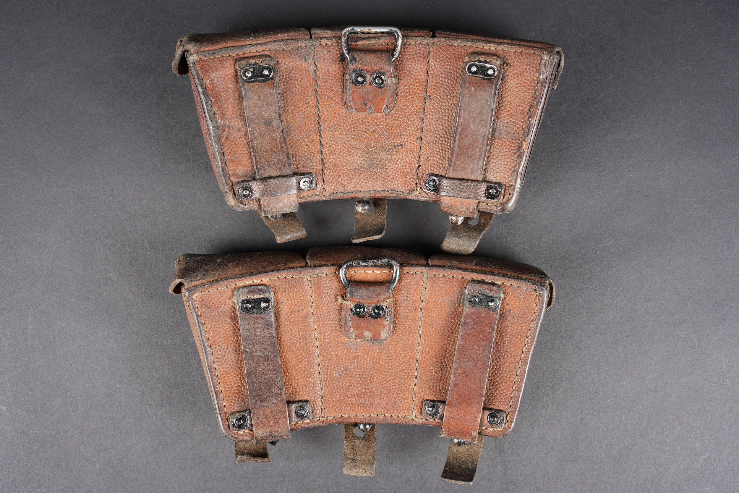 Mauser 98K cartridge belts. Uniform pair in brown grained leather. All straps are present. The rear rings are present. Markings 1939 and 1943. Some wear and patina. Condition II+. Mauser 98K Ammunition Pouches. Non-matching pair in brown pebbled leather. All straps and rear belt loops intact. Marked 1939 and 1943. Displays light wear and patina consistent with age. Condition II+.