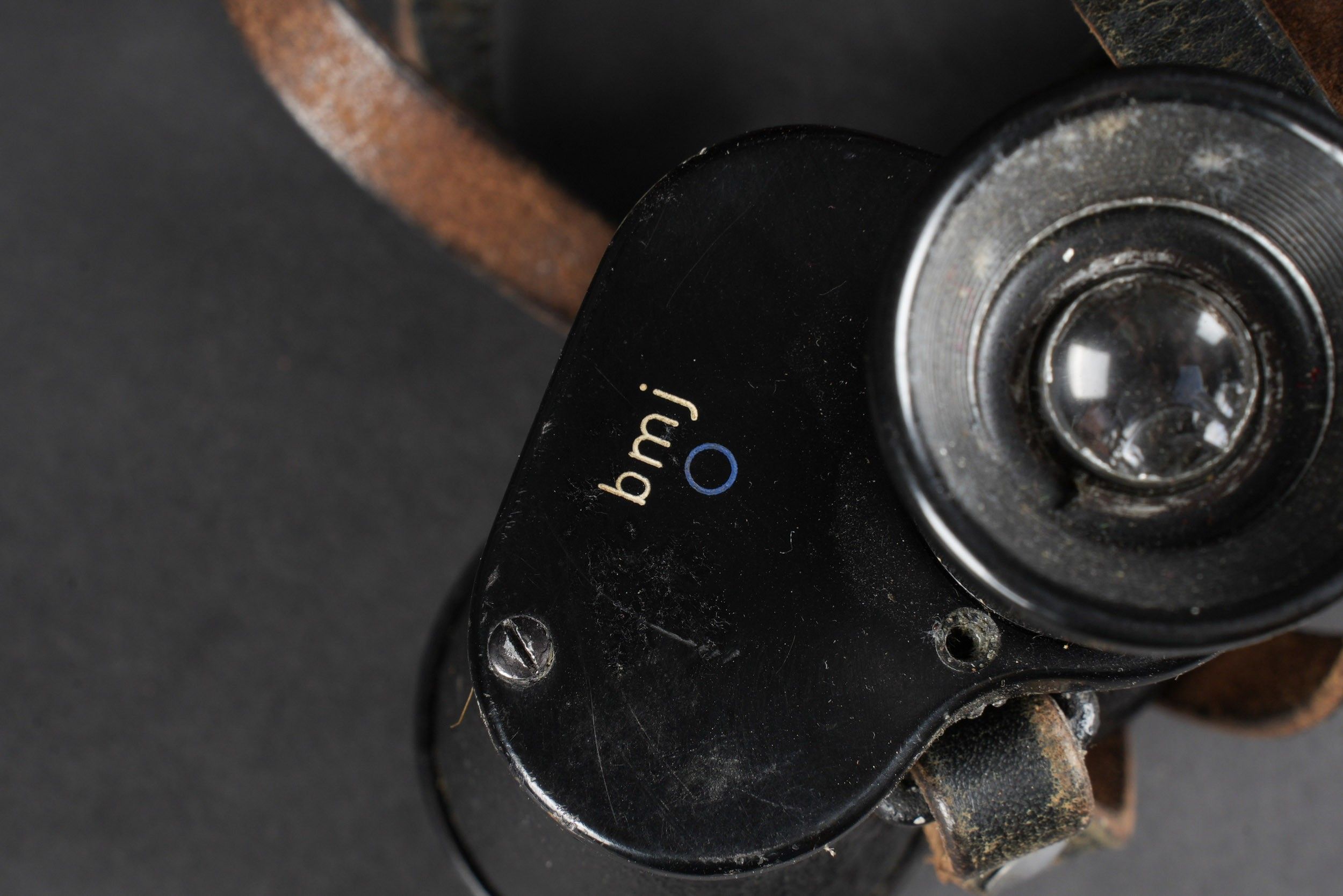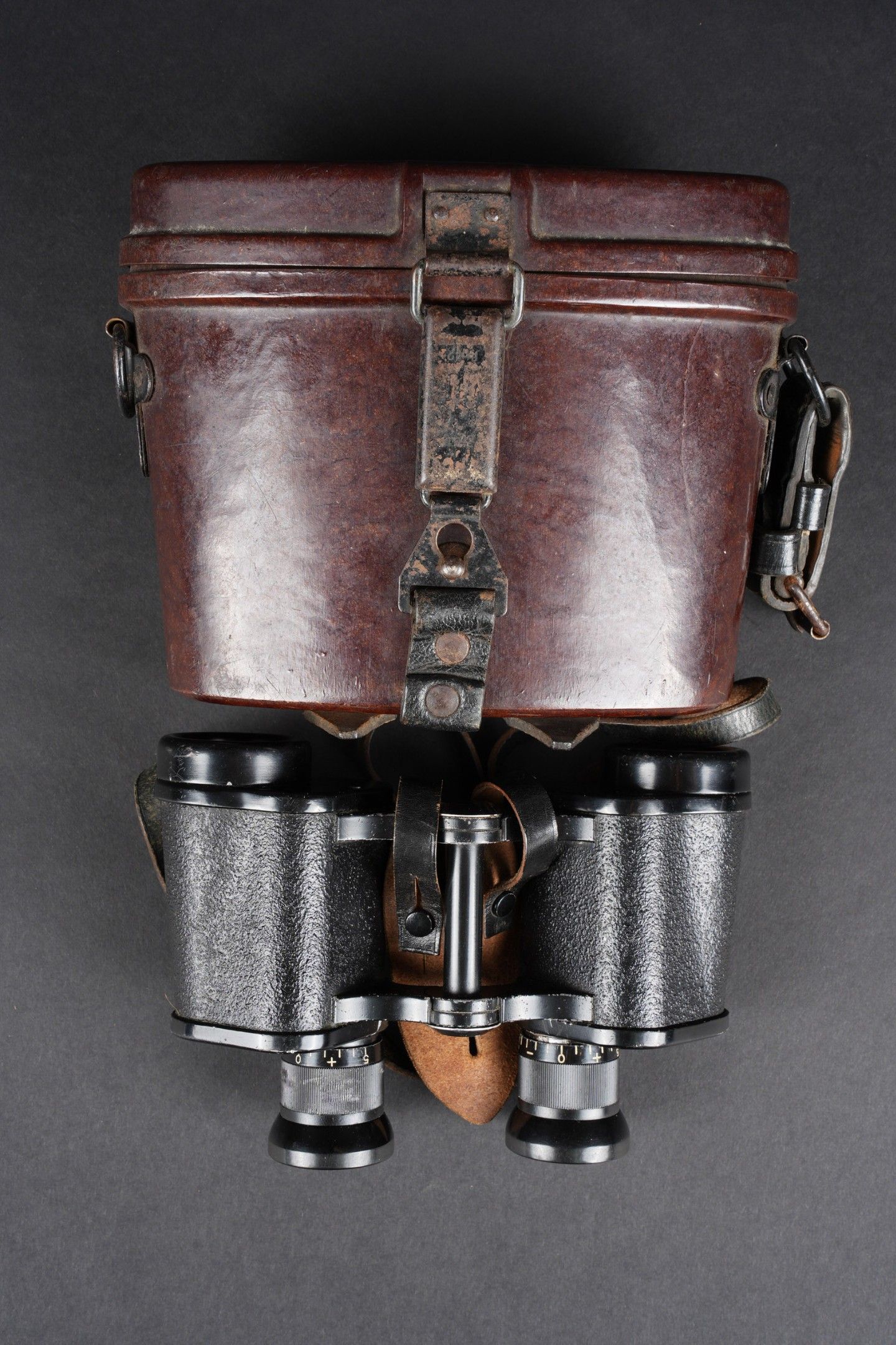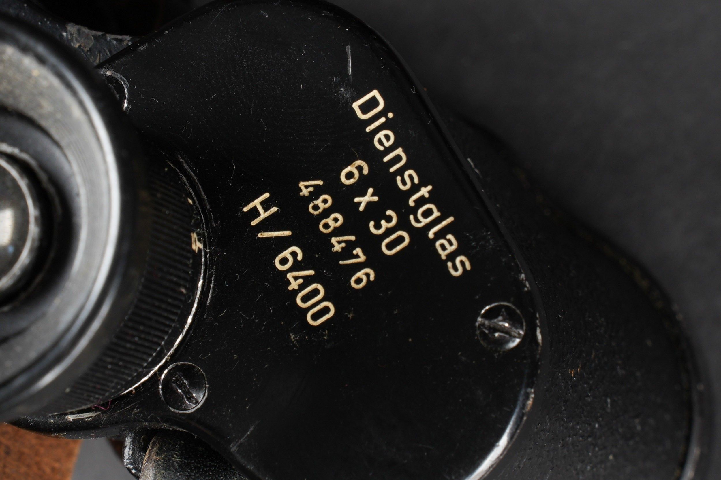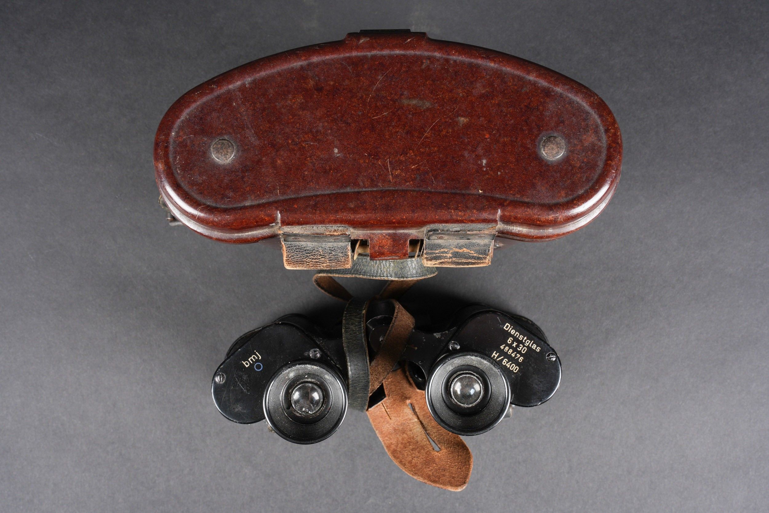 German binocular. Coating in very good condition. 95% black. BMJ markings with blue circle. Dienstglass 6 x 30 488476 H/6400. The leather carrying strap is present, as is the buttonhole attachment. Clear graduated optics with a few stains. Brown bakelite case. Remainder of carrying strap present. Pull tab complete with leather cord. The leather loops are complete. The hinge is broken. Some wear and patina. Condition II+. German binoculars. Coating in very good condition, black paint at 95%. Marked BMJ with blue circle. Dienstglas 6x30 488476 H/6400. Leather carrying strap and buttonhole strap present. Clear optics with slight spotting, graduated lenses. Brown bakelite case with partial leather carrying strap. Complete pull tab with leather cord. Leather loops intact, hinge broken. Shows some wear and patina. Condition II+.