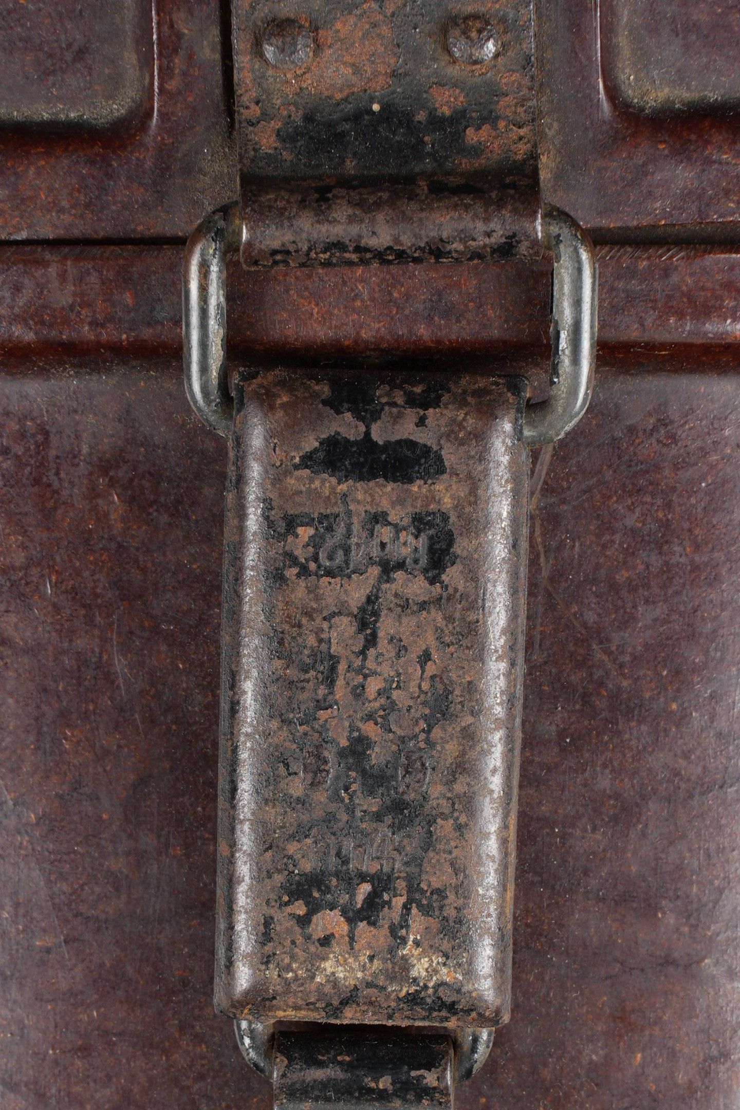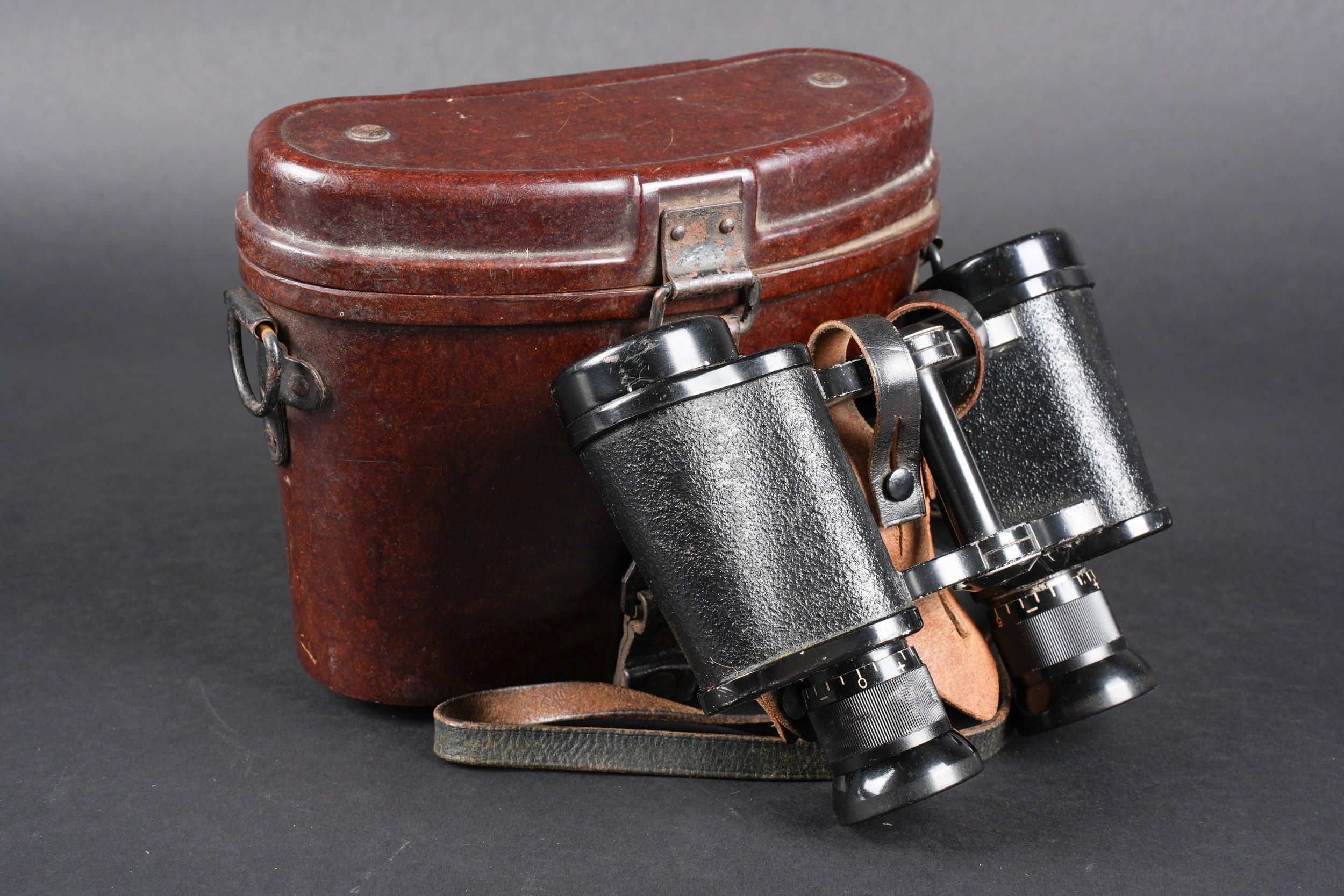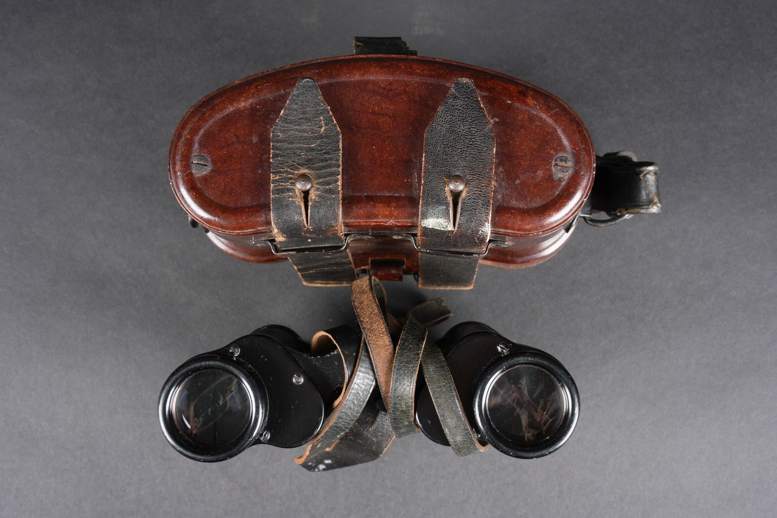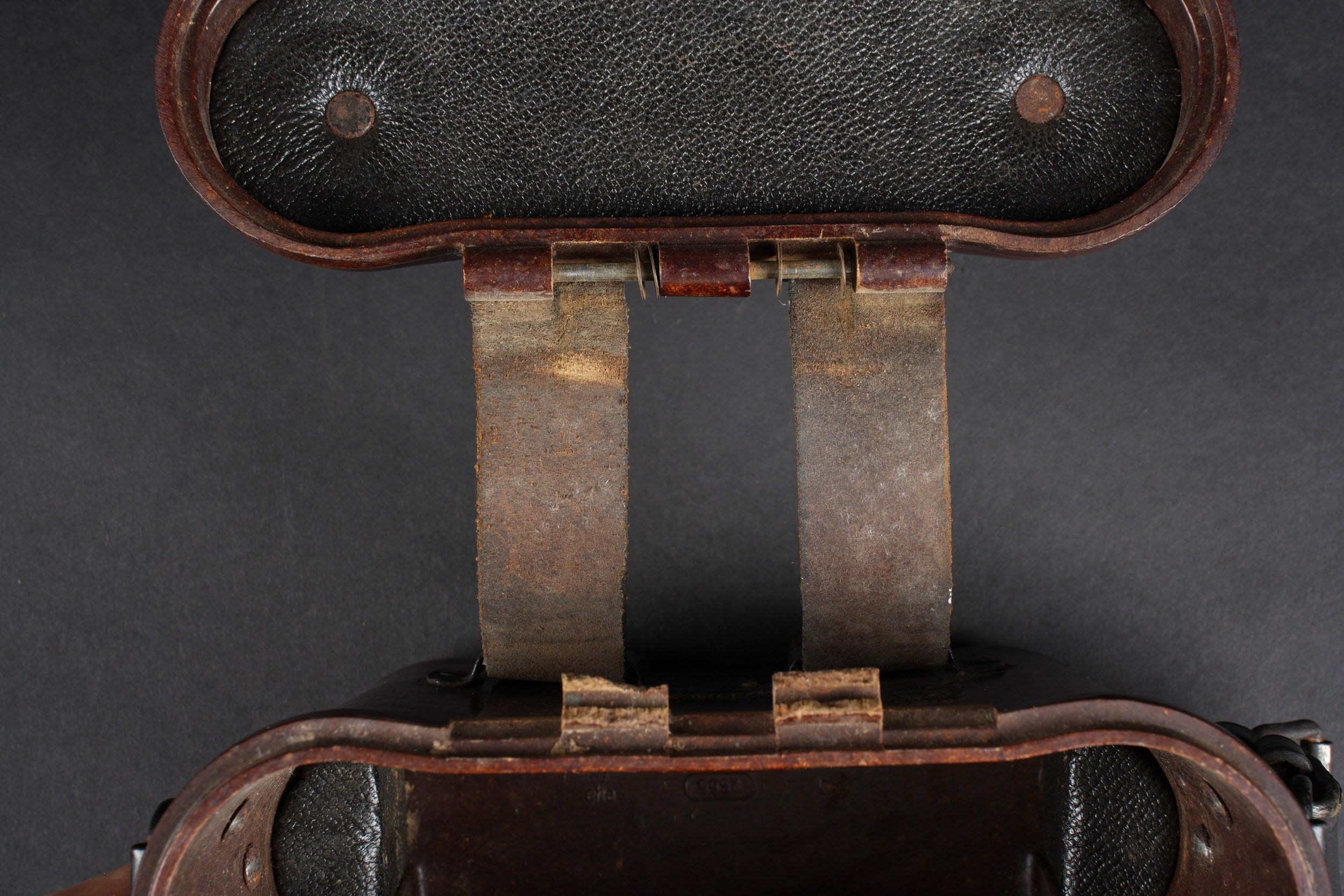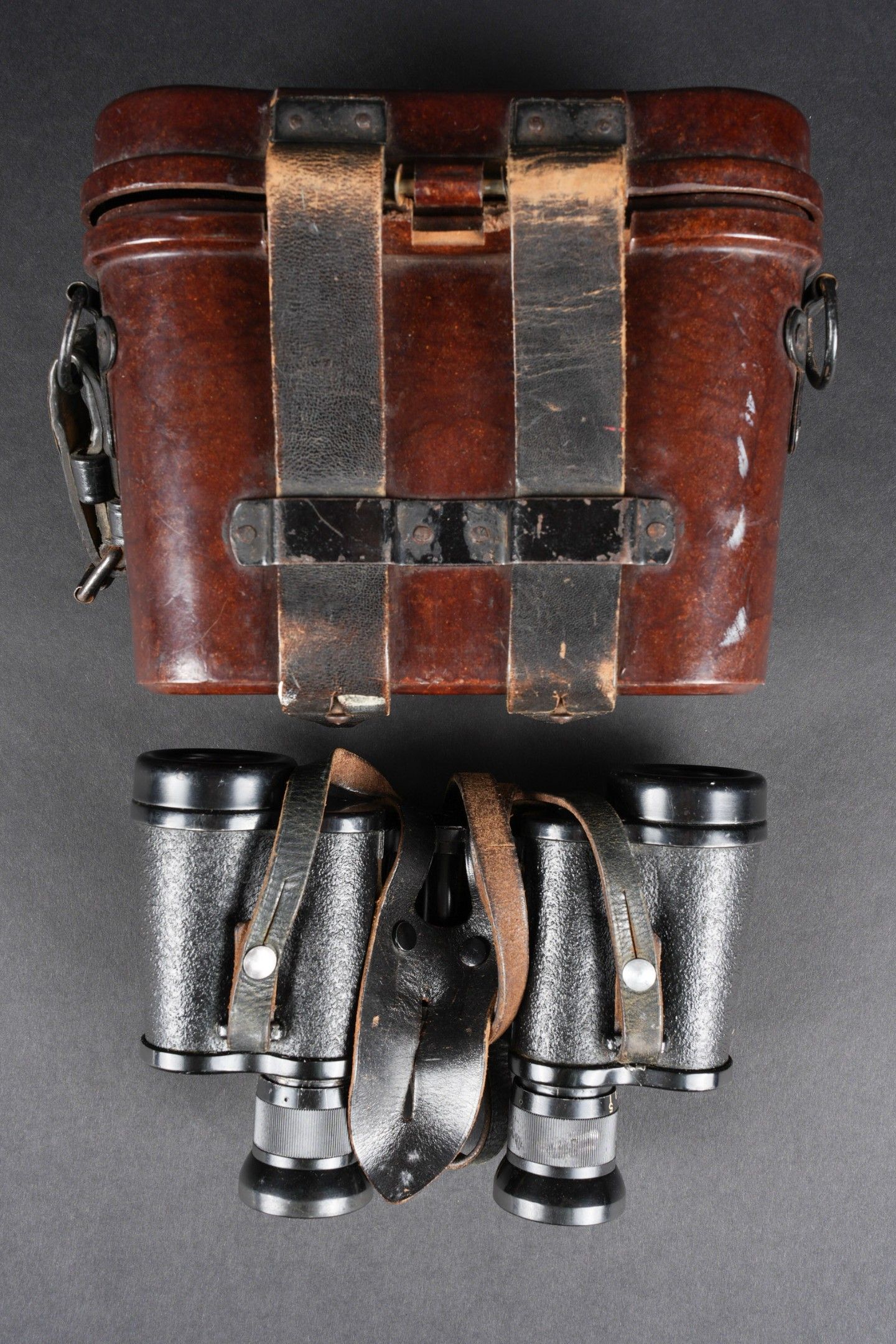 German binocular. Coating in very good condition. 95% black. BMJ markings with blue circle. Dienstglass 6 x 30 488476 H/6400. The leather carrying strap is present, as is the buttonhole attachment. Clear graduated optics with a few stains. Brown bakelite case. Remainder of carrying strap present. Pull tab complete with leather cord. The leather loops are complete. The hinge is broken. Some wear and patina. Condition II+. German binoculars. Coating in very good condition, black paint at 95%. Marked BMJ with blue circle. Dienstglas 6x30 488476 H/6400. Leather carrying strap and buttonhole strap present. Clear optics with slight spotting, graduated lenses. Brown bakelite case with partial leather carrying strap. Complete pull tab with leather cord. Leather loops intact, hinge broken. Shows some wear and patina. Condition II+.