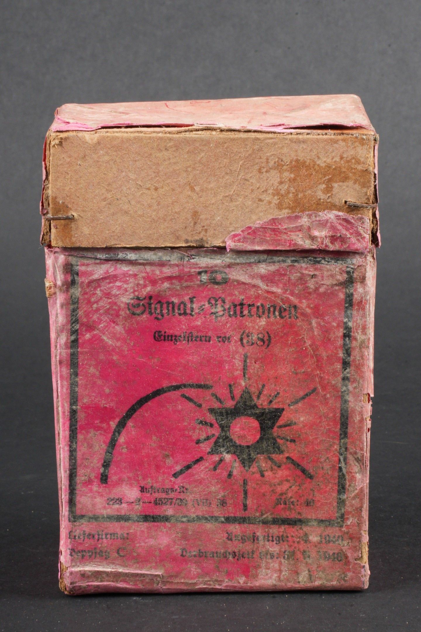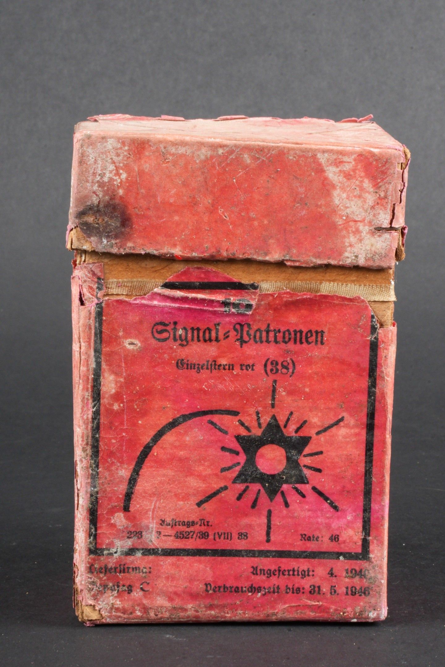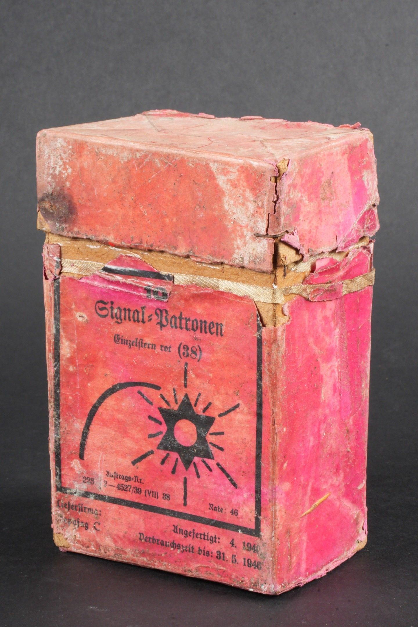 Flare box. Cardboard, open and empty. Red coloured set. Markings Signal Patronen Einzelstern rot 38. Dated April 1940 and expired 31 May 1946. Some wear and patina, as well as tears and stains. Condition II+. Flare cartridge box. Cardboard box, open and empty, red colour. Marked Signal Patronen Einzelstern rot 38. Dated April 1940, expires May 31, 1946. Shows some wear, patina, and minor tears and stains. Condition II+.