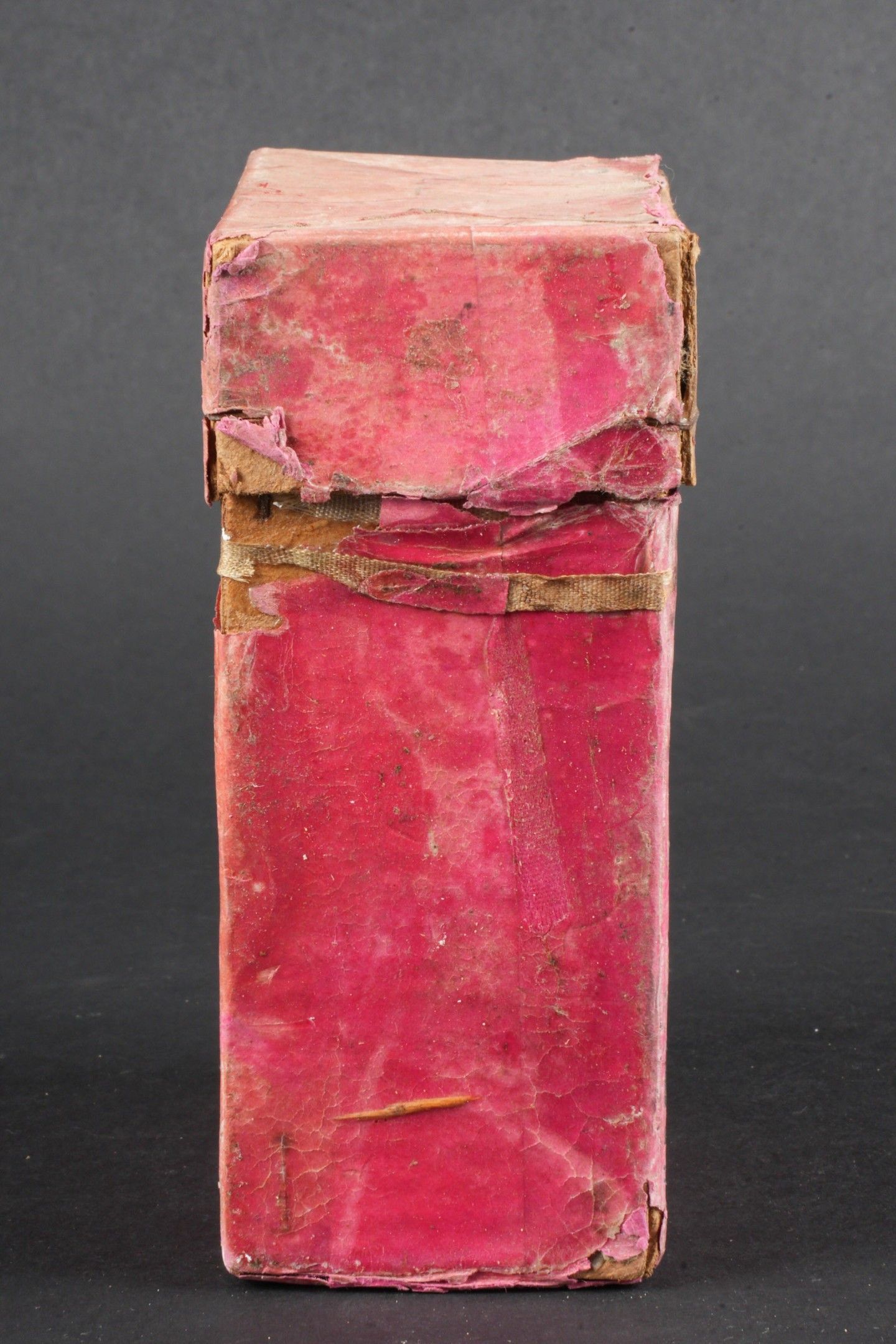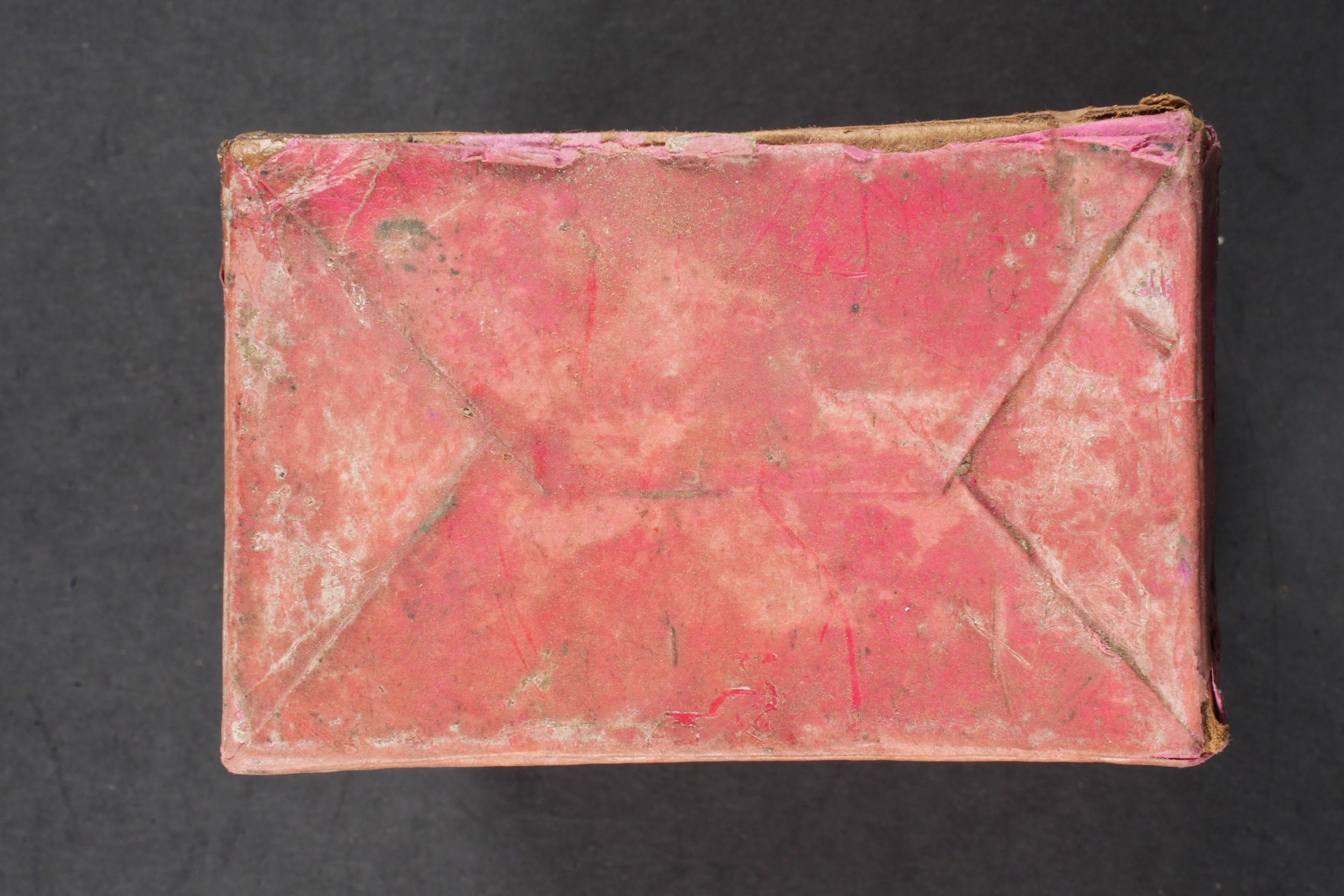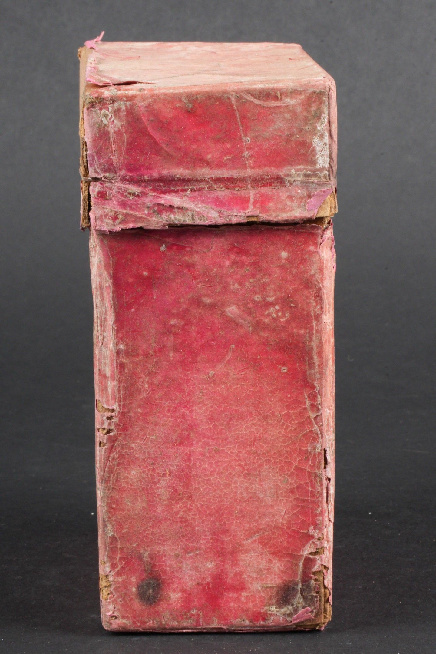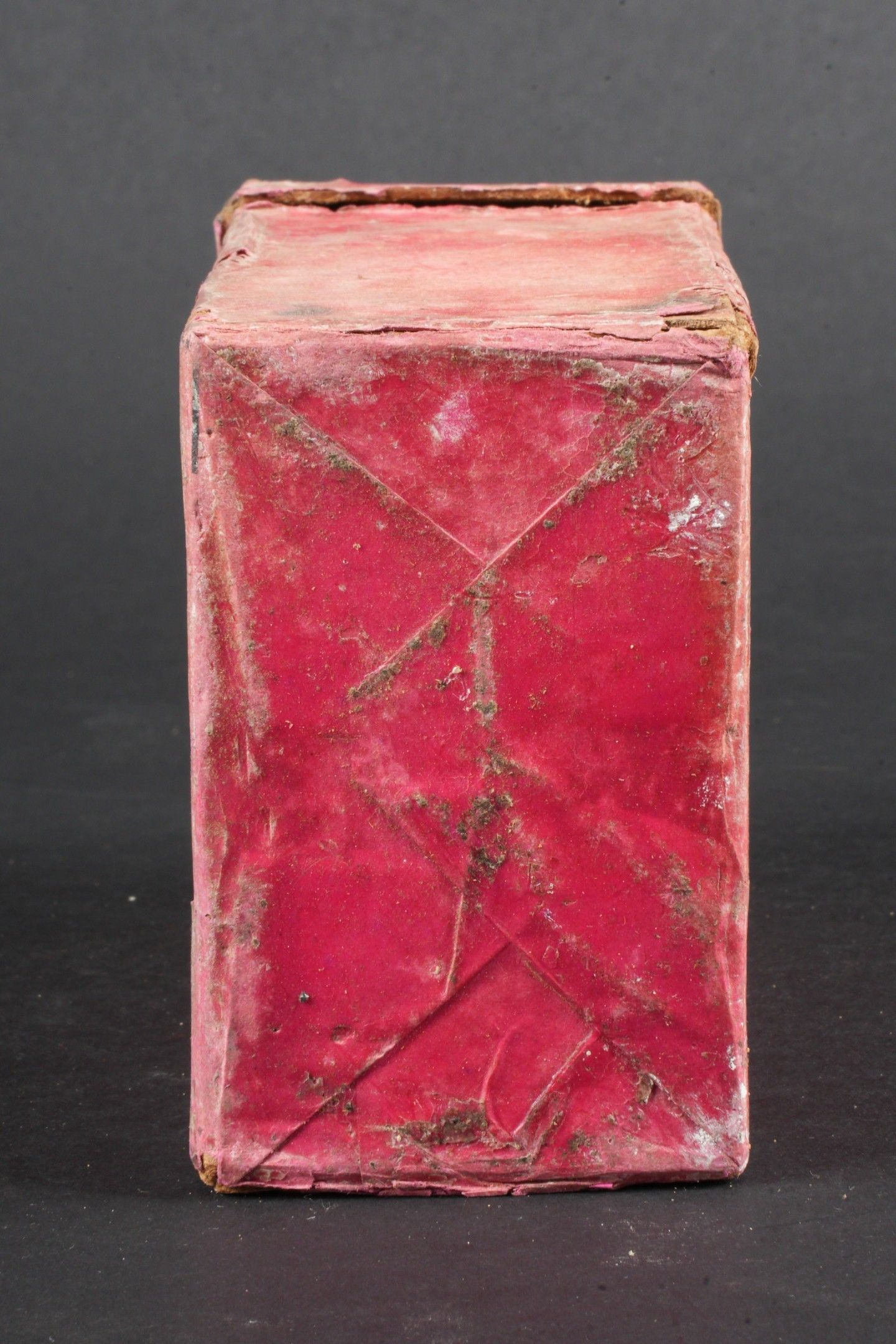 Flare box. Cardboard, open and empty. Red coloured set. Markings Signal Patronen Einzelstern rot 38. Dated April 1940 and expired 31 May 1946. Some wear and patina, as well as tears and stains. Condition II+. Flare cartridge box. Cardboard box, open and empty, red colour. Marked Signal Patronen Einzelstern rot 38. Dated April 1940, expires May 31, 1946. Shows some wear, patina, and minor tears and stains. Condition II+.