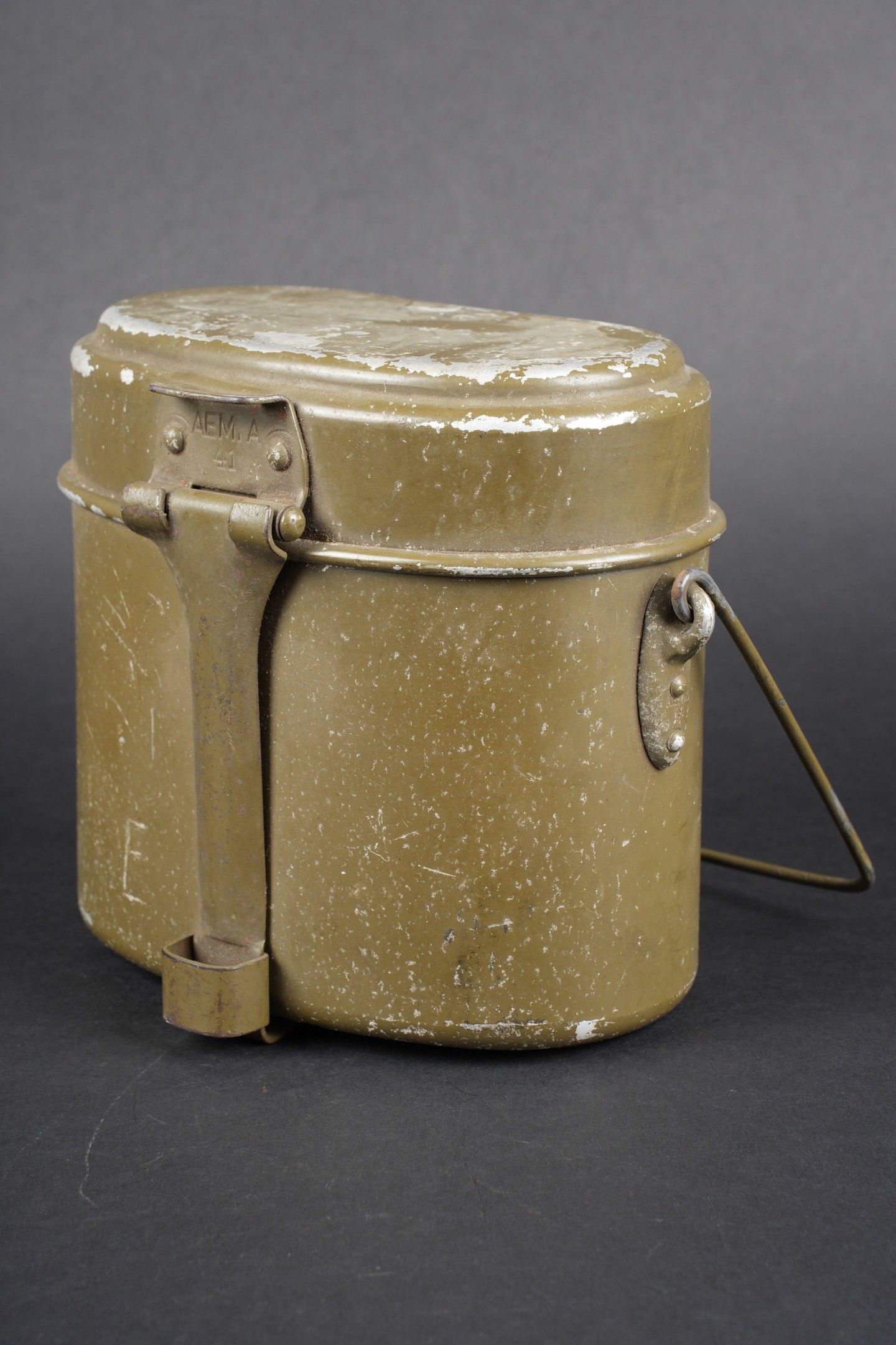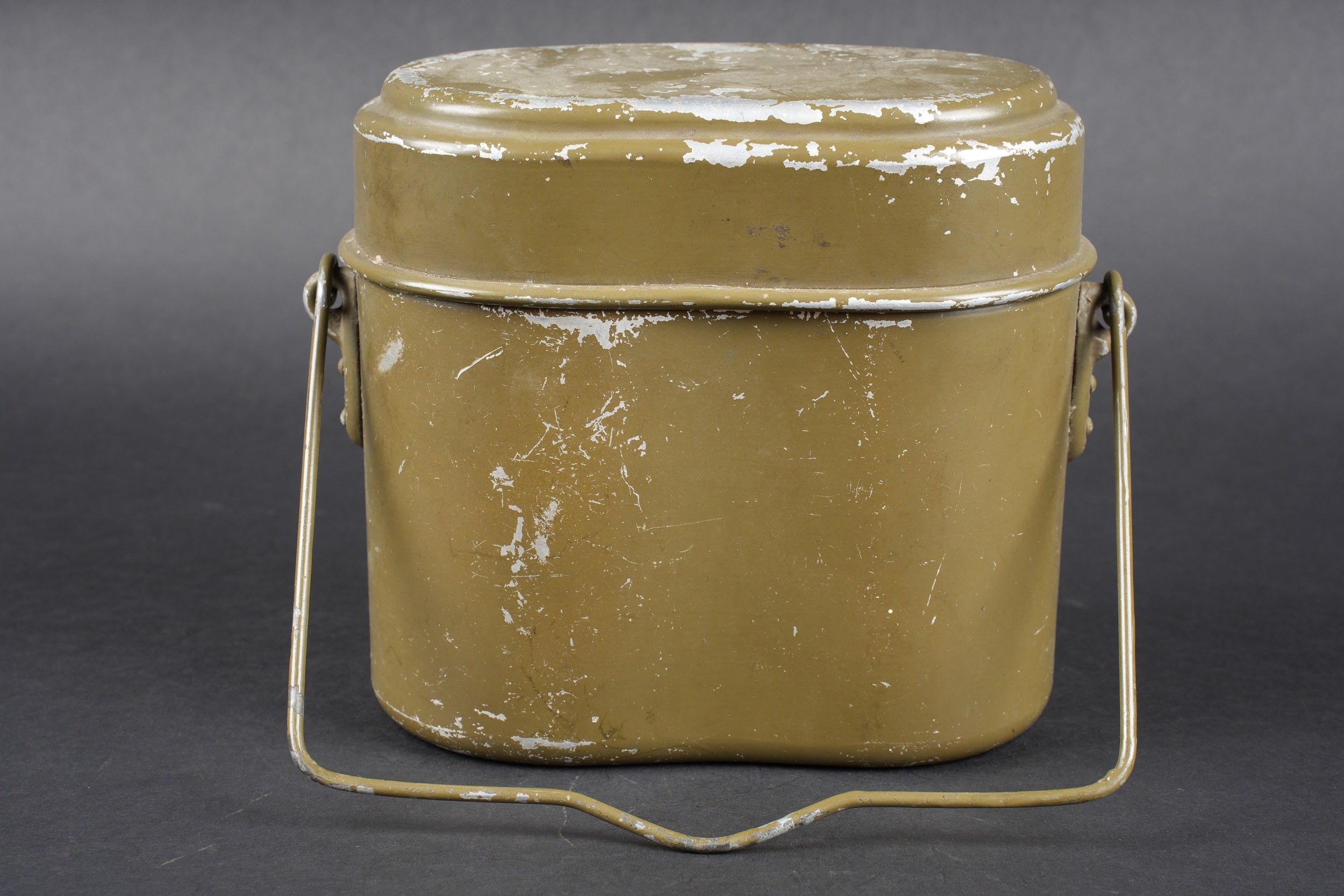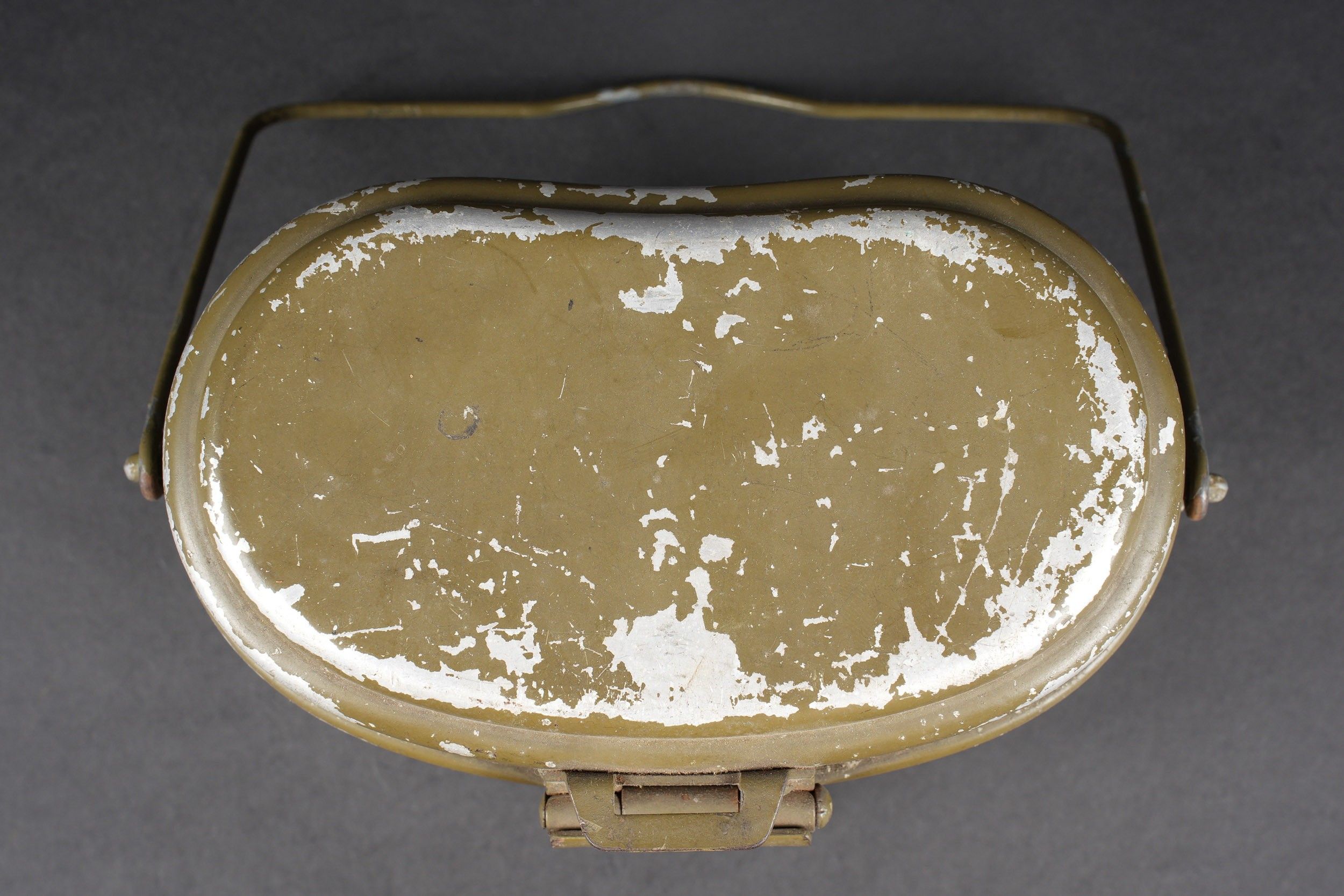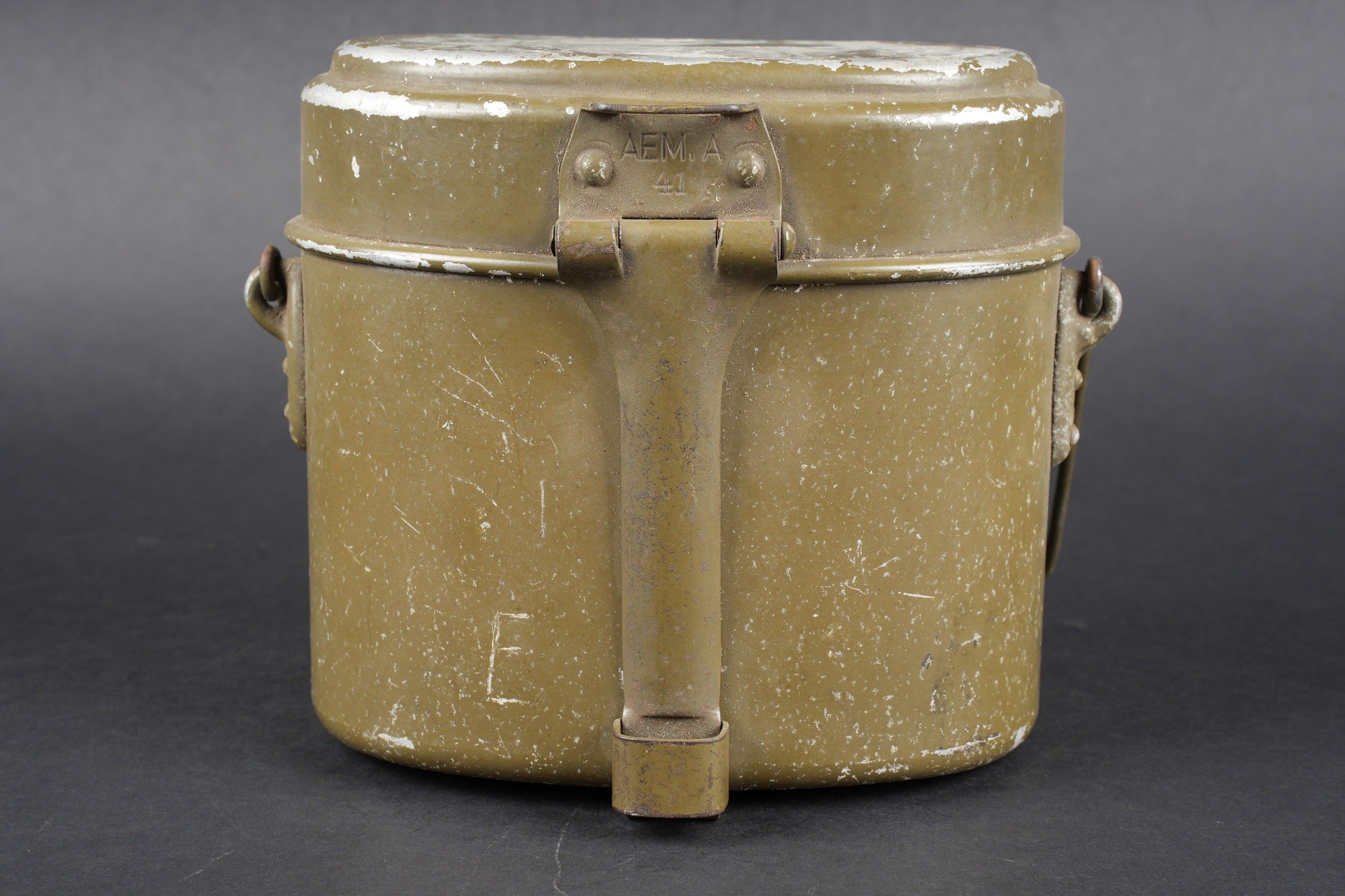 German bowl. Made of aluminium. 85% Feldgrau paint. Letter E engraved on the front of the bowl. The carrying handle is present. Manufactured by AEM A 41. Homogeneous set. Some wear and patina. Condition II+. German mess tin. Aluminum, Feldgrau paint at 85%. Letter E engraved on the front. Carry handle present. Marked AEM A41. Homogeneous set. Shows some wear and patina. Condition II+.