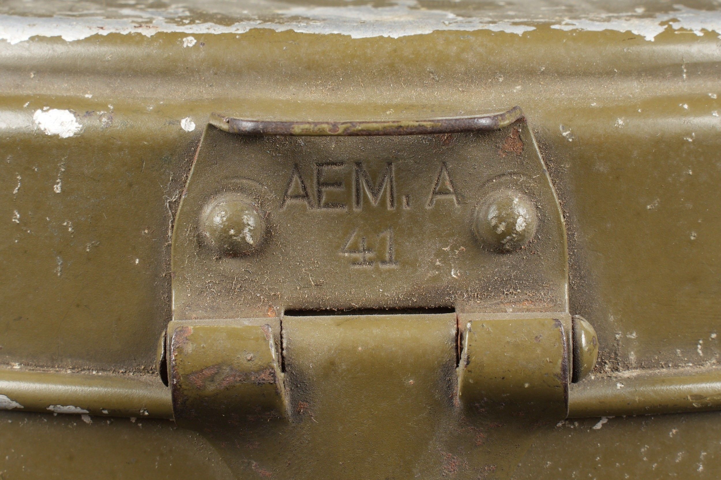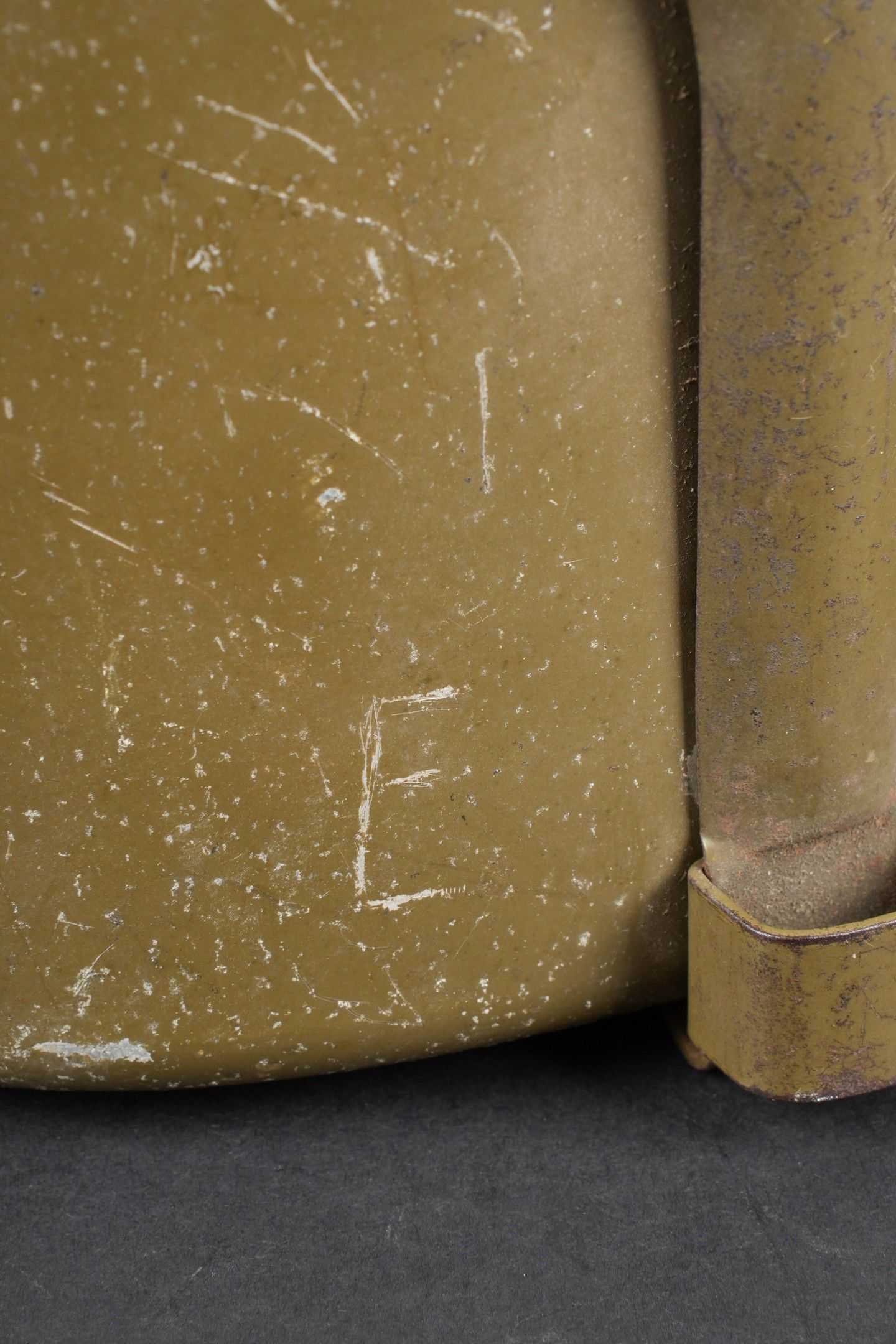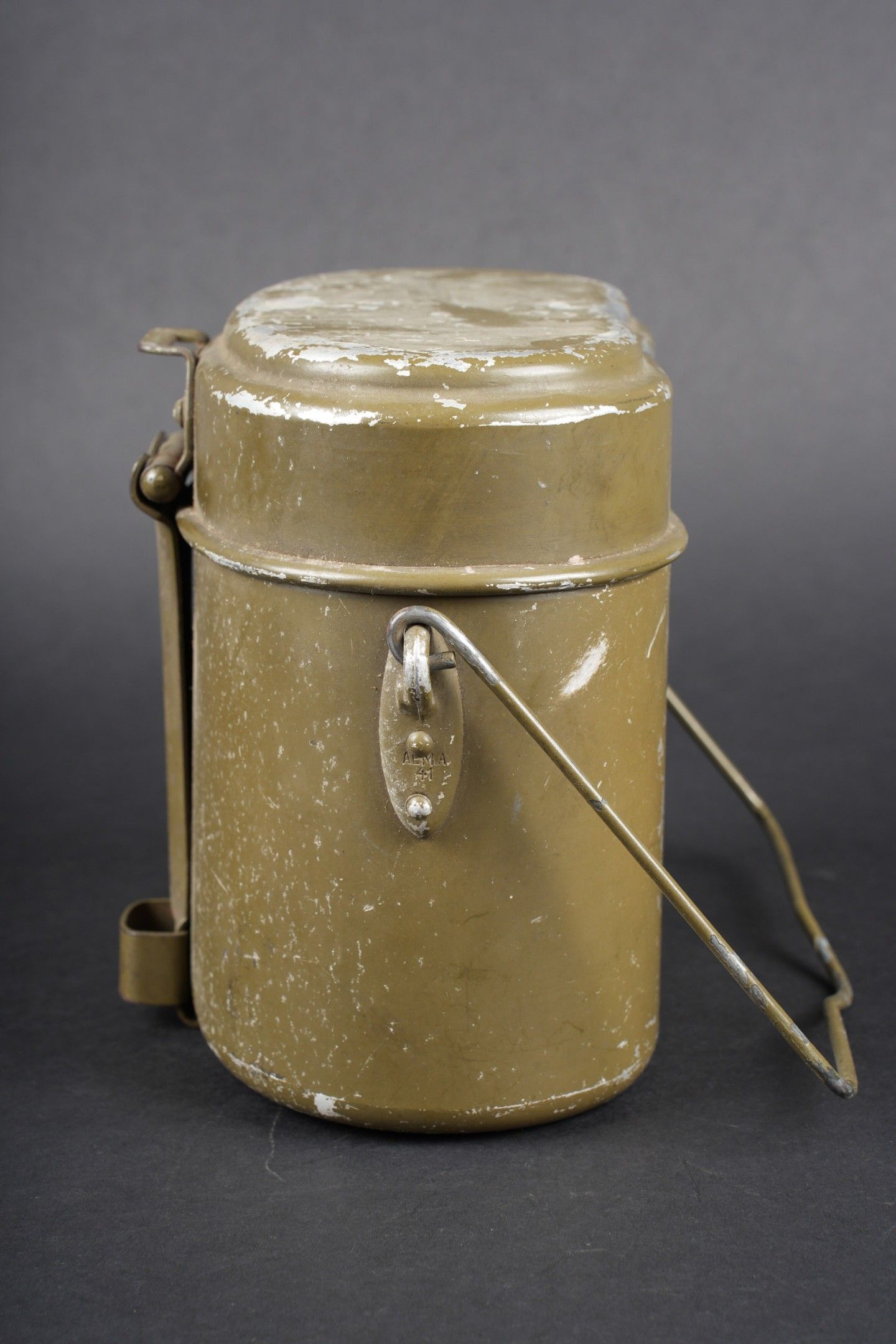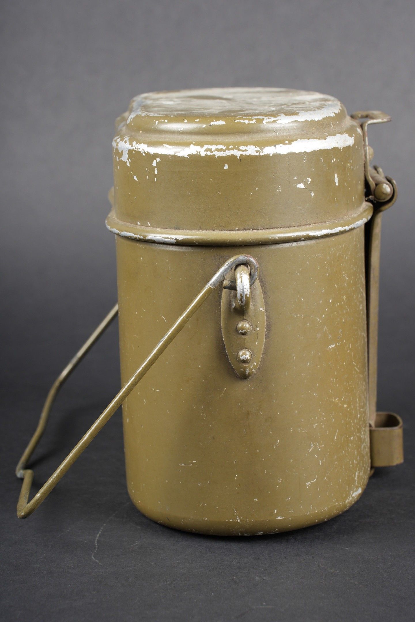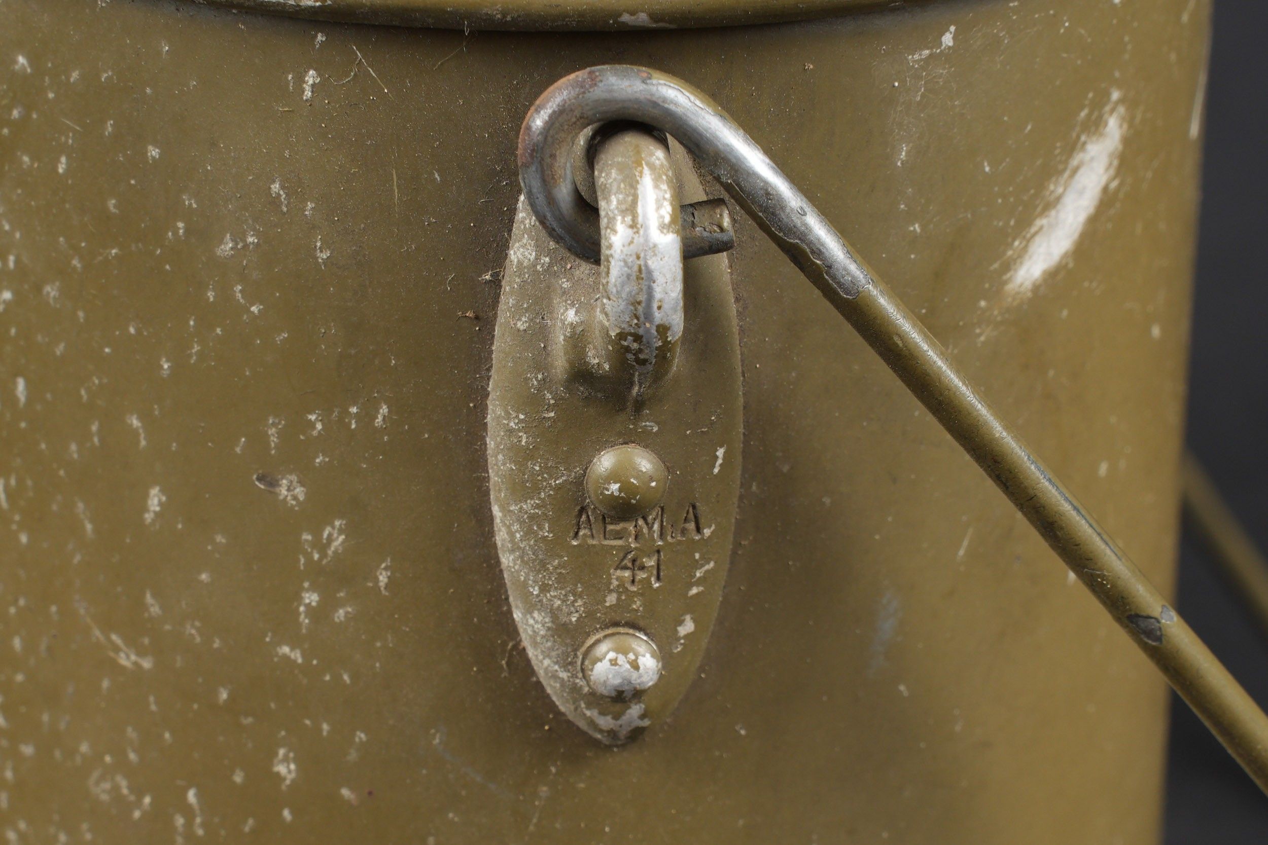 German bowl. Made of aluminium. 85% Feldgrau paint. Letter E engraved on the front of the bowl. The carrying handle is present. Manufactured by AEM A 41. Homogeneous set. Some wear and patina. Condition II+. German mess tin. Aluminum, Feldgrau paint at 85%. Letter E engraved on the front. Carry handle present. Marked AEM A41. Homogeneous set. Shows some wear and patina. Condition II+.