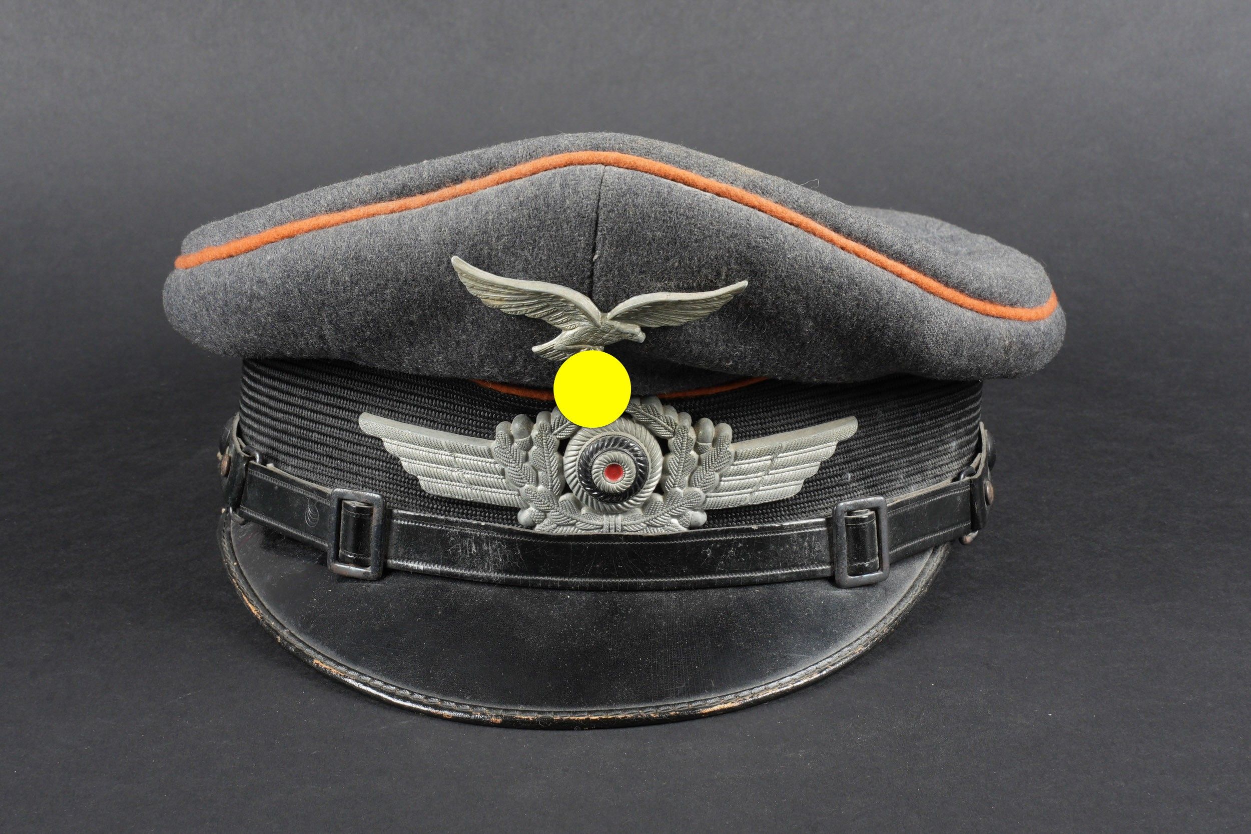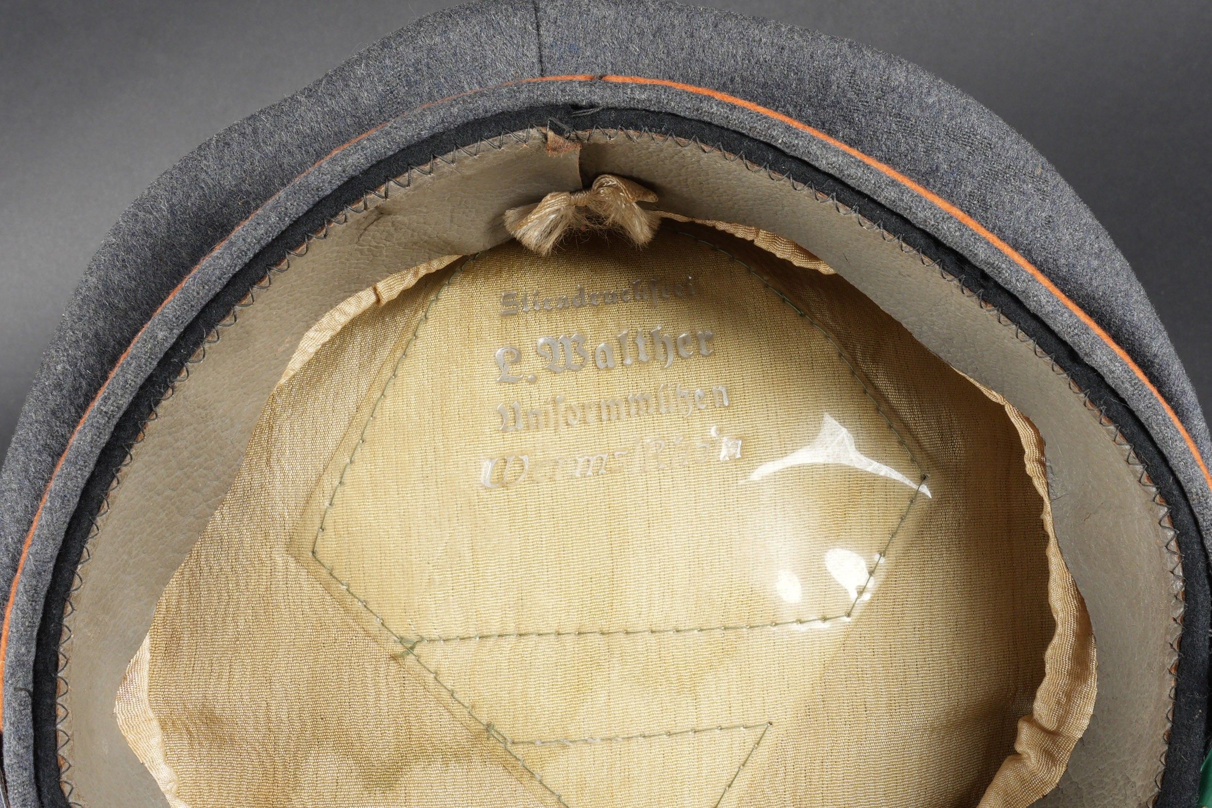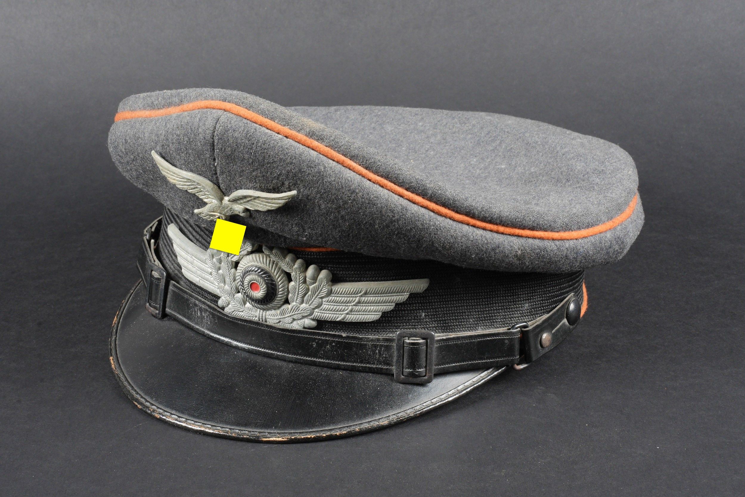 Signals non-commissioned officer's cap. In grey/blue cloth. Brown triple piping of Luftwaffe signal units. Black mohair headband. Metal insignia. The badges have not been dismantled in order to check the fastenings. Visor partially unstitched. Complete chinstrap. Grey fabric lining. Mica present. Manufactured by L Walther Uniformmmützen Werms Rhein. Grey leather sweatband. To note some wear and patina of the part, as well as some licks of moth, as well as traces of mould. Condition II+. Luftwaffe Signals NCO visor cap. Grey-blue wool with triple brown piping for signals units. Black mohair band. Metal insignia intact. Visor partly detached. Faux chinstrap complete. Grey cloth lining with celluloid diamond (mica) present. Maker marked L. Walther Uniformmützen, Worms/Rhein. Grey leather sweatband with repairs. Some moth damage and signs of moisture. Condition II+.