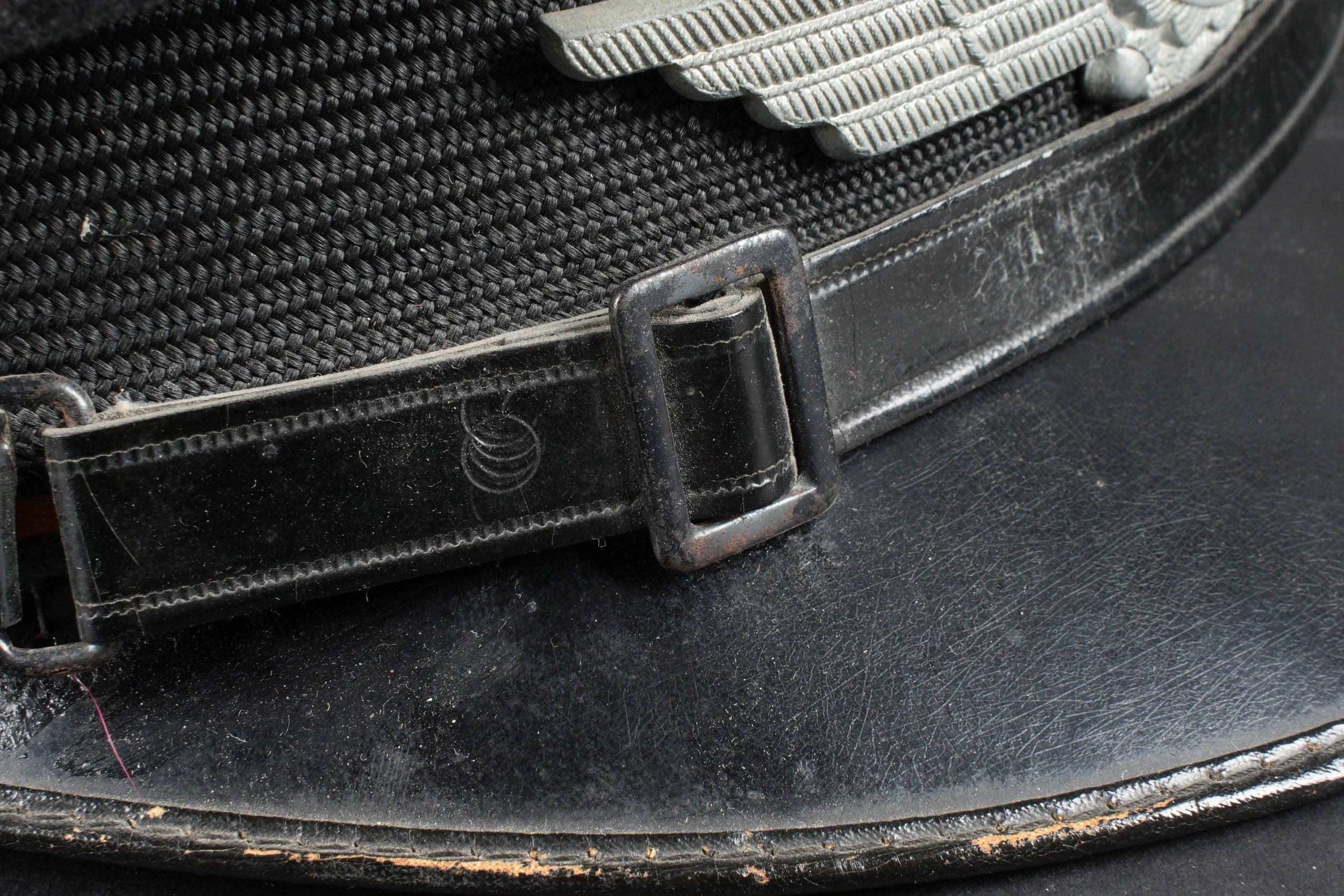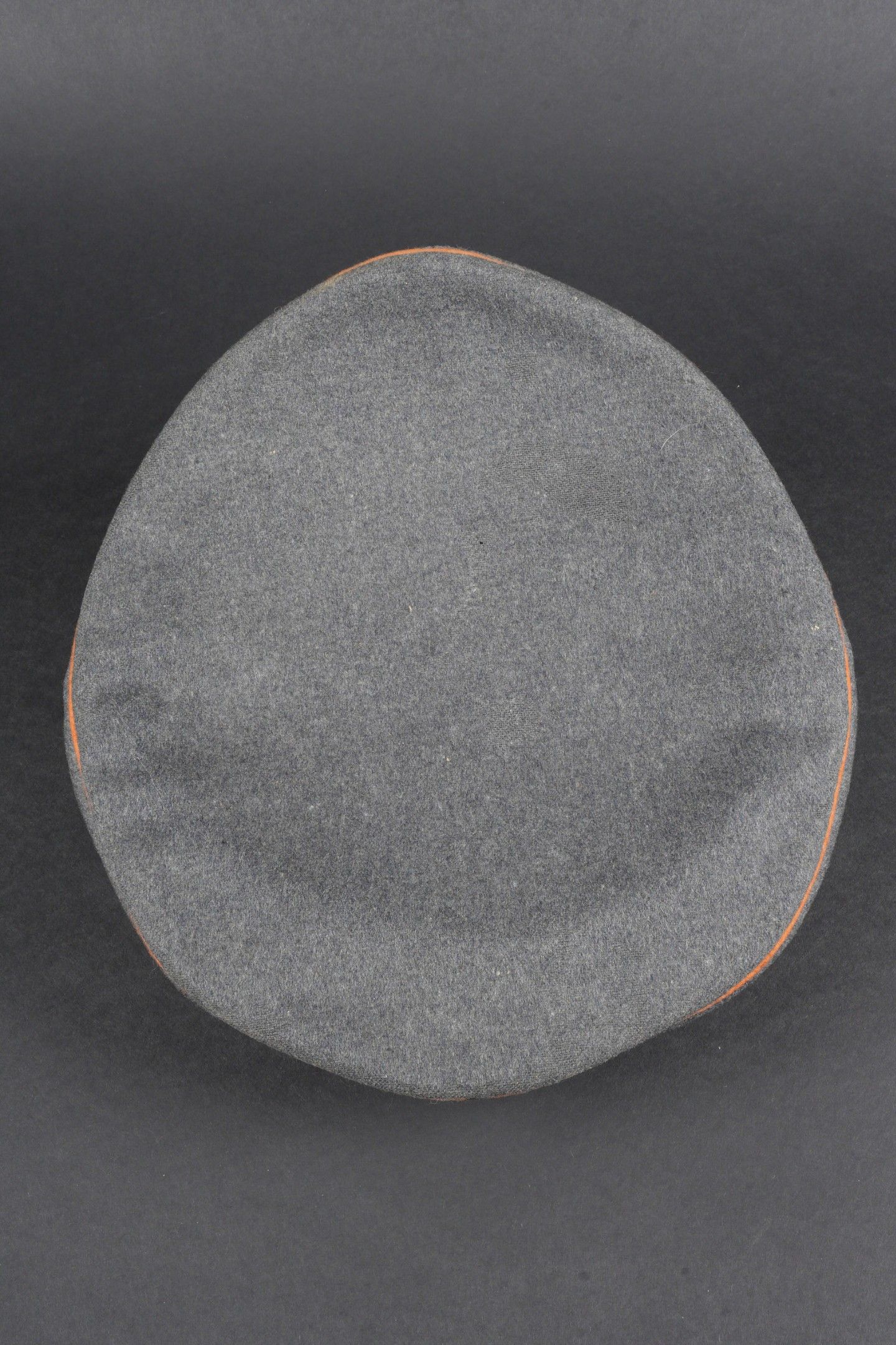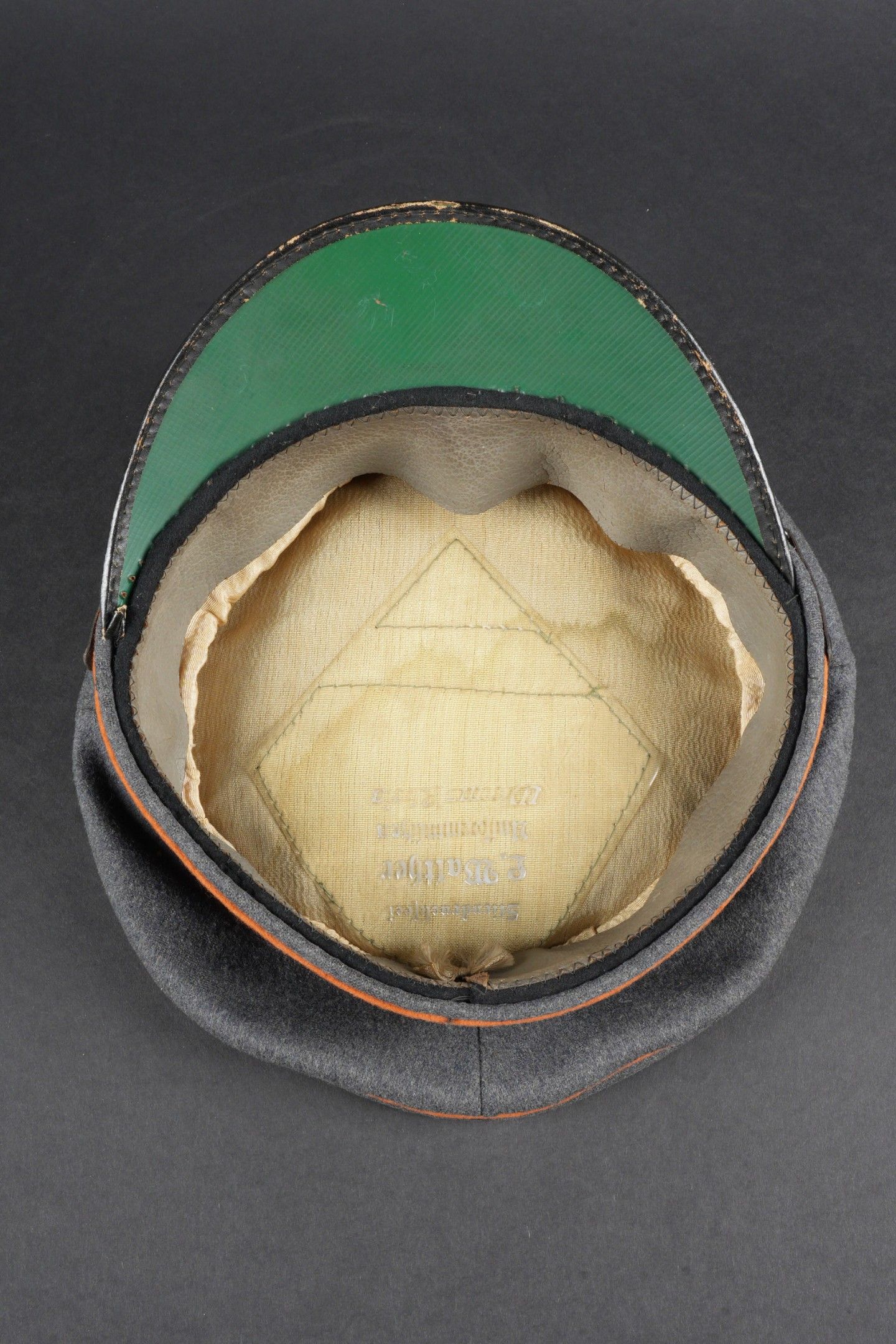 Signals non-commissioned officer's cap. In grey/blue cloth. Brown triple piping of Luftwaffe signal units. Black mohair headband. Metal insignia. The badges have not been dismantled in order to check the fastenings. Visor partially unstitched. Complete chinstrap. Grey fabric lining. Mica present. Manufactured by L Walther Uniformmmützen Werms Rhein. Grey leather sweatband. To note some wear and patina of the part, as well as some licks of moth, as well as traces of mould. Condition II+. Luftwaffe Signals NCO visor cap. Grey-blue wool with triple brown piping for signals units. Black mohair band. Metal insignia intact. Visor partly detached. Faux chinstrap complete. Grey cloth lining with celluloid diamond (mica) present. Maker marked L. Walther Uniformmützen, Worms/Rhein. Grey leather sweatband with repairs. Some moth damage and signs of moisture. Condition II+.
