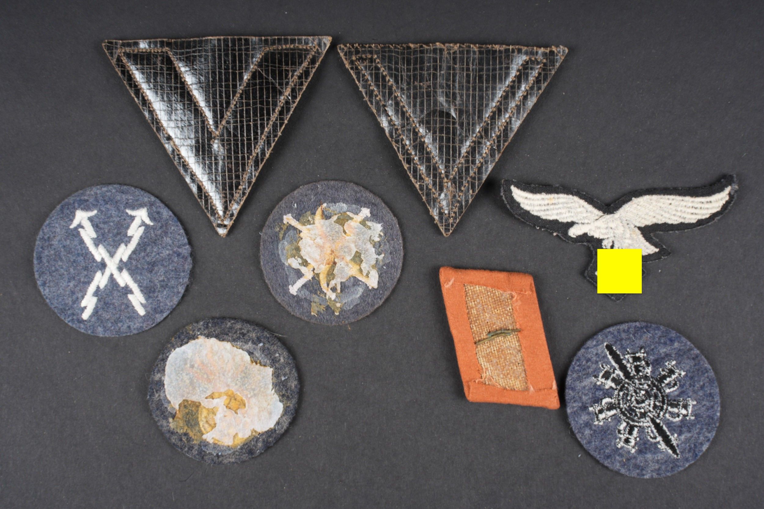 Luftwaffe insignia. Comprising one Aircraft Equipment Specialty Badge. An armourer's speciality badge. A Luftwaffe Signals rank. A telegrapher's speciality badge. An air raid warning personnel speciality badge. An obergefreiter sleeve rank. A Gefreiter sleeve rank. An embroidered breast eagle, never mounted. Some wear and patina to be noted. Condition II+. Luftwaffe insignia. Includes aircraft equipment specialist badge, armourer specialist badge, signals collar tab, telegraphist badge, air raid warning personnel badge, Obergefreiter rank chevron, Gefreiter rank chevron, and one unused machine-embroidered breast eagle. Some wear and patina consistent with age. Condition II+.