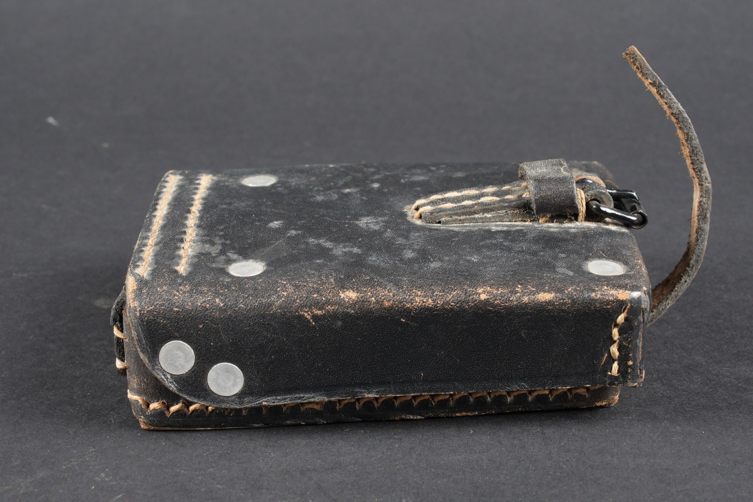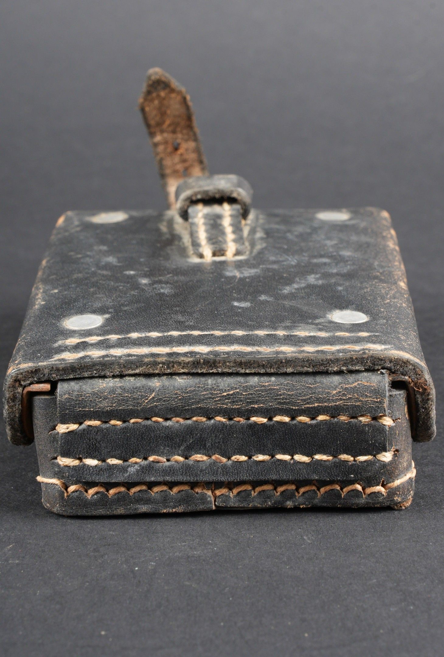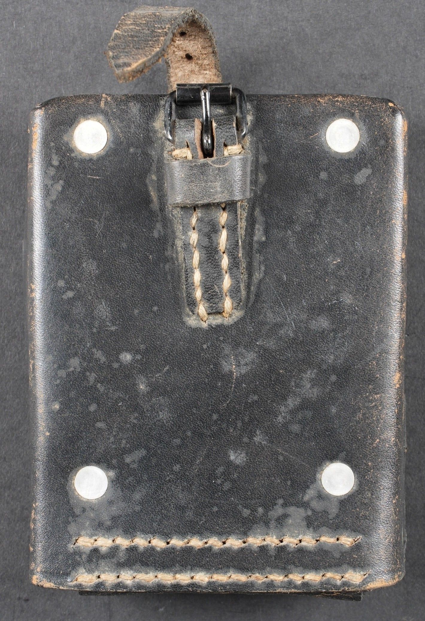 Measuring instrument case. Thick black leather. The closing strap is complete. The instrument is missing. The instruction manual under the cover is complete. Made by GJJ 42 with Waa eagle. Some wear and patina. Condition II+. Measuring instrument case. Thick black leather with complete closure strap. Measuring instrument missing. Original instruction sheet under lid intact. Maker-marked GJJ 42 with Waffenamt eagle. Some wear and patina consistent with age. Condition II+.