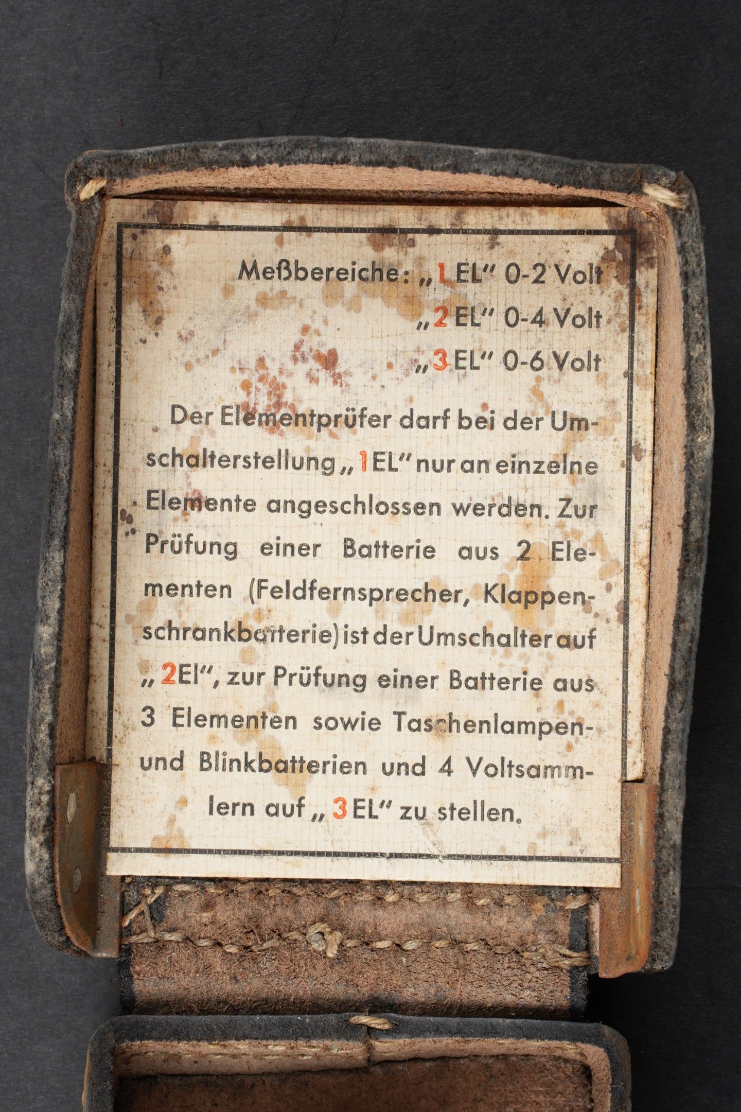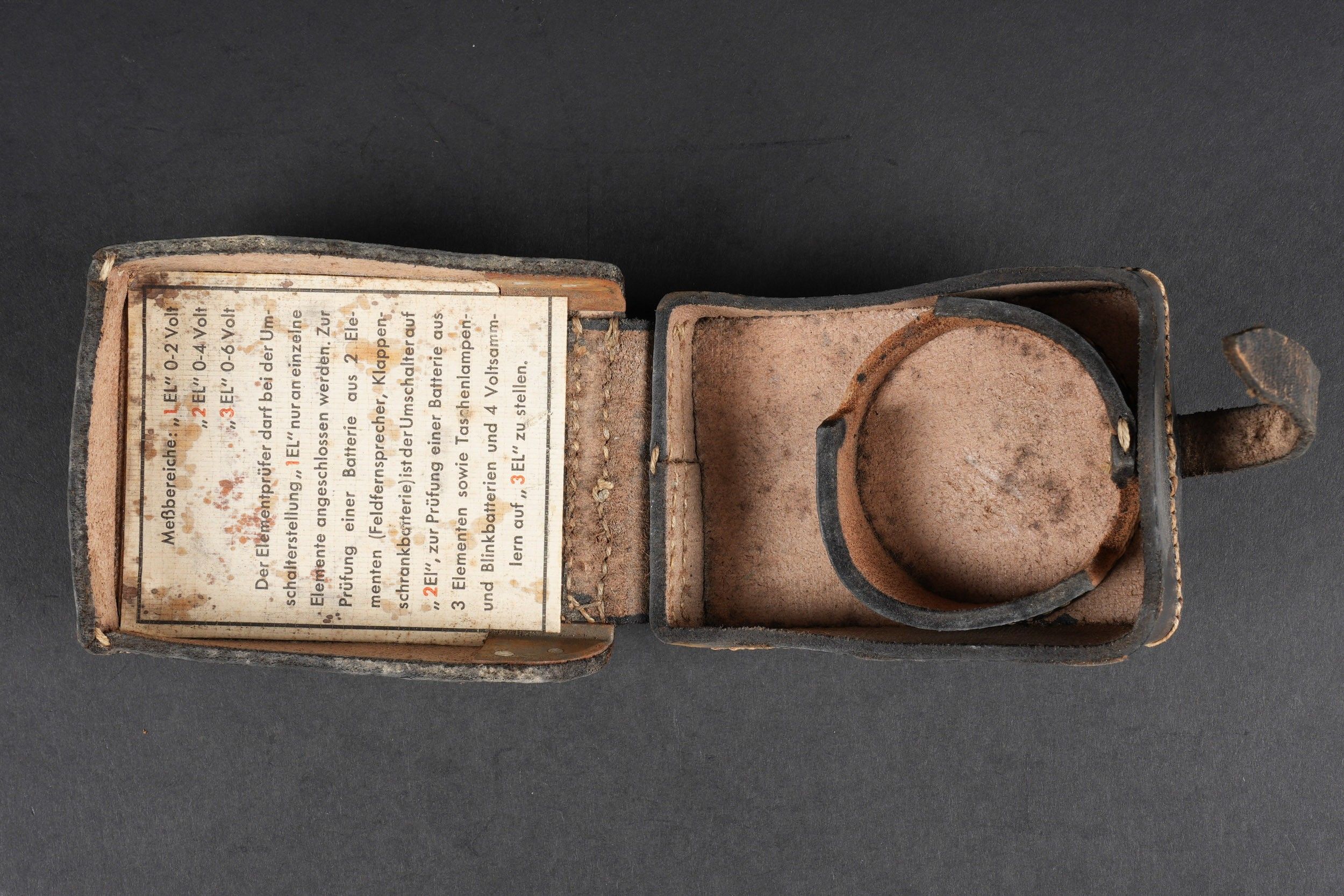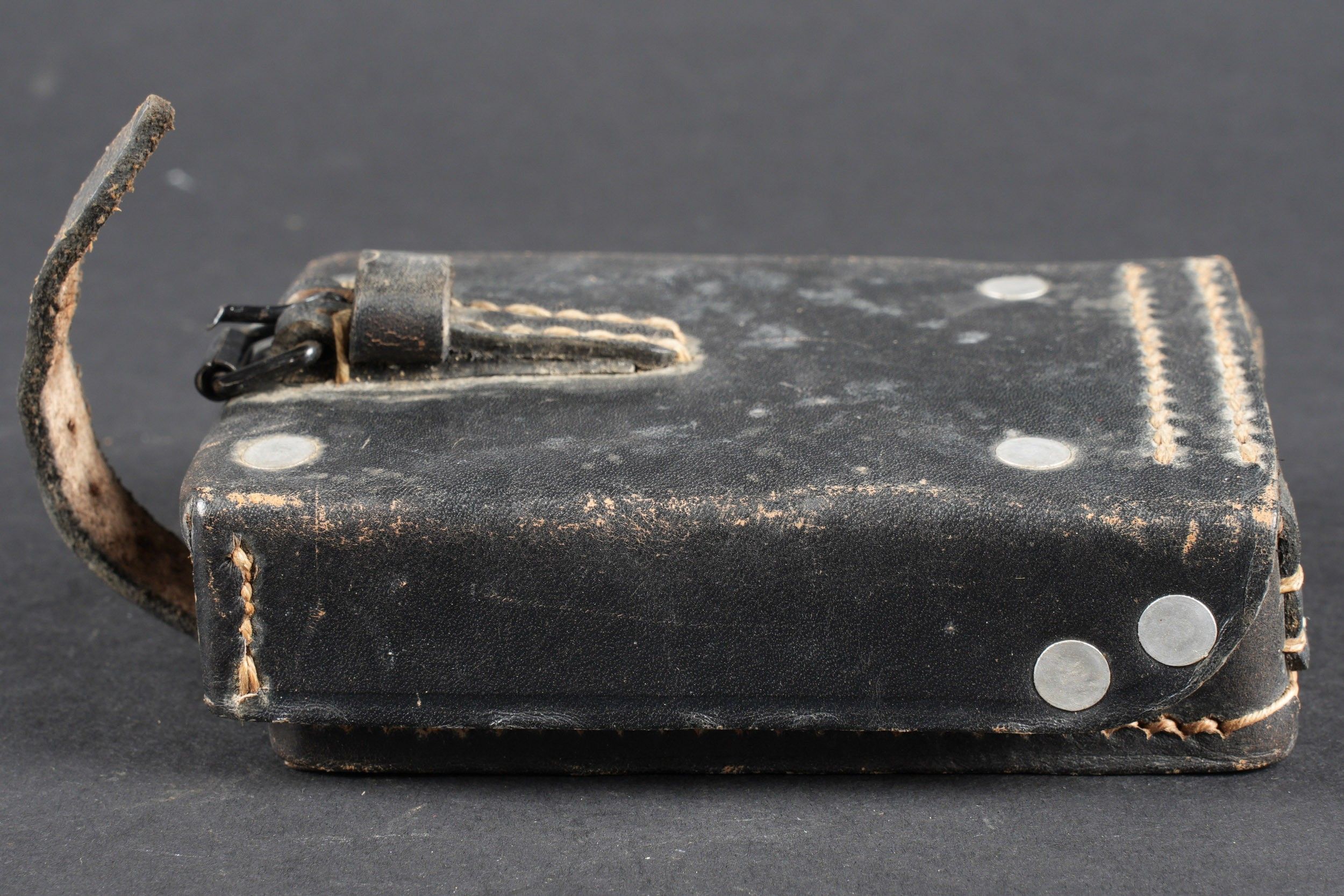 Measuring instrument case. Thick black leather. The closing strap is complete. The instrument is missing. The instruction manual under the cover is complete. Made by GJJ 42 with Waa eagle. Some wear and patina. Condition II+. Measuring instrument case. Thick black leather with complete closure strap. Measuring instrument missing. Original instruction sheet under lid intact. Maker-marked GJJ 42 with Waffenamt eagle. Some wear and patina consistent with age. Condition II+.