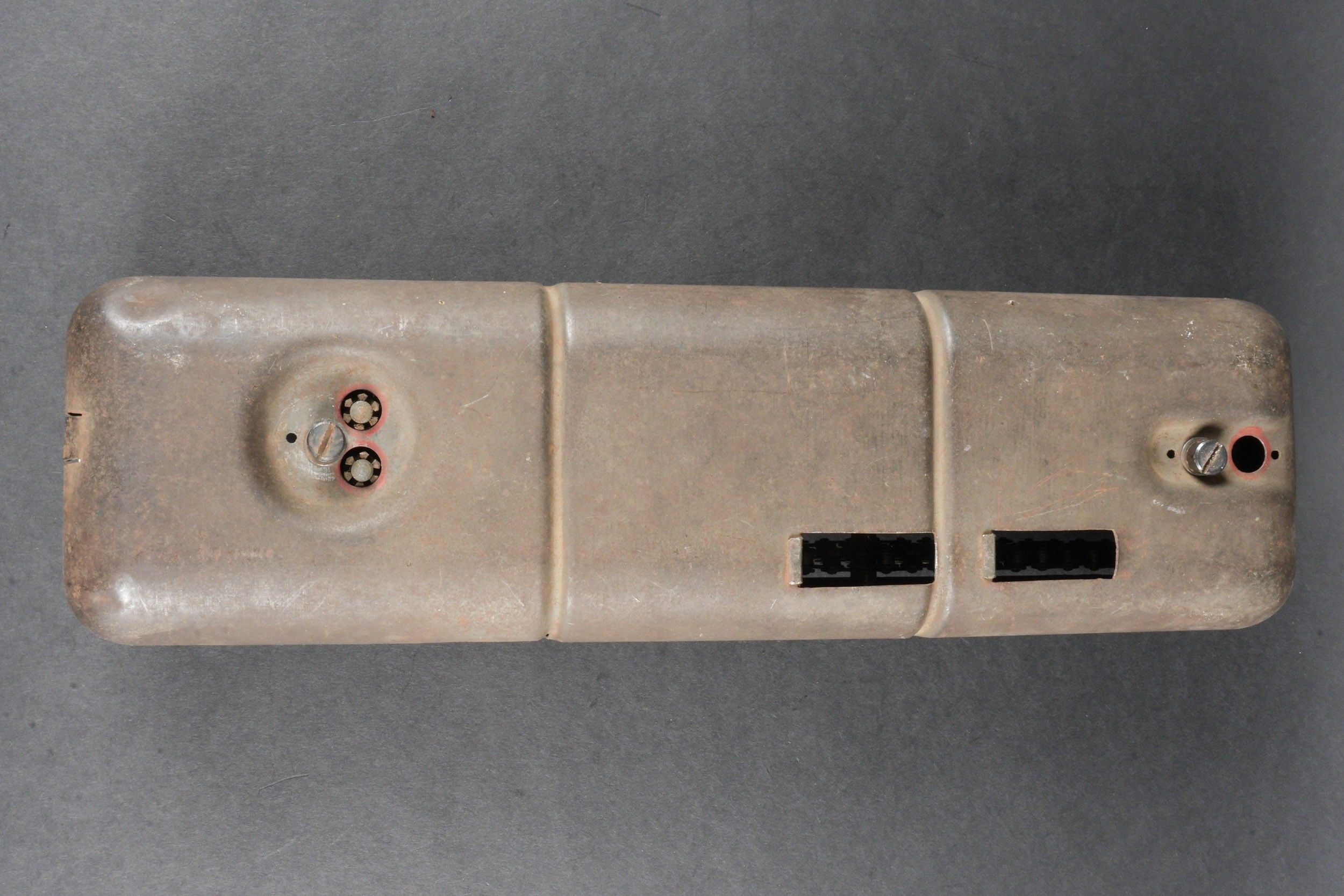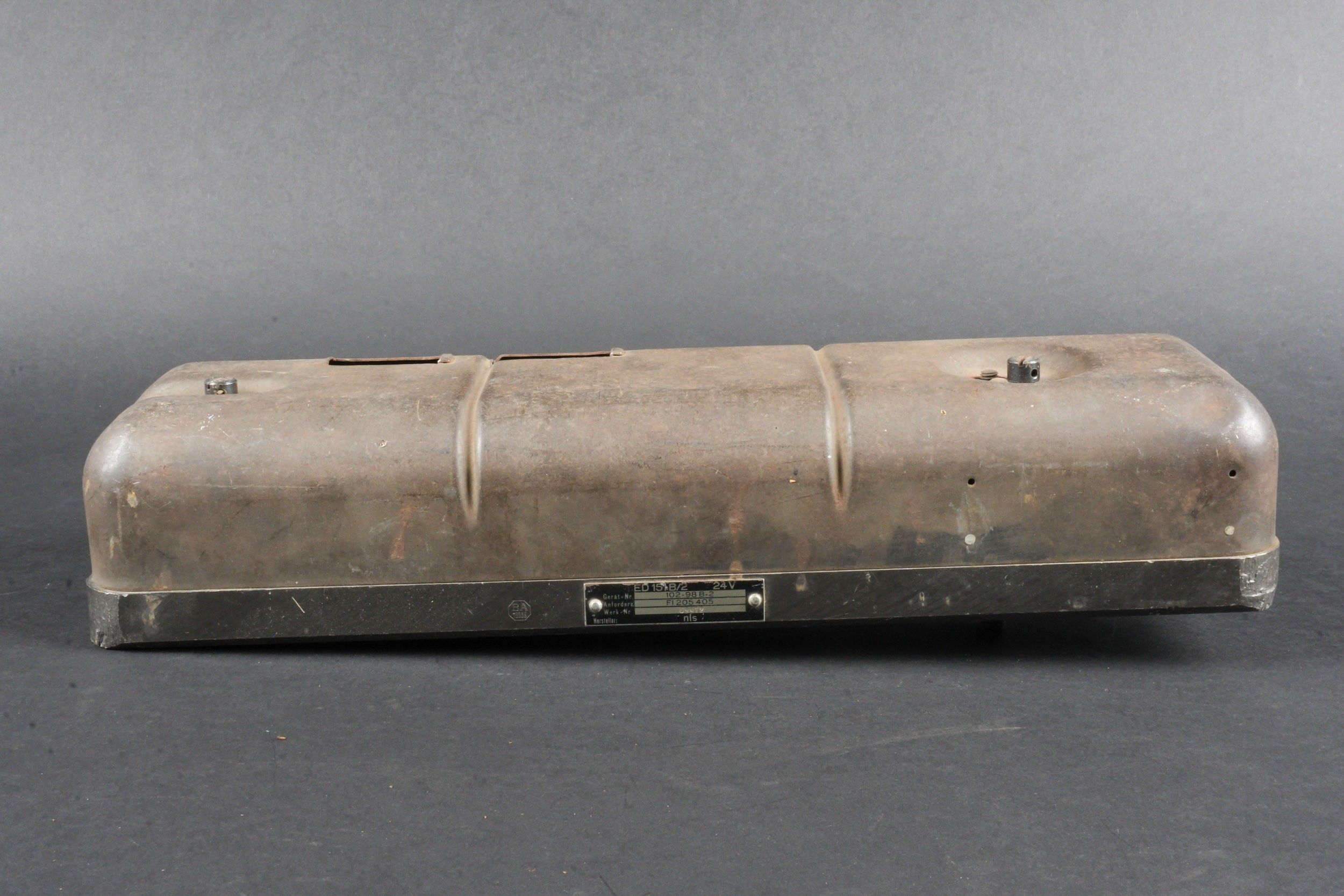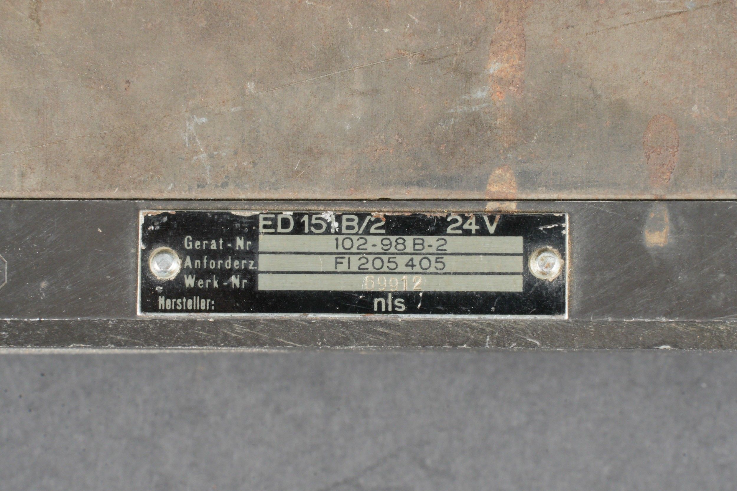 Electric charger for MG 151. Metal construction. Plate marked ED 15 B/2 24V 102-98B-2 FL 205 405, number 69912, manufacturer's code NLS. Electrical component for charging MG 151 ammunition. Manufactured from 1943 for aircraft using this type of armament. Rare piece of aviation armament. Some wear and patina. Condition II+. Electric charger for MG 151. Metal construction. Plate marked ED 15 B/2 24V 102-98B-2 FL 205 405, No. 69912, manufacturer code NLS. Electrical component used for charging MG 151 ammunition. Produced from 1943 for aircraft equipped with this weapon type. Rare aviation armament component. Shows wear and patina. Condition II+.