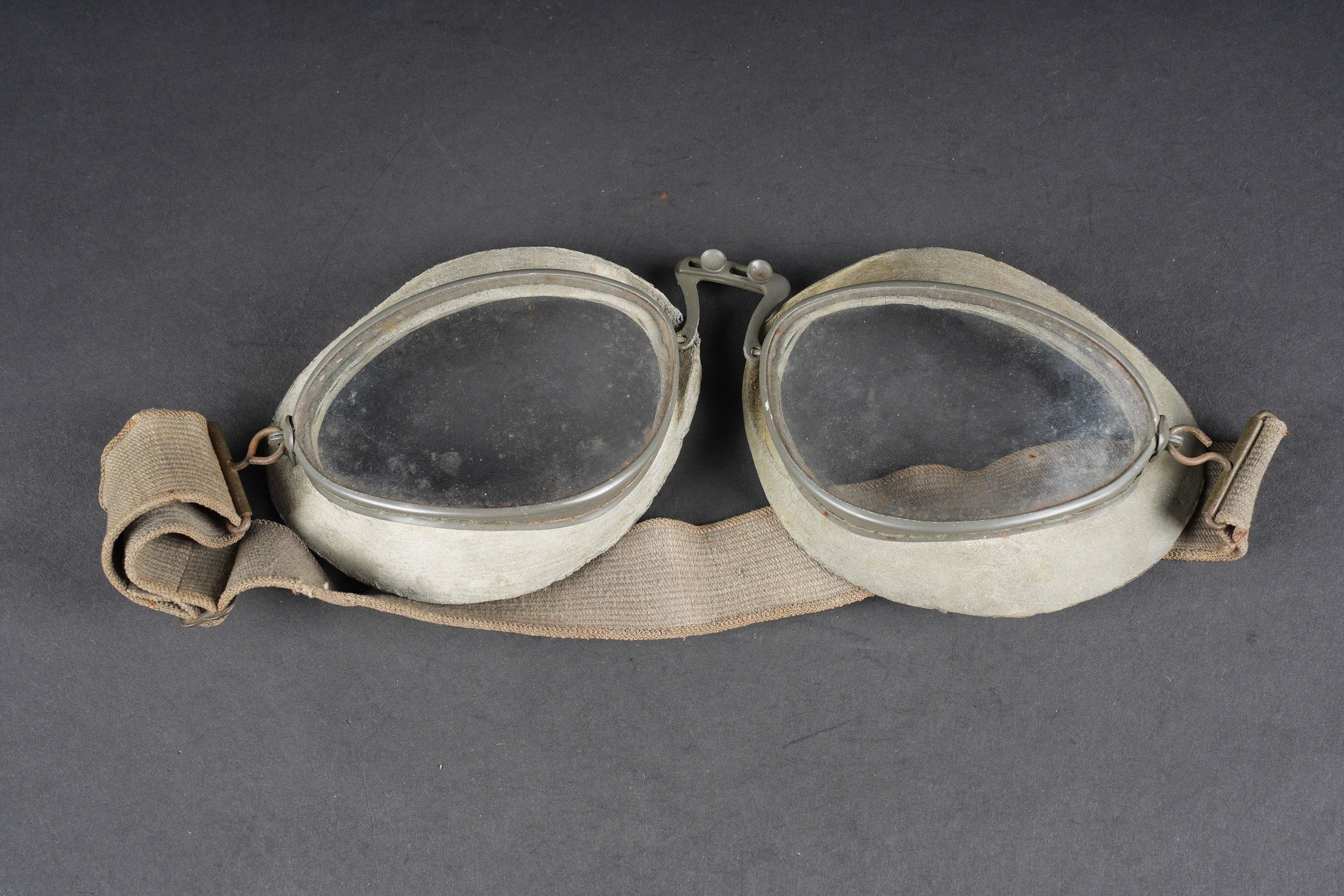 Luftwaffe pilot's scope. Metal frame, 95% paint. Grey rubber lining. White lenses. Relatively soft elastic. Some wear and patina. Condition II+. Luftwaffe pilot goggles. Metal frame with 95% of original paint remaining. Grey rubber padding. White lenses. Elastic strap still fairly supple. Shows light wear and patina. Condition II+.