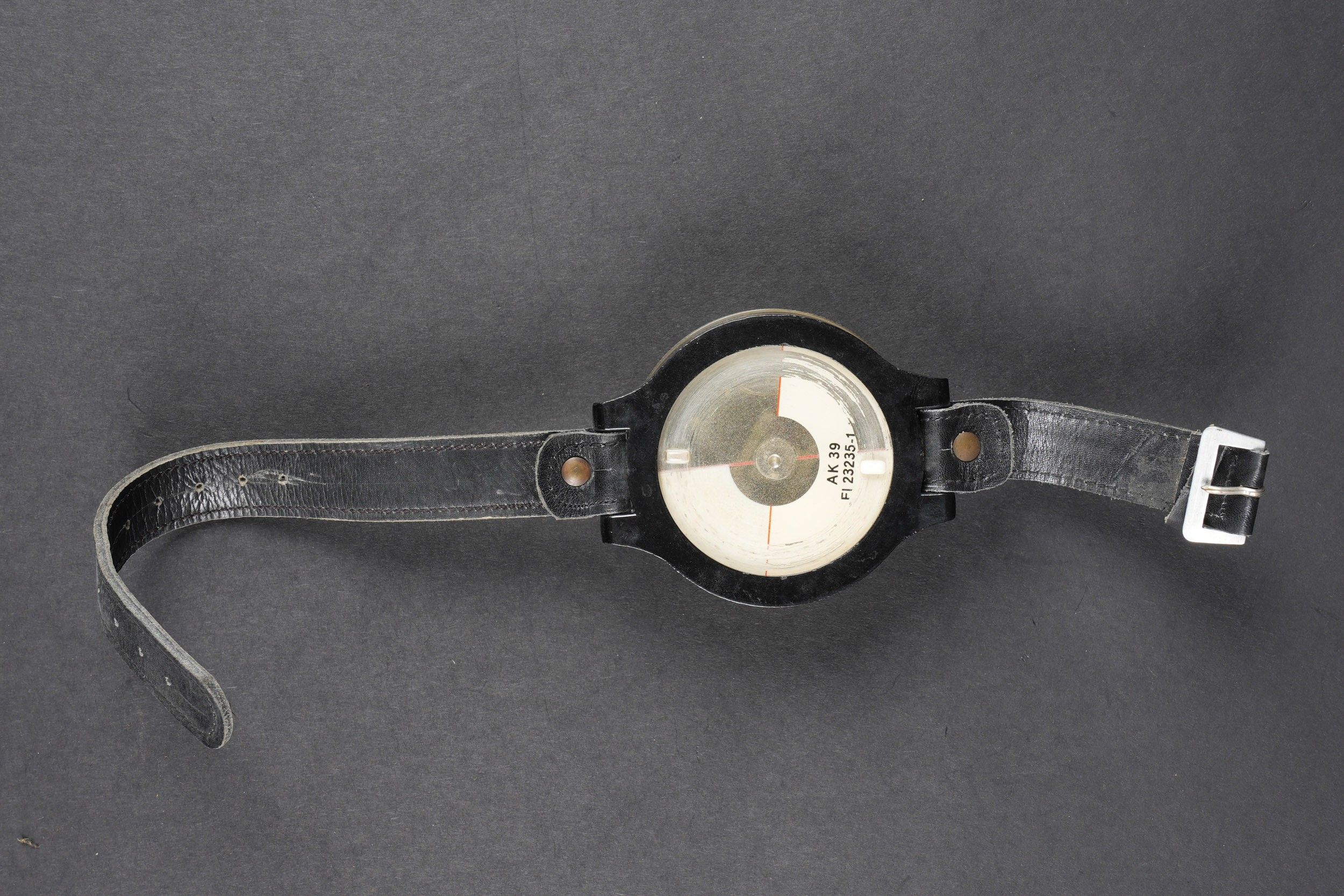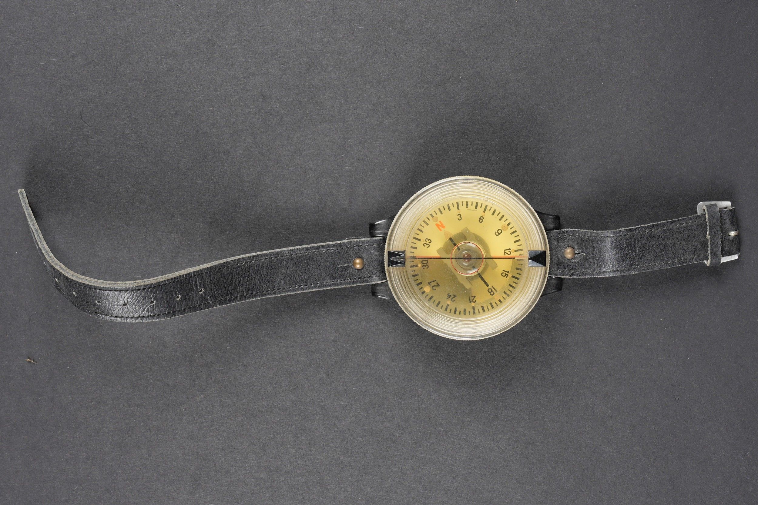 Handle compass. In bakelite, transparent dial. The internal fluid is complete. Functional. Markings AK 39 FL 23235-1. Complete black leather strap, complete single pin buckle. Some wear and patina. Condition II+. Handle compass. Made of Bakelite with transparent dial. Liquid-filled and fully functional. Marked AK 39 FL 23235-1. Complete black leather wrist strap with single prong buckle. Shows light wear and patina. Condition II+.