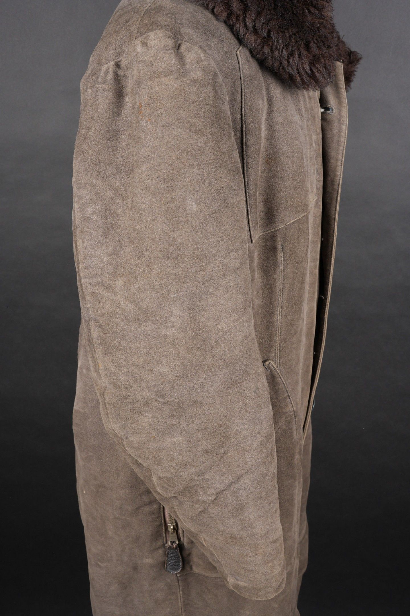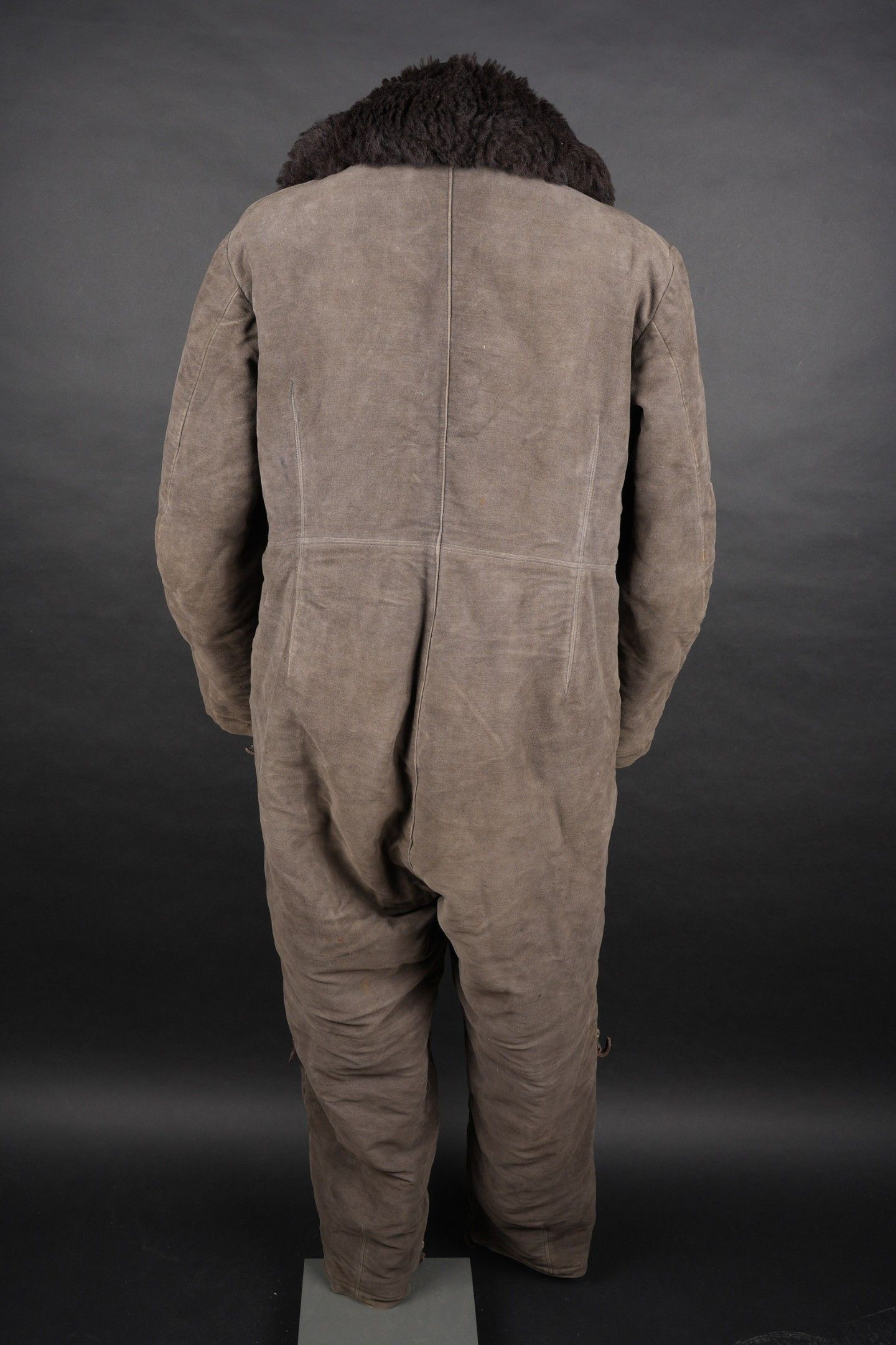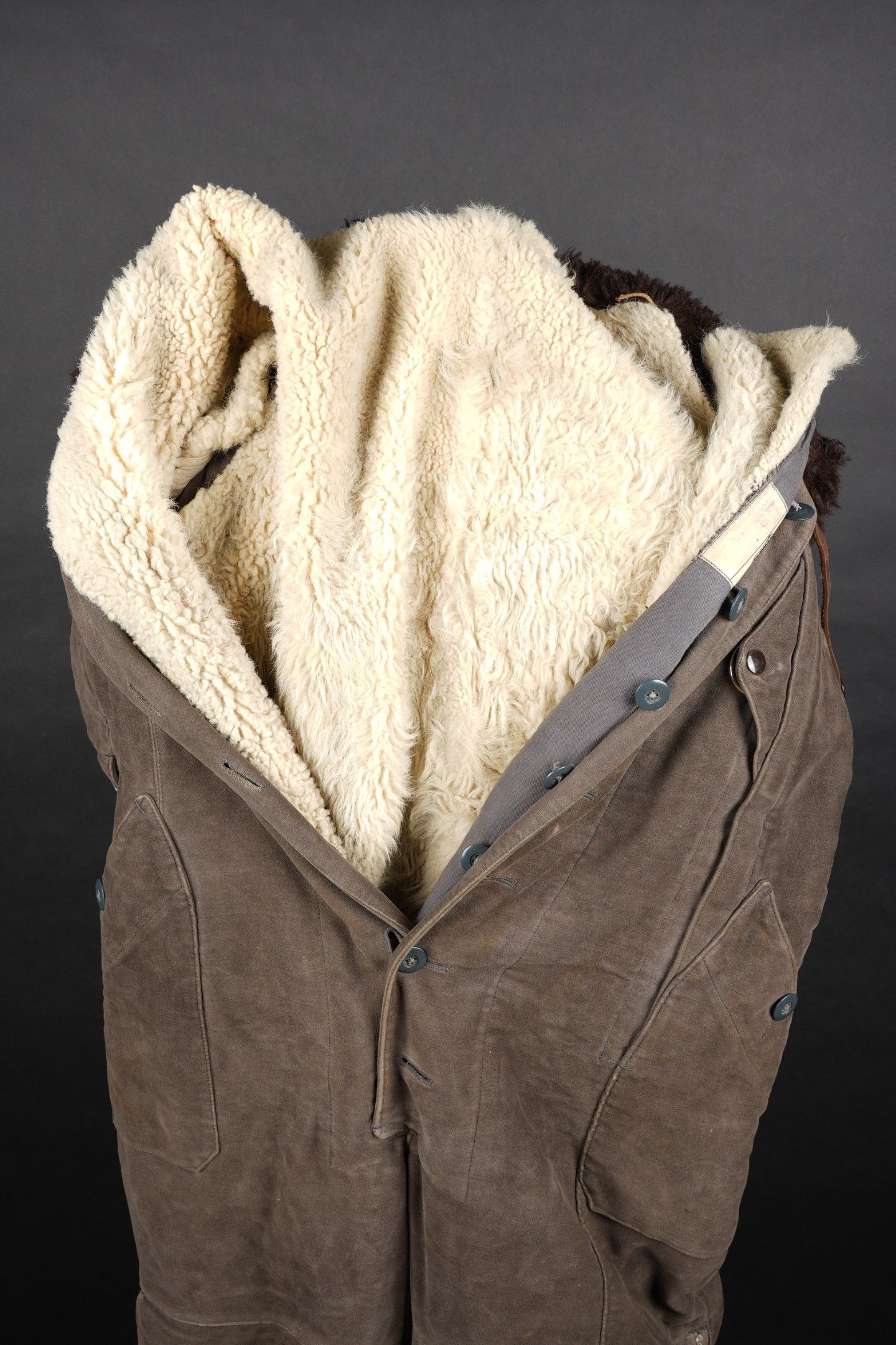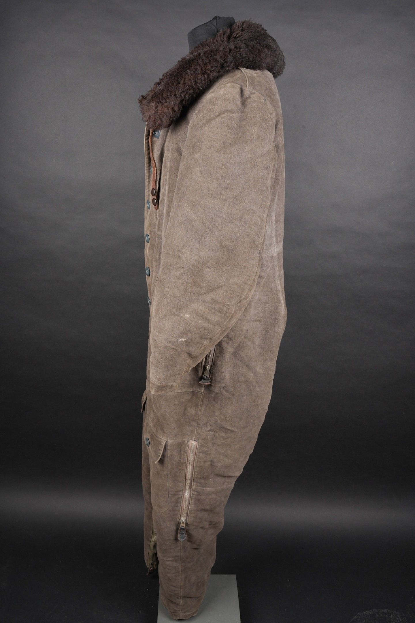 Luftwaffe flight suit. Brown suede, white faux fur lining. Collar lined with brown faux fur. Two leather fastening straps with functional press studs at the collar. All press studs are functional. Zips are functional, made by RIRI, Zipp, and Elite. Manufacturer's label Striegel & Wagner, size IIA. Slight wear and patina, as well as discreet stains. Condition I-. Luftwaffe flying suit. Made of brown suede, lined with white faux fur. Collar lined with brown faux fur. Two leather closure straps with functional press buttons at the collar. All press buttons functional. Zippers operational, marked RIRI, Zipp, and Elite. Maker's label Striegel & Wagner, size IIA. Shows slight wear, patina, and minor stains. Condition I-.