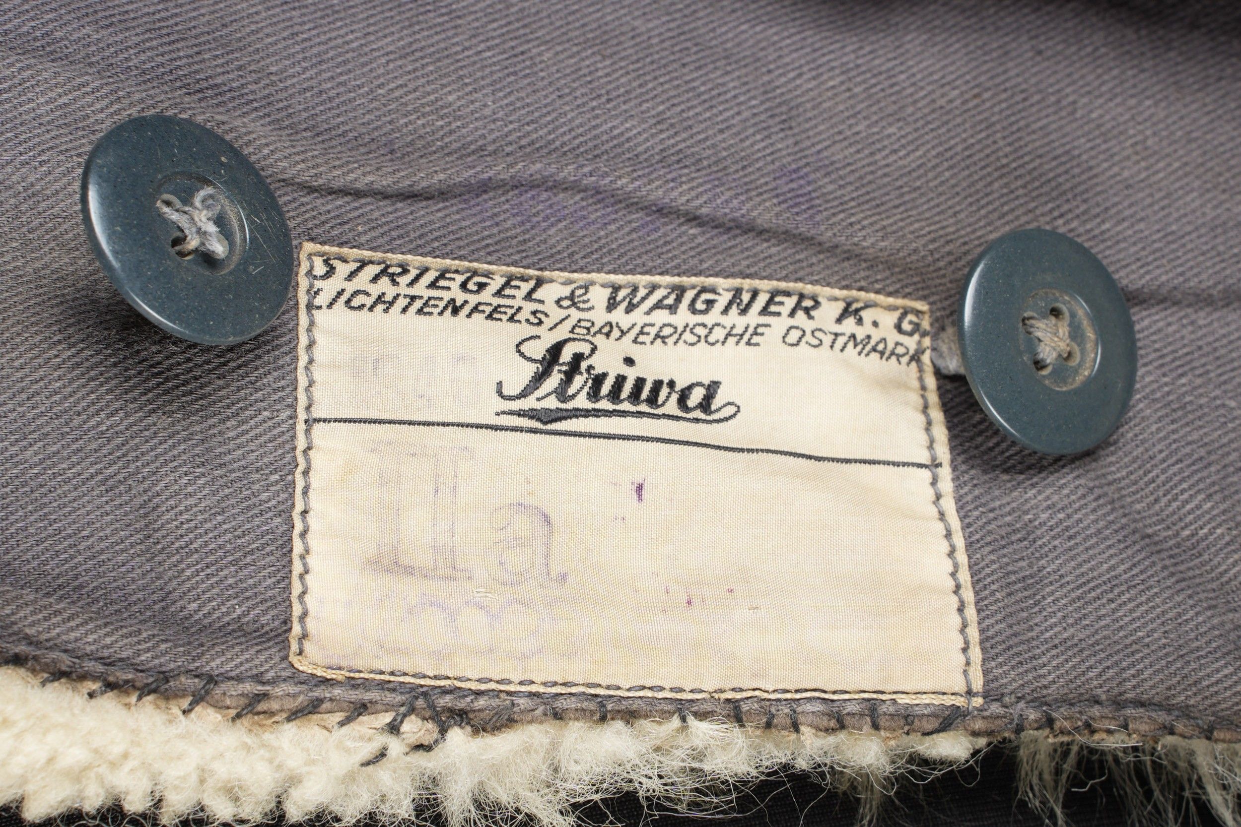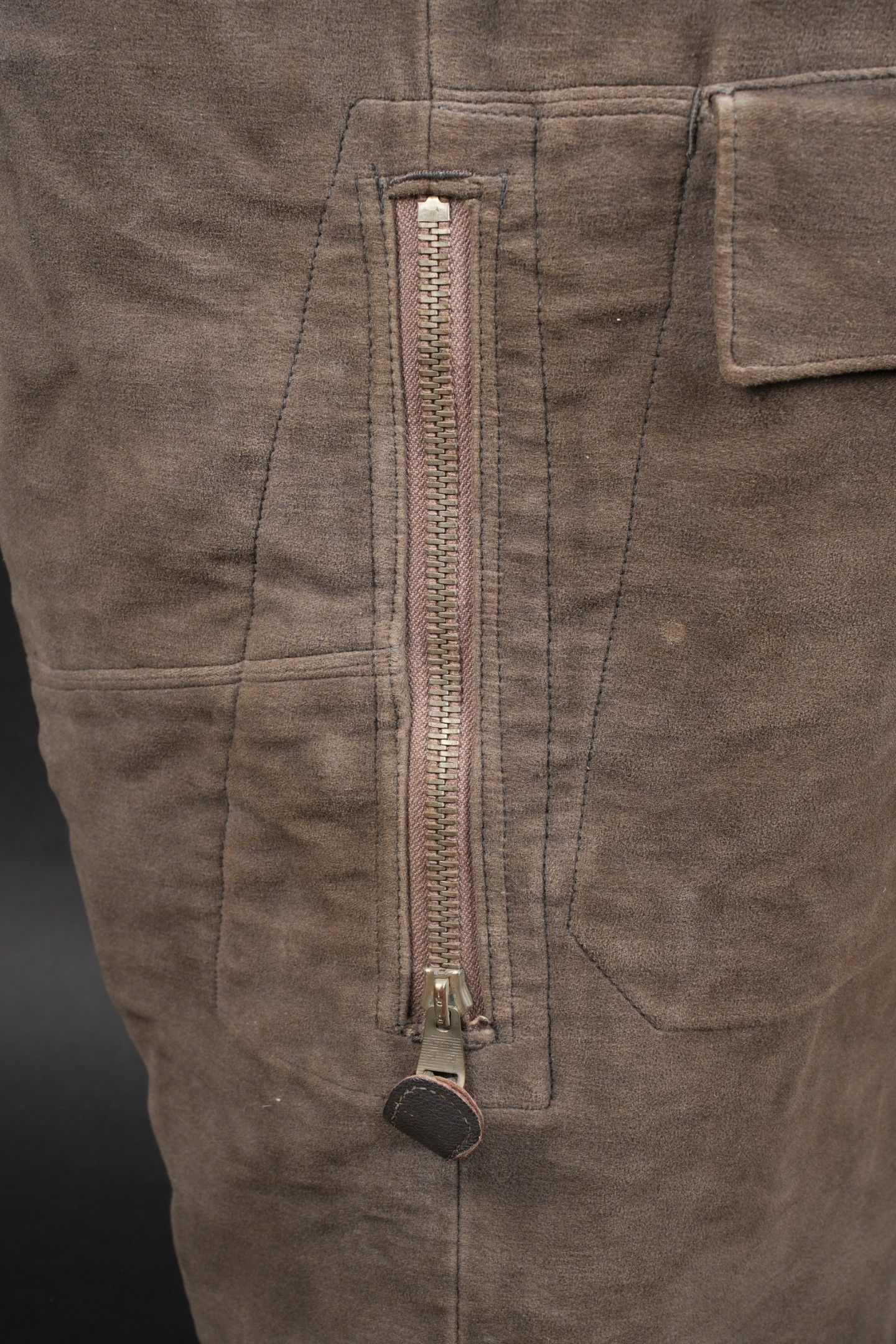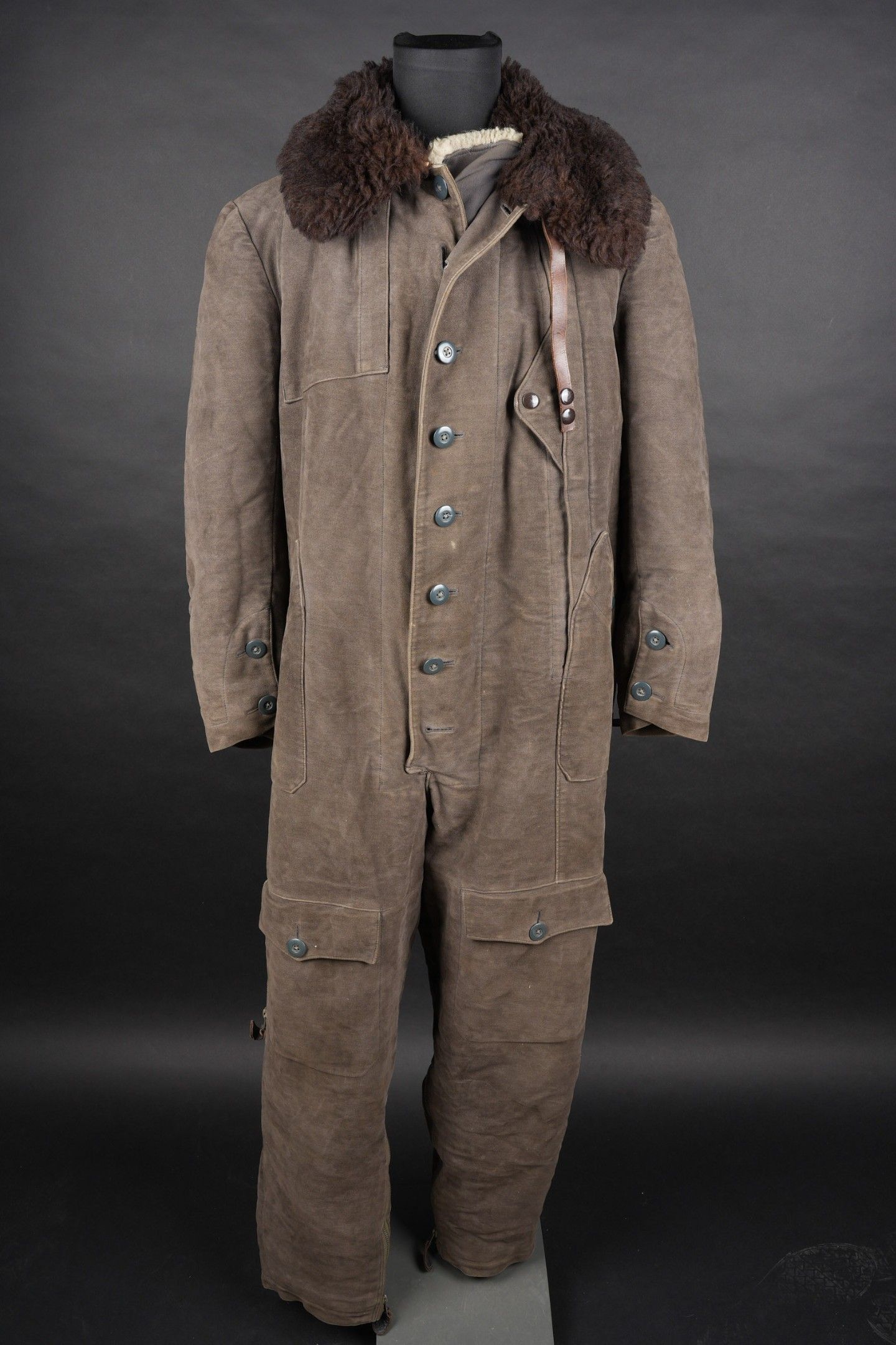 Luftwaffe flight suit. Brown suede, white faux fur lining. Collar lined with brown faux fur. Two leather fastening straps with functional press studs at the collar. All press studs are functional. Zips are functional, made by RIRI, Zipp, and Elite. Manufacturer's label Striegel & Wagner, size IIA. Slight wear and patina, as well as discreet stains. Condition I-. Luftwaffe flying suit. Made of brown suede, lined with white faux fur. Collar lined with brown faux fur. Two leather closure straps with functional press buttons at the collar. All press buttons functional. Zippers operational, marked RIRI, Zipp, and Elite. Maker's label Striegel & Wagner, size IIA. Shows slight wear, patina, and minor stains. Condition I-.