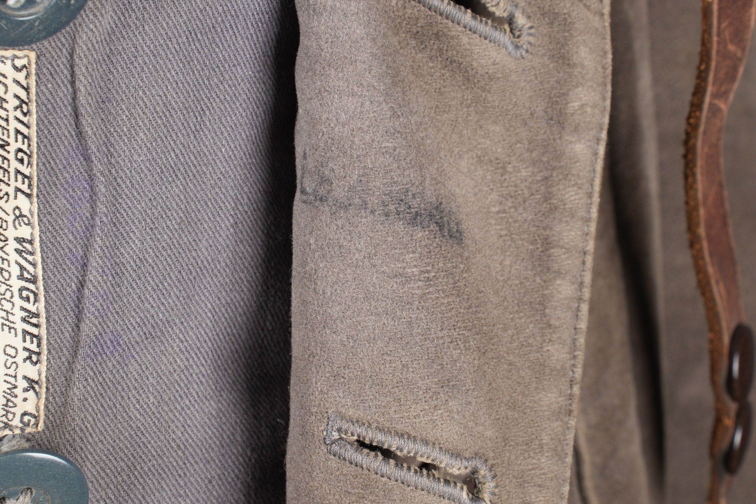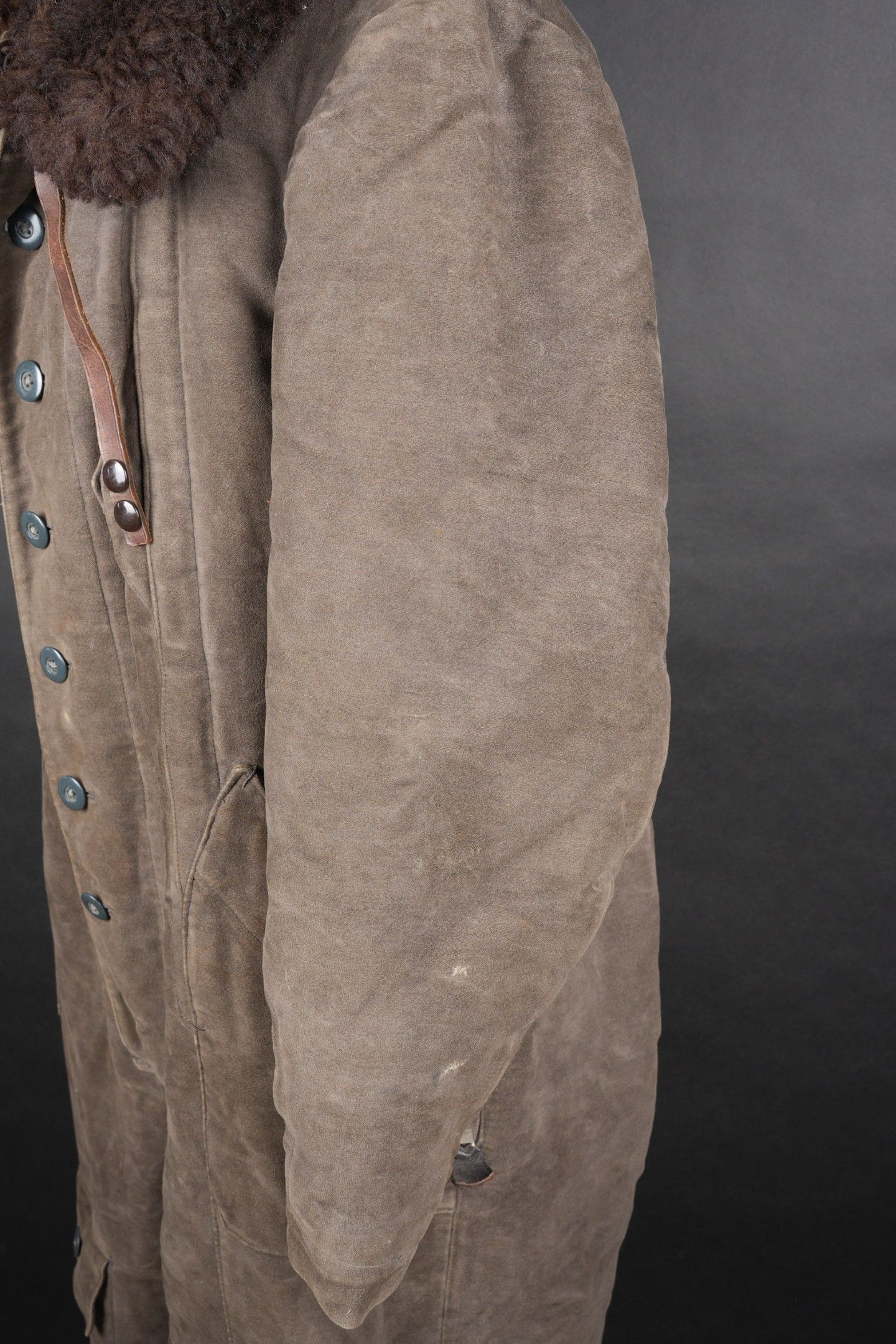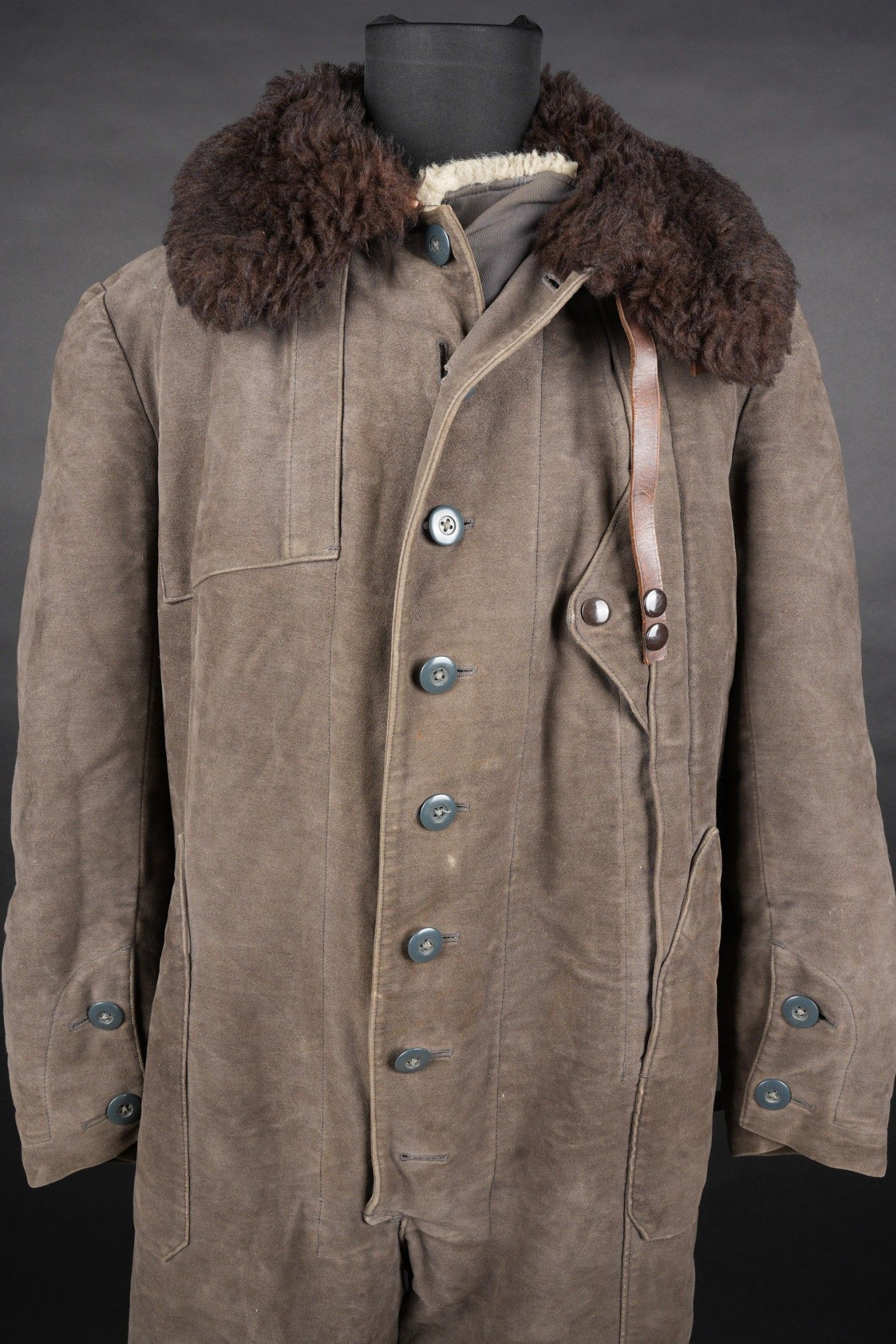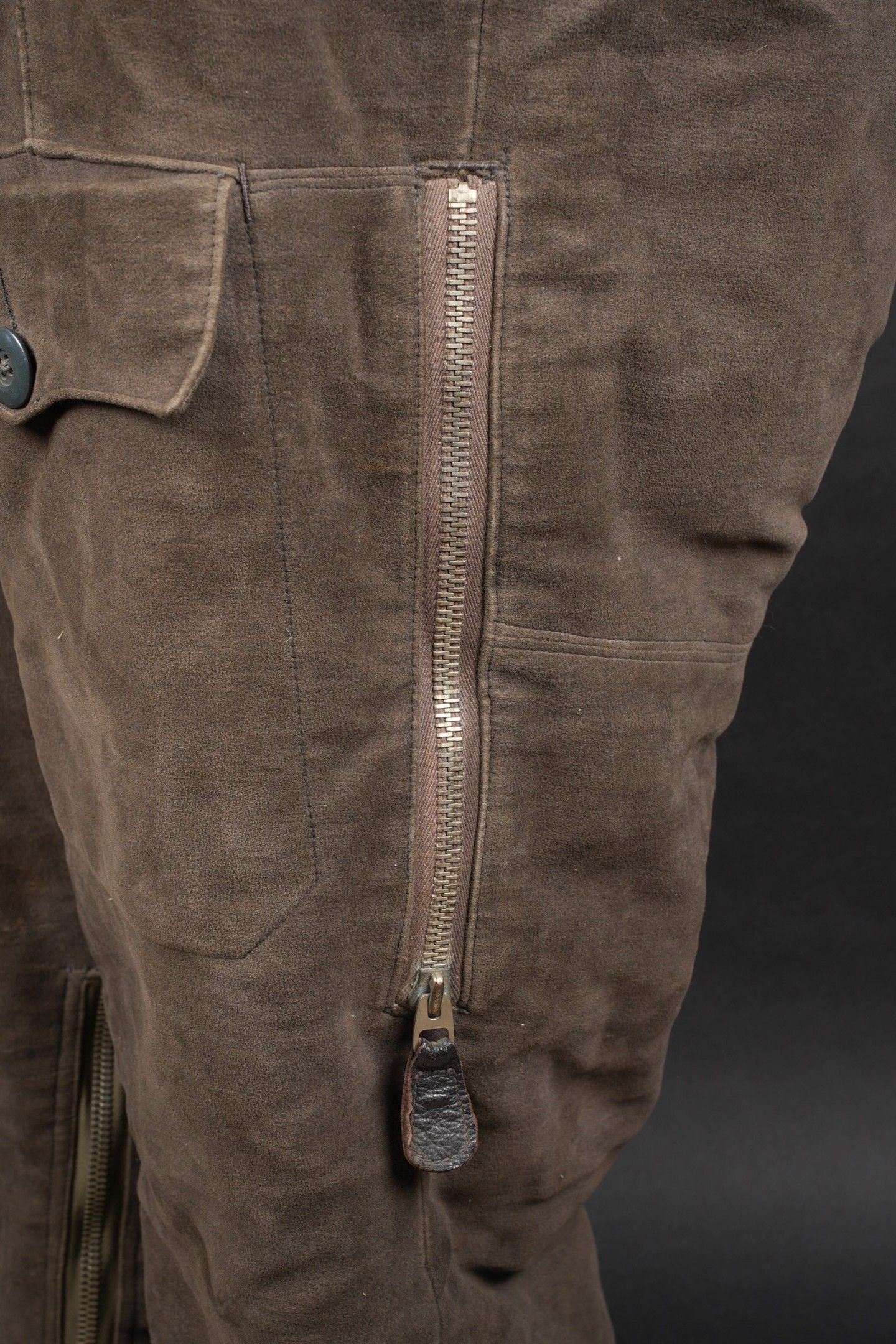 Luftwaffe flight suit. Brown suede, white faux fur lining. Collar lined with brown faux fur. Two leather fastening straps with functional press studs at the collar. All press studs are functional. Zips are functional, made by RIRI, Zipp, and Elite. Manufacturer's label Striegel & Wagner, size IIA. Slight wear and patina, as well as discreet stains. Condition I-. Luftwaffe flying suit. Made of brown suede, lined with white faux fur. Collar lined with brown faux fur. Two leather closure straps with functional press buttons at the collar. All press buttons functional. Zippers operational, marked RIRI, Zipp, and Elite. Maker's label Striegel & Wagner, size IIA. Shows slight wear, patina, and minor stains. Condition I-.