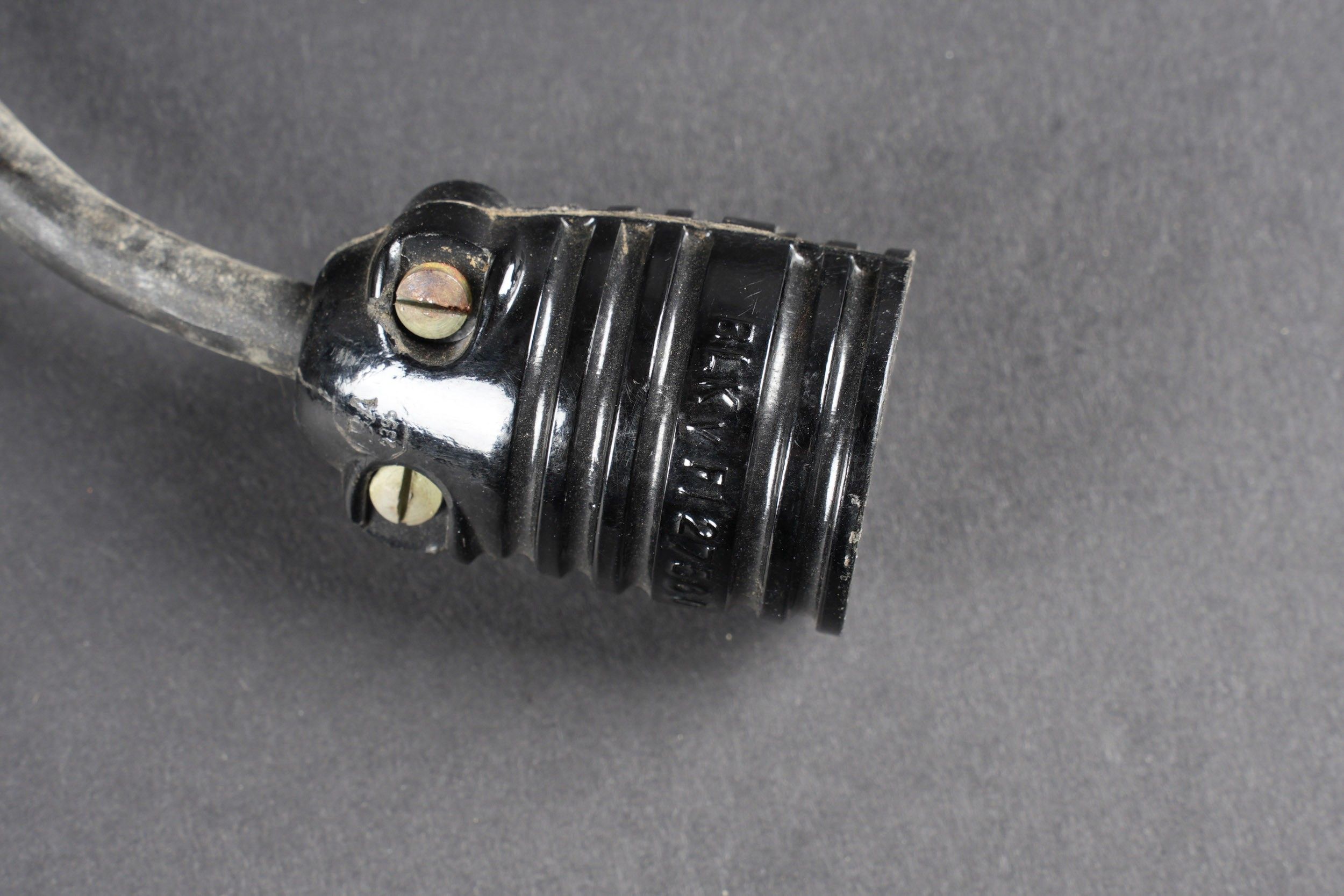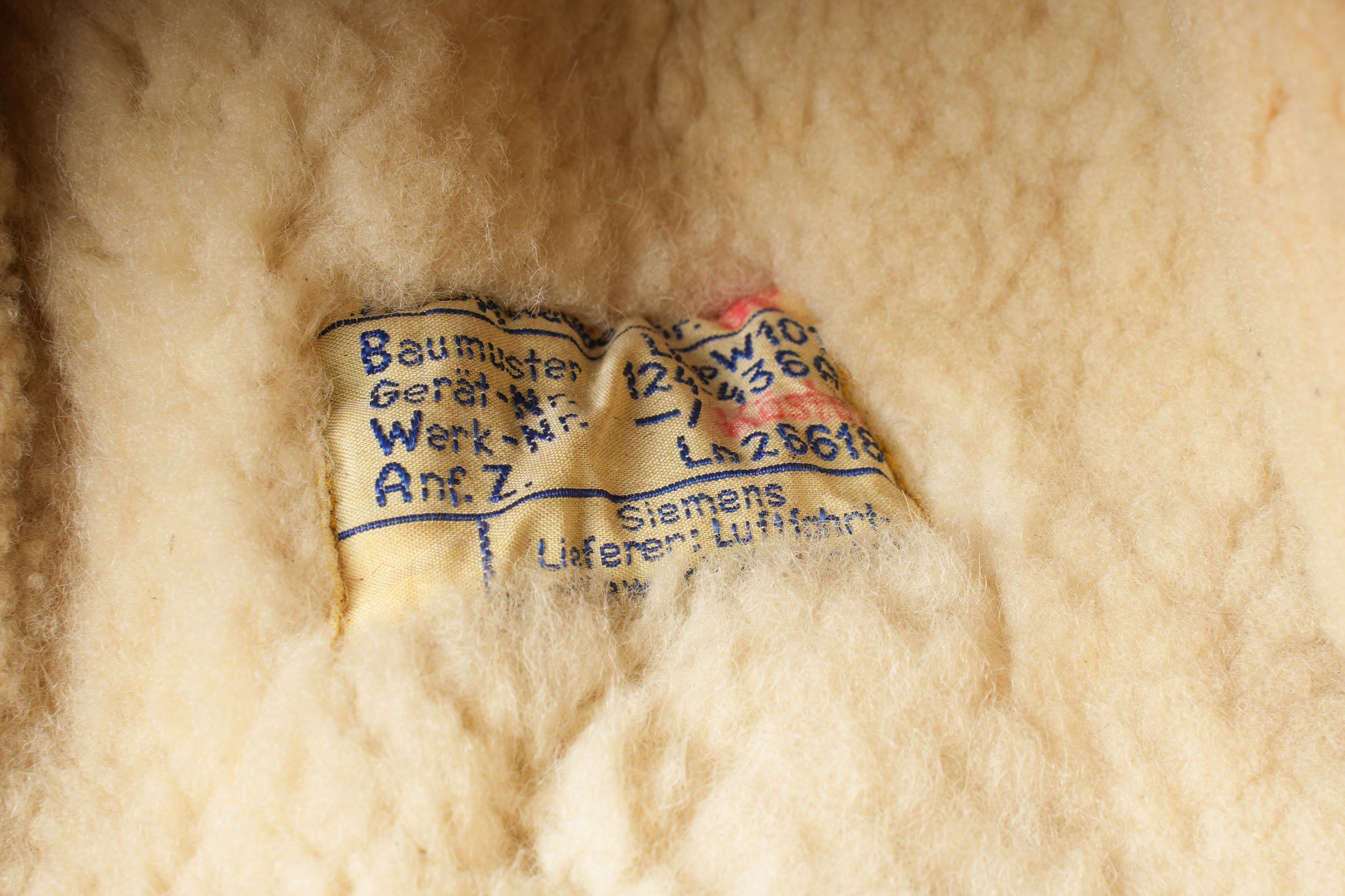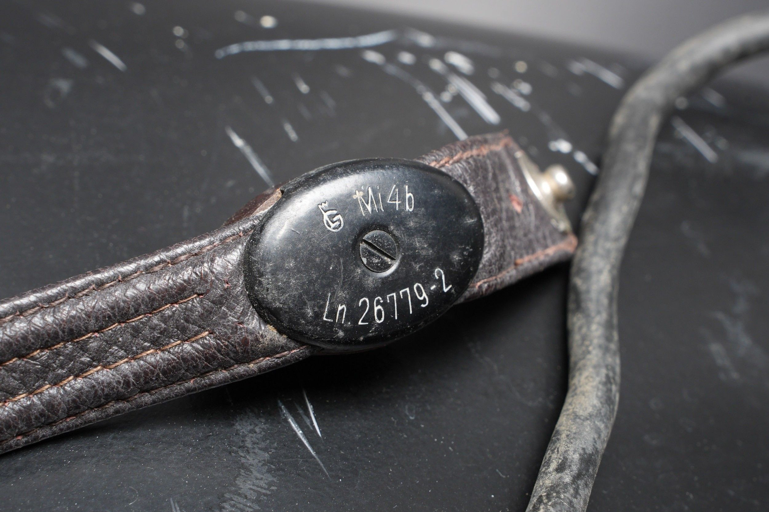LW pilot's headband. In thick brown leather, lined with faux fur. The leather chinstrap is complete. The ear protectors are in leather and lined with white bakelite. Complete LN 26779-2 throat microphone. Cable and plug present. Siemens manufacturer's label, size 58, model LKpW101. All snaps are functional. Some wear and patina. Condition II+. Luftwaffe pilot headband. Thick brown leather lined with faux fur. Complete leather chinstrap. Earpads in leather lined with white Bakelite. Complete Laryngophone LN 26779-2 with cable and plug. Maker's label Siemens, size 58, model LKpW101. All press studs functional. Shows some wear and patina. Condition II+.