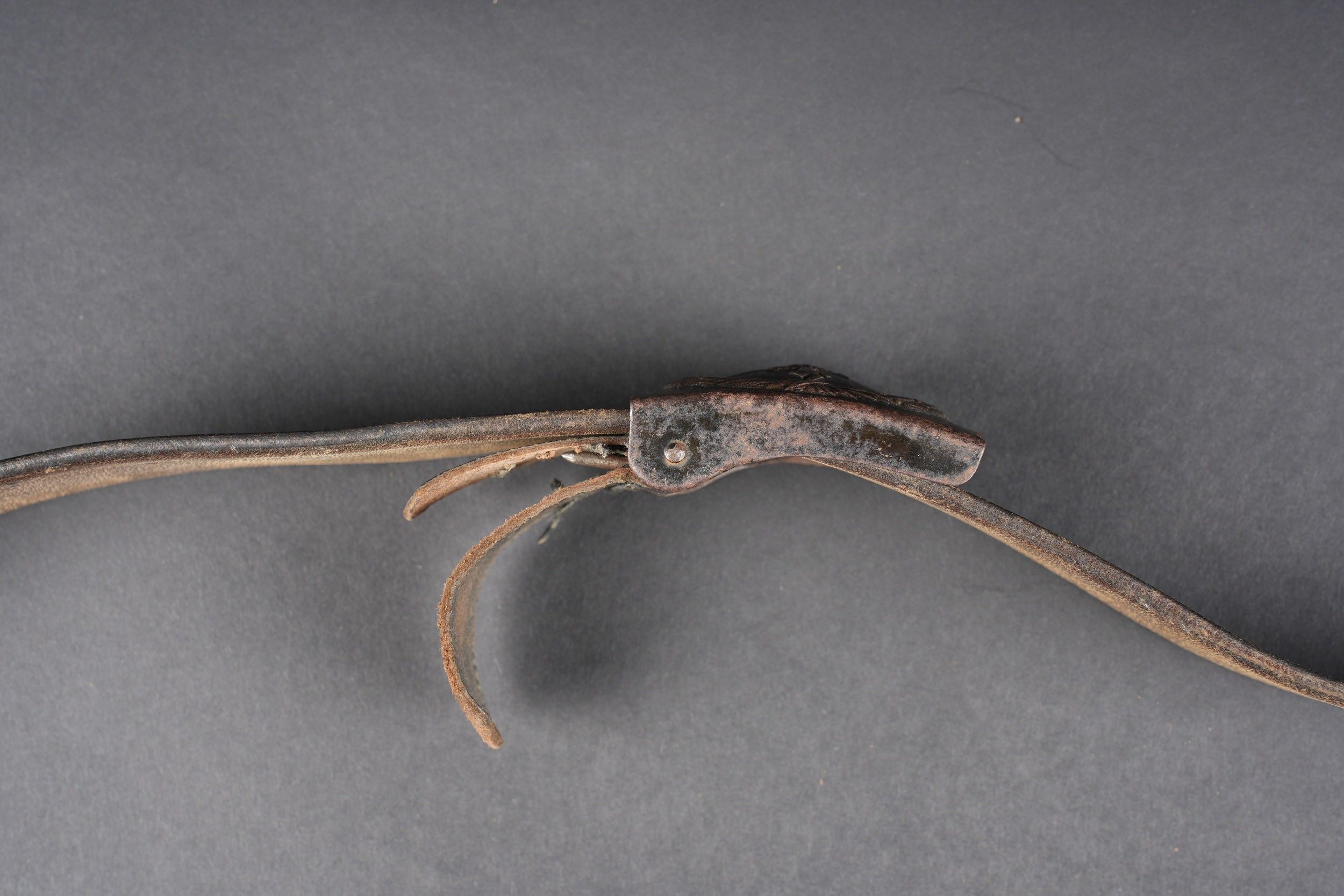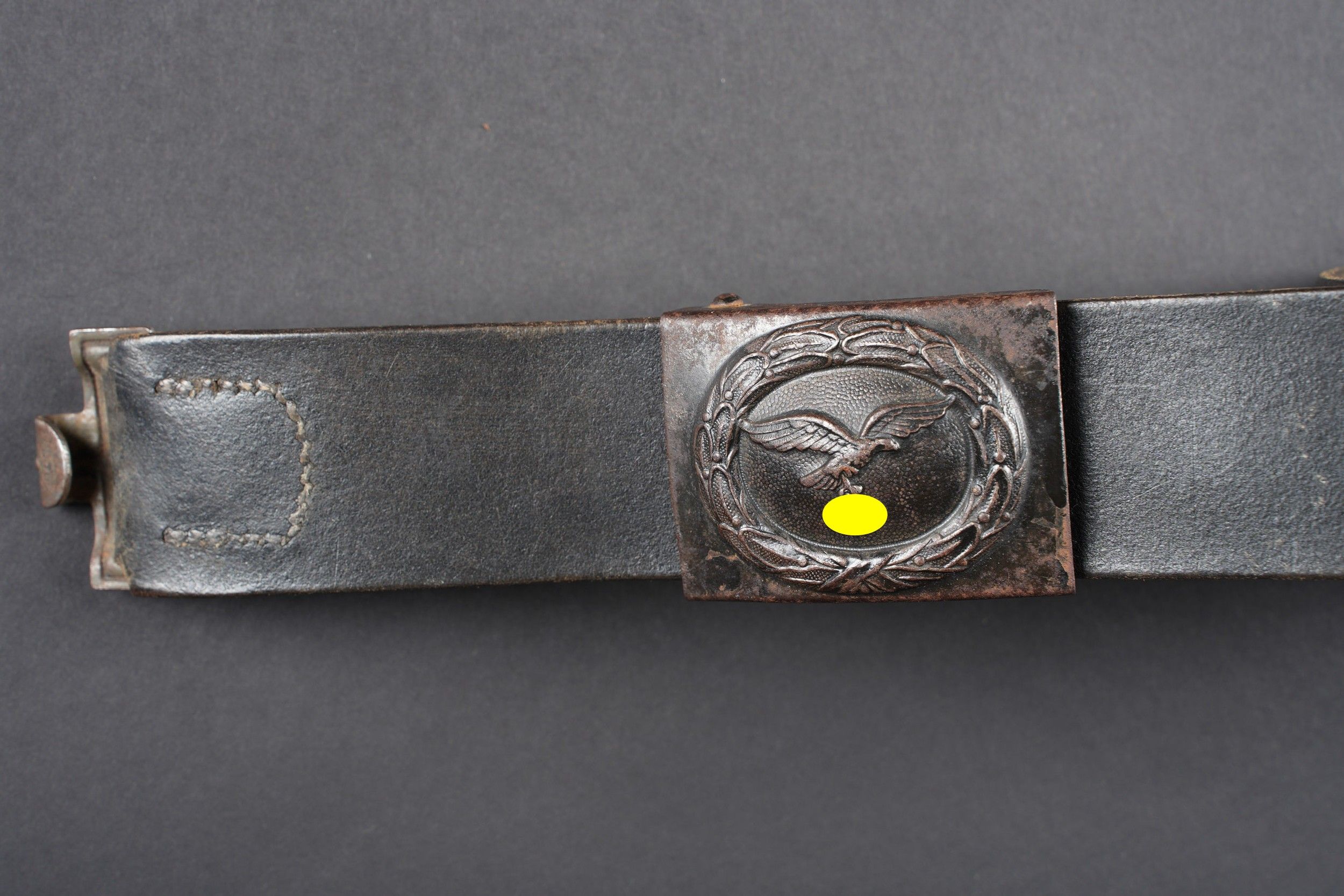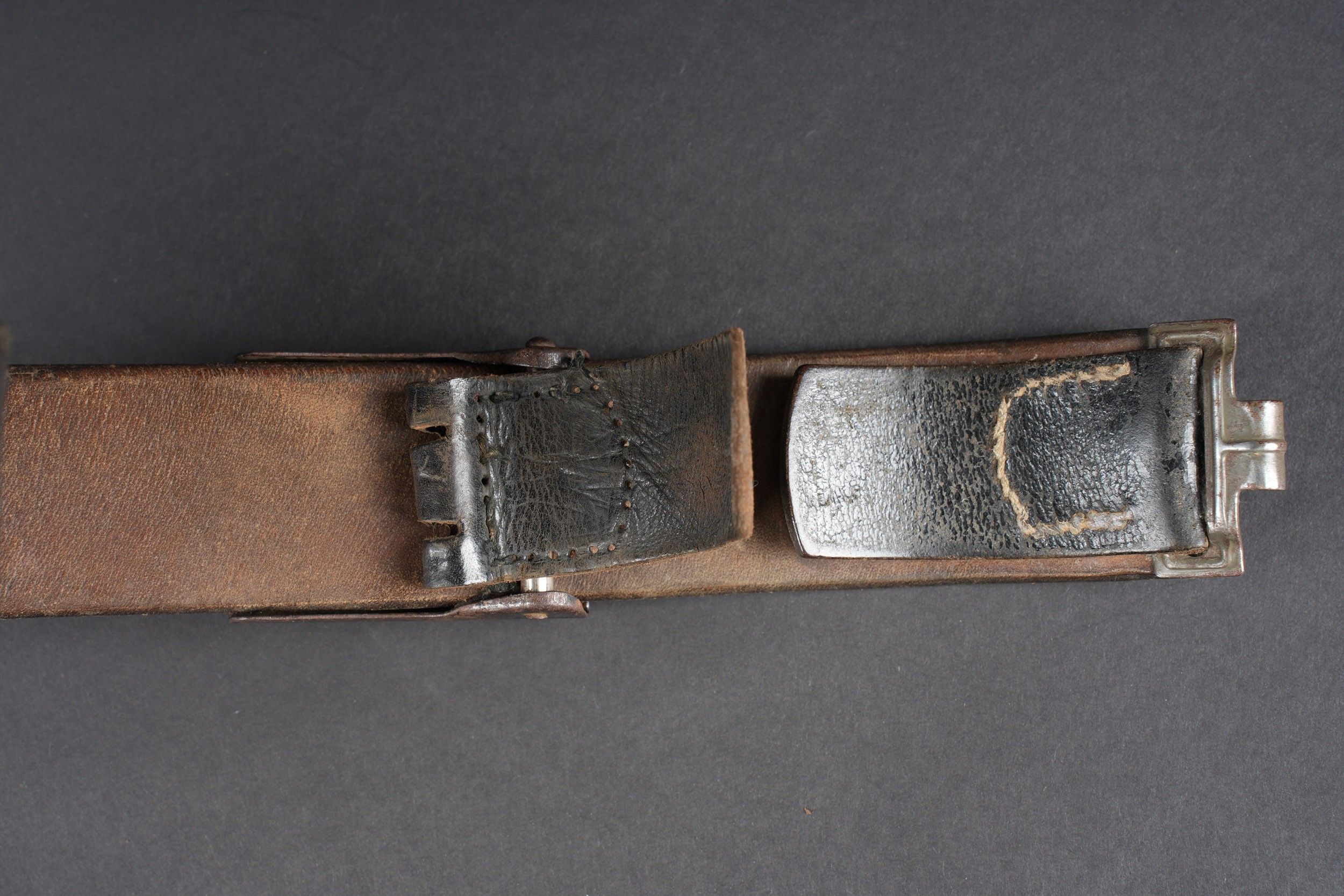 LW belt. Black leather belt. Metal buckle, with 40% Feldgrau paint residue. Markings are illegible. Complete adjustment tab. Luftwaffe metal belt buckle. 70% grey/blue paint. No visible markings, leather tab dated 1941, partially unstitched. Some wear and patina. Condition II+. Luftwaffe belt. Black leather belt with metal buckle retaining about 40% of its original Feldgrau paint. Markings illegible. Adjustment tab complete. Luftwaffe buckle in metal with about 70% of the original blue-grey paint remaining. No visible markings. Leather tab dated 1941, partly unstitched. Shows typical wear and patina. Condition II+.
