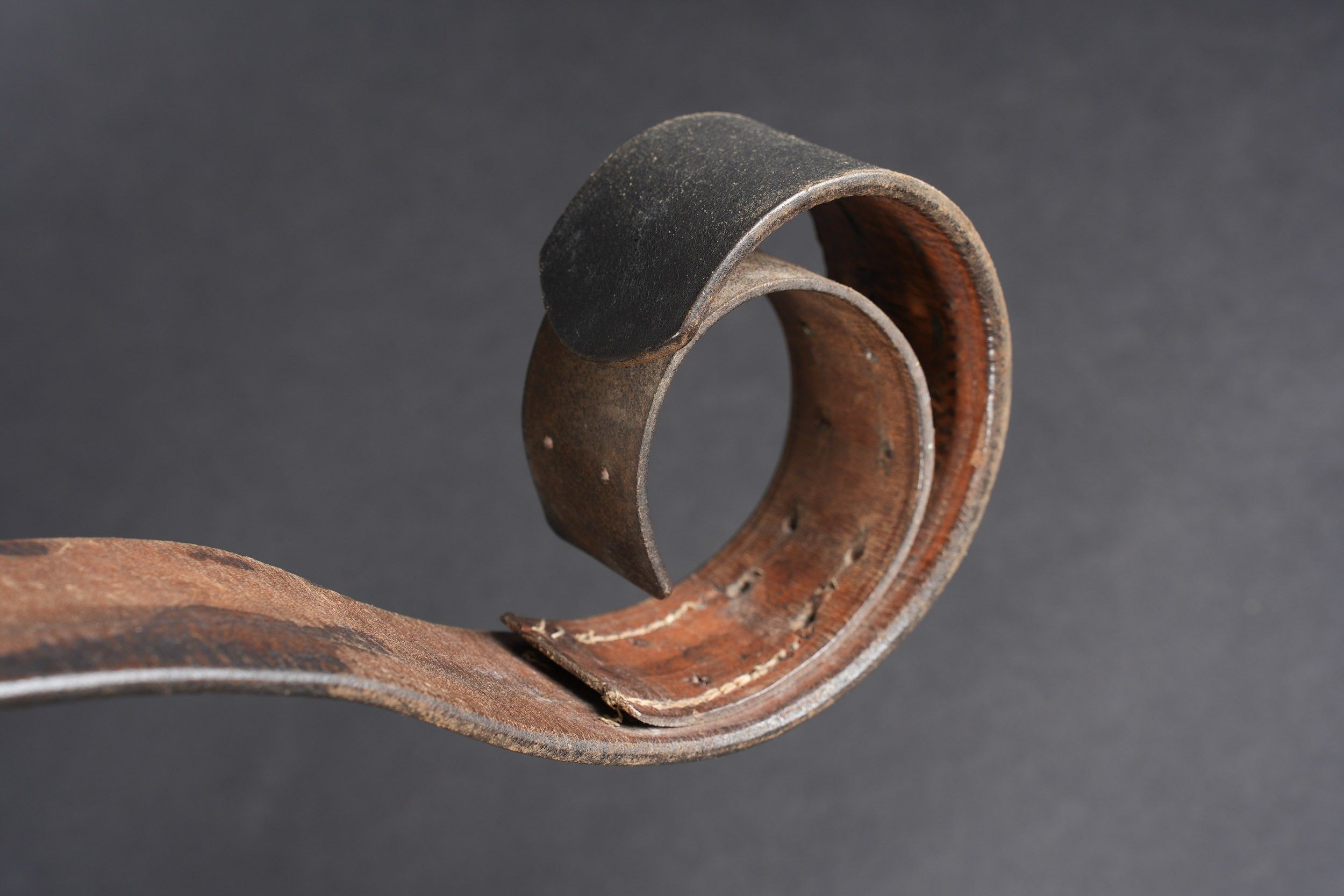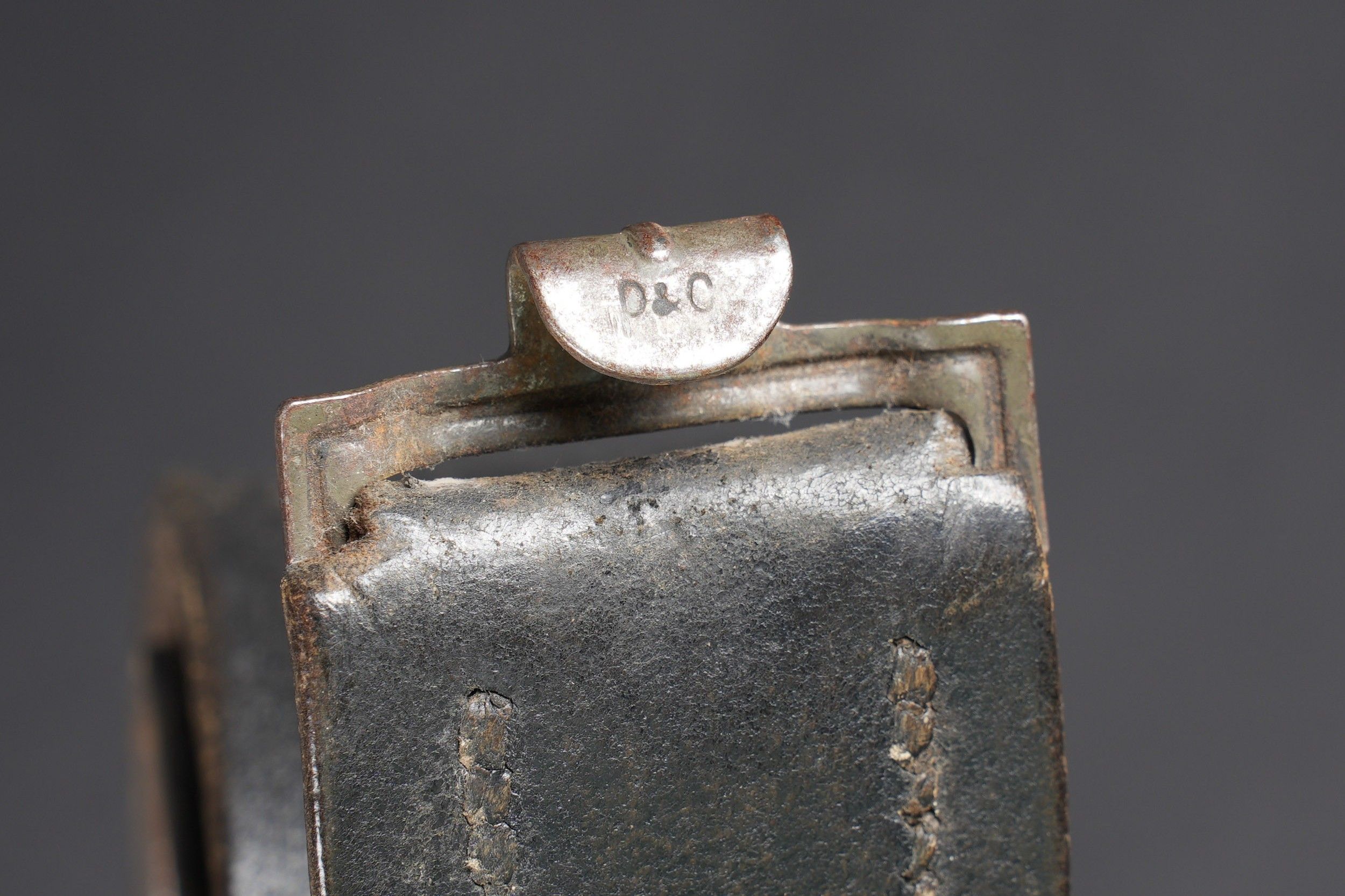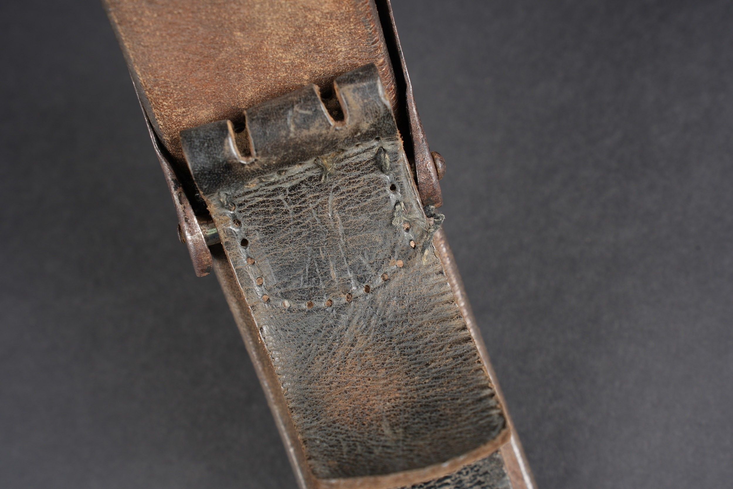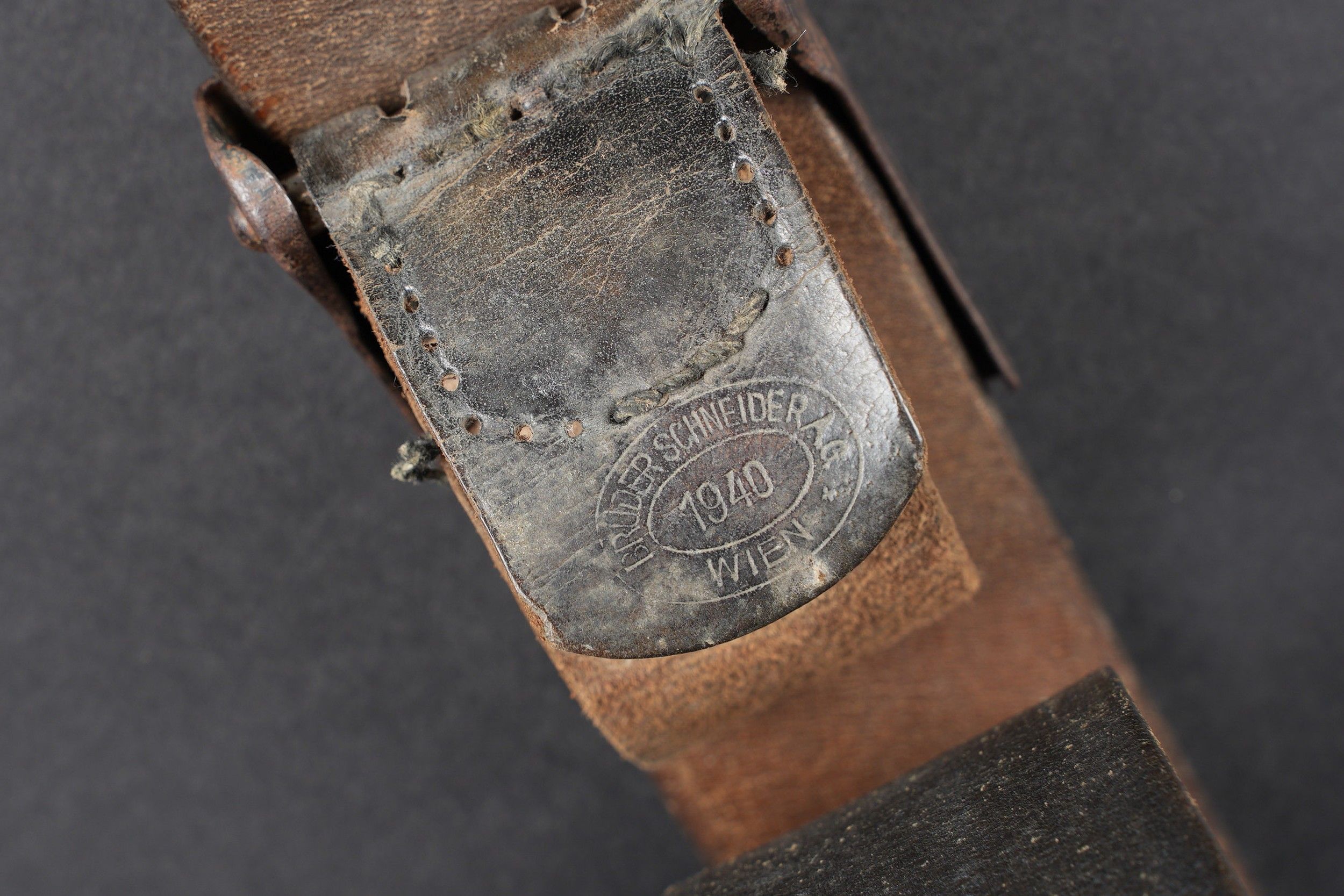 LW belt. Black leather belt. Metal buckle, with 40% Feldgrau paint residue. Markings are illegible. Complete adjustment tab. Luftwaffe metal belt buckle. 70% grey/blue paint. No visible markings, leather tab dated 1941, partially unstitched. Some wear and patina. Condition II+. Luftwaffe belt. Black leather belt with metal buckle retaining about 40% of its original Feldgrau paint. Markings illegible. Adjustment tab complete. Luftwaffe buckle in metal with about 70% of the original blue-grey paint remaining. No visible markings. Leather tab dated 1941, partly unstitched. Shows typical wear and patina. Condition II+.