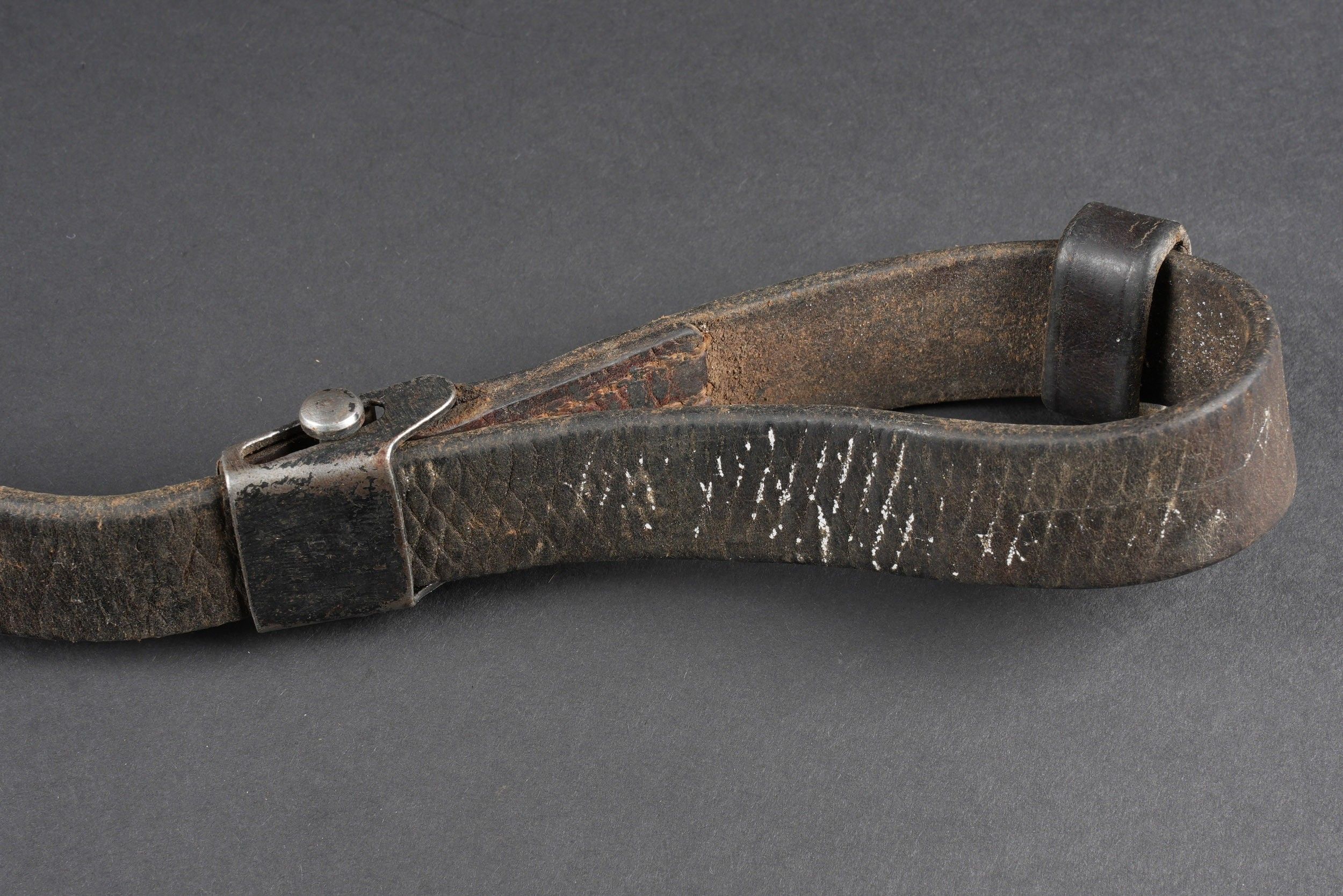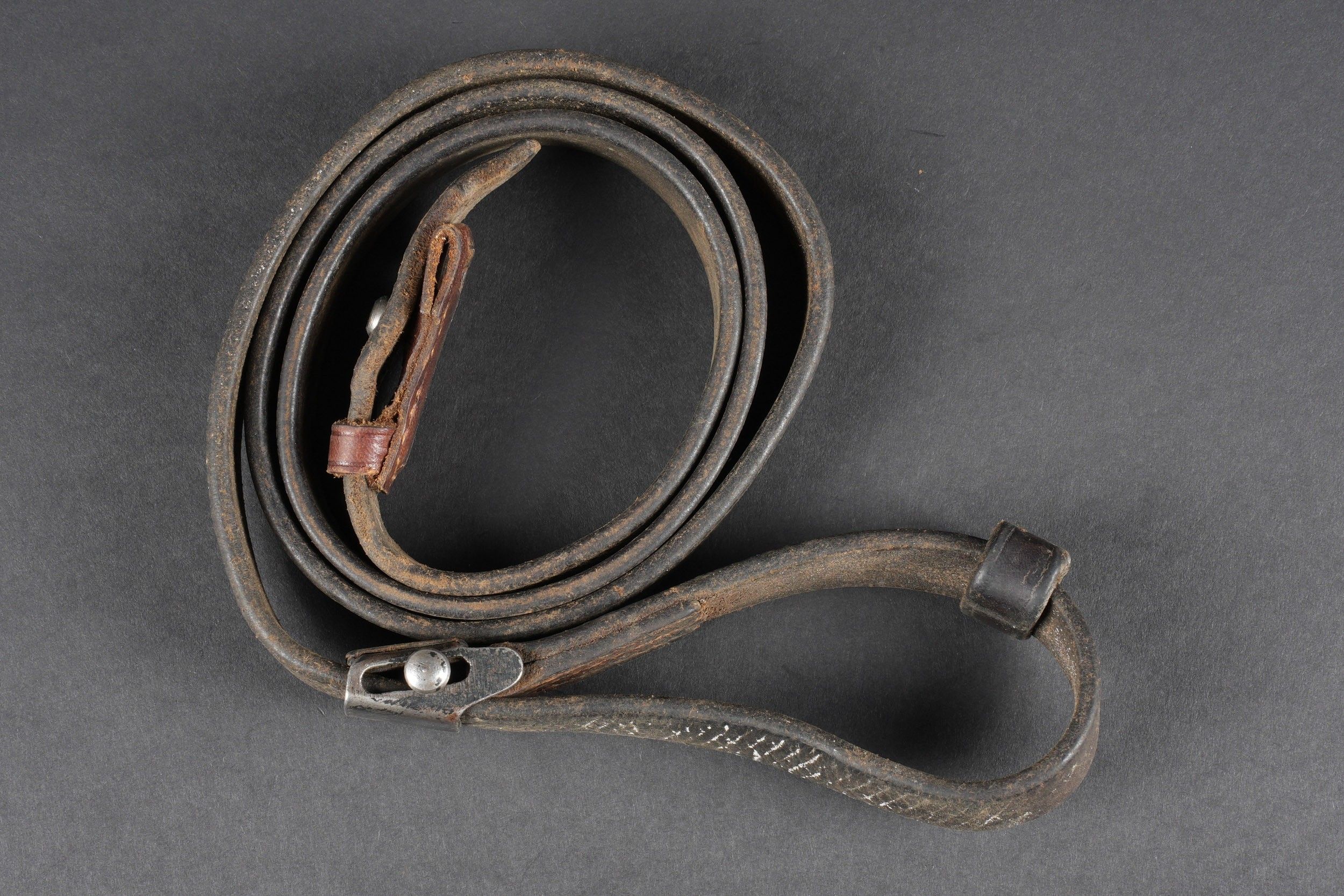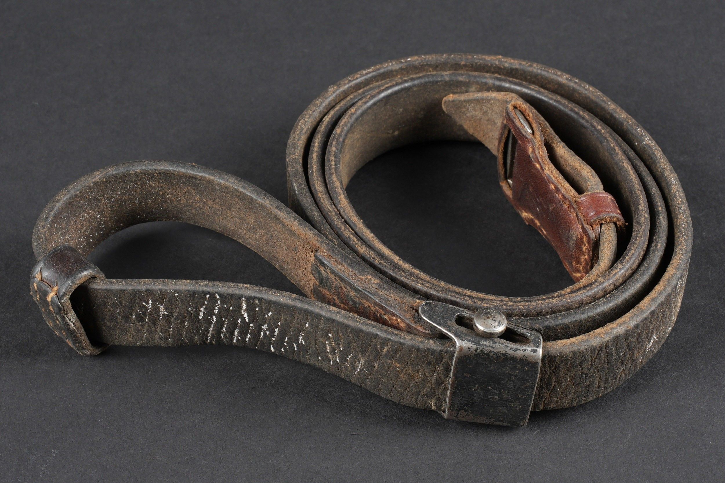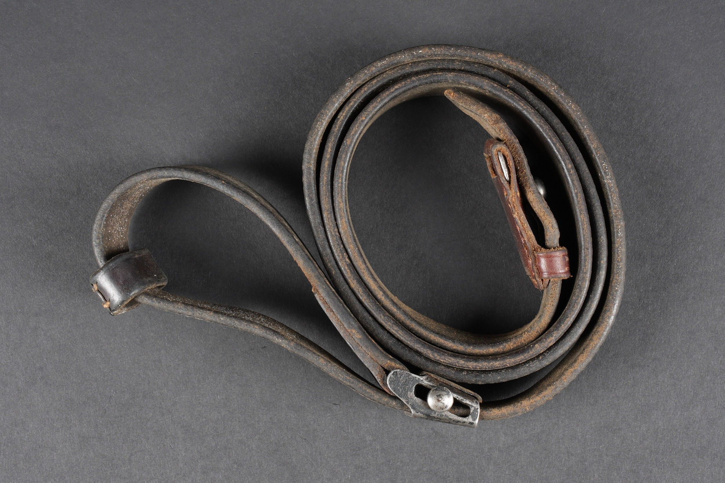 Mauser 98K shoulder strap. In thick brown leather. Complete. Three adjustment holes. SS runic markings on leather strap. The metal parts are marked L&F. Some wear and patina. Condition II+.