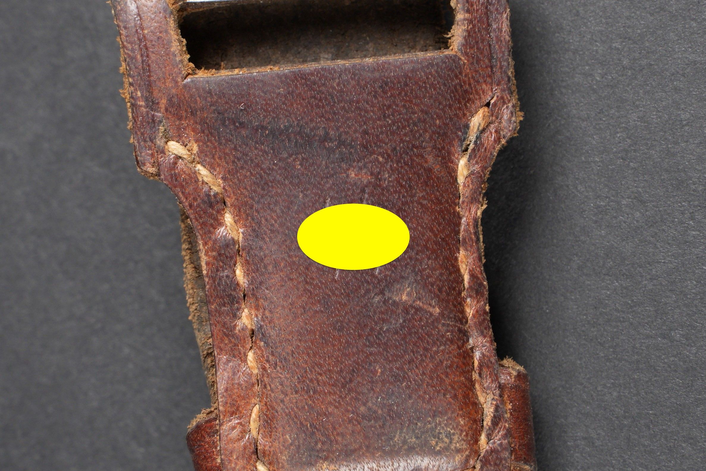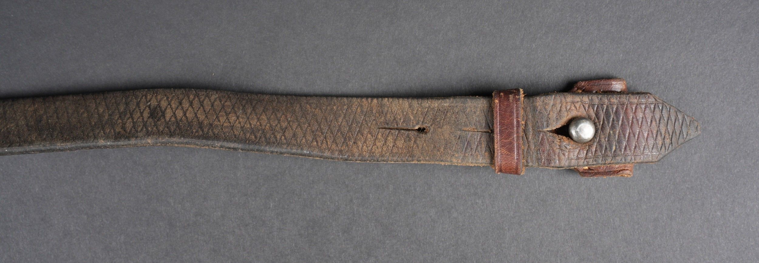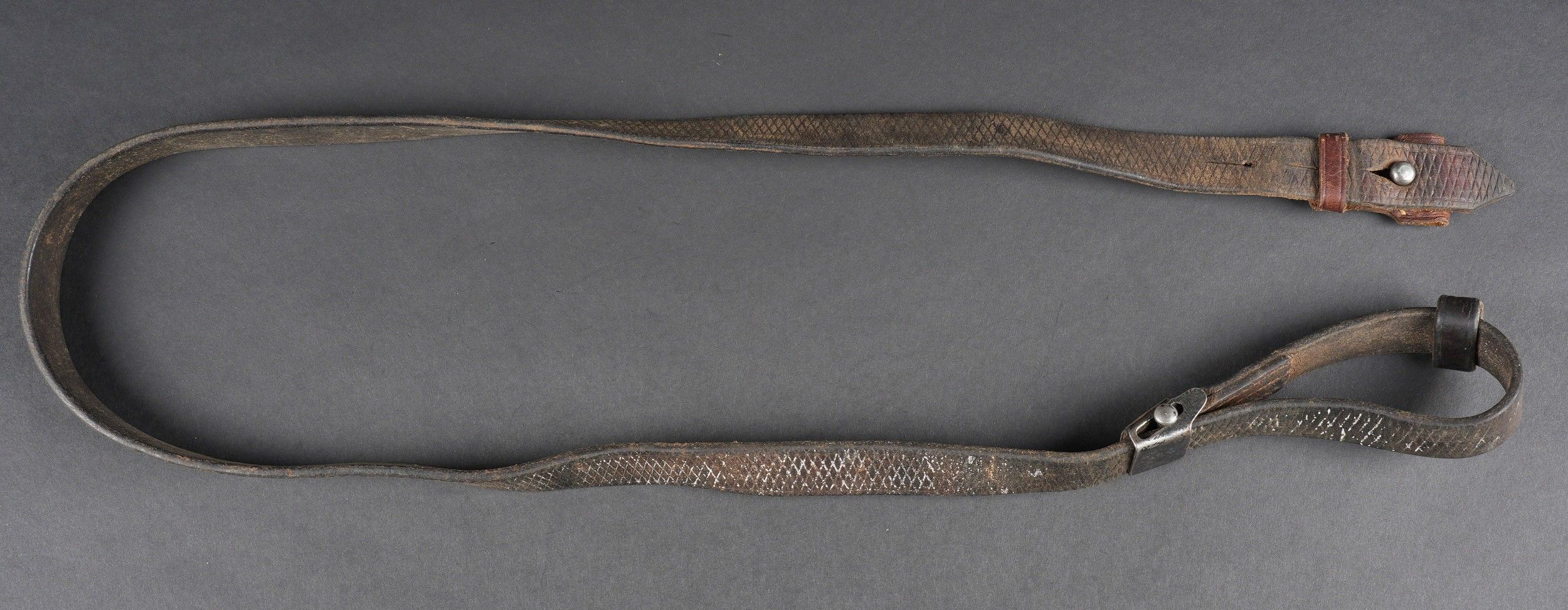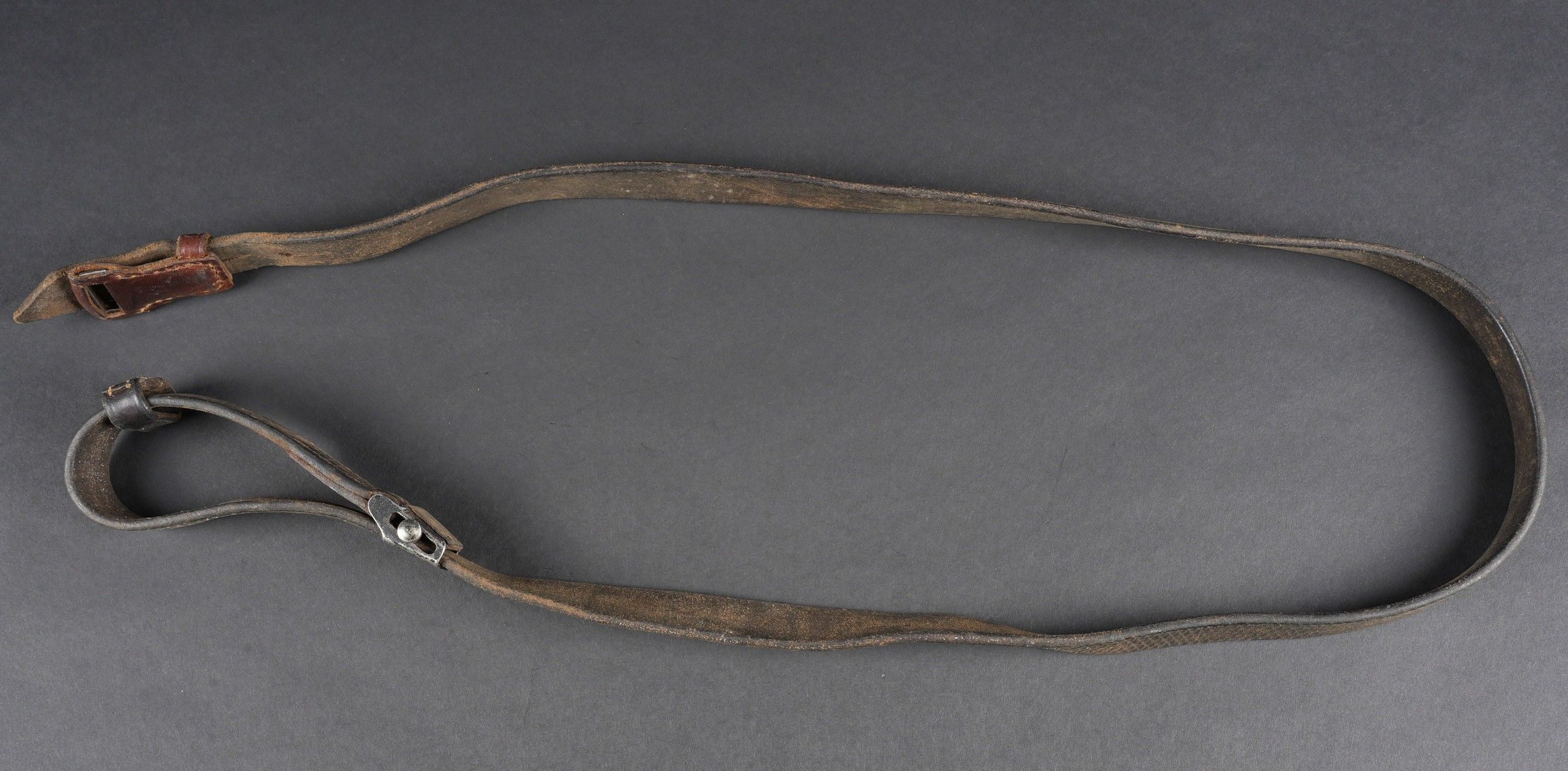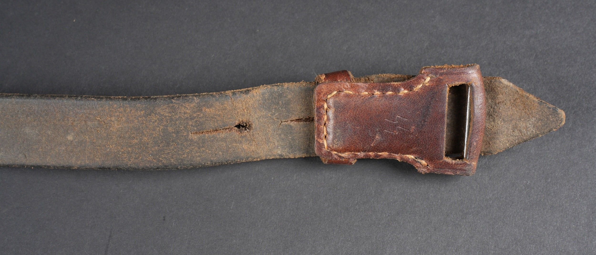 Mauser 98K shoulder strap. In thick brown leather. Complete. Three adjustment holes. SS runic markings on leather strap. The metal parts are marked L&F. Some wear and patina. Condition II+.
