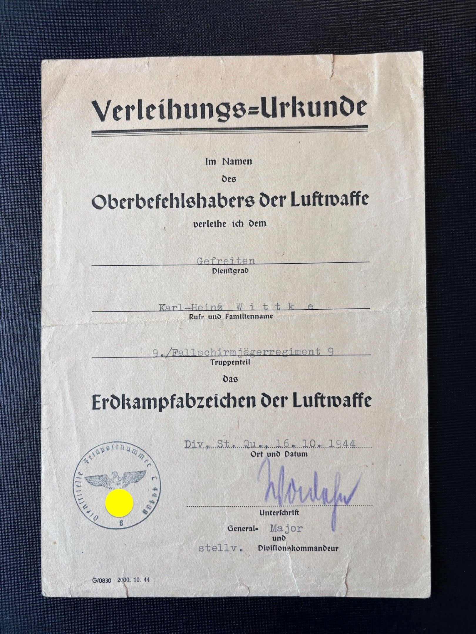 Diploma of the Erdkampfabzeichen der Luftwaffe. On card. Awarded to Gefreiten Karl Heinz Wittke of Fallschirmjägerregiment 9 on 16 October 1944. Some visible tears. Some wear and patina. Condition II+.