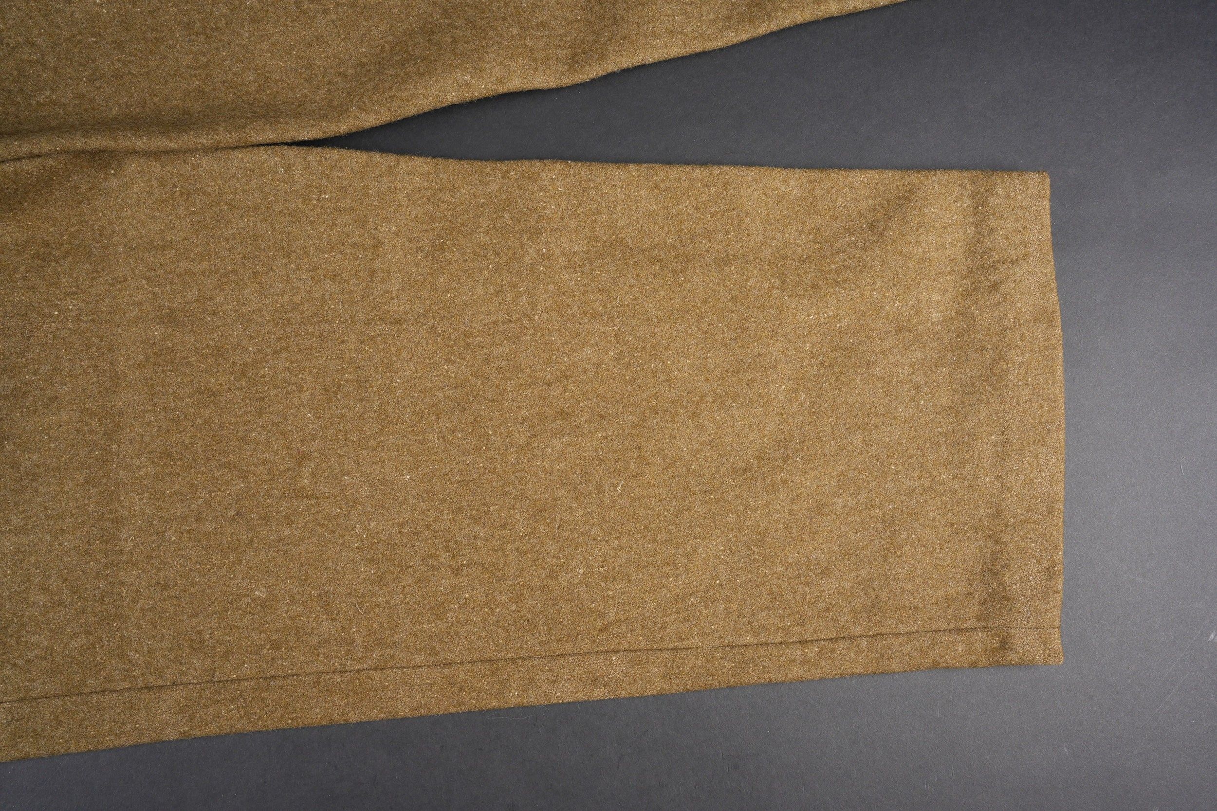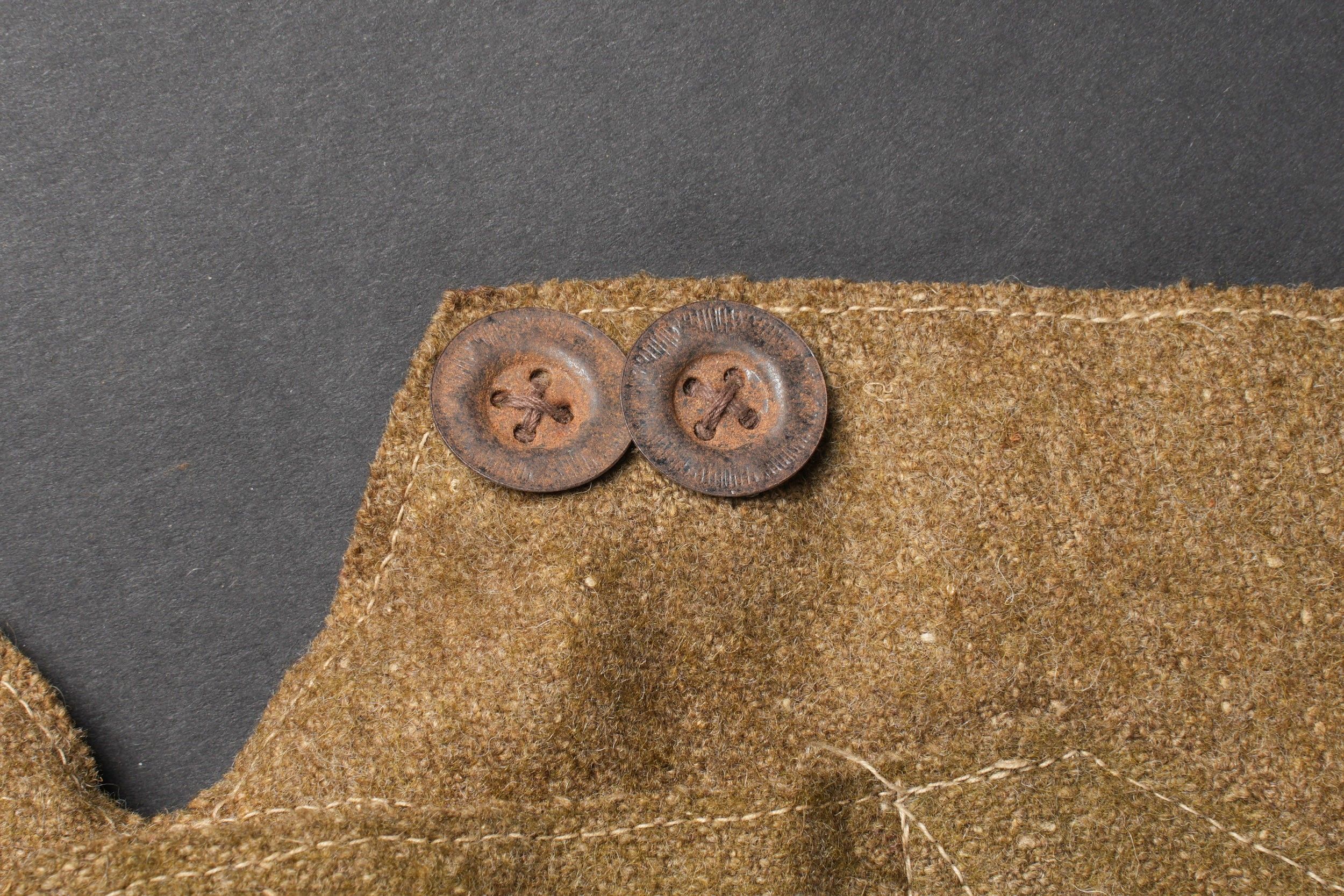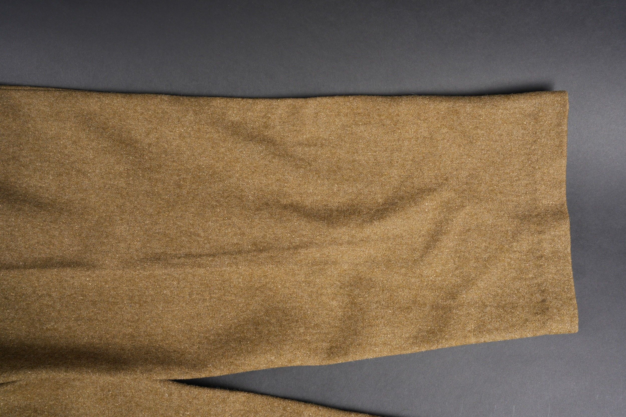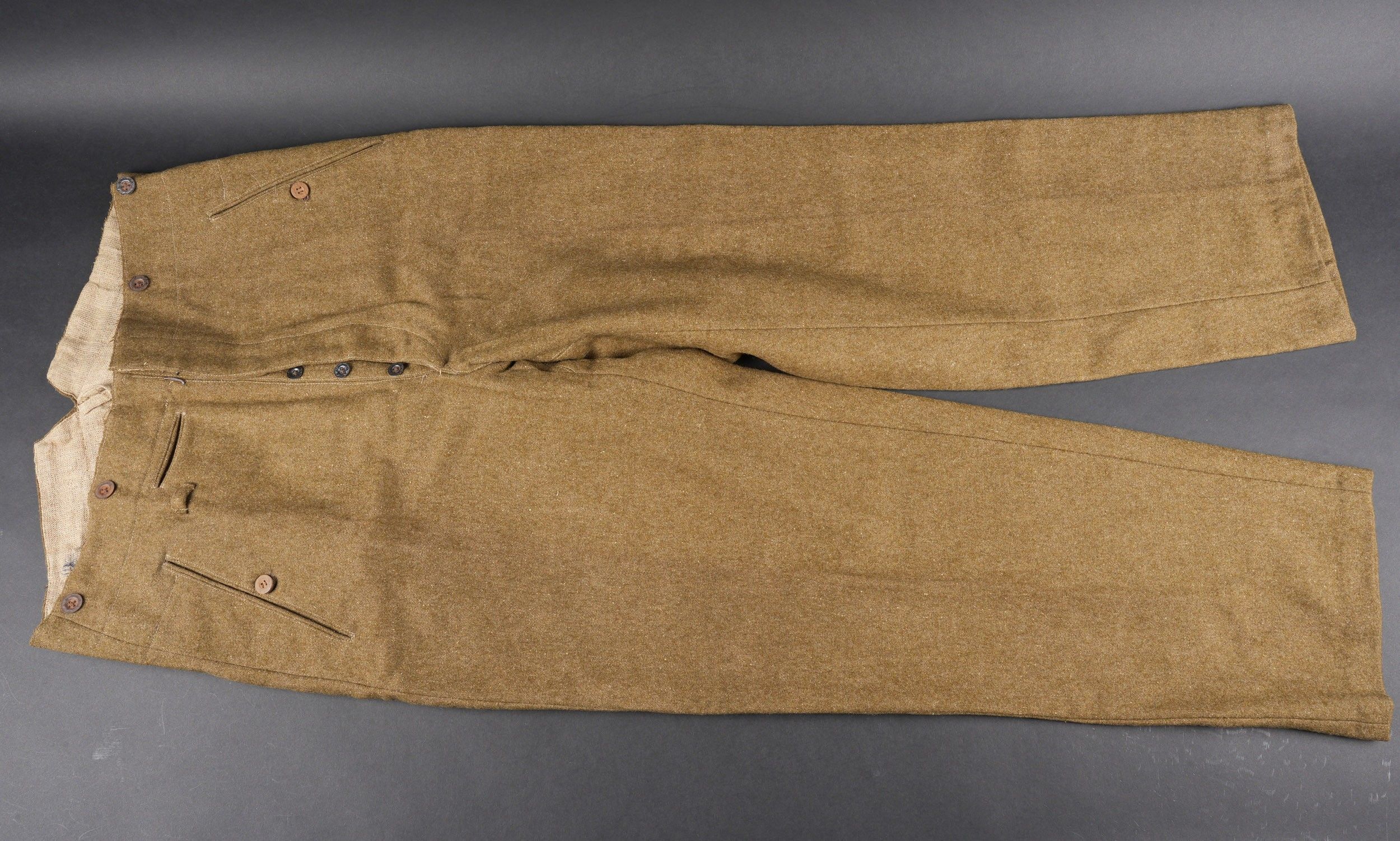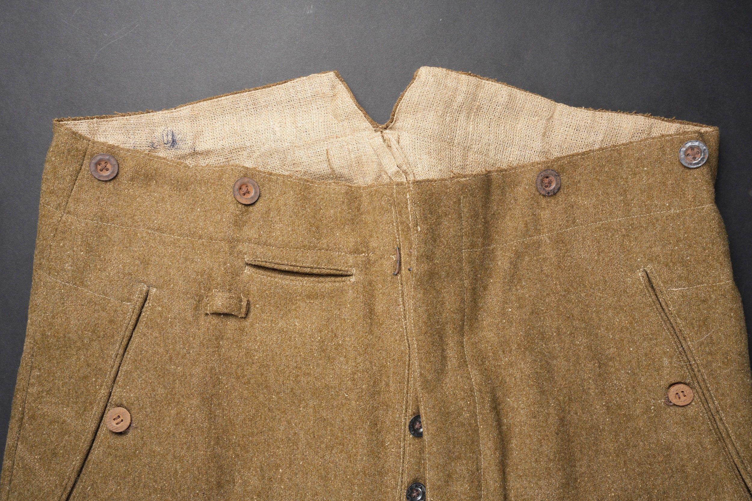 Todt Organisation trousers. Thick brown cloth. All buttons are present. Several types of buttons are visible. Full back martingale. Interior lined in thick hessian-type fabric. Markings are illegible. Some wear and patina. Condition II+. Organisation Todt trousers. Heavy brown wool. All buttons present, with several different types visible. Complete rear adjustment strap. Lined with thick jute-type fabric. Markings illegible. Shows wear and patina. Condition II+.