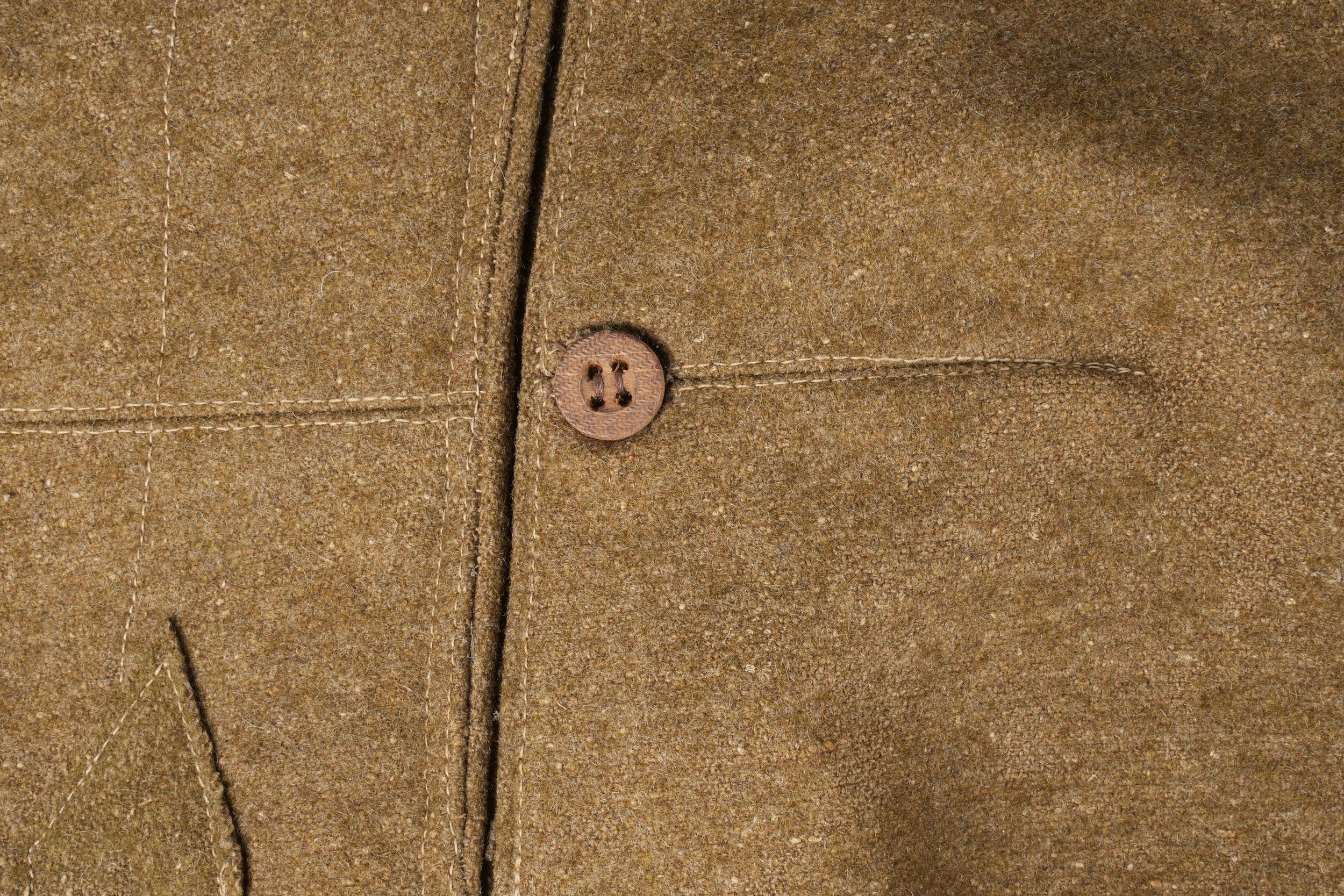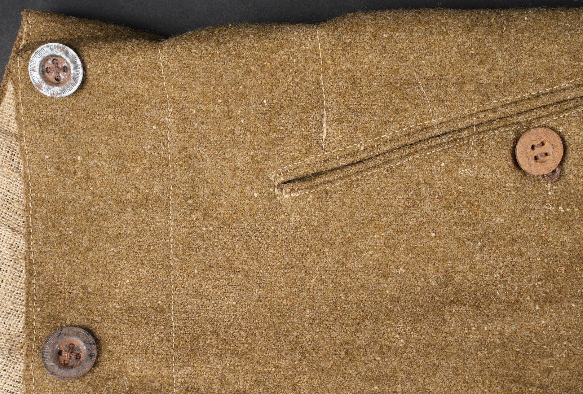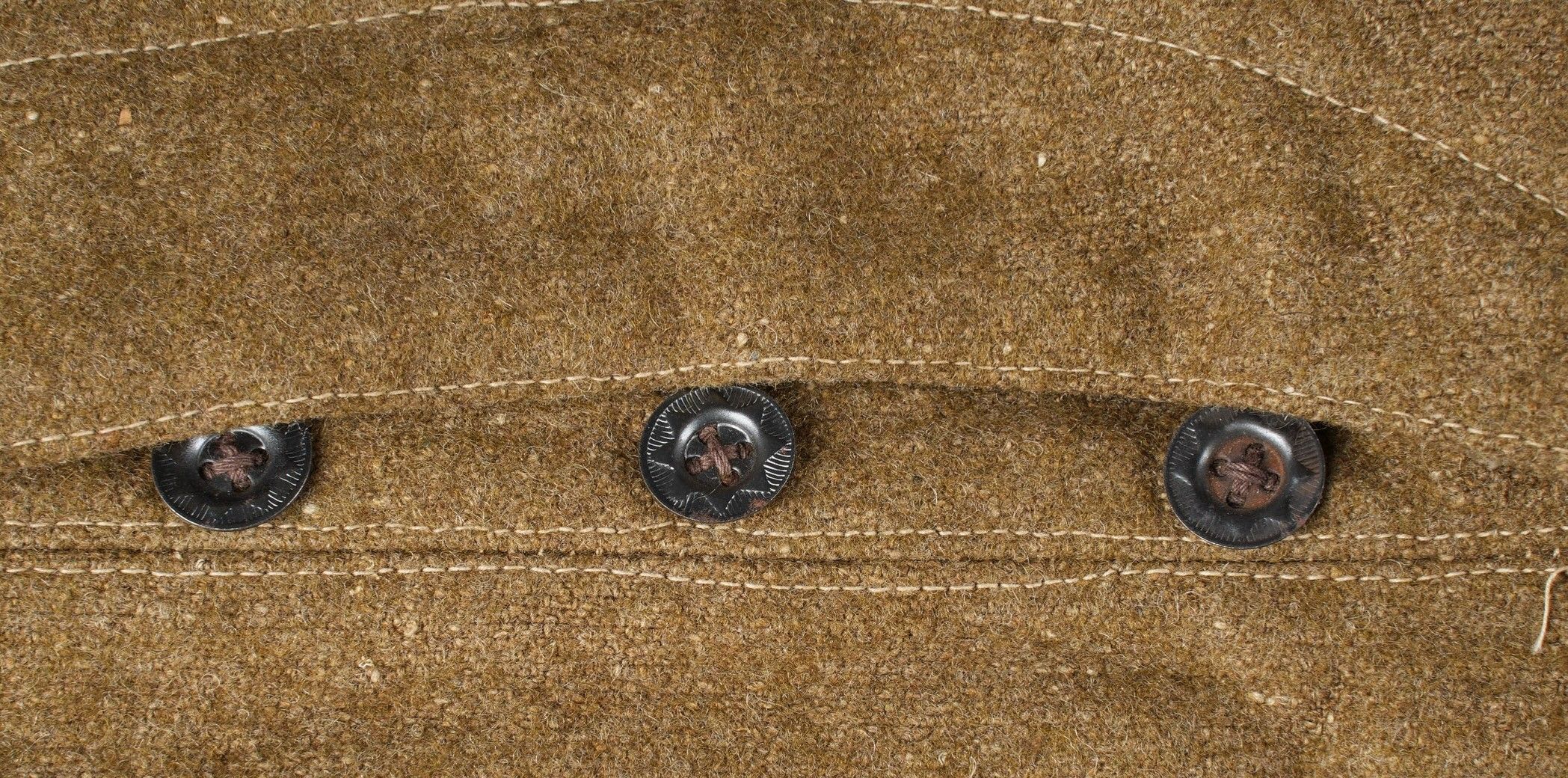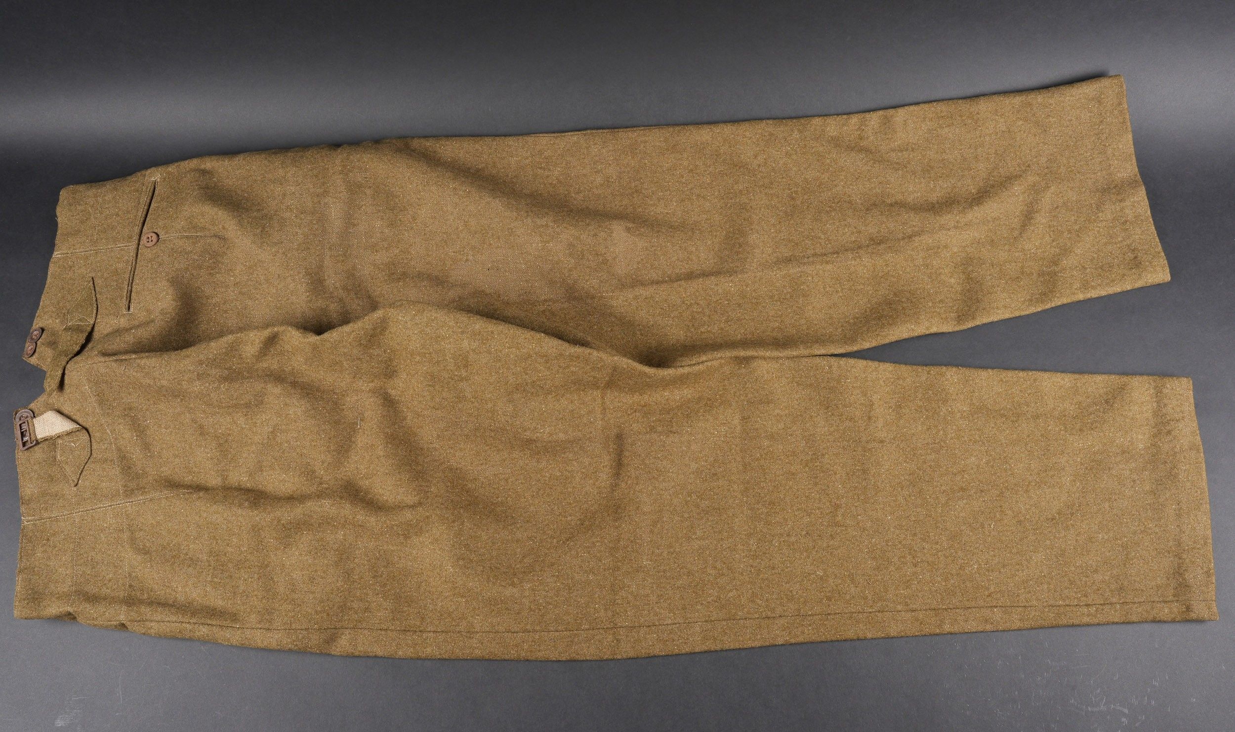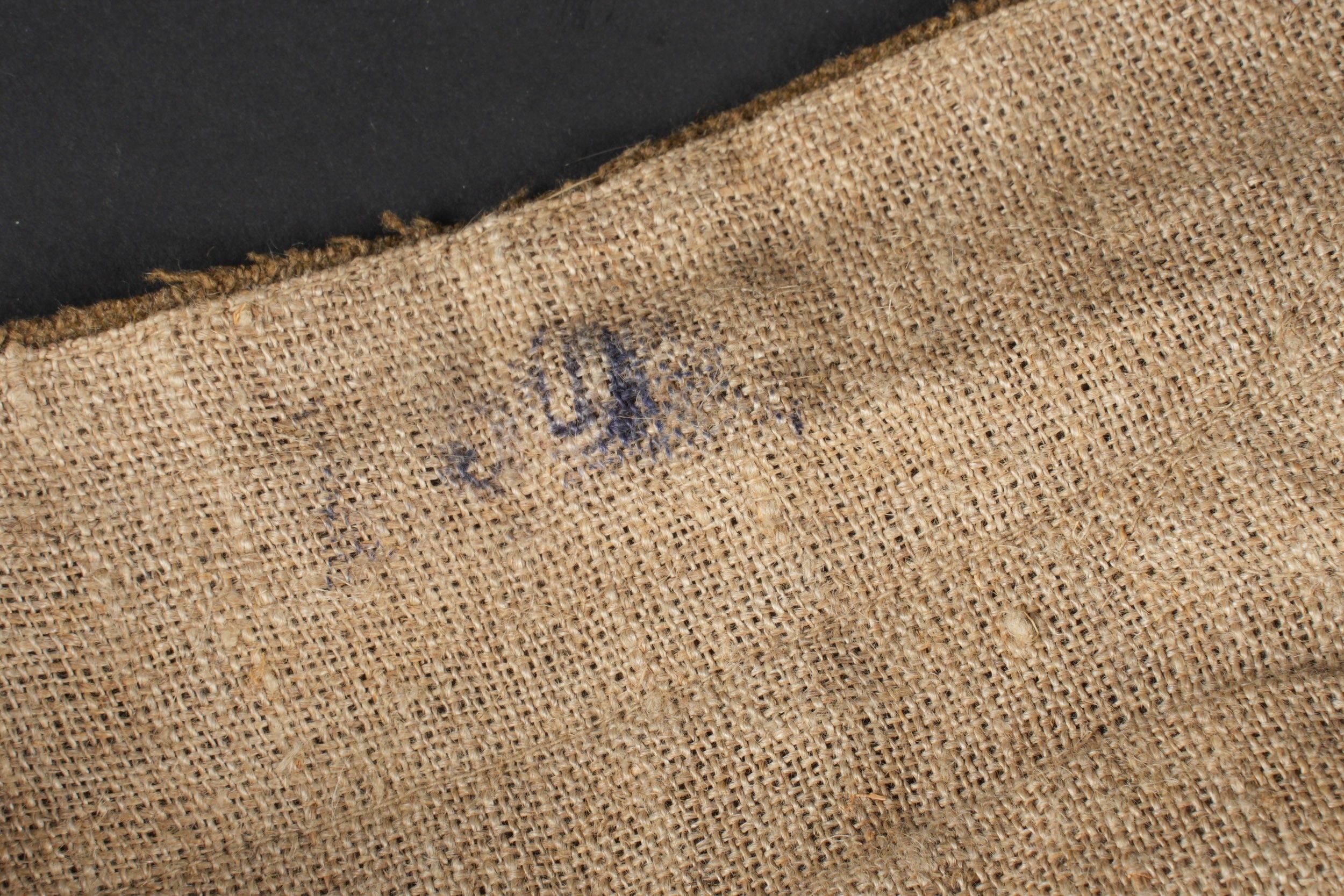 Todt Organisation trousers. Thick brown cloth. All buttons are present. Several types of buttons are visible. Full back martingale. Interior lined in thick hessian-type fabric. Markings are illegible. Some wear and patina. Condition II+. Organisation Todt trousers. Heavy brown wool. All buttons present, with several different types visible. Complete rear adjustment strap. Lined with thick jute-type fabric. Markings illegible. Shows wear and patina. Condition II+.