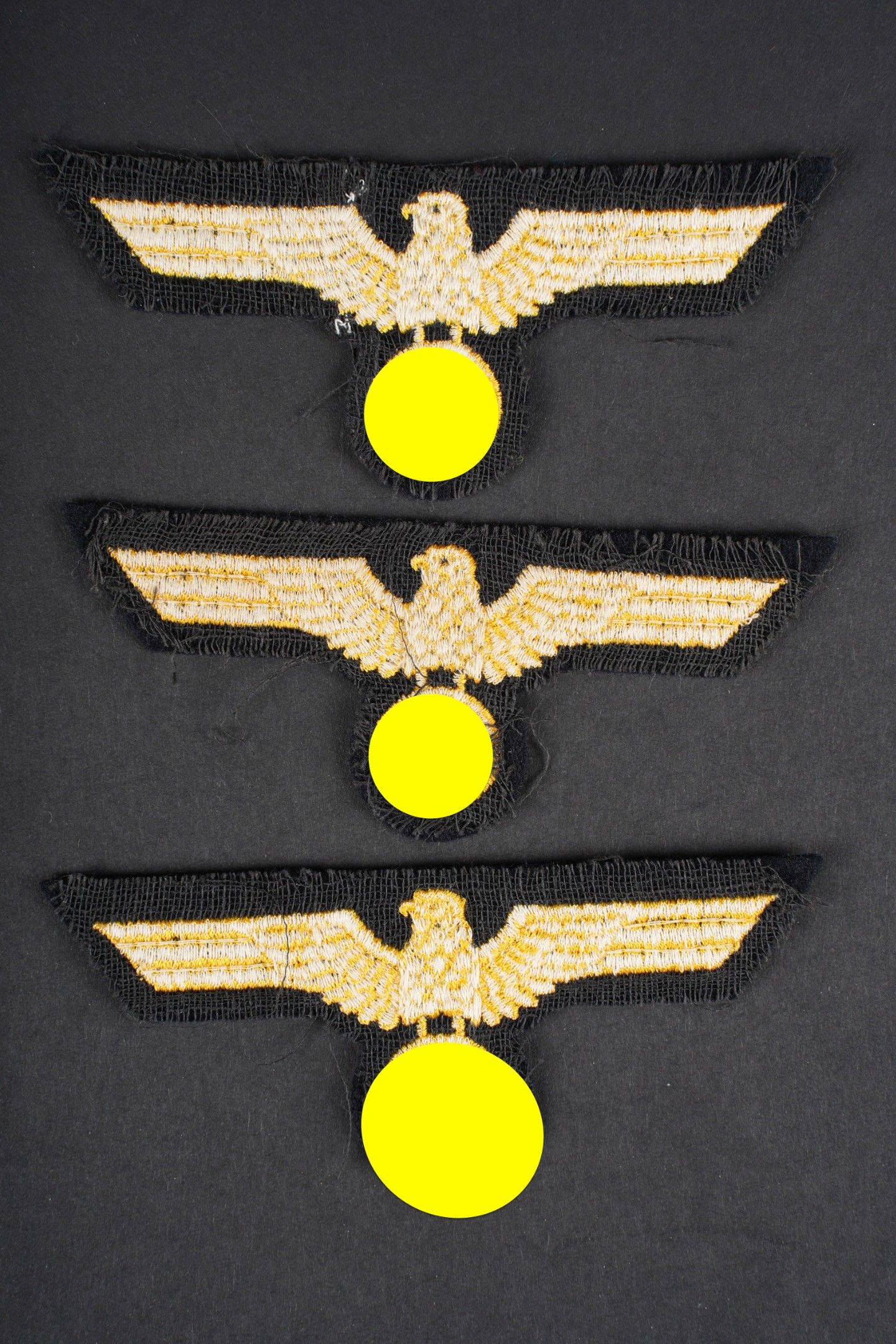 Kriegsmarine breast eagles. Three eagles embroidered on a black background. They appear to have been removed from a jacket. Back lined in black honeycomb fabric. To note a light wear and patina of the parts. Condition I+. Kriegsmarine breast eagles. Three black-background embroidered eagles, apparently removed from tunics. Backs lined with black honeycomb-pattern fabric. Slight wear and patina. Condition I+