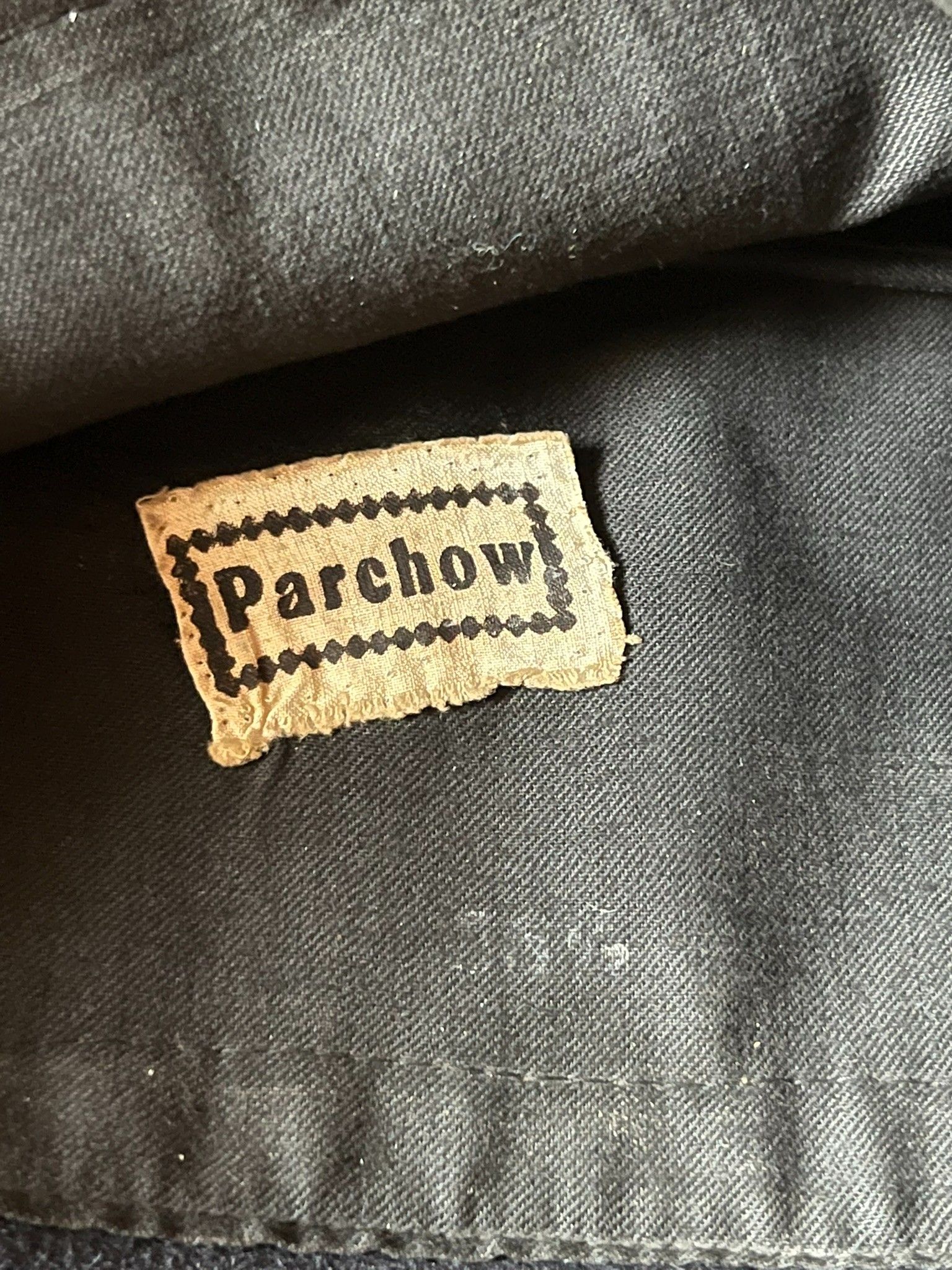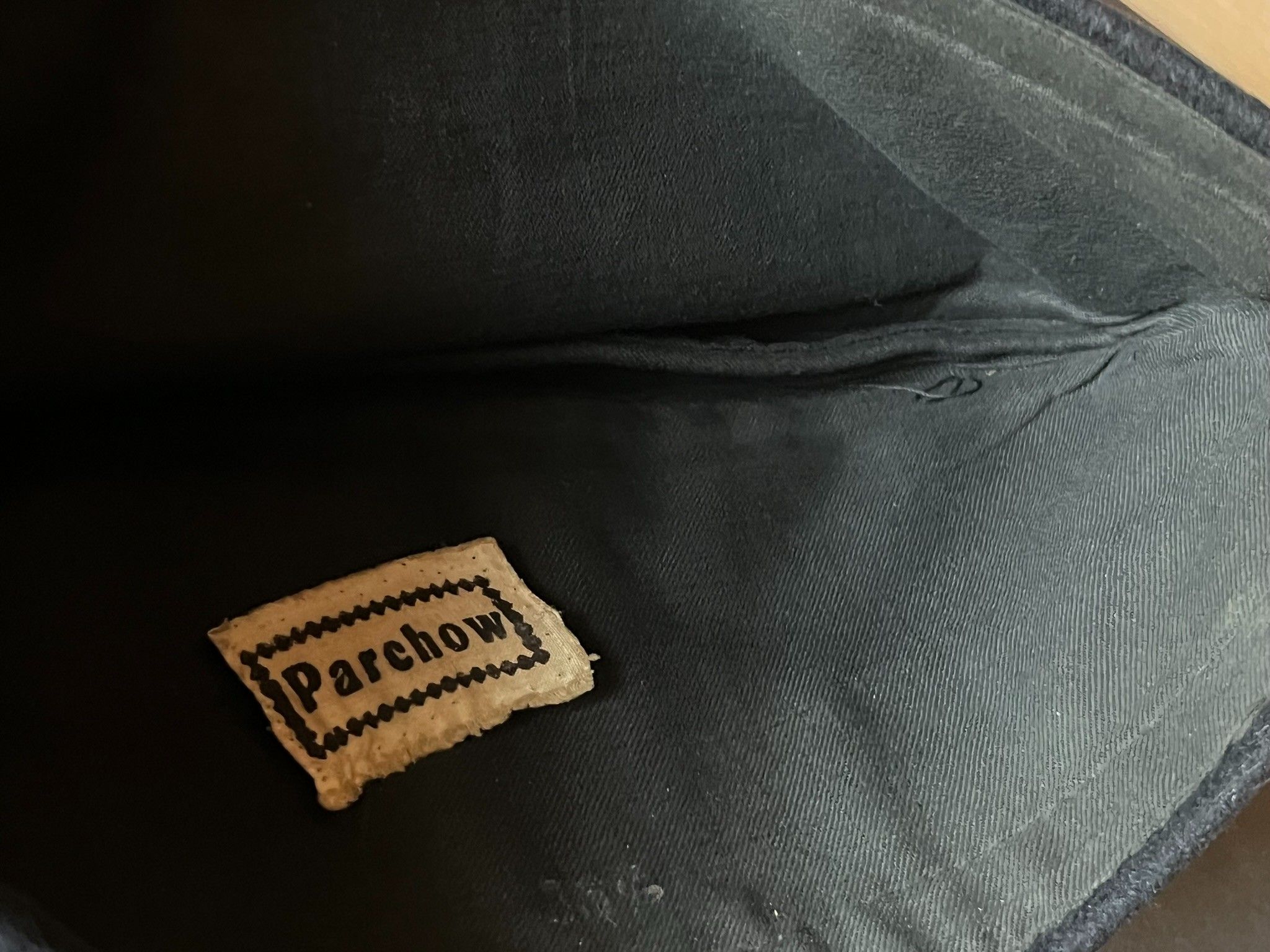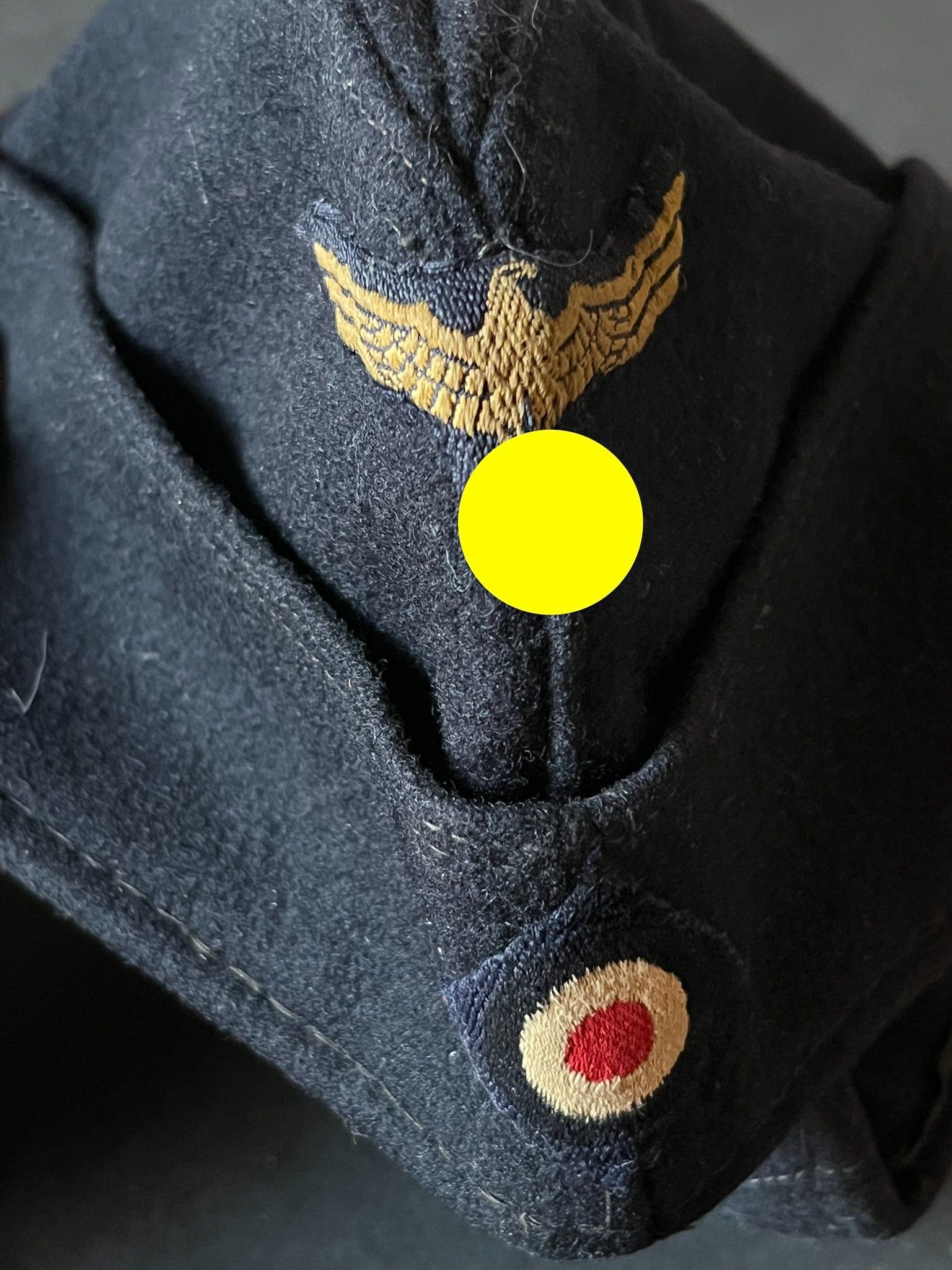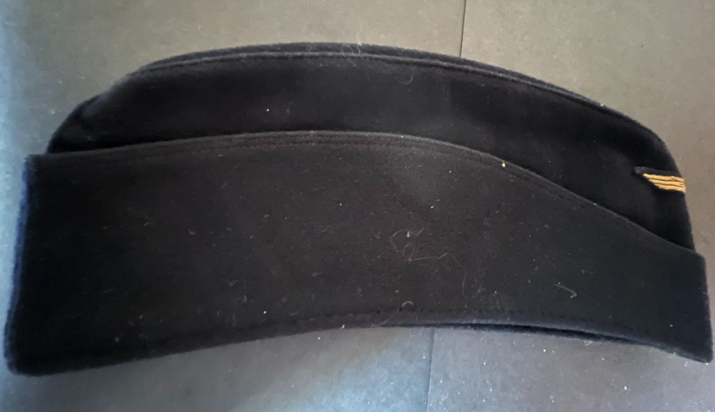 Kriegsmarine sailor's cap in cloth with black canvas lining complete with insignia and partially untucked printed name tag size approx 56. Kriegsmarine sailor's cap. Dark blue wool with black cotton lining, complete with insignia and partially detached printed name label. Approx. size 56.