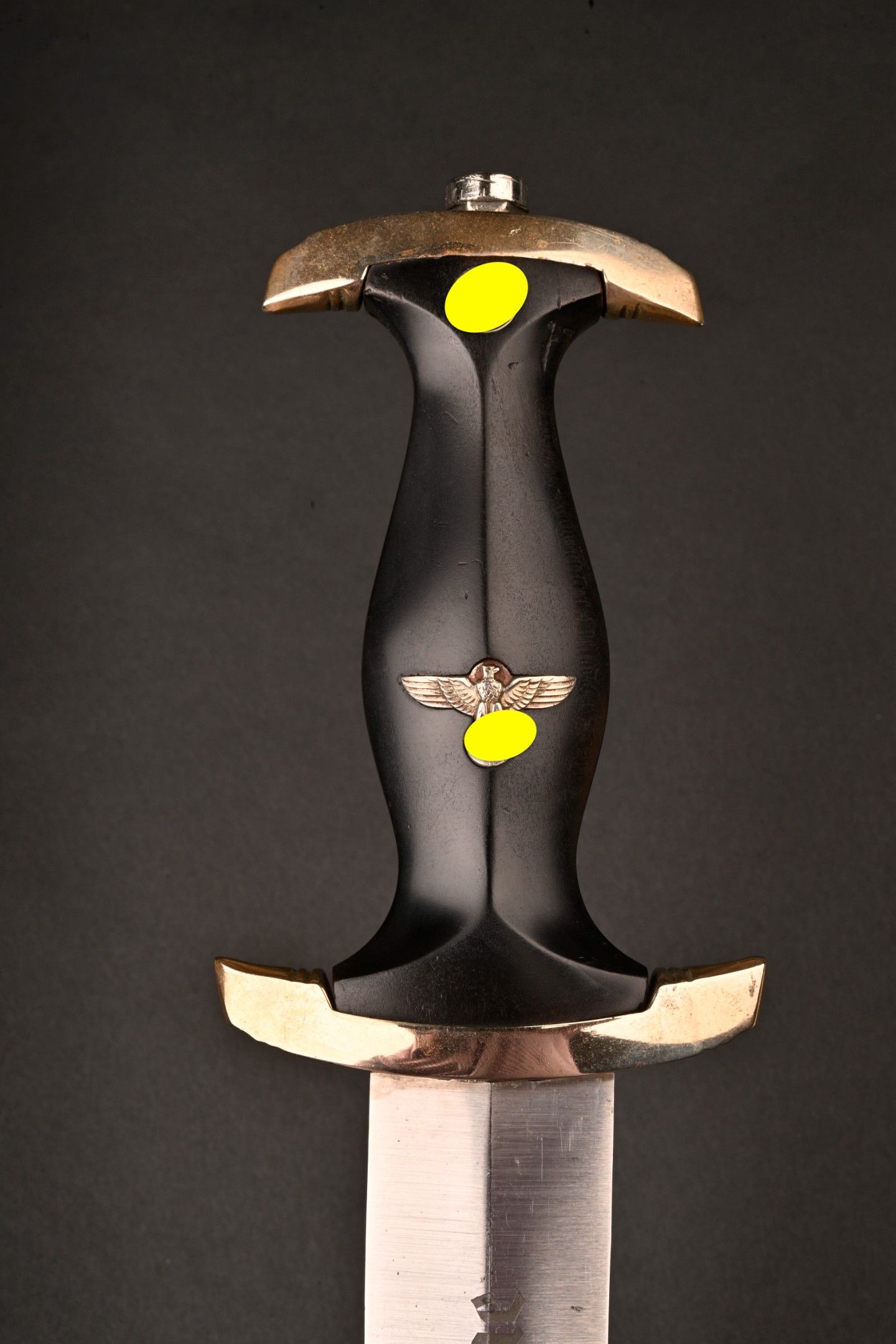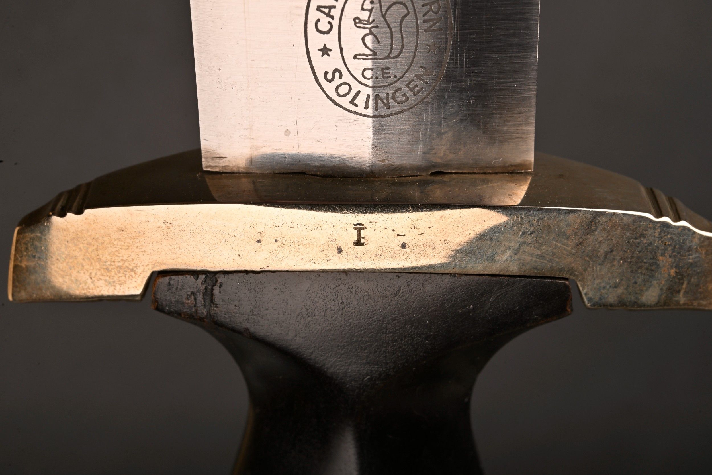 Model 1933 Carl Eickhorn SS dagger. This dagger is typical of the first pieces to come out of the famous Carl Eickhorn factories after the model was definitively adopted. All the fittings are in nickel silver. The Roman numeral I stamped on the back of the hilt indicates that this dagger passed through the SS control and distribution centre in München. A few discreet marks of use on the fuse, but no chips. Spotless blade with fine engraving of the motto. Manufacturer's markings typical of early blade production. Scabbard missing. Very good condition. Featured on page 29 of the reference book L'ordre noir, Armes blanches, traditions et symbolique published by Heimdal in 2023. SS Dagger Model 1933 Carl Eickhorn This dagger is characteristic of the first pieces produced by the renowned Carl Eickhorn workshops after the final adoption of the model. All fittings are made of nickel silver. The Roman numeral I stamped on the reverse of the crossguard indicates inspection and distribution through the SS control center in Munich. Minor handling marks on the grip but no chips. The blade is spotless with a fine motto etching. The maker's mark is typical of early production. Scabbard missing. Very good condition. Featured on page 29 of the reference work L'ordre noir, Armes blanches, traditions et symbolique published by Heimdal in 2023.