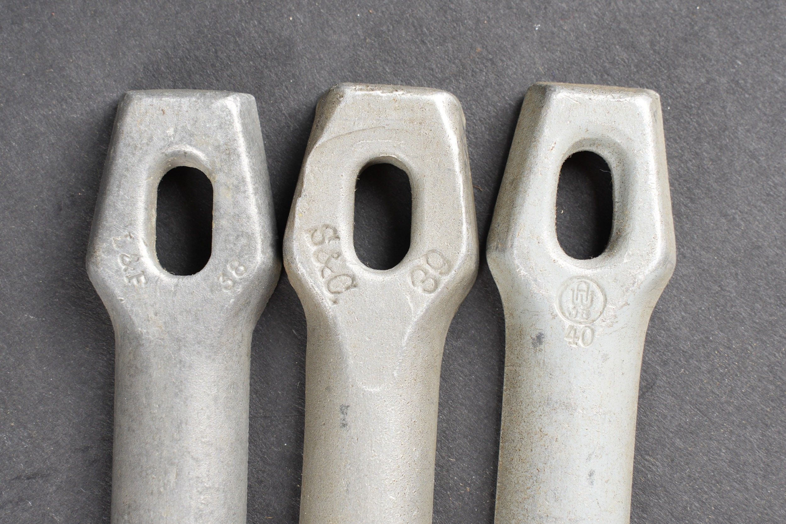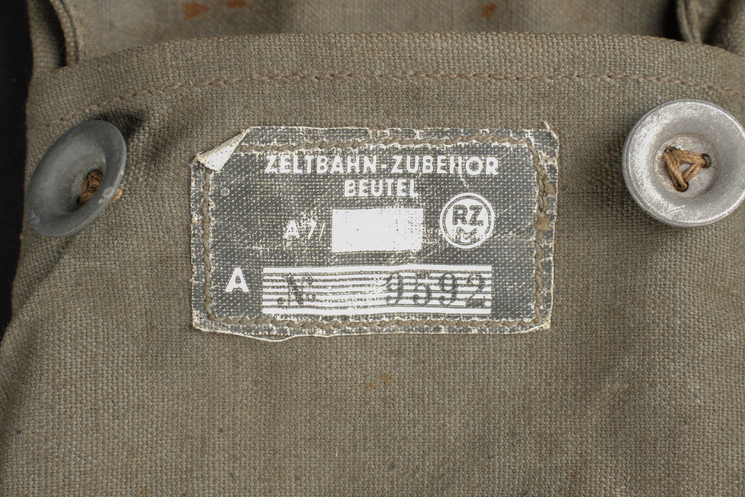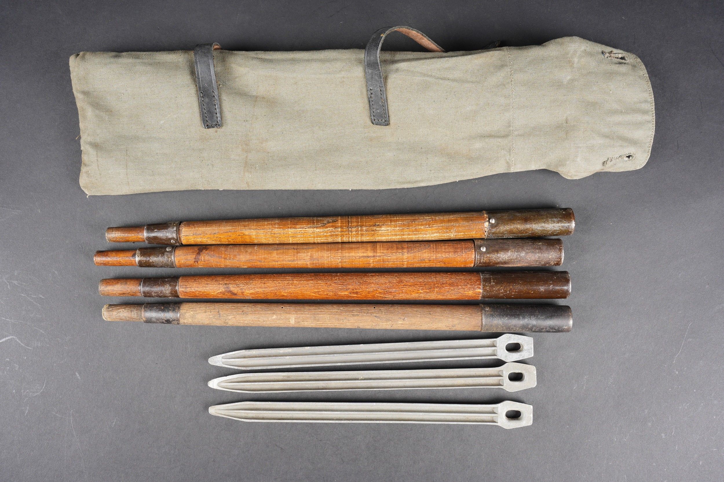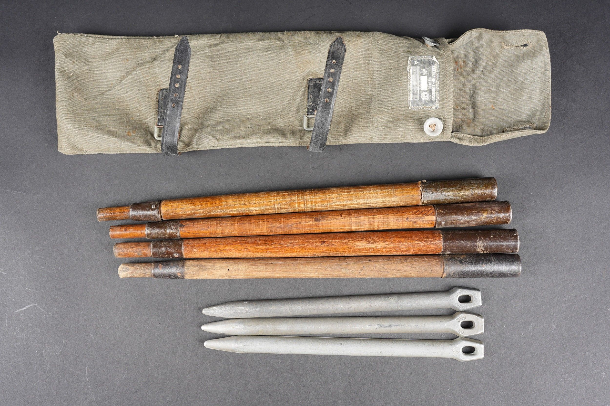 Cover for tent pegs. Strong grey canvas, all buttons present. Leather straps are present. Label marked Zeltbahn Zubehör Beutel. RZM label number 9592, manufacturer code illegible. Containing four tent pegs, wood and metal, no visible markings. Some wear and patina. Condition II+. Tent pole cover Made of heavy grey canvas, all buttons are present. The leather straps are intact. Label marked Zeltbahn Zubehör Beutel. RZM label number 9592, manufacturer code illegible. Contains four tent poles made of wood and metal without visible markings. Some wear and patina consistent with age. Condition II+.
