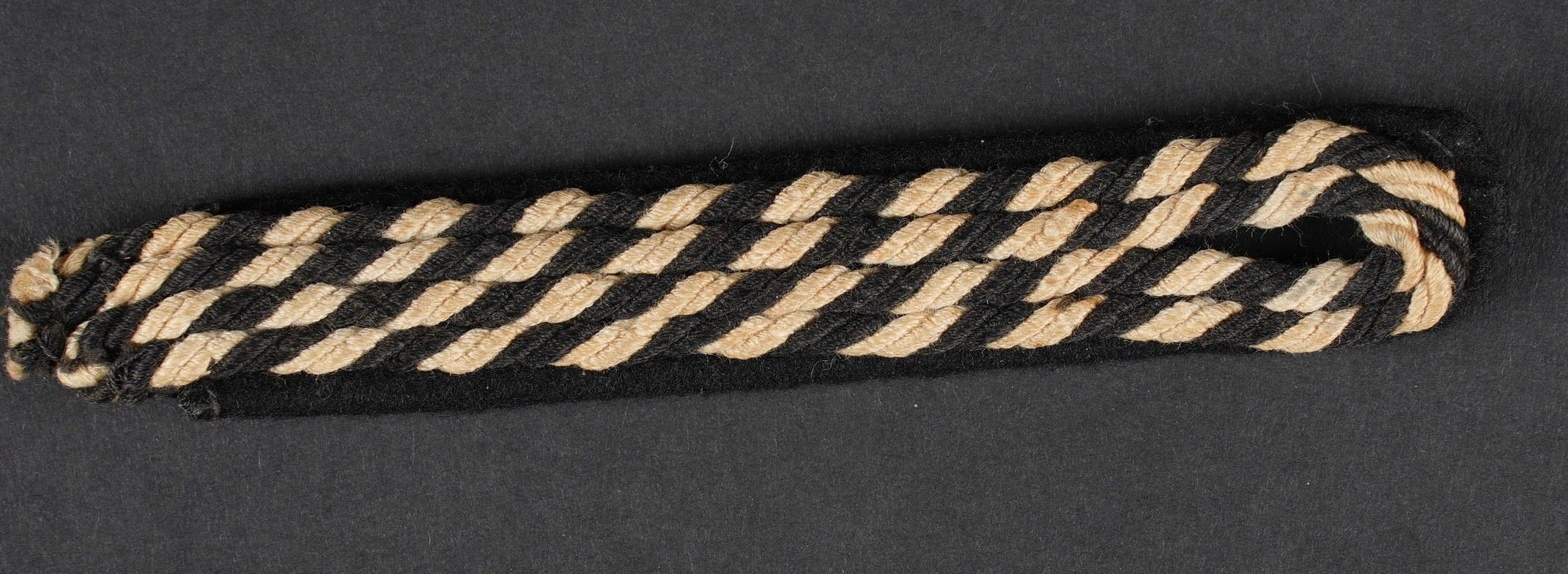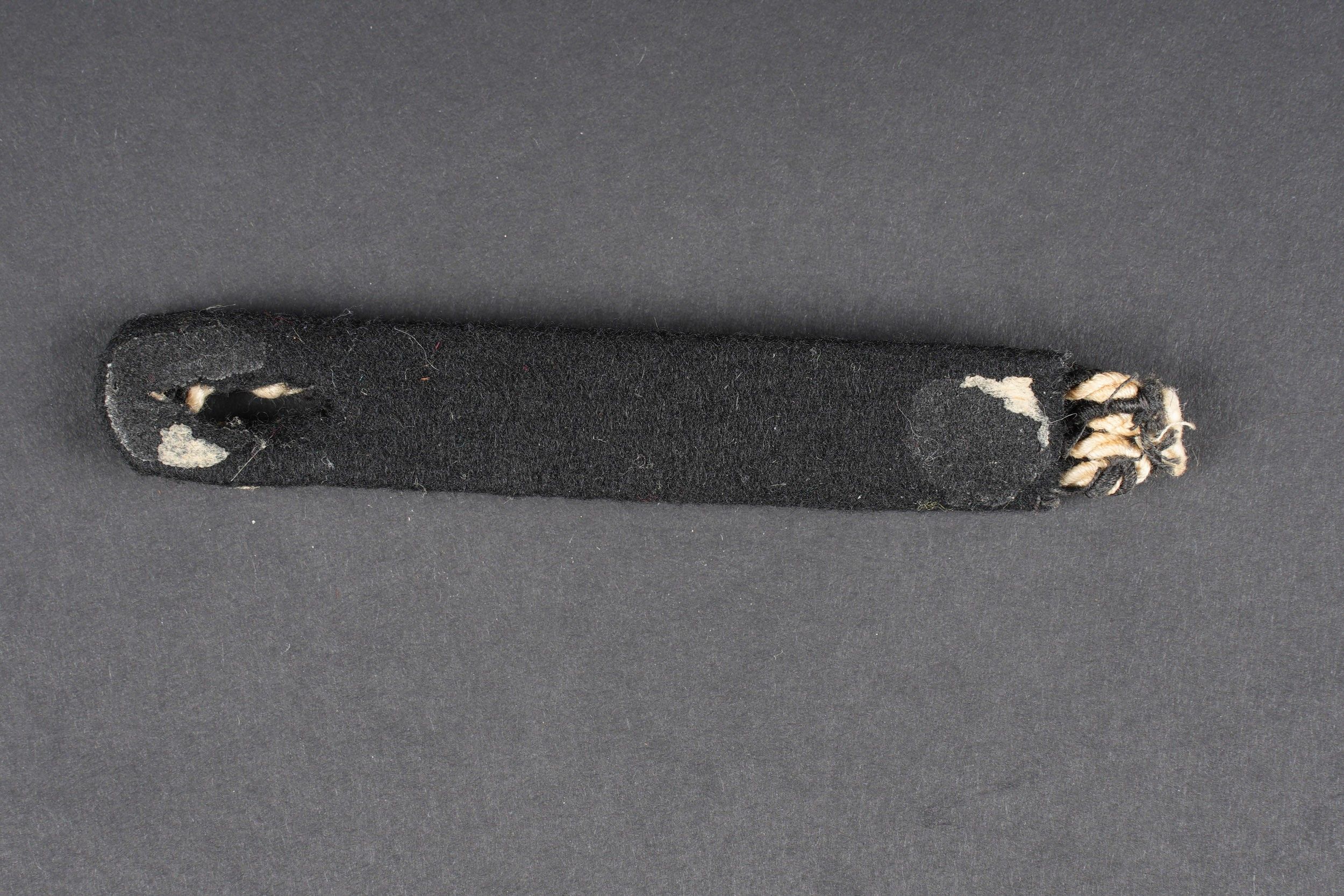 SS shoulder tab. Model for the Allgemeine SS, in black cloth and black/white twists. Visibly unstitched from a jacket. Rank from SS Mann to SS Hautscharführer. Some wear and patina. Condition II+. SS Shoulder Strap Model for the Allgemeine SS in black cloth with black and white piping. Clearly removed from a tunic. Rank for SS Mann to SS Hauptscharführer. Some wear and patina consistent with age. Condition II+.