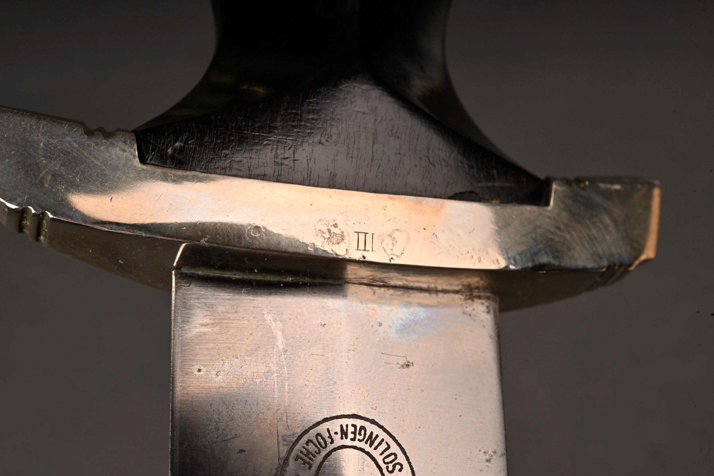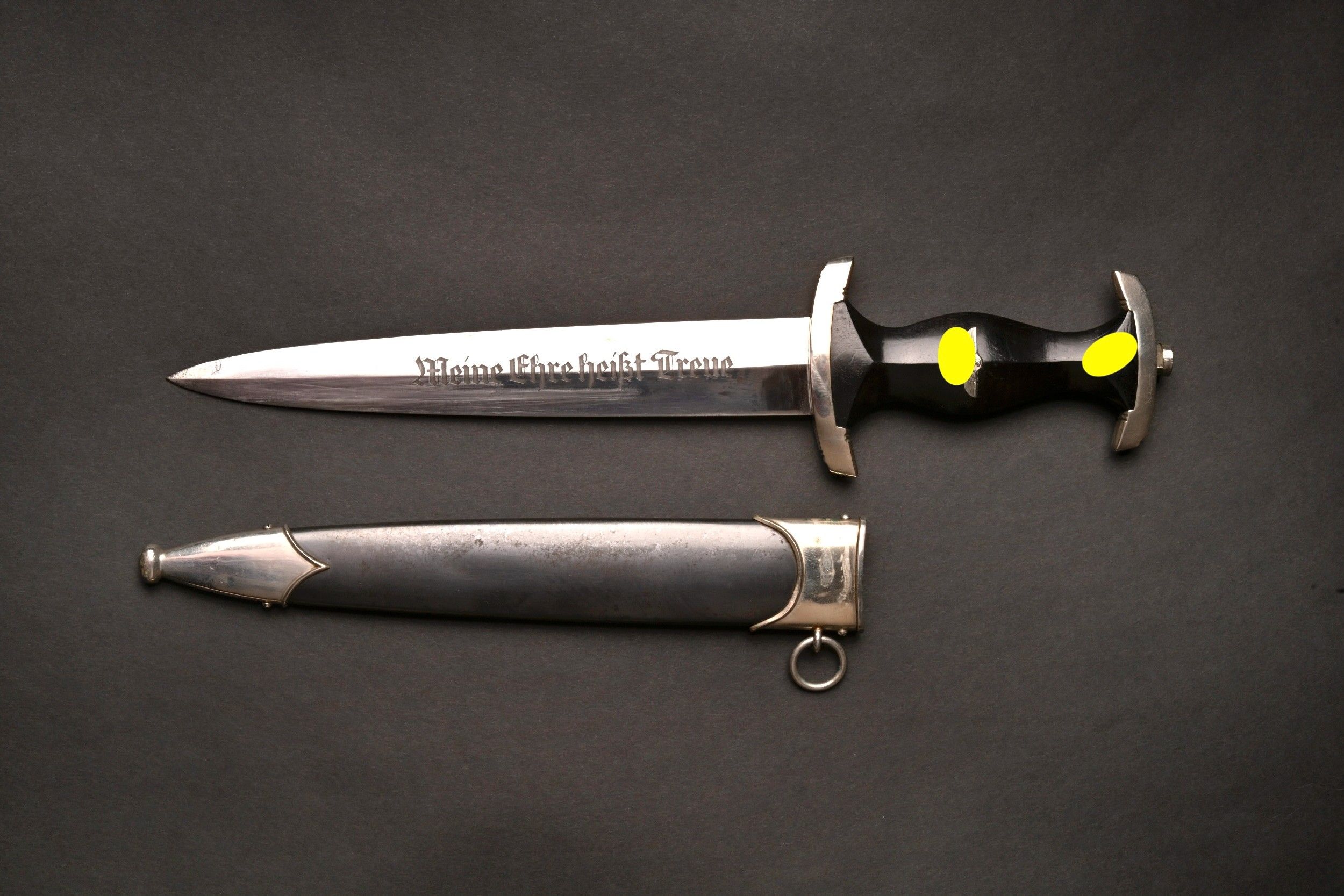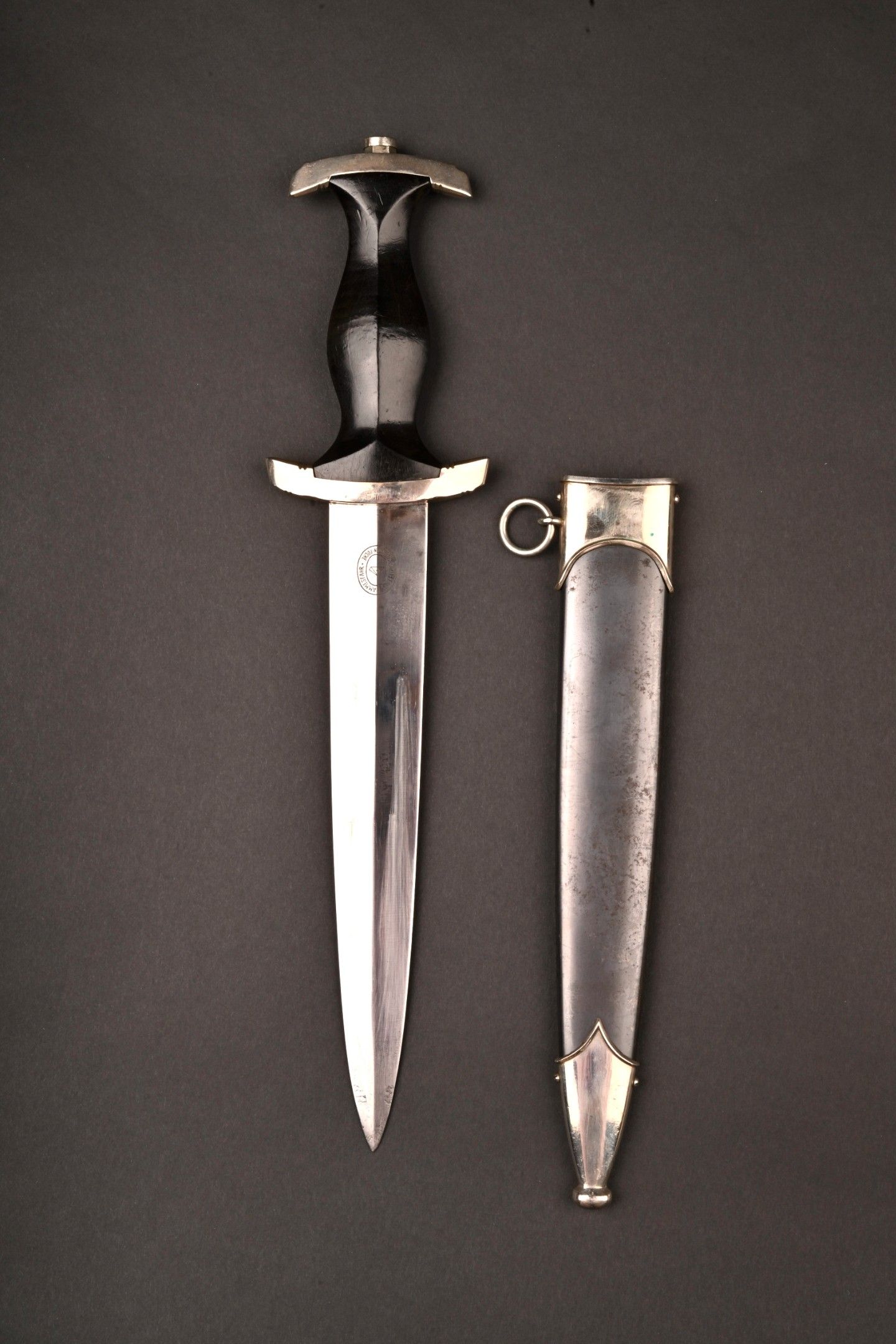 SS dagger model 1933 Gottlieb Hammesfahr. This is an early model, recognisable by its nickel silver fittings (dagger and scabbard) and the tanning that covers 98% of the scabbard. The fuse is virtually untouched and the Roman numeral III stamped on the back of the hilt indicates that this item passed through the SS control and distribution centre in Berlin. The blade is in very good condition with a fine engraving of the motto. A fine example of the early period. SS Dagger Model 1933 Gottlieb Hammesfahr Early production identified by nickel silver fittings on both dagger and scabbard and by the 98% intact blued scabbard finish. The grip shows almost no impact marks and the crossguard bears the Roman numeral III stamped on the reverse, indicating inspection through the SS control center in Berlin. The blade is in very good condition with a fine motto etching. An excellent representative example of early production.