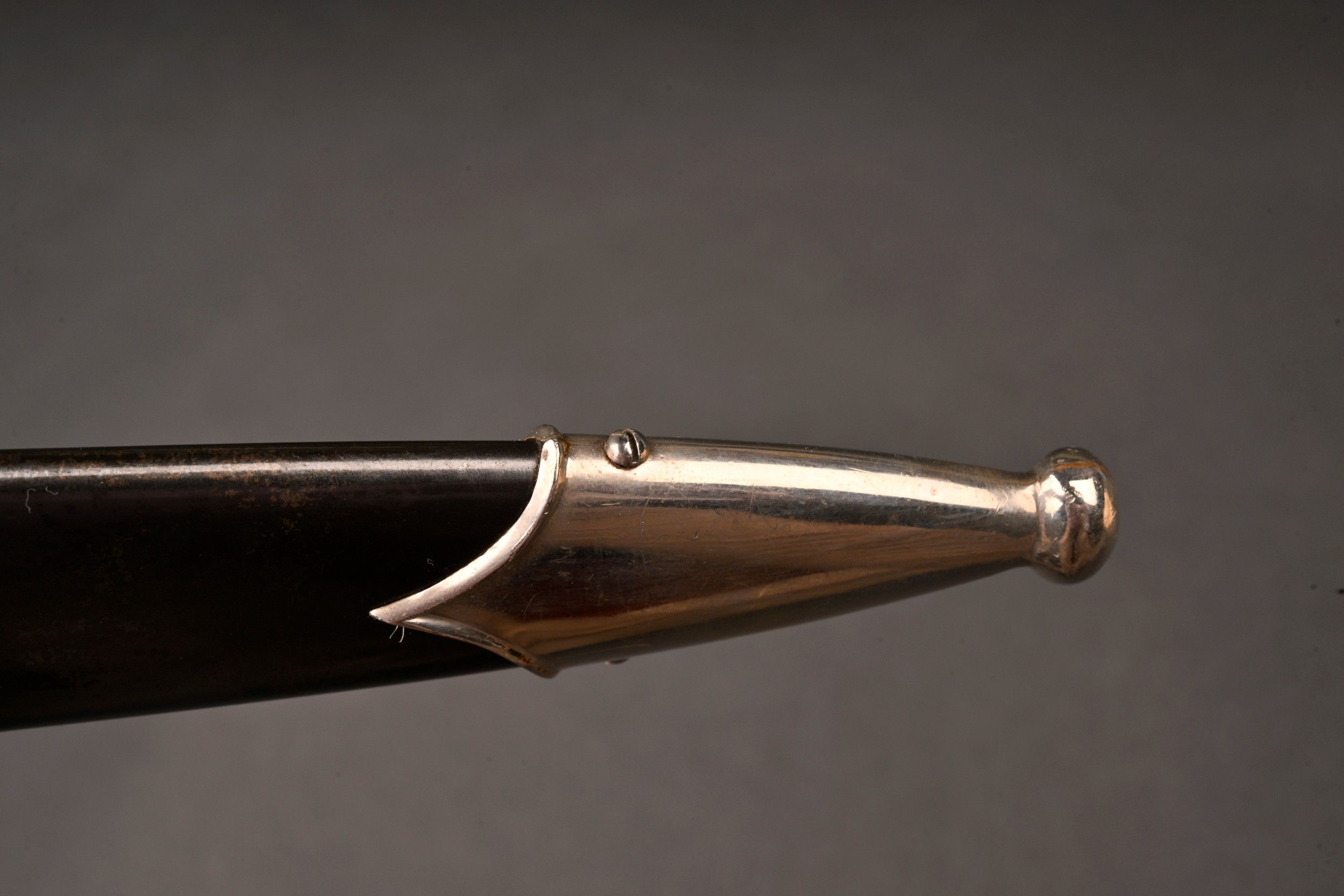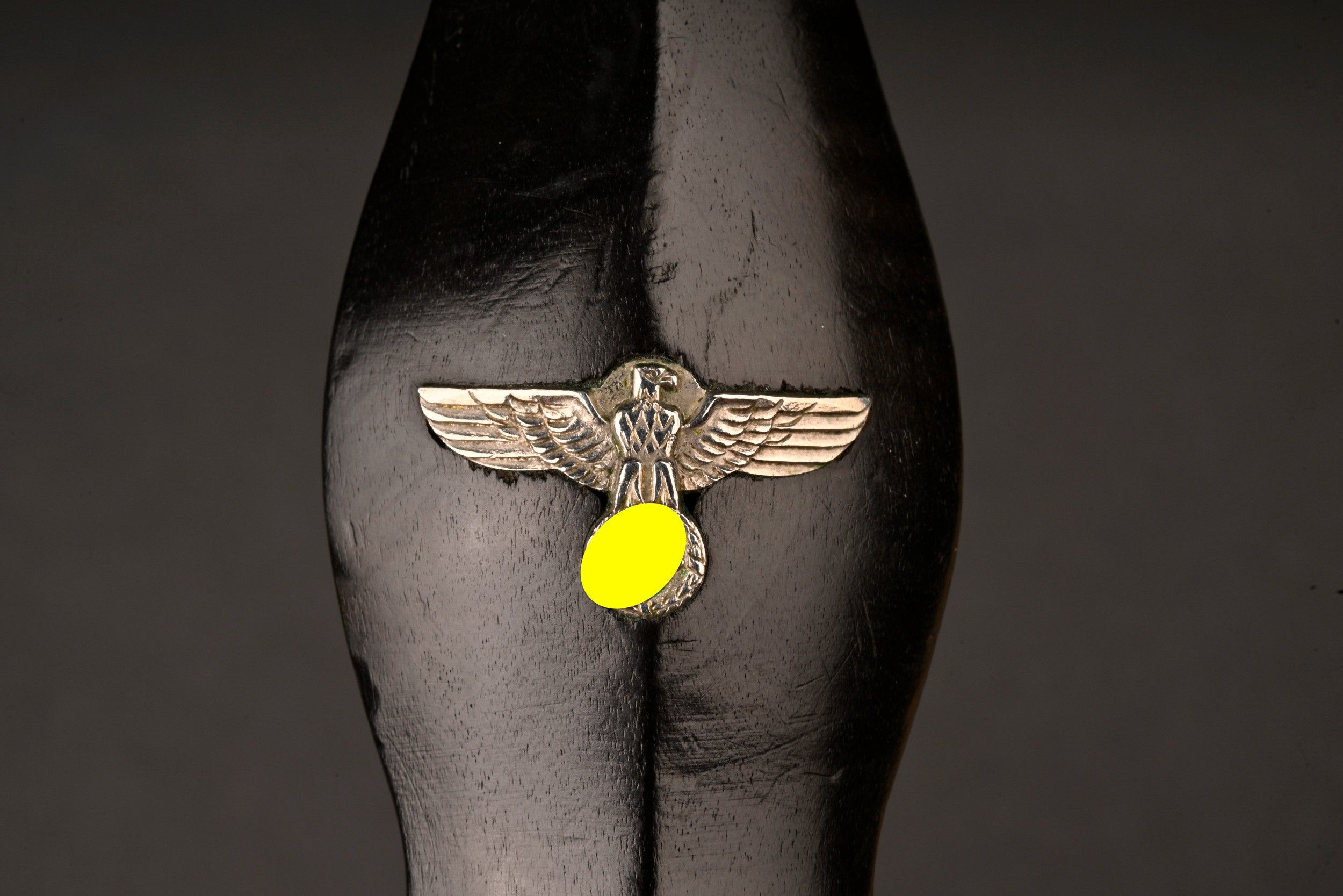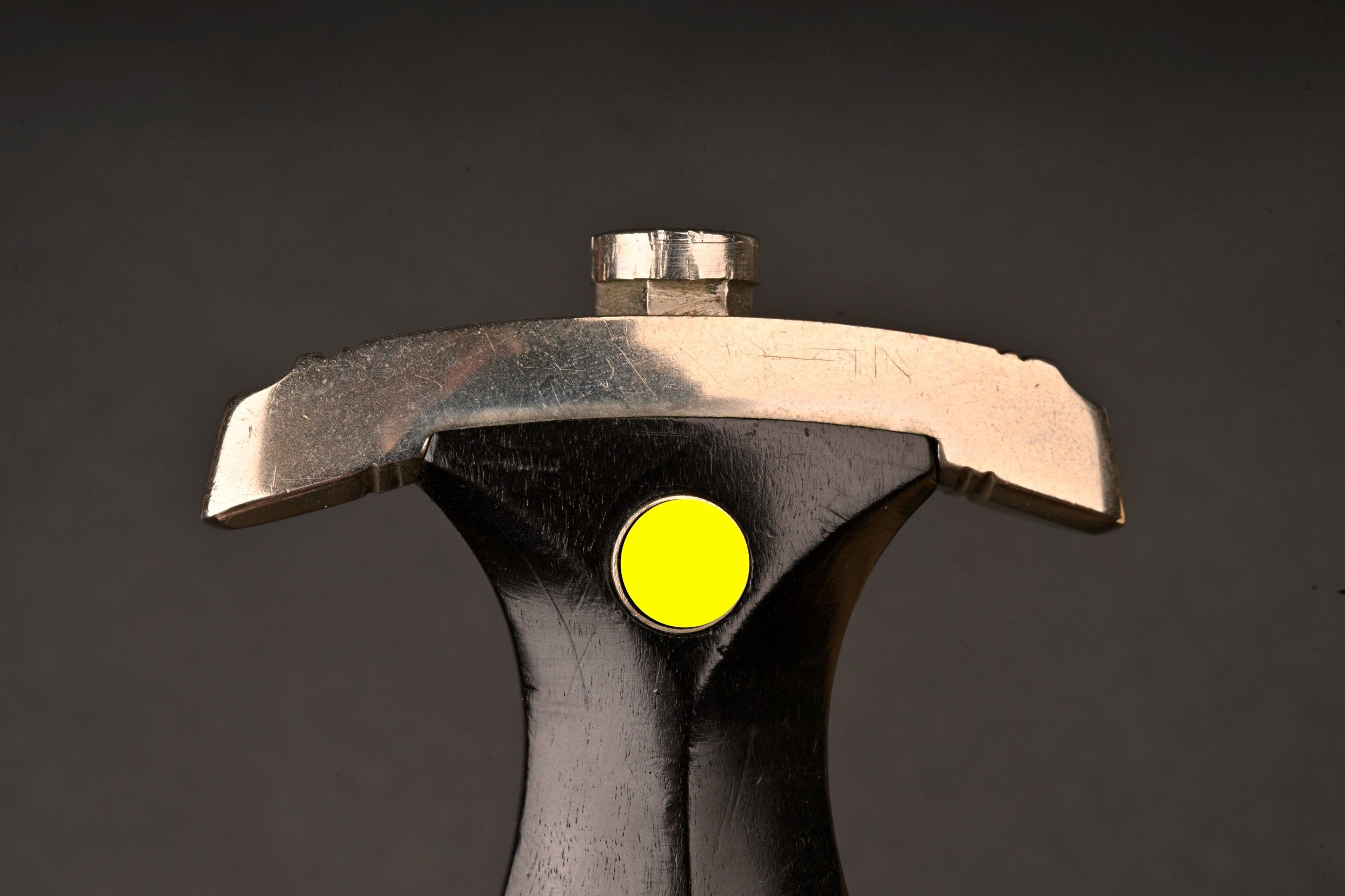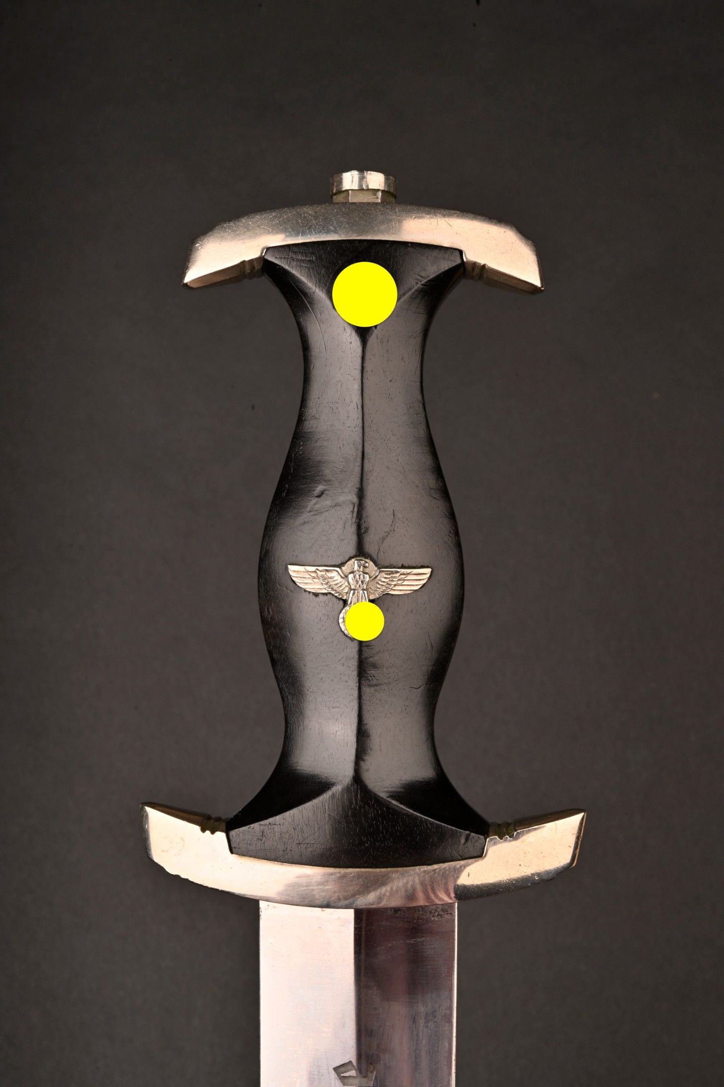 SS dagger model 1933 Gottlieb Hammesfahr. This is an early model, recognisable by its nickel silver fittings (dagger and scabbard) and the tanning that covers 98% of the scabbard. The fuse is virtually untouched and the Roman numeral III stamped on the back of the hilt indicates that this item passed through the SS control and distribution centre in Berlin. The blade is in very good condition with a fine engraving of the motto. A fine example of the early period. SS Dagger Model 1933 Gottlieb Hammesfahr Early production identified by nickel silver fittings on both dagger and scabbard and by the 98% intact blued scabbard finish. The grip shows almost no impact marks and the crossguard bears the Roman numeral III stamped on the reverse, indicating inspection through the SS control center in Berlin. The blade is in very good condition with a fine motto etching. An excellent representative example of early production.
