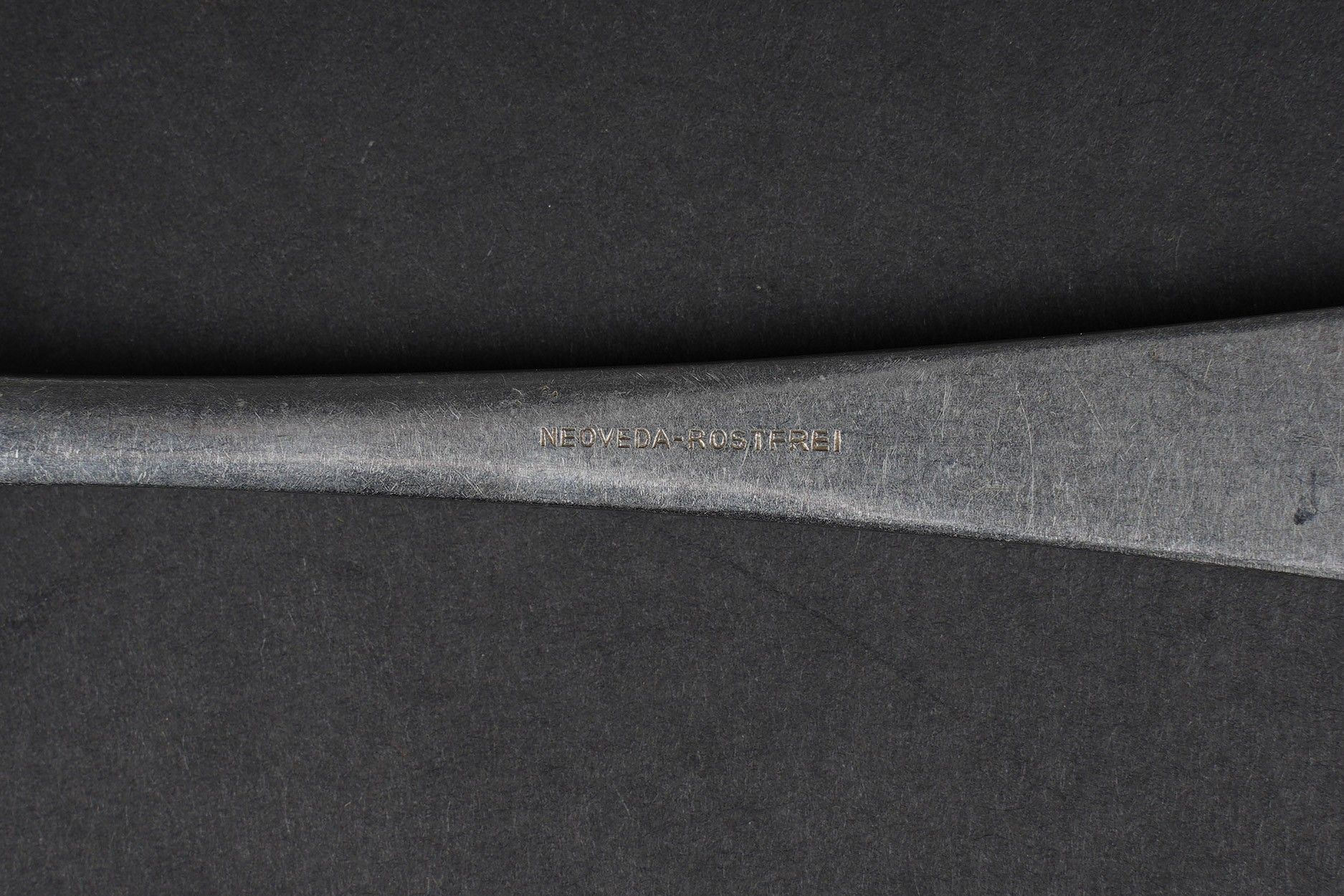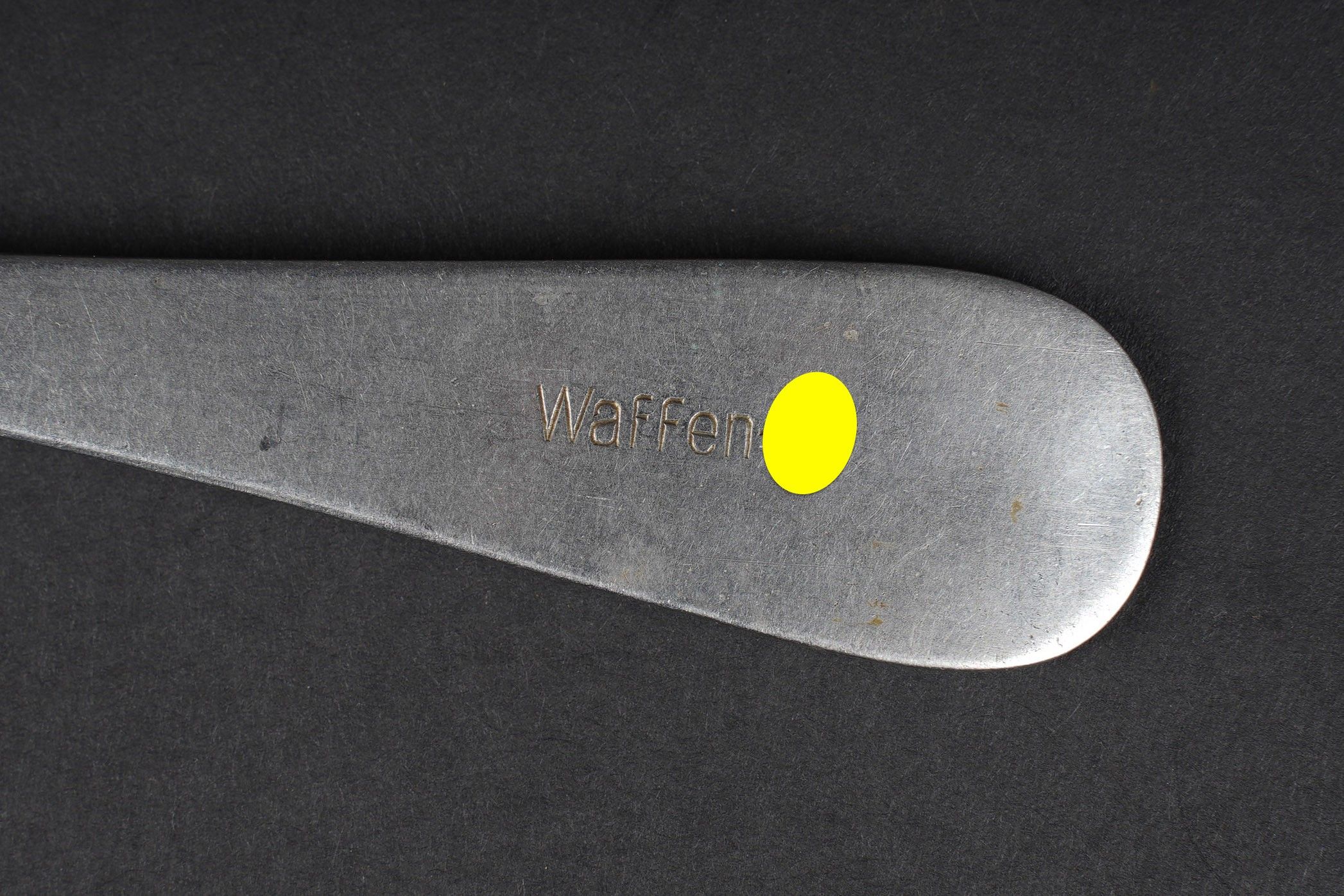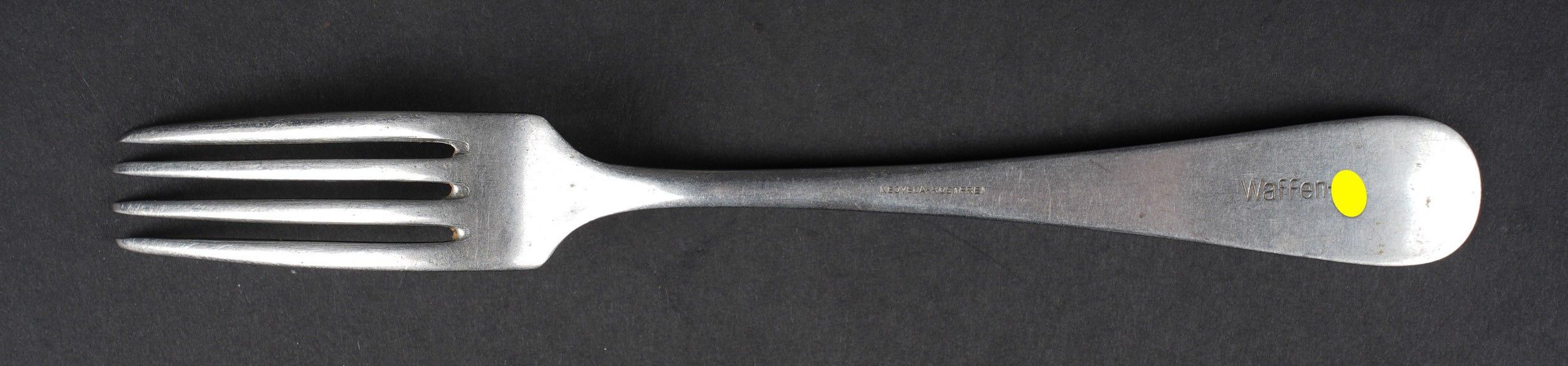 SS fork. Metal, Waffen SS markings. Made by Neoveda Rostfrei. To note a certain wear and patina of the part. Condition II+. SS Fork Made of metal marked Waffen SS. Maker Neoveda Rostfrei. Some wear and patina consistent with age. Condition II+.