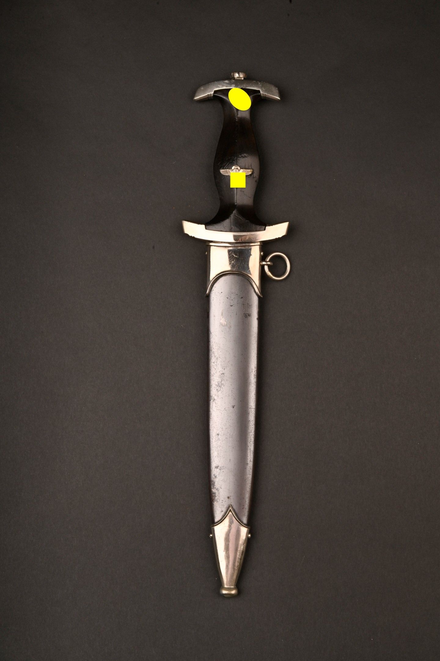 SS dagger model 1933 signed Röhm and partially erased Herder. This is another exceptional dagger but, unlike the previous example, the owner of this one has had a very light sanding operation carried out to remove Ernst Röhm's signature. In fact, the dedication remains in its entirety and the signature is still perfectly visible. One can guess that the owner was somewhat reluctant to remove Ernst Röhm's name. However, this procedure was not without its dangers at the time, as failure to comply with Himmler's directives could result in severe penalties, especially for a member of the Black Order. The fuse shows a few signs of tampering, attesting to the fact that this dagger was worn, even though it was dangerous for its owner's safety. The pastille at the top of the fuse with the double runes has a coppery appearance. This type of disc is generally found on daggers made from early cupro-nickel, which was originally covered with a layer of silver plating. This has disappeared with use over time. The hilt bears the Roman numeral II on the back, indicating that this example passed through the SS control and distribution centre in Dresden. The blade bears minor traces of oxidation, but this does not detract from the overall quality of the piece. The motto and dedication are in very good condition and only the signature is partly faded. This work appears to have been carried out by a professional. The maker's mark, Herder, is perfect. To date, only seven manufacturers are known to have produced these signed Ernst Röhm daggers, and Herder never used a small logo on this type of dagger. The scabbard retains 90% of its black tan and shows a few traces of oxidation. This type of dagger, still bearing Ernst Röhm's dedication with the signature barely erased, is very rarely encountered; more often than not, the signature is completely erased. This is an exceptional piece that is very difficult to find today. This dagger is featured on page 33 of the reference book L'ordre noir, Armes blanches, traditions et symbolique, published by Heimdal - 2023. SS Dagger Model 1933 Röhm Dedication Partially Erased Herder Another exceptional dagger but unlike the previous example the owner of this one had the Röhm signature lightly ground away. The dedication remains fully intact and the signature is still clearly visible. This suggests a certain hesitation by the owner to completely remove Ernst Röhm's name. Such partial erasure was not without risk at the time as failure to comply with Himmler's directives could result in severe punishment especially for a member of the Black Order. The grip shows light handling traces indicating the dagger was worn despite the danger it represented for its owner. The grip emblem with the double runes shows a coppery hue, typical of early production pieces made of cupro-nickel originally plated with silver, the plating having worn off over time. The crossguard bears the Roman numeral II stamped on the reverse indicating inspection through the SS control and distribution center in Dresden. The blade shows only light oxidation that does not affect the overall appearance. The motto and dedication are in very good condition with only the signature partially erased, a work that appears to have been professionally executed. The maker mark Herder is perfectly preserved. Only seven makers are known to have produced these Röhm dedication daggers and Herder never used the small logo on this type. The scabbard retains 90% of its black finish with some light oxidation. Daggers that still retain the Röhm dedication with only the signature partially erased are extremely rare since in most examples the entire inscription was removed. Exceptional and very hard to find today. This dagger is featured on page 33 of L'ordre noir, Armes blanches, traditions et symbolique, published by Heimdal in 2023.