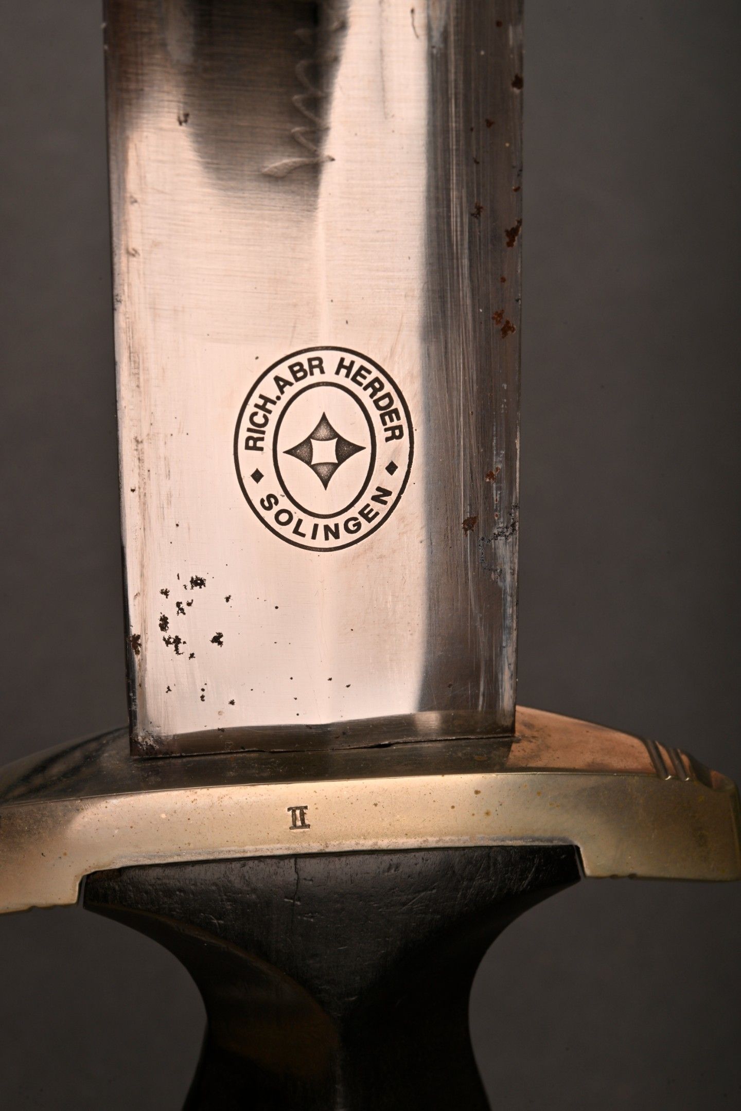 SS dagger model 1933 signed Röhm and partially erased Herder. This is another exceptional dagger but, unlike the previous example, the owner of this one has had a very light sanding operation carried out to remove Ernst Röhm's signature. In fact, the dedication remains in its entirety and the signature is still perfectly visible. One can guess that the owner was somewhat reluctant to remove Ernst Röhm's name. However, this procedure was not without its dangers at the time, as failure to comply with Himmler's directives could result in severe penalties, especially for a member of the Black Order. The fuse shows a few signs of tampering, attesting to the fact that this dagger was worn, even though it was dangerous for its owner's safety. The pastille at the top of the fuse with the double runes has a coppery appearance. This type of disc is generally found on daggers made from early cupro-nickel, which was originally covered with a layer of silver plating. This has disappeared with use over time. The hilt bears the Roman numeral II on the back, indicating that this example passed through the SS control and distribution centre in Dresden. The blade bears minor traces of oxidation, but this does not detract from the overall quality of the piece. The motto and dedication are in very good condition and only the signature is partly faded. This work appears to have been carried out by a professional. The maker's mark, Herder, is perfect. To date, only seven manufacturers are known to have produced these signed Ernst Röhm daggers, and Herder never used a small logo on this type of dagger. The scabbard retains 90% of its black tan and shows a few traces of oxidation. This type of dagger, still bearing Ernst Röhm's dedication with the signature barely erased, is very rarely encountered; more often than not, the signature is completely erased. This is an exceptional piece that is very difficult to find today. This dagger is featured on page 33 of the reference book L'ordre noir, Armes blanches, traditions et symbolique, published by Heimdal - 2023. SS Dagger Model 1933 Röhm Dedication Partially Erased Herder Another exceptional dagger but unlike the previous example the owner of this one had the Röhm signature lightly ground away. The dedication remains fully intact and the signature is still clearly visible. This suggests a certain hesitation by the owner to completely remove Ernst Röhm's name. Such partial erasure was not without risk at the time as failure to comply with Himmler's directives could result in severe punishment especially for a member of the Black Order. The grip shows light handling traces indicating the dagger was worn despite the danger it represented for its owner. The grip emblem with the double runes shows a coppery hue, typical of early production pieces made of cupro-nickel originally plated with silver, the plating having worn off over time. The crossguard bears the Roman numeral II stamped on the reverse indicating inspection through the SS control and distribution center in Dresden. The blade shows only light oxidation that does not affect the overall appearance. The motto and dedication are in very good condition with only the signature partially erased, a work that appears to have been professionally executed. The maker mark Herder is perfectly preserved. Only seven makers are known to have produced these Röhm dedication daggers and Herder never used the small logo on this type. The scabbard retains 90% of its black finish with some light oxidation. Daggers that still retain the Röhm dedication with only the signature partially erased are extremely rare since in most examples the entire inscription was removed. Exceptional and very hard to find today. This dagger is featured on page 33 of L'ordre noir, Armes blanches, traditions et symbolique, published by Heimdal in 2023.