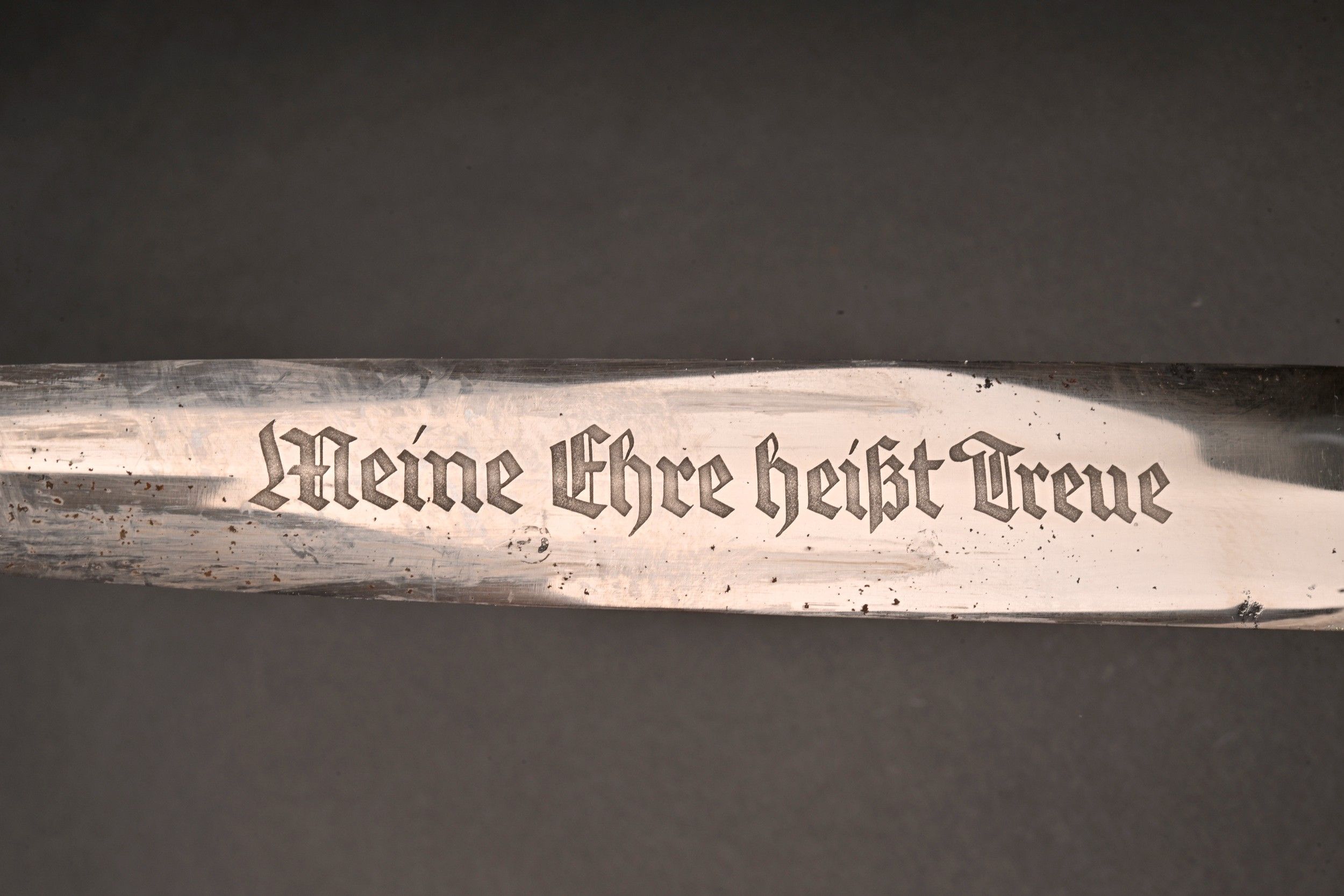 SS dagger model 1933 signed Röhm and partially erased Herder. This is another exceptional dagger but, unlike the previous example, the owner of this one has had a very light sanding operation carried out to remove Ernst Röhm's signature. In fact, the dedication remains in its entirety and the signature is still perfectly visible. One can guess that the owner was somewhat reluctant to remove Ernst Röhm's name. However, this procedure was not without its dangers at the time, as failure to comply with Himmler's directives could result in severe penalties, especially for a member of the Black Order. The fuse shows a few signs of tampering, attesting to the fact that this dagger was worn, even though it was dangerous for its owner's safety. The pastille at the top of the fuse with the double runes has a coppery appearance. This type of disc is generally found on daggers made from early cupro-nickel, which was originally covered with a layer of silver plating. This has disappeared with use over time. The hilt bears the Roman numeral II on the back, indicating that this example passed through the SS control and distribution centre in Dresden. The blade bears minor traces of oxidation, but this does not detract from the overall quality of the piece. The motto and dedication are in very good condition and only the signature is partly faded. This work appears to have been carried out by a professional. The maker's mark, Herder, is perfect. To date, only seven manufacturers are known to have produced these signed Ernst Röhm daggers, and Herder never used a small logo on this type of dagger. The scabbard retains 90% of its black tan and shows a few traces of oxidation. This type of dagger, still bearing Ernst Röhm's dedication with the signature barely erased, is very rarely encountered; more often than not, the signature is completely erased. This is an exceptional piece that is very difficult to find today. This dagger is featured on page 33 of the reference book L'ordre noir, Armes blanches, traditions et symbolique, published by Heimdal - 2023. SS Dagger Model 1933 Röhm Dedication Partially Erased Herder Another exceptional dagger but unlike the previous example the owner of this one had the Röhm signature lightly ground away. The dedication remains fully intact and the signature is still clearly visible. This suggests a certain hesitation by the owner to completely remove Ernst Röhm's name. Such partial erasure was not without risk at the time as failure to comply with Himmler's directives could result in severe punishment especially for a member of the Black Order. The grip shows light handling traces indicating the dagger was worn despite the danger it represented for its owner. The grip emblem with the double runes shows a coppery hue, typical of early production pieces made of cupro-nickel originally plated with silver, the plating having worn off over time. The crossguard bears the Roman numeral II stamped on the reverse indicating inspection through the SS control and distribution center in Dresden. The blade shows only light oxidation that does not affect the overall appearance. The motto and dedication are in very good condition with only the signature partially erased, a work that appears to have been professionally executed. The maker mark Herder is perfectly preserved. Only seven makers are known to have produced these Röhm dedication daggers and Herder never used the small logo on this type. The scabbard retains 90% of its black finish with some light oxidation. Daggers that still retain the Röhm dedication with only the signature partially erased are extremely rare since in most examples the entire inscription was removed. Exceptional and very hard to find today. This dagger is featured on page 33 of L'ordre noir, Armes blanches, traditions et symbolique, published by Heimdal in 2023.
