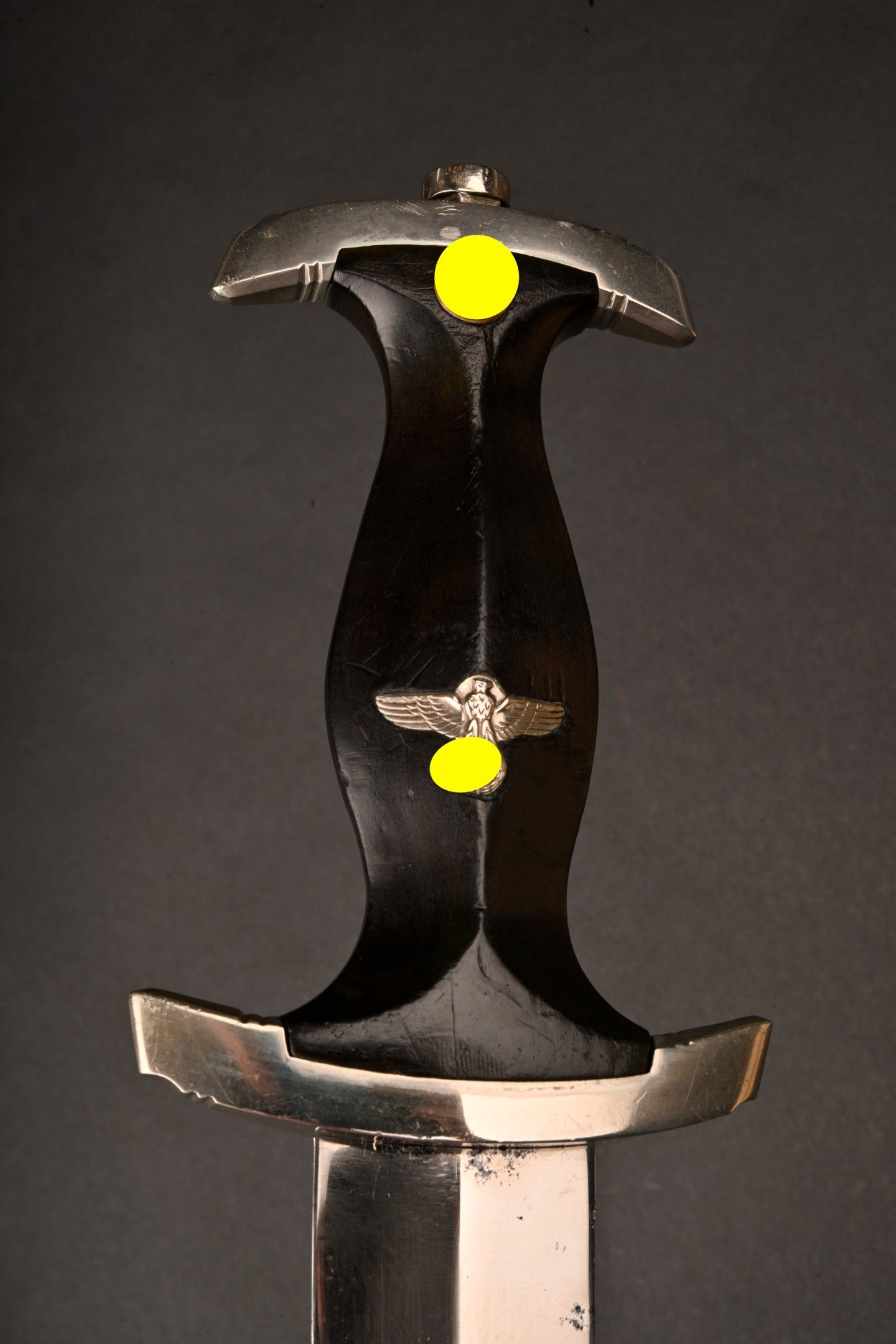 SS dagger model 1933 signed Röhm and partially erased Herder. This is another exceptional dagger but, unlike the previous example, the owner of this one has had a very light sanding operation carried out to remove Ernst Röhm's signature. In fact, the dedication remains in its entirety and the signature is still perfectly visible. One can guess that the owner was somewhat reluctant to remove Ernst Röhm's name. However, this procedure was not without its dangers at the time, as failure to comply with Himmler's directives could result in severe penalties, especially for a member of the Black Order. The fuse shows a few signs of tampering, attesting to the fact that this dagger was worn, even though it was dangerous for its owner's safety. The pastille at the top of the fuse with the double runes has a coppery appearance. This type of disc is generally found on daggers made from early cupro-nickel, which was originally covered with a layer of silver plating. This has disappeared with use over time. The hilt bears the Roman numeral II on the back, indicating that this example passed through the SS control and distribution centre in Dresden. The blade bears minor traces of oxidation, but this does not detract from the overall quality of the piece. The motto and dedication are in very good condition and only the signature is partly faded. This work appears to have been carried out by a professional. The maker's mark, Herder, is perfect. To date, only seven manufacturers are known to have produced these signed Ernst Röhm daggers, and Herder never used a small logo on this type of dagger. The scabbard retains 90% of its black tan and shows a few traces of oxidation. This type of dagger, still bearing Ernst Röhm's dedication with the signature barely erased, is very rarely encountered; more often than not, the signature is completely erased. This is an exceptional piece that is very difficult to find today. This dagger is featured on page 33 of the reference book L'ordre noir, Armes blanches, traditions et symbolique, published by Heimdal - 2023. SS Dagger Model 1933 Röhm Dedication Partially Erased Herder Another exceptional dagger but unlike the previous example the owner of this one had the Röhm signature lightly ground away. The dedication remains fully intact and the signature is still clearly visible. This suggests a certain hesitation by the owner to completely remove Ernst Röhm's name. Such partial erasure was not without risk at the time as failure to comply with Himmler's directives could result in severe punishment especially for a member of the Black Order. The grip shows light handling traces indicating the dagger was worn despite the danger it represented for its owner. The grip emblem with the double runes shows a coppery hue, typical of early production pieces made of cupro-nickel originally plated with silver, the plating having worn off over time. The crossguard bears the Roman numeral II stamped on the reverse indicating inspection through the SS control and distribution center in Dresden. The blade shows only light oxidation that does not affect the overall appearance. The motto and dedication are in very good condition with only the signature partially erased, a work that appears to have been professionally executed. The maker mark Herder is perfectly preserved. Only seven makers are known to have produced these Röhm dedication daggers and Herder never used the small logo on this type. The scabbard retains 90% of its black finish with some light oxidation. Daggers that still retain the Röhm dedication with only the signature partially erased are extremely rare since in most examples the entire inscription was removed. Exceptional and very hard to find today. This dagger is featured on page 33 of L'ordre noir, Armes blanches, traditions et symbolique, published by Heimdal in 2023.
