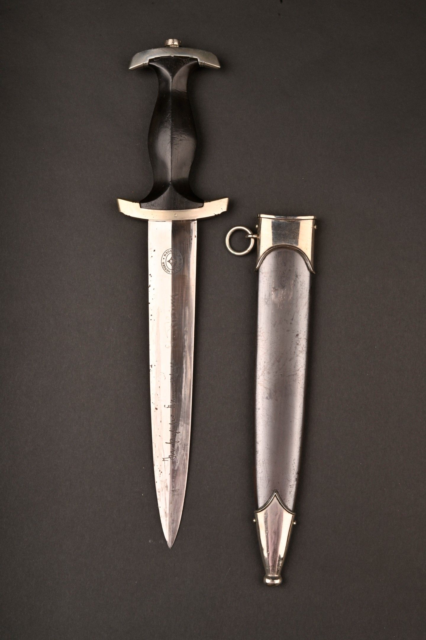 SS dagger model 1933 signed Röhm and partially erased Herder. This is another exceptional dagger but, unlike the previous example, the owner of this one has had a very light sanding operation carried out to remove Ernst Röhm's signature. In fact, the dedication remains in its entirety and the signature is still perfectly visible. One can guess that the owner was somewhat reluctant to remove Ernst Röhm's name. However, this procedure was not without its dangers at the time, as failure to comply with Himmler's directives could result in severe penalties, especially for a member of the Black Order. The fuse shows a few signs of tampering, attesting to the fact that this dagger was worn, even though it was dangerous for its owner's safety. The pastille at the top of the fuse with the double runes has a coppery appearance. This type of disc is generally found on daggers made from early cupro-nickel, which was originally covered with a layer of silver plating. This has disappeared with use over time. The hilt bears the Roman numeral II on the back, indicating that this example passed through the SS control and distribution centre in Dresden. The blade bears minor traces of oxidation, but this does not detract from the overall quality of the piece. The motto and dedication are in very good condition and only the signature is partly faded. This work appears to have been carried out by a professional. The maker's mark, Herder, is perfect. To date, only seven manufacturers are known to have produced these signed Ernst Röhm daggers, and Herder never used a small logo on this type of dagger. The scabbard retains 90% of its black tan and shows a few traces of oxidation. This type of dagger, still bearing Ernst Röhm's dedication with the signature barely erased, is very rarely encountered; more often than not, the signature is completely erased. This is an exceptional piece that is very difficult to find today. This dagger is featured on page 33 of the reference book L'ordre noir, Armes blanches, traditions et symbolique, published by Heimdal - 2023. SS Dagger Model 1933 Röhm Dedication Partially Erased Herder Another exceptional dagger but unlike the previous example the owner of this one had the Röhm signature lightly ground away. The dedication remains fully intact and the signature is still clearly visible. This suggests a certain hesitation by the owner to completely remove Ernst Röhm's name. Such partial erasure was not without risk at the time as failure to comply with Himmler's directives could result in severe punishment especially for a member of the Black Order. The grip shows light handling traces indicating the dagger was worn despite the danger it represented for its owner. The grip emblem with the double runes shows a coppery hue, typical of early production pieces made of cupro-nickel originally plated with silver, the plating having worn off over time. The crossguard bears the Roman numeral II stamped on the reverse indicating inspection through the SS control and distribution center in Dresden. The blade shows only light oxidation that does not affect the overall appearance. The motto and dedication are in very good condition with only the signature partially erased, a work that appears to have been professionally executed. The maker mark Herder is perfectly preserved. Only seven makers are known to have produced these Röhm dedication daggers and Herder never used the small logo on this type. The scabbard retains 90% of its black finish with some light oxidation. Daggers that still retain the Röhm dedication with only the signature partially erased are extremely rare since in most examples the entire inscription was removed. Exceptional and very hard to find today. This dagger is featured on page 33 of L'ordre noir, Armes blanches, traditions et symbolique, published by Heimdal in 2023.
