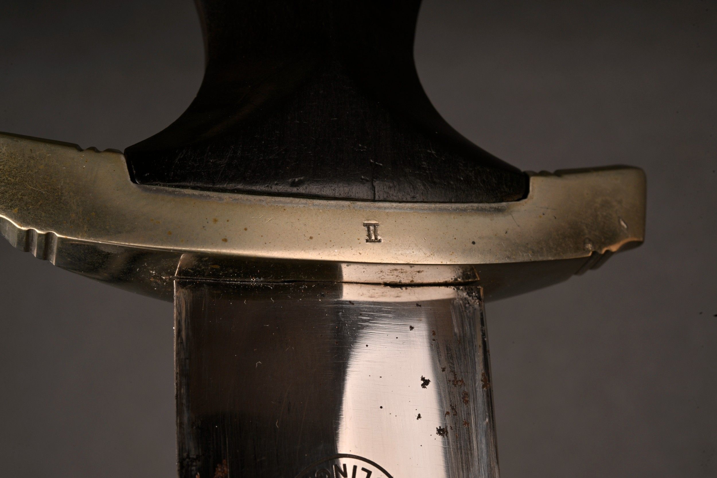 SS dagger model 1933 signed Röhm and partially erased Herder. This is another exceptional dagger but, unlike the previous example, the owner of this one has had a very light sanding operation carried out to remove Ernst Röhm's signature. In fact, the dedication remains in its entirety and the signature is still perfectly visible. One can guess that the owner was somewhat reluctant to remove Ernst Röhm's name. However, this procedure was not without its dangers at the time, as failure to comply with Himmler's directives could result in severe penalties, especially for a member of the Black Order. The fuse shows a few signs of tampering, attesting to the fact that this dagger was worn, even though it was dangerous for its owner's safety. The pastille at the top of the fuse with the double runes has a coppery appearance. This type of disc is generally found on daggers made from early cupro-nickel, which was originally covered with a layer of silver plating. This has disappeared with use over time. The hilt bears the Roman numeral II on the back, indicating that this example passed through the SS control and distribution centre in Dresden. The blade bears minor traces of oxidation, but this does not detract from the overall quality of the piece. The motto and dedication are in very good condition and only the signature is partly faded. This work appears to have been carried out by a professional. The maker's mark, Herder, is perfect. To date, only seven manufacturers are known to have produced these signed Ernst Röhm daggers, and Herder never used a small logo on this type of dagger. The scabbard retains 90% of its black tan and shows a few traces of oxidation. This type of dagger, still bearing Ernst Röhm's dedication with the signature barely erased, is very rarely encountered; more often than not, the signature is completely erased. This is an exceptional piece that is very difficult to find today. This dagger is featured on page 33 of the reference book L'ordre noir, Armes blanches, traditions et symbolique, published by Heimdal - 2023. SS Dagger Model 1933 Röhm Dedication Partially Erased Herder Another exceptional dagger but unlike the previous example the owner of this one had the Röhm signature lightly ground away. The dedication remains fully intact and the signature is still clearly visible. This suggests a certain hesitation by the owner to completely remove Ernst Röhm's name. Such partial erasure was not without risk at the time as failure to comply with Himmler's directives could result in severe punishment especially for a member of the Black Order. The grip shows light handling traces indicating the dagger was worn despite the danger it represented for its owner. The grip emblem with the double runes shows a coppery hue, typical of early production pieces made of cupro-nickel originally plated with silver, the plating having worn off over time. The crossguard bears the Roman numeral II stamped on the reverse indicating inspection through the SS control and distribution center in Dresden. The blade shows only light oxidation that does not affect the overall appearance. The motto and dedication are in very good condition with only the signature partially erased, a work that appears to have been professionally executed. The maker mark Herder is perfectly preserved. Only seven makers are known to have produced these Röhm dedication daggers and Herder never used the small logo on this type. The scabbard retains 90% of its black finish with some light oxidation. Daggers that still retain the Röhm dedication with only the signature partially erased are extremely rare since in most examples the entire inscription was removed. Exceptional and very hard to find today. This dagger is featured on page 33 of L'ordre noir, Armes blanches, traditions et symbolique, published by Heimdal in 2023.
