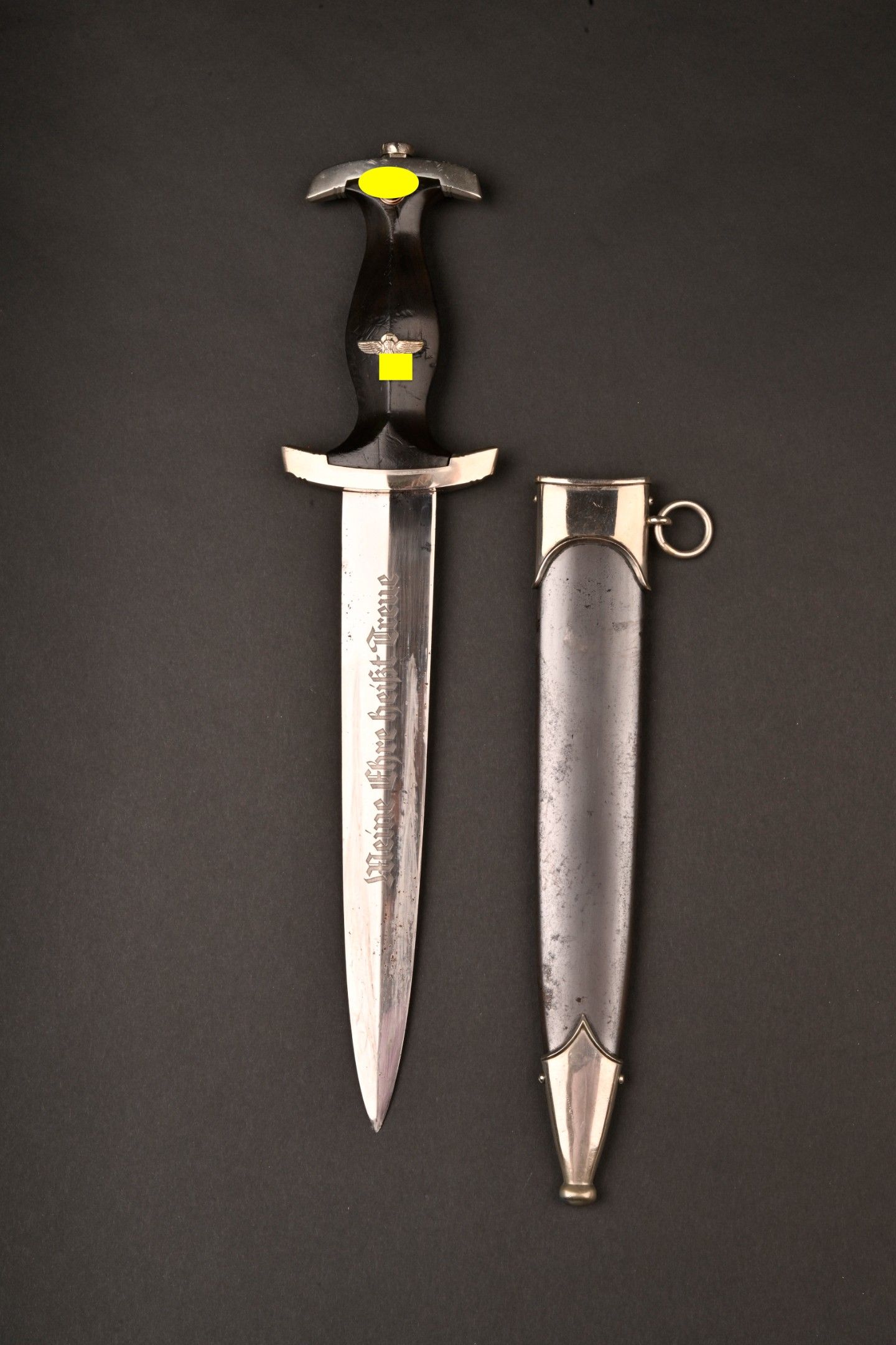 SS dagger model 1933 signed Röhm and partially erased Herder. This is another exceptional dagger but, unlike the previous example, the owner of this one has had a very light sanding operation carried out to remove Ernst Röhm's signature. In fact, the dedication remains in its entirety and the signature is still perfectly visible. One can guess that the owner was somewhat reluctant to remove Ernst Röhm's name. However, this procedure was not without its dangers at the time, as failure to comply with Himmler's directives could result in severe penalties, especially for a member of the Black Order. The fuse shows a few signs of tampering, attesting to the fact that this dagger was worn, even though it was dangerous for its owner's safety. The pastille at the top of the fuse with the double runes has a coppery appearance. This type of disc is generally found on daggers made from early cupro-nickel, which was originally covered with a layer of silver plating. This has disappeared with use over time. The hilt bears the Roman numeral II on the back, indicating that this example passed through the SS control and distribution centre in Dresden. The blade bears minor traces of oxidation, but this does not detract from the overall quality of the piece. The motto and dedication are in very good condition and only the signature is partly faded. This work appears to have been carried out by a professional. The maker's mark, Herder, is perfect. To date, only seven manufacturers are known to have produced these signed Ernst Röhm daggers, and Herder never used a small logo on this type of dagger. The scabbard retains 90% of its black tan and shows a few traces of oxidation. This type of dagger, still bearing Ernst Röhm's dedication with the signature barely erased, is very rarely encountered; more often than not, the signature is completely erased. This is an exceptional piece that is very difficult to find today. This dagger is featured on page 33 of the reference book L'ordre noir, Armes blanches, traditions et symbolique, published by Heimdal - 2023. SS Dagger Model 1933 Röhm Dedication Partially Erased Herder Another exceptional dagger but unlike the previous example the owner of this one had the Röhm signature lightly ground away. The dedication remains fully intact and the signature is still clearly visible. This suggests a certain hesitation by the owner to completely remove Ernst Röhm's name. Such partial erasure was not without risk at the time as failure to comply with Himmler's directives could result in severe punishment especially for a member of the Black Order. The grip shows light handling traces indicating the dagger was worn despite the danger it represented for its owner. The grip emblem with the double runes shows a coppery hue, typical of early production pieces made of cupro-nickel originally plated with silver, the plating having worn off over time. The crossguard bears the Roman numeral II stamped on the reverse indicating inspection through the SS control and distribution center in Dresden. The blade shows only light oxidation that does not affect the overall appearance. The motto and dedication are in very good condition with only the signature partially erased, a work that appears to have been professionally executed. The maker mark Herder is perfectly preserved. Only seven makers are known to have produced these Röhm dedication daggers and Herder never used the small logo on this type. The scabbard retains 90% of its black finish with some light oxidation. Daggers that still retain the Röhm dedication with only the signature partially erased are extremely rare since in most examples the entire inscription was removed. Exceptional and very hard to find today. This dagger is featured on page 33 of L'ordre noir, Armes blanches, traditions et symbolique, published by Heimdal in 2023.