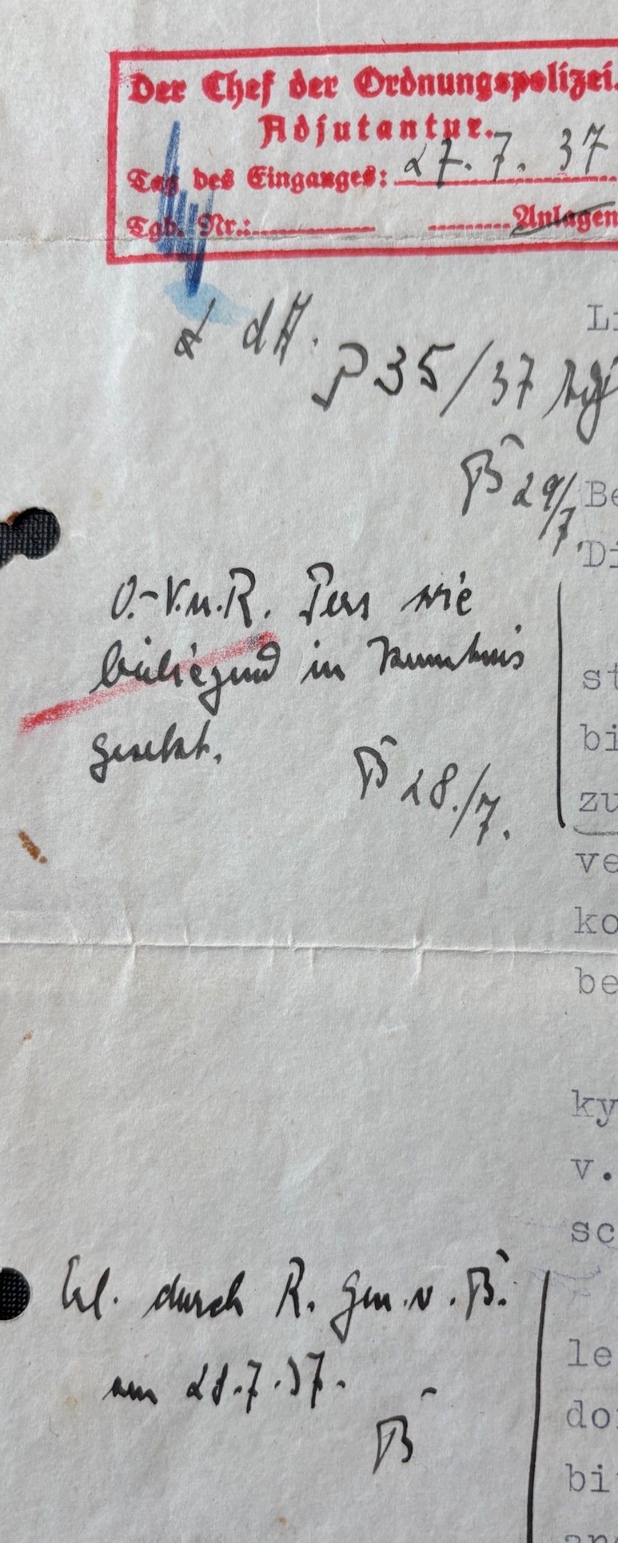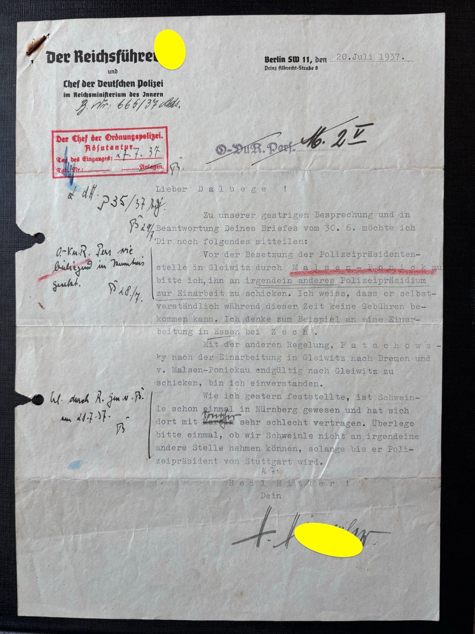 Document signed by the Chief of the German Police. Typed letter from the Reichsführer SS und Chef Der Deutschen Polizei, dated 20 July 1937. The letter is translated as follows. Dear Daluege, following our meeting yesterday and in reply to your letter of 30 June, I wish to inform you of the following. Before Malsen Ponickau takes over as chairman of the Gleiwitz police, I would ask you to temporarily send Matern to another police presidium for training. I am well aware that during this period he will naturally not be able to receive any allowances. I'm thinking, for example, of a training period in Essen near Zech. As for the other arrangement, i.e. to send Patschky after his training at Gleiwitz to Bremen and, once Malsen Ponickau has settled permanently at Gleiwitz, to assign him there permanently, I agree. As I found out yesterday, Schweinle has already been to Nuremberg once and got on very badly with Martin there. Please consider whether we can't reassign Schweinle to another post until such time as he becomes chairman of the Stuttgart police force. Autograph signature of the chief of police and numerous annotations in pen. A few tears at the edges, at the level of the perforations. Some wear and patina. Condition II+. Document signed by Reichsführer and Police chief. Typed letter issued by the Reichsführer-SS und Chef der Deutschen Polizei dated 20 July 1937. The letter is translated as follows: Dear Daluege following our meeting yesterday and in response to your letter of 30 June I wish to inform you of the following. Before Malsen-Ponickau assumes office as Police President of Gleiwitz please temporarily assign Matern to another police presidium to receive training there. I am aware that during this period he will naturally not be able to receive any allowances. I am thinking for example of a training period in Essen near Zech. Concerning the other arrangement that is to send Patschky after his training in Gleiwitz to Bremen and once Malsen-Ponickau is permanently established in Gleiwitz to assign him there definitively I agree. As I noted yesterday Schweinle has already once been in Nuremberg and did not get along well with Martin there. Consider whether we could assign Schweinle to another post until he becomes Police President of Stuttgart. Hand-signed by the Police chief with numerous handwritten annotations. Some tears along the edges at the perforations. Some wear and patina visible. Condition II+
