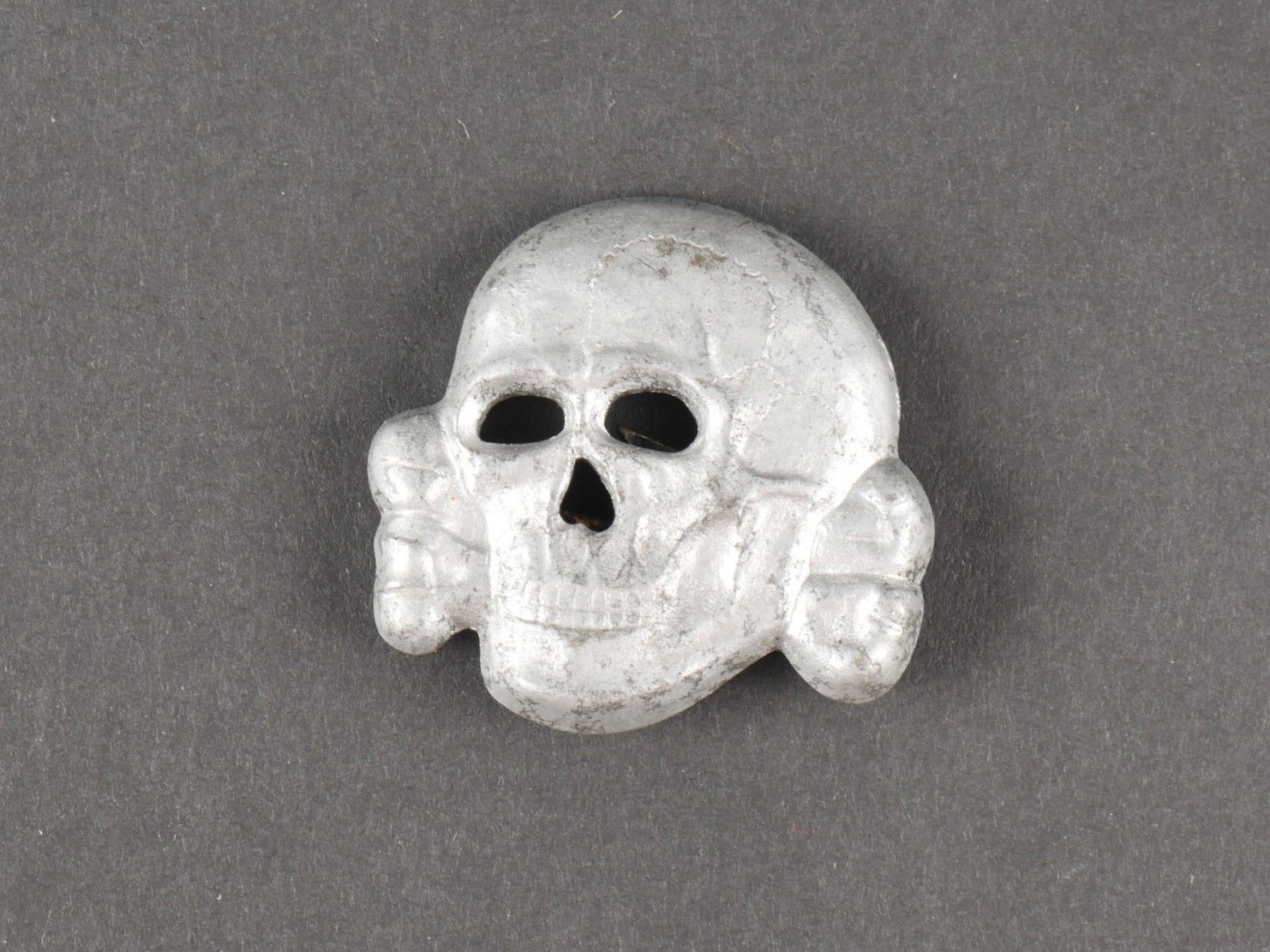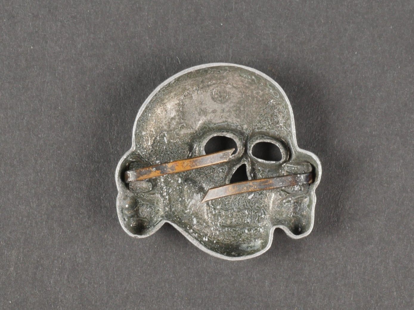 SS skull and crossbones. Metal, 60% silver. The straps are complete. RZM markings illegible. Some wear and patina. Condition II+. SS Skull Made of metal with about 60% of its silver finish remaining. Attachment prongs complete. RZM markings illegible. Some wear and patina consistent with age. Condition II+.