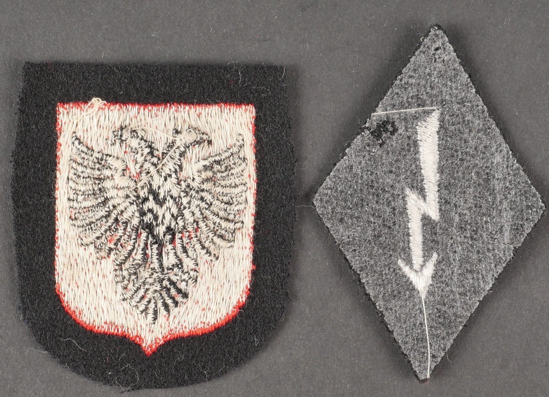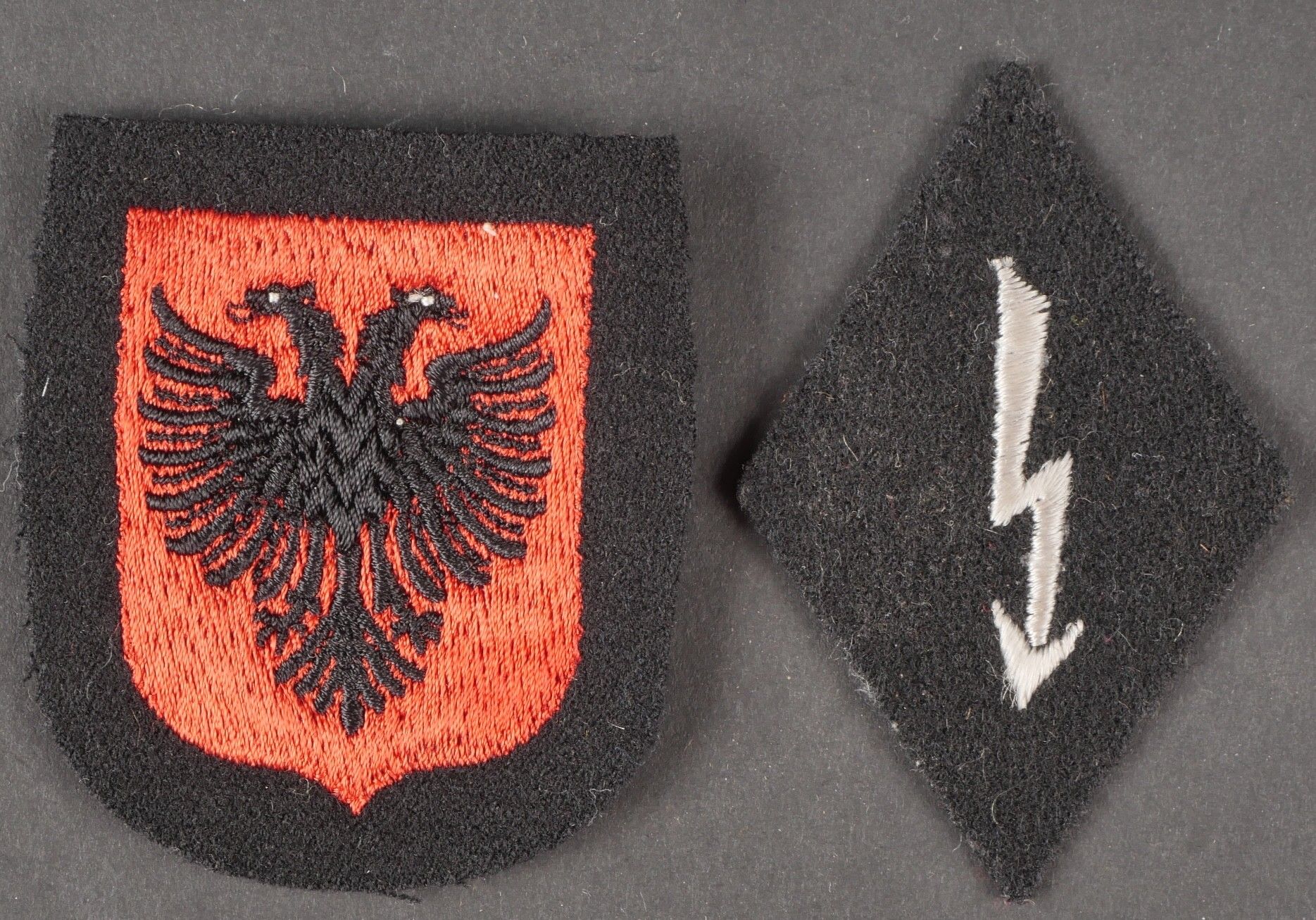 Badge for Albanian volunteers in the Waffen SS. Embroidered sleeve badge on black background, never mounted on a jacket. SS radio speciality badge, black background, grey back. Never mounted. Some wear and patina to be noted. Condition II+. Albanian Volunteers Insignia in the Waffen SS Sleeve insignia embroidered on black background never mounted on a tunic. Also includes an SS radio specialty insignia on black cloth with grey reverse. Both pieces show light wear and patina consistent with age. Condition II+.