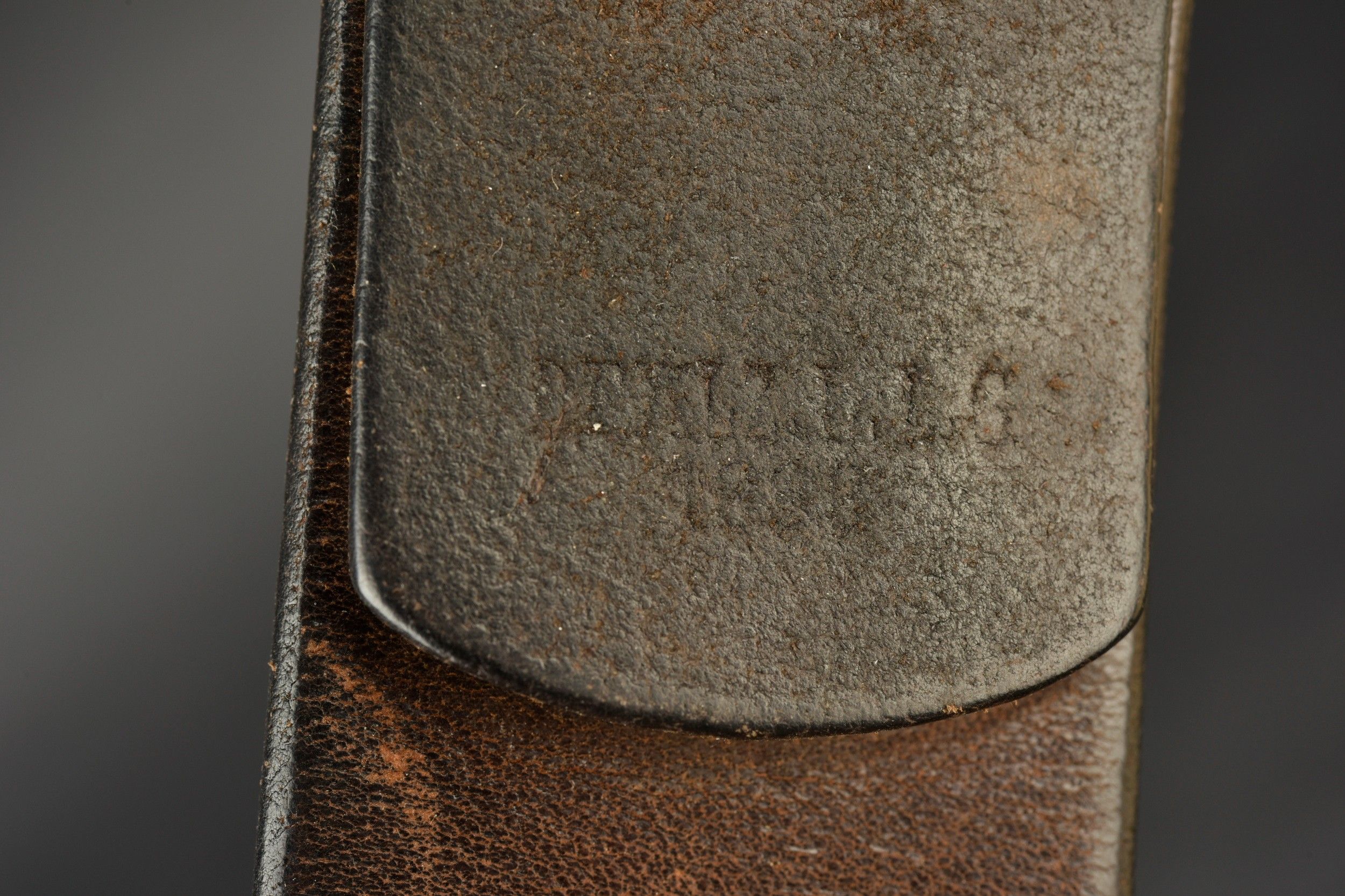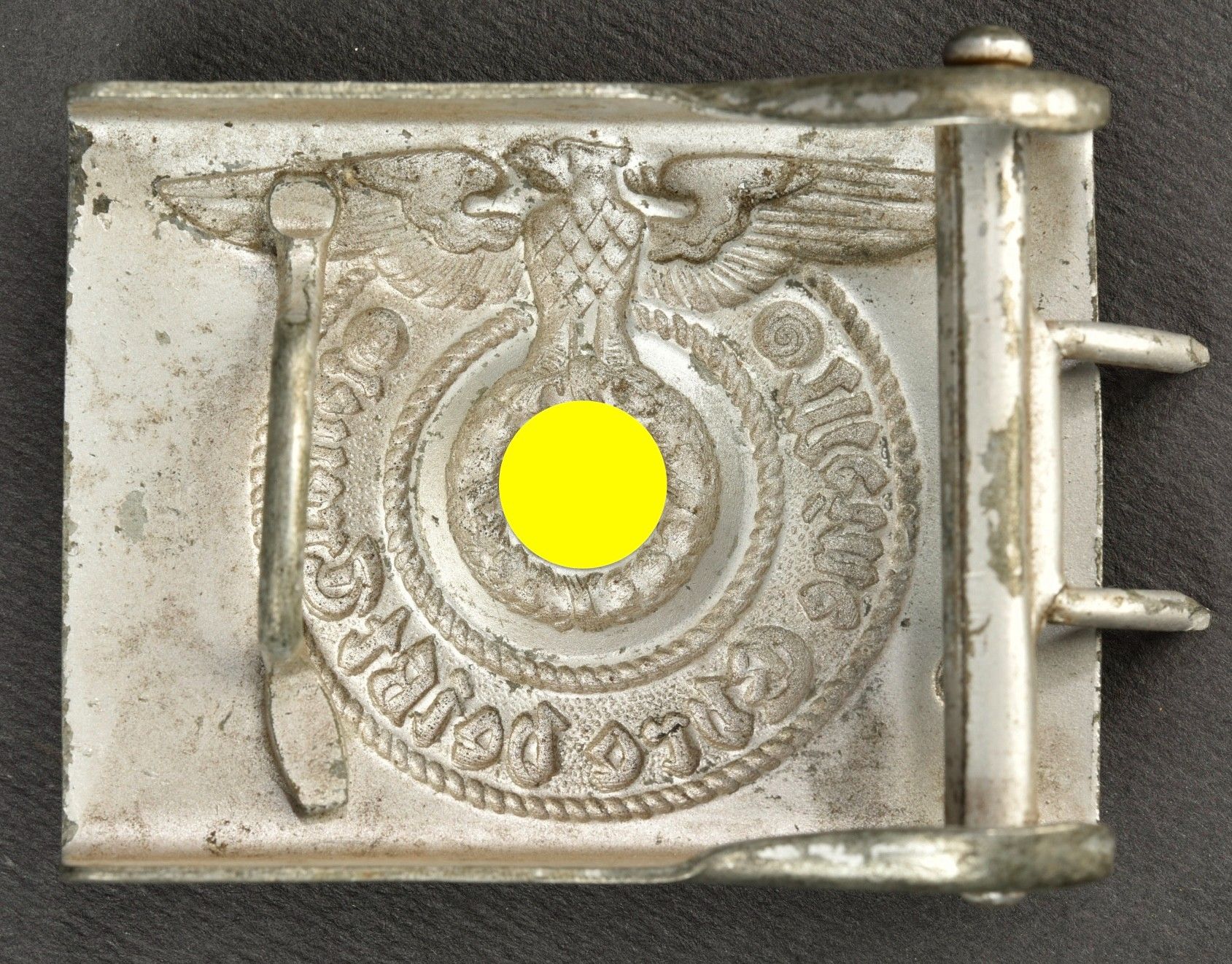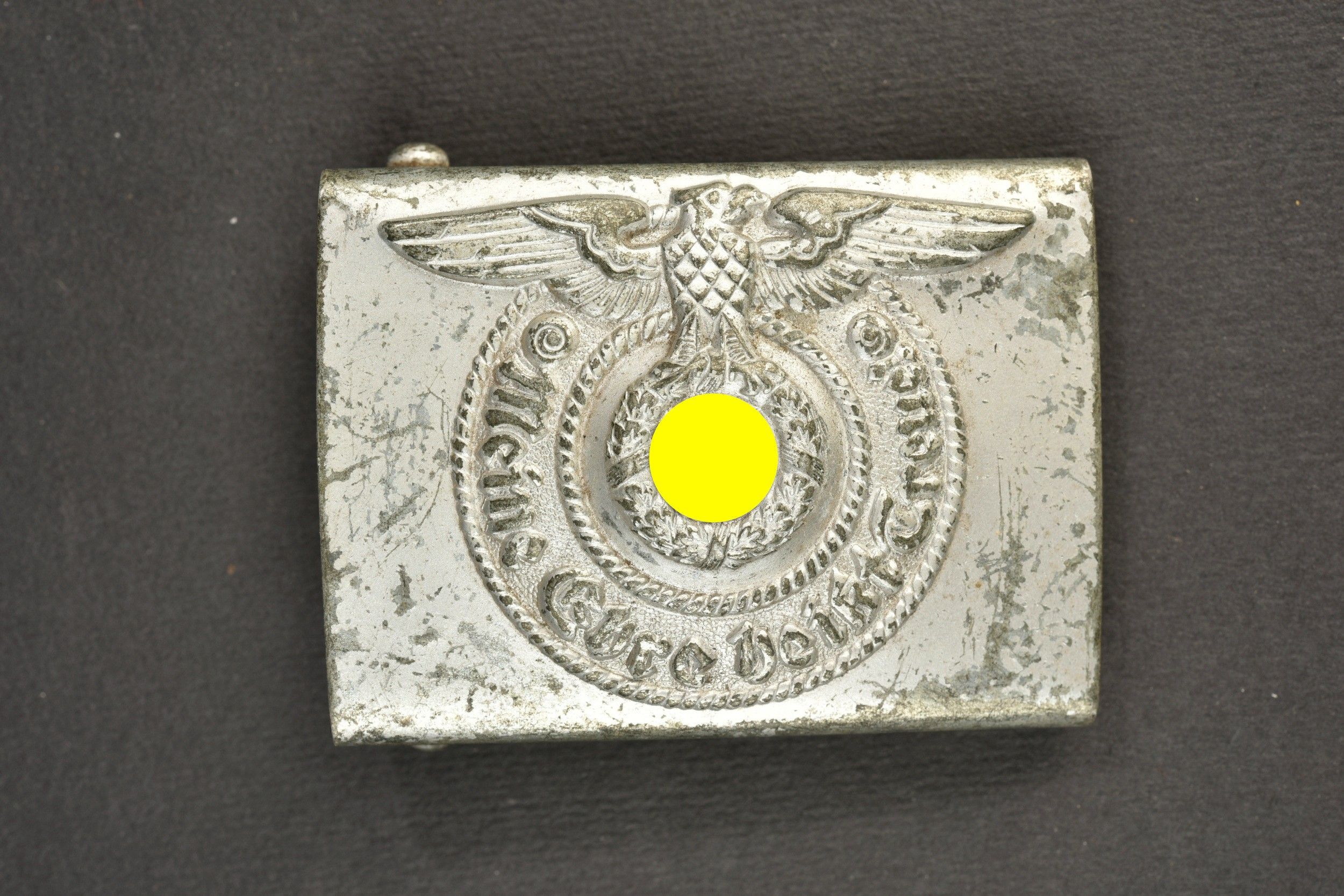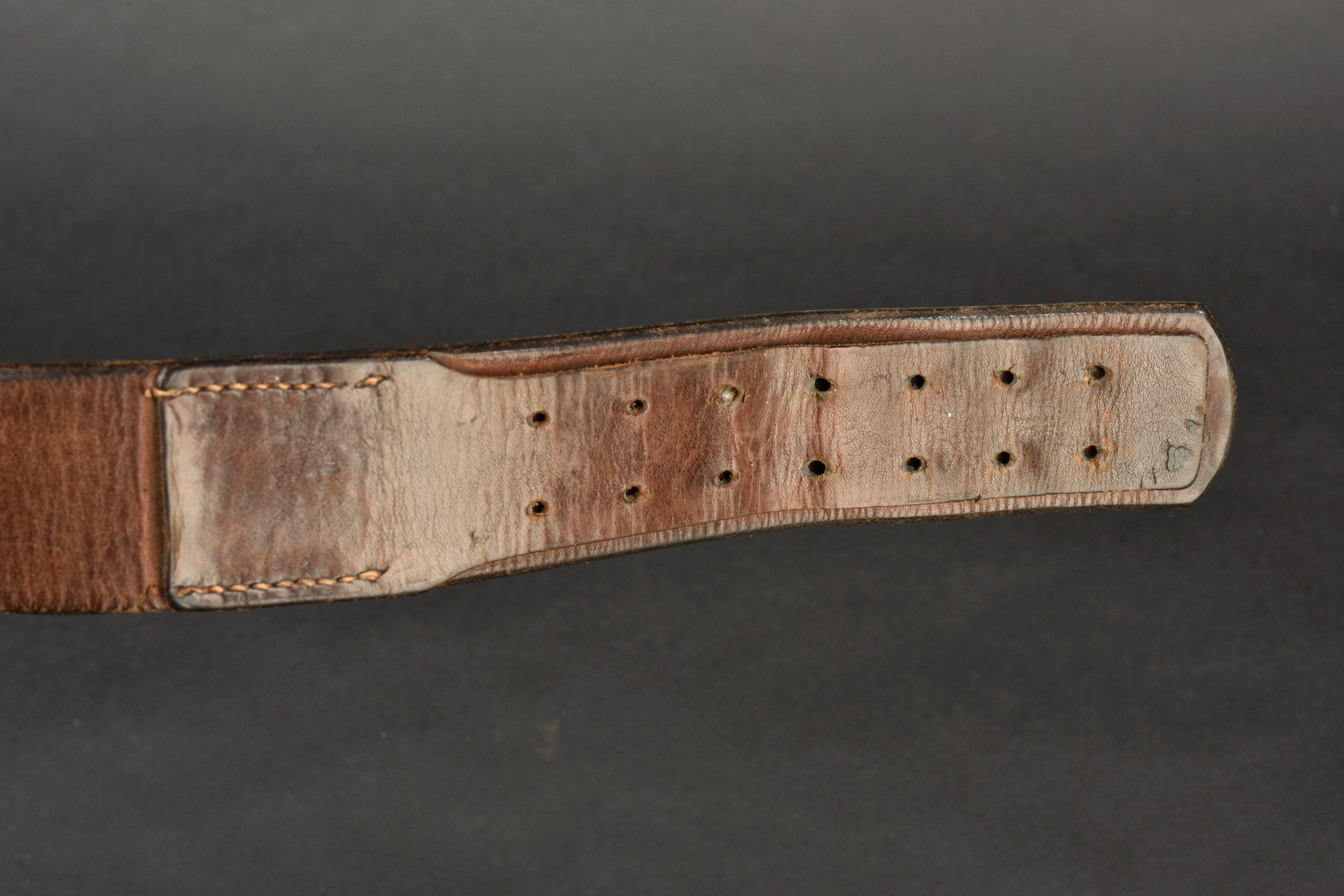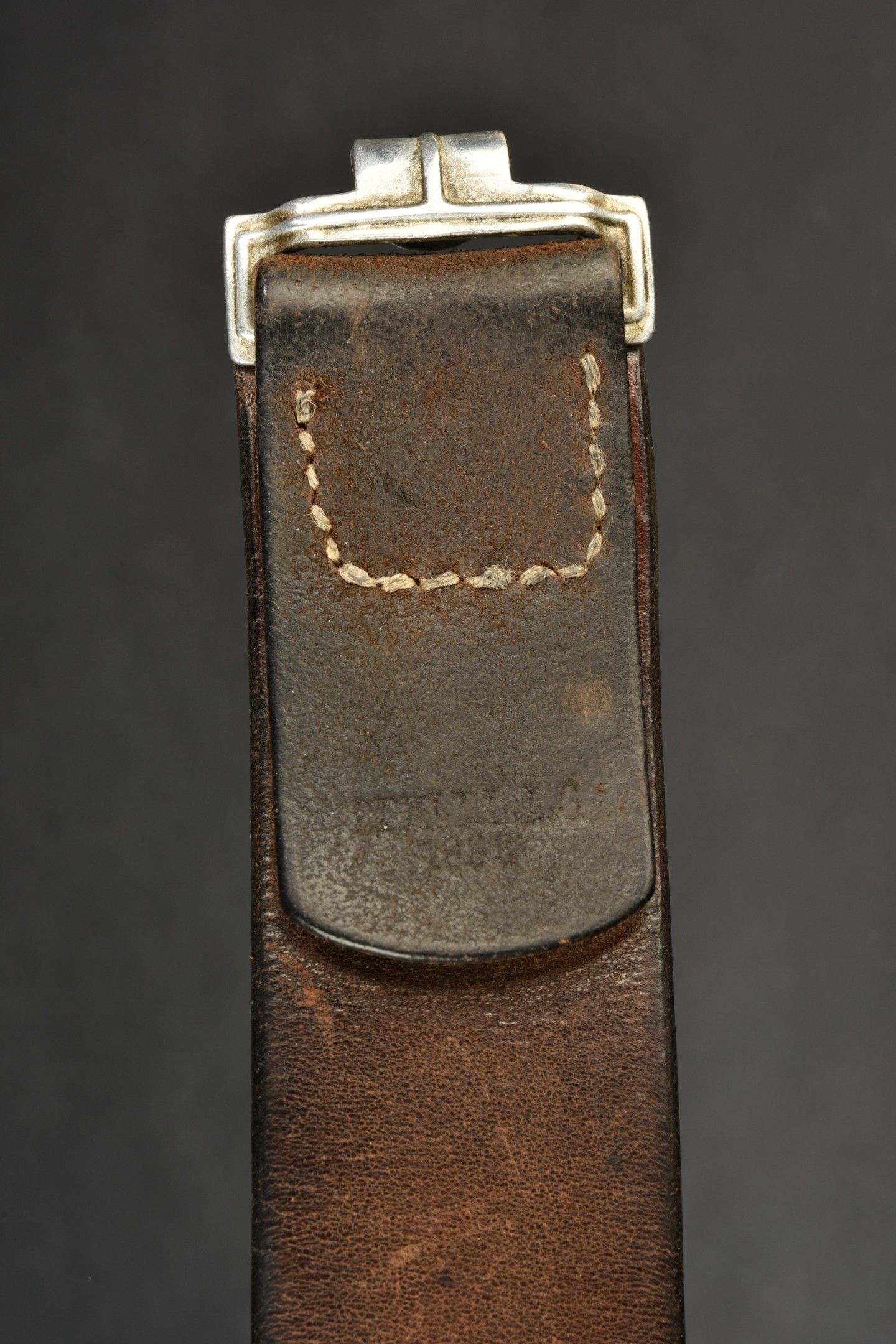 SS belt. Black leather belt with metal buckle. The adjustment tab is complete. Manufacture partially illegible, dated 1938. Size 90. Metal belt buckle, 80% grey. Markings RZM 155/43 SS. Some wear and patina. Condition II+. SS Belt Black leather belt with metal buckle. Adjustment tab complete. Maker marking partially illegible dated 1938. Size 90. Metal buckle retaining about 80% of its grey finish. Marked RZM 155/43 SS. Some wear and patina consistent with age. Condition II+.