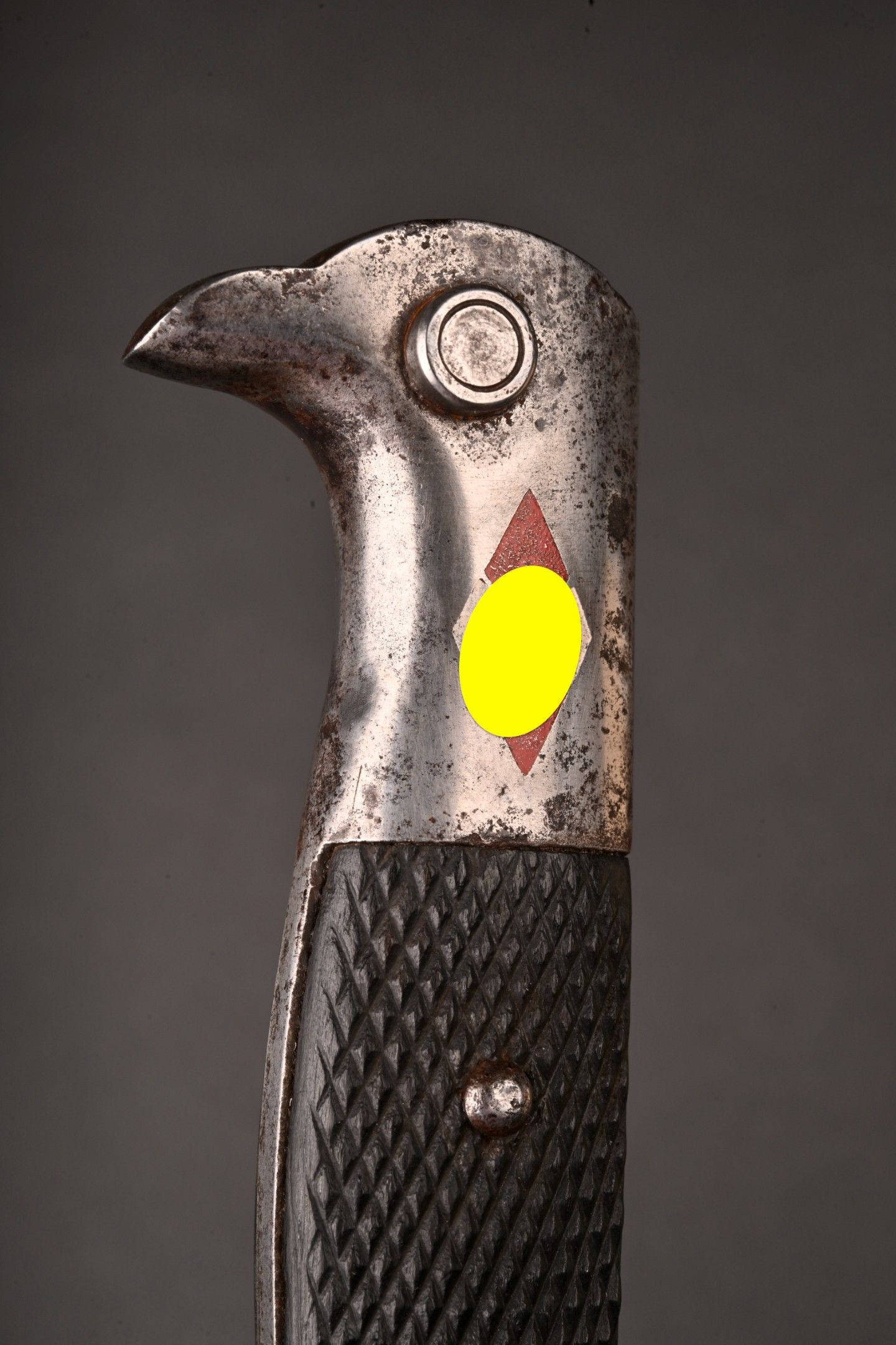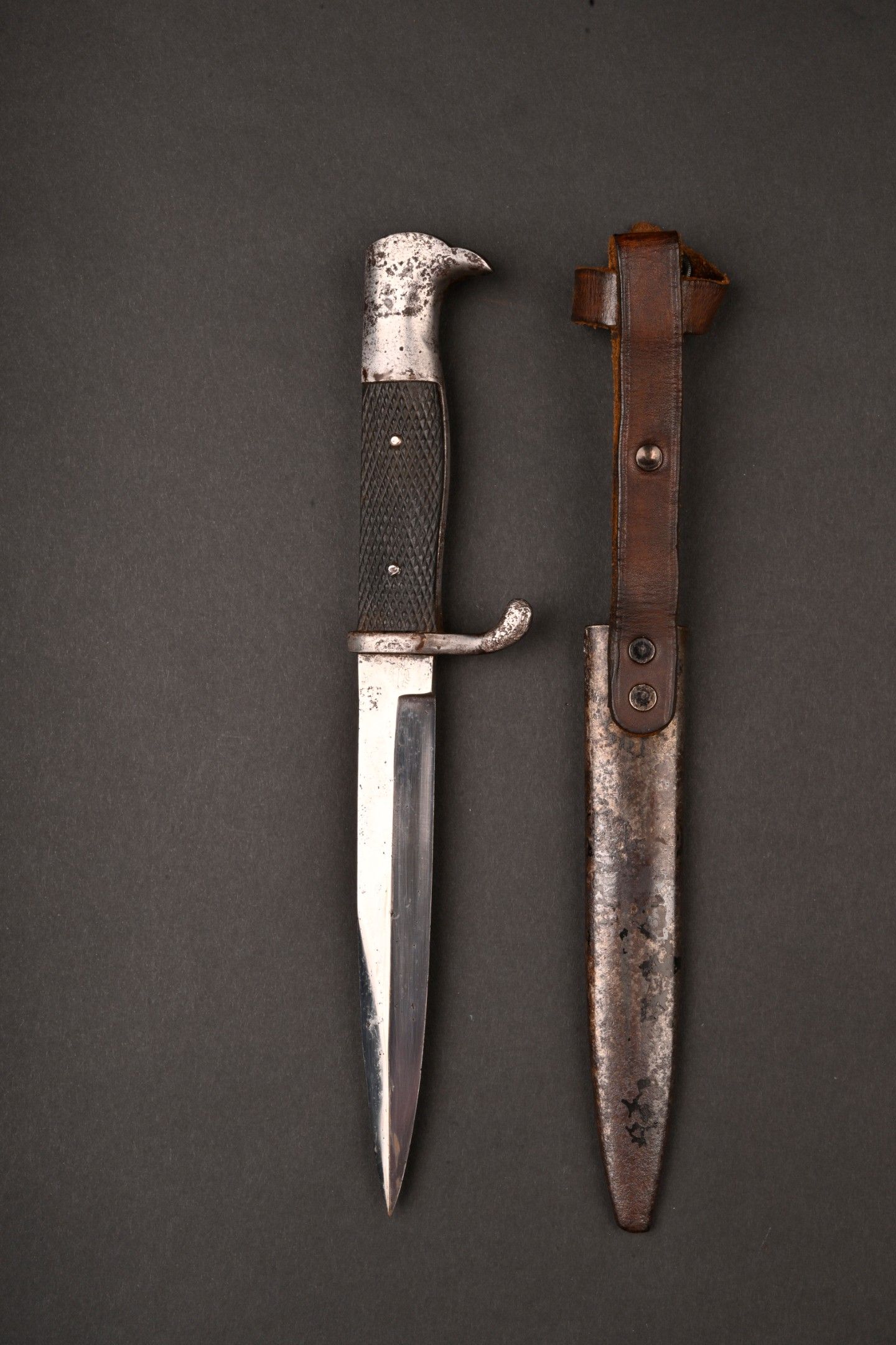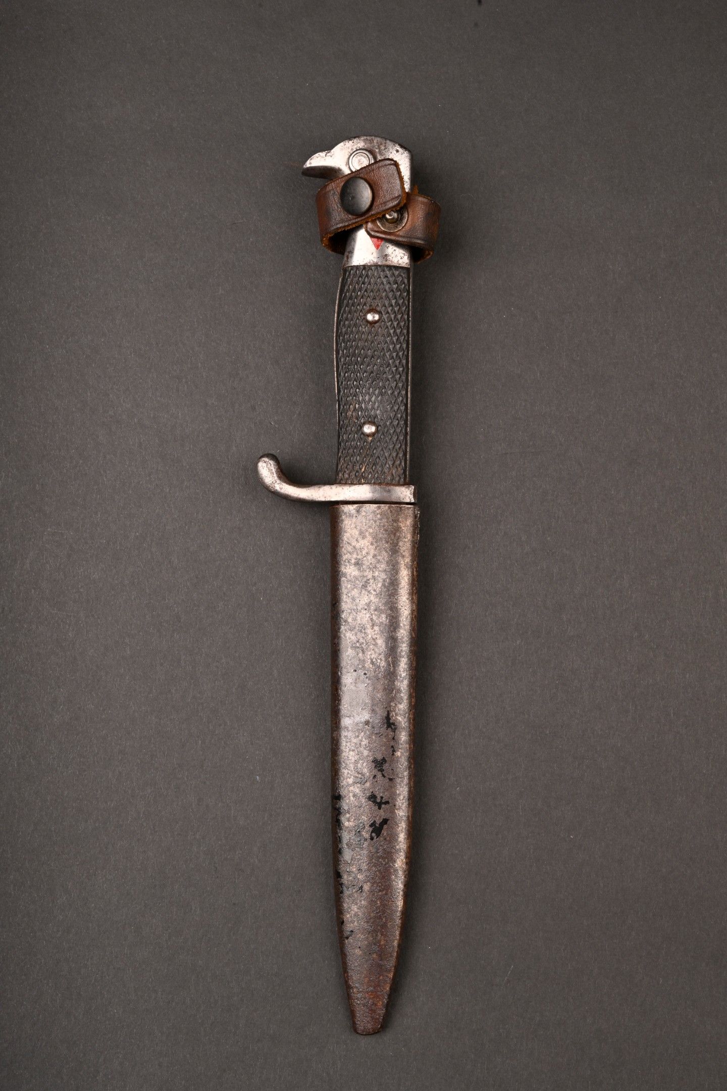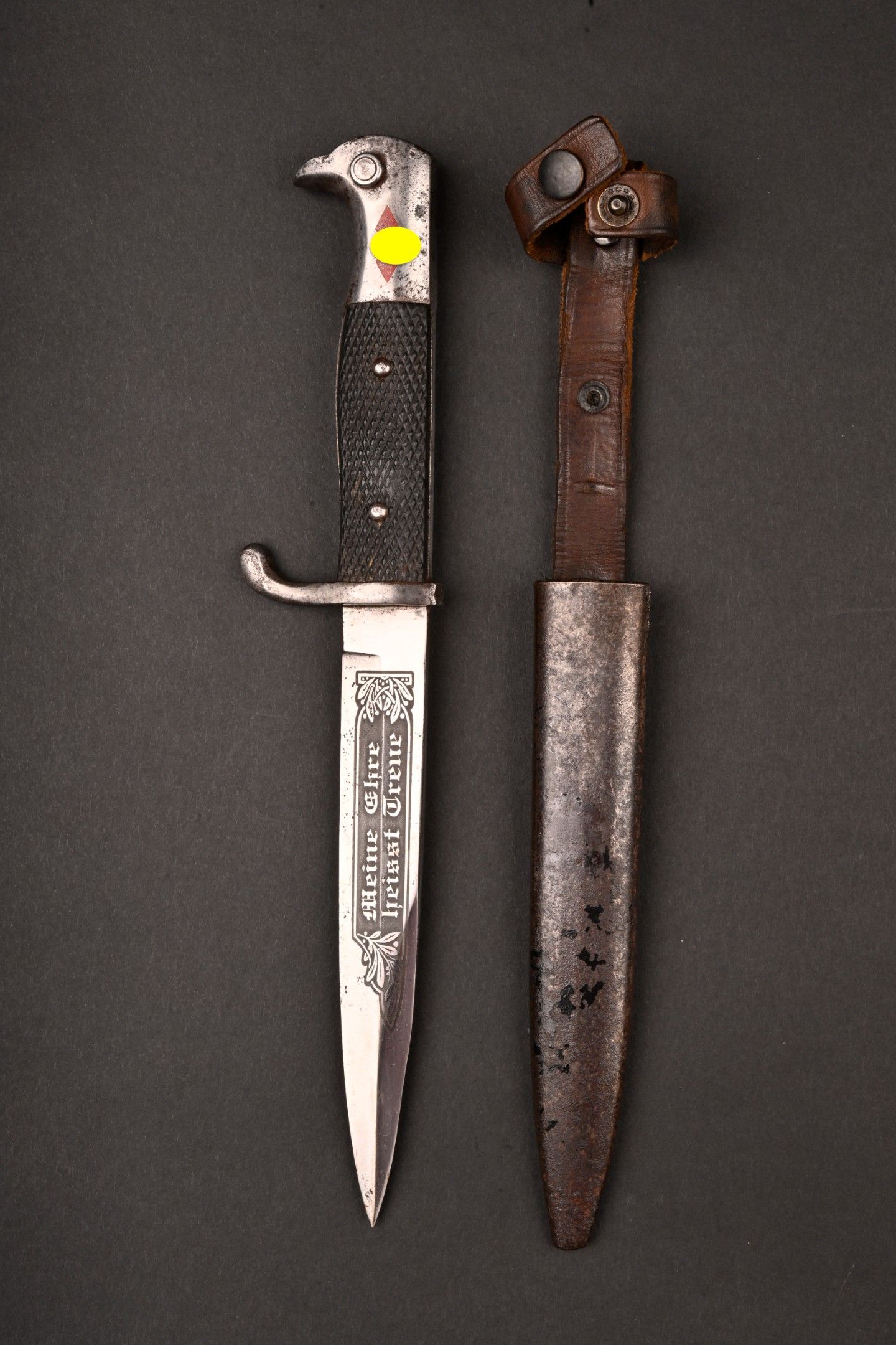 SS Carl Eickhorn award knife. Although opinions differ as to the purpose of these very rare knives, the motto engraved on the obverse of this one's blade seems to leave no room for doubt: we are indeed in the presence of a bladed weapon intended for a member of the Black Order. However, the presence of an HJ emblem on the pommel raises questions. In fact, six variants of this very rare so-called reward knife are known to collectors. Three have the SS motto engraved on the blade, including one variant with the HJ emblem (the one shown here). The HJ emblem has retained its paintwork, despite a few marked traces of oxidation. The push button is fictitious. The reverse of the handle is more affected by corrosion than the obverse, but the handle remains in perfectly acceptable condition given the rarity of the piece. The blade is better protected and in a better state of preservation, and the engraving of the motto is very beautiful. On the reverse, the maker's mark is that used by Carl Eickhorn on his very early weapons and allows the date of issue of this weapon to be dated between 1931, when the SS motto was adopted, and the end of 1933, when the 1933 model service dagger was issued. Some traces of black paint remain on the scabbard, which has obviously been used. The brown leather is in good condition. (See the study of these rare knives on pages 110 to 113 of the reference work L'ordre noir, Armes blanches, traditions et symbolique, published by Heimdal - 2023. SS Award Knife Carl Eickhorn Although opinions differ regarding the use of these extremely rare knives, the motto engraved on the obverse leaves no doubt that it was intended for a member of the Black Order. The presence of a Hitler Youth emblem on the pommel raises questions. Six variants of this rare award knife are known to collectors, three bearing the SS motto on the blade, including one variant with the HJ emblem as seen here. Despite marked oxidation, the HJ emblem retains its paint. The push button is non-functional. The reverse side of the grip shows heavier corrosion than the obverse but remains acceptable given the rarity of the piece. The blade, better protected, is in good condition with a fine motto engraving. The reverse bears the early Carl Eickhorn trademark used on weapons made between 1931 and late 1933, before the introduction of the 1933 service dagger. Some black paint remains on the scabbard, which shows signs of service wear. The brown leather is in good condition. Despite age and wear, this knife remains a piece of great rarity. See the study on pages 110-113 of L'ordre noir, Armes blanches, traditions et symbolique, published by Heimdal in 2023.