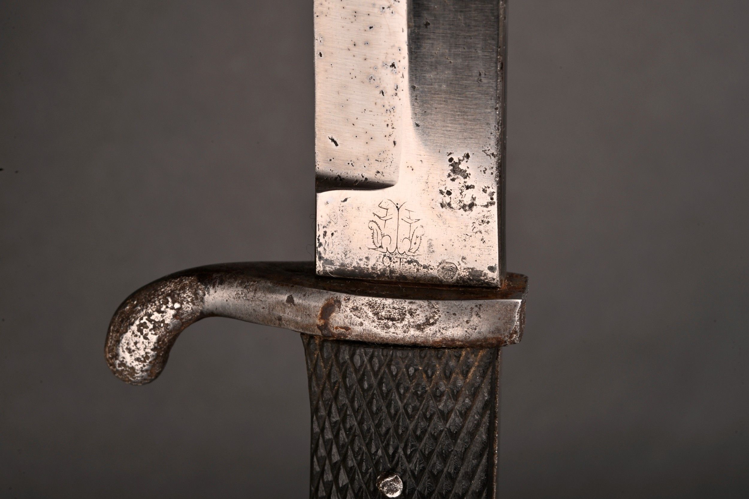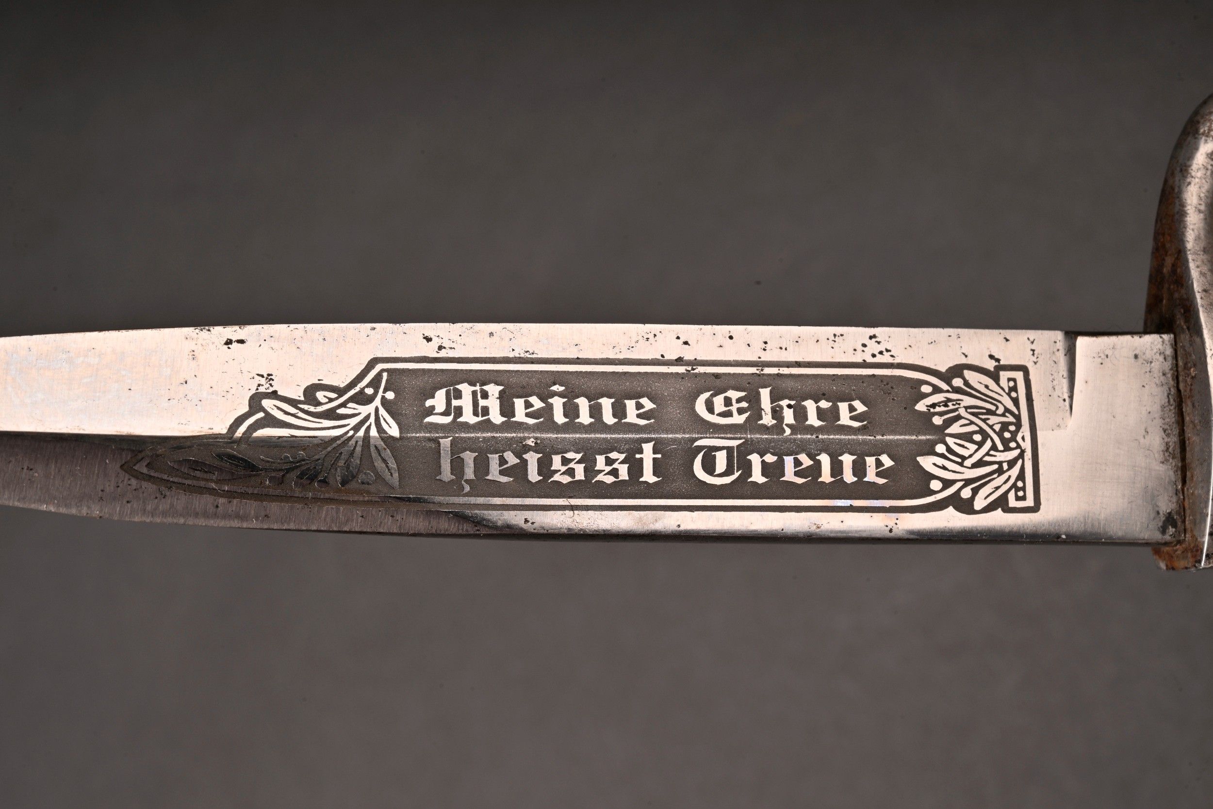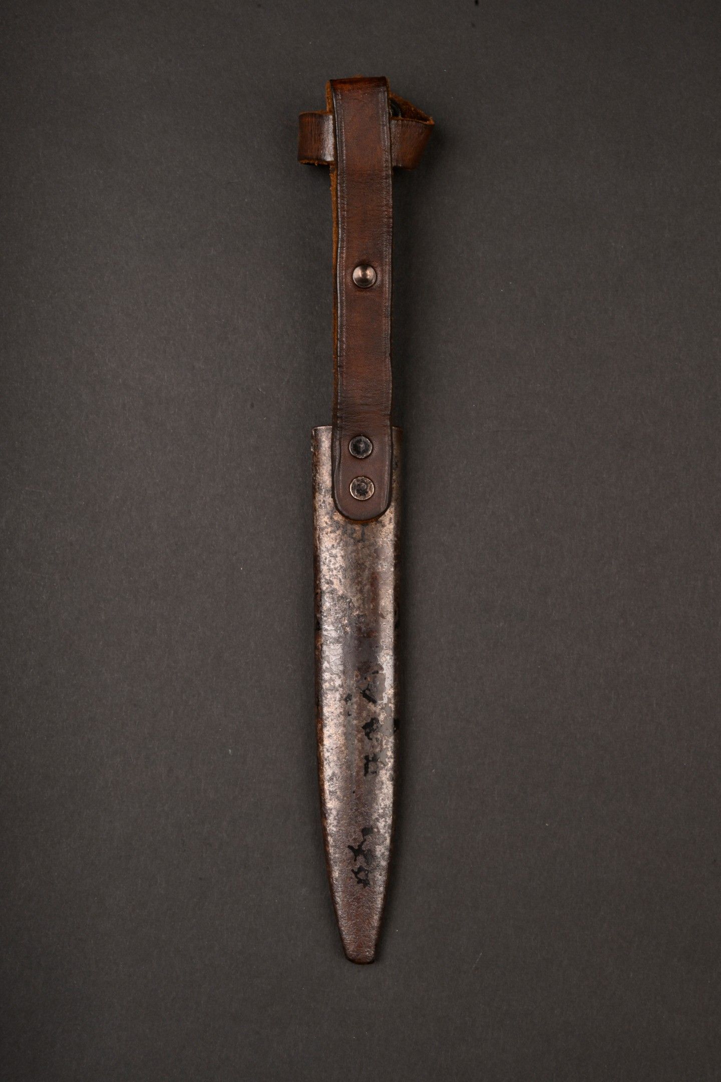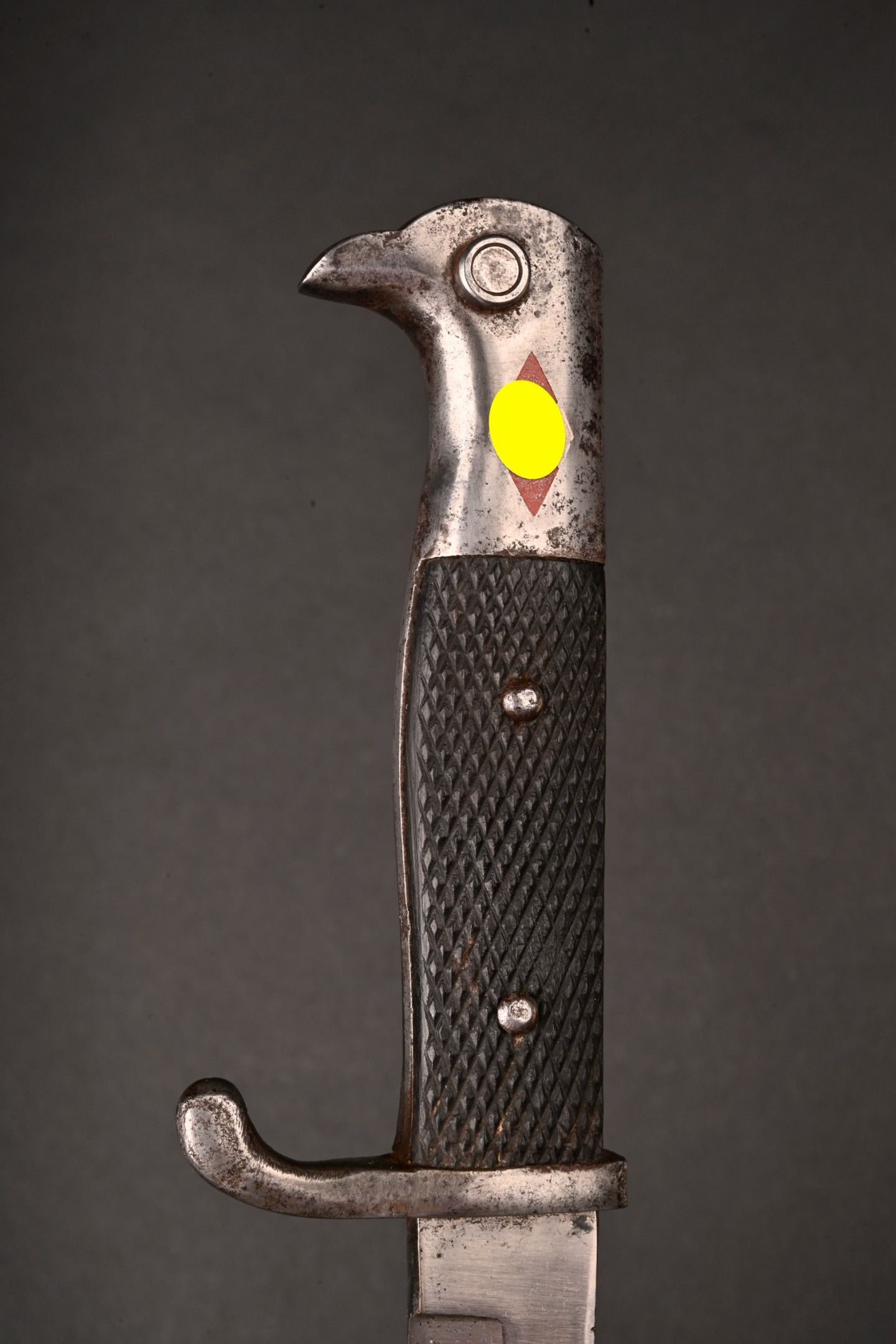 SS Carl Eickhorn award knife. Although opinions differ as to the purpose of these very rare knives, the motto engraved on the obverse of this one's blade seems to leave no room for doubt: we are indeed in the presence of a bladed weapon intended for a member of the Black Order. However, the presence of an HJ emblem on the pommel raises questions. In fact, six variants of this very rare so-called reward knife are known to collectors. Three have the SS motto engraved on the blade, including one variant with the HJ emblem (the one shown here). The HJ emblem has retained its paintwork, despite a few marked traces of oxidation. The push button is fictitious. The reverse of the handle is more affected by corrosion than the obverse, but the handle remains in perfectly acceptable condition given the rarity of the piece. The blade is better protected and in a better state of preservation, and the engraving of the motto is very beautiful. On the reverse, the maker's mark is that used by Carl Eickhorn on his very early weapons and allows the date of issue of this weapon to be dated between 1931, when the SS motto was adopted, and the end of 1933, when the 1933 model service dagger was issued. Some traces of black paint remain on the scabbard, which has obviously been used. The brown leather is in good condition. (See the study of these rare knives on pages 110 to 113 of the reference work L'ordre noir, Armes blanches, traditions et symbolique, published by Heimdal - 2023. SS Award Knife Carl Eickhorn Although opinions differ regarding the use of these extremely rare knives, the motto engraved on the obverse leaves no doubt that it was intended for a member of the Black Order. The presence of a Hitler Youth emblem on the pommel raises questions. Six variants of this rare award knife are known to collectors, three bearing the SS motto on the blade, including one variant with the HJ emblem as seen here. Despite marked oxidation, the HJ emblem retains its paint. The push button is non-functional. The reverse side of the grip shows heavier corrosion than the obverse but remains acceptable given the rarity of the piece. The blade, better protected, is in good condition with a fine motto engraving. The reverse bears the early Carl Eickhorn trademark used on weapons made between 1931 and late 1933, before the introduction of the 1933 service dagger. Some black paint remains on the scabbard, which shows signs of service wear. The brown leather is in good condition. Despite age and wear, this knife remains a piece of great rarity. See the study on pages 110-113 of L'ordre noir, Armes blanches, traditions et symbolique, published by Heimdal in 2023.