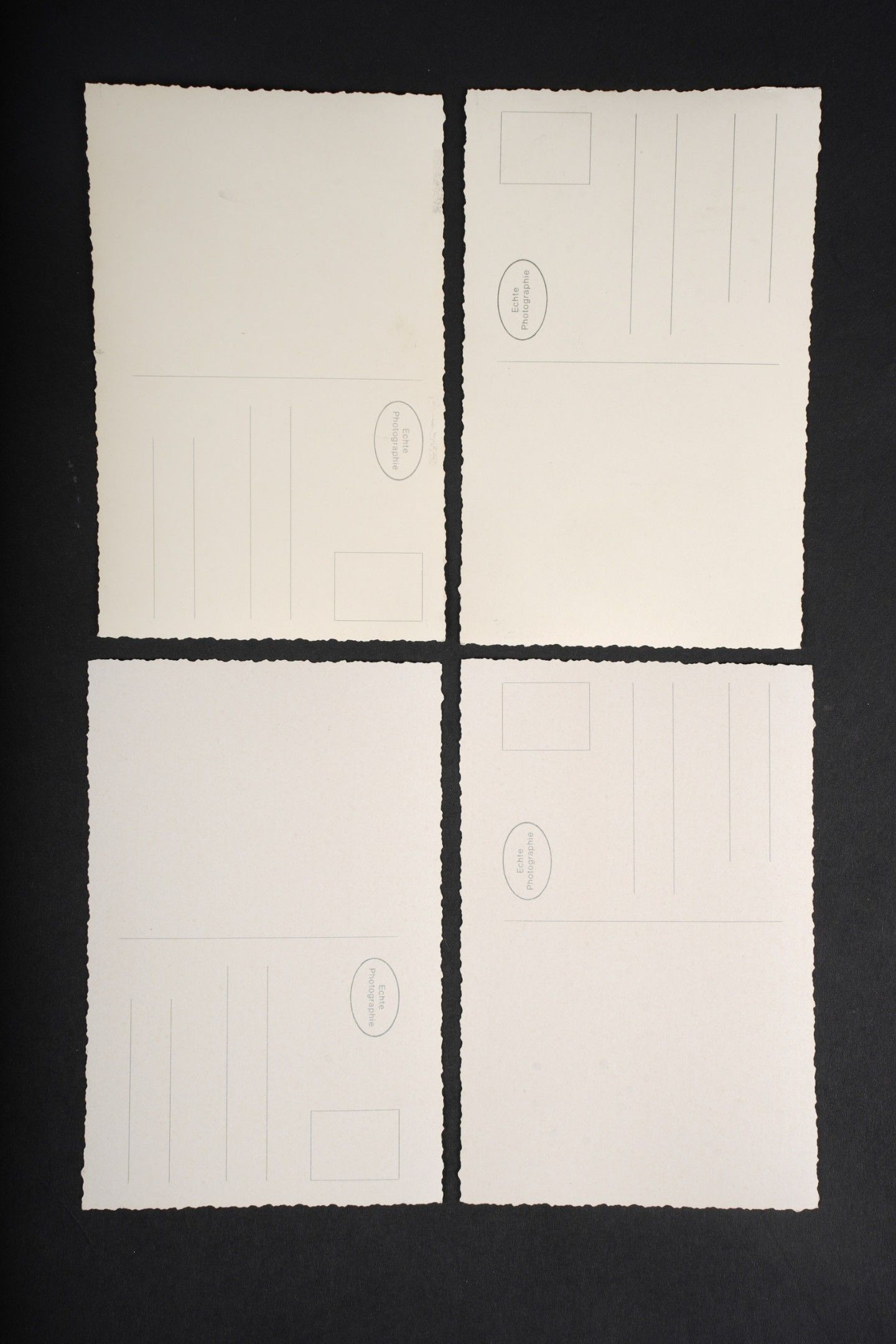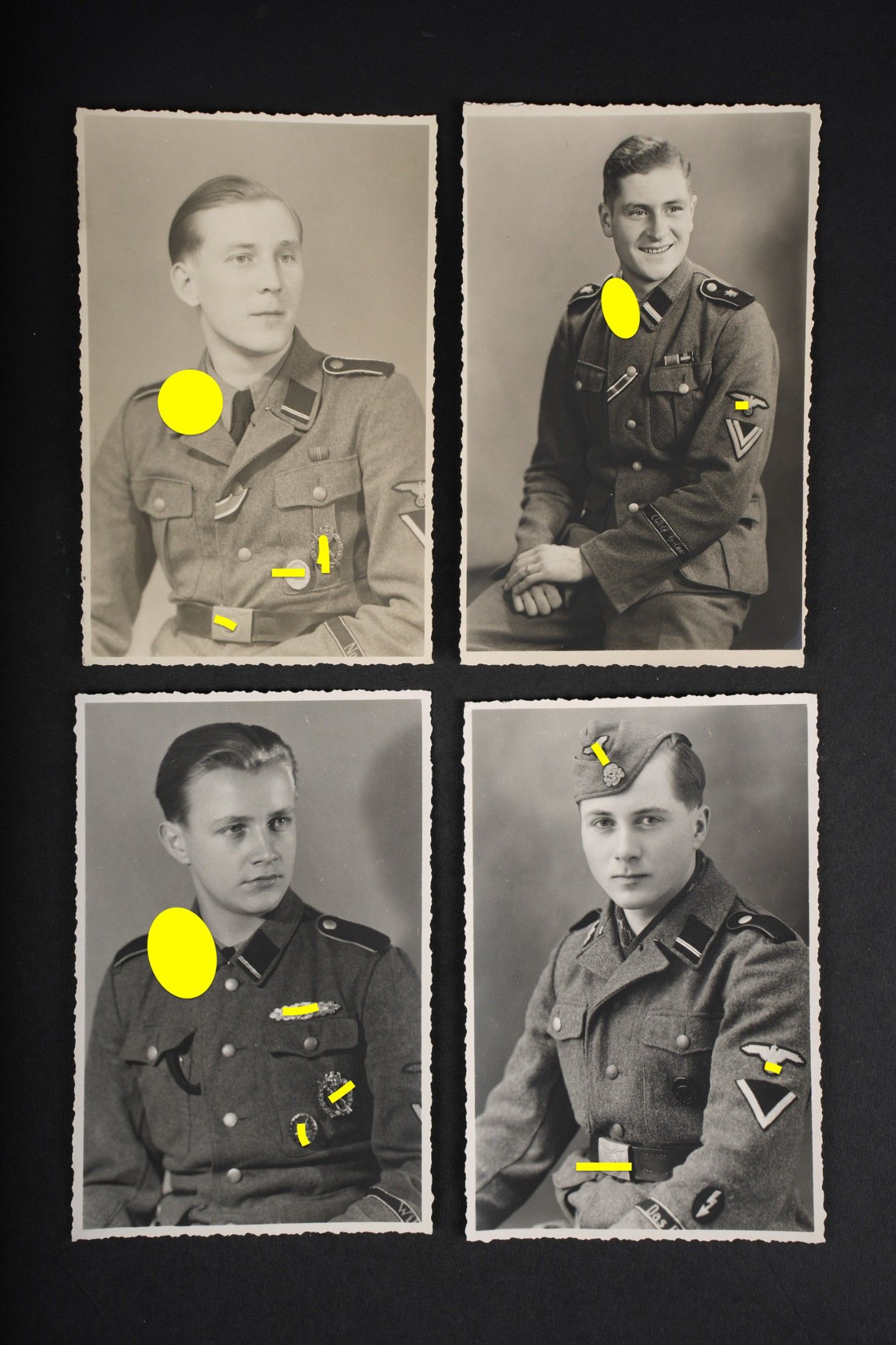 SS postcard photos. Including a photo of a Sturmmann of the Wiking. A photo of a Sturmmann of the Das Reich. A photo of a Rottenführer of the LAH. A photo of a Sturmmann of the Nordland. The backs of the pieces are marked Echte Photographie. Slight wear and patina to be noted. Condition I-. SS Postcard Photographs Including a photo of a Sturmmann from the Wiking Division, a Sturmmann from the Das Reich Division, a Rottenführer from the LAH, and a Sturmmann from the Nordland Division. Backs marked Echte Photographie. Light wear and patina consistent with age. Condition I-.